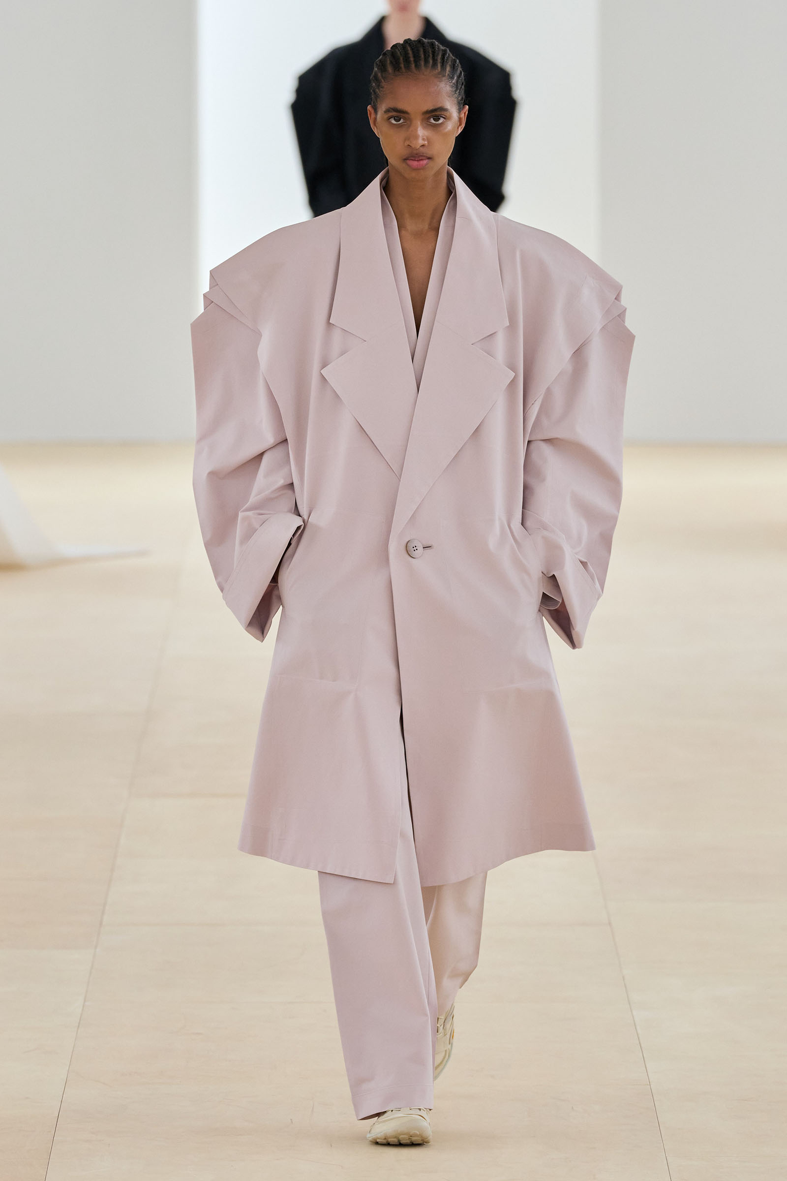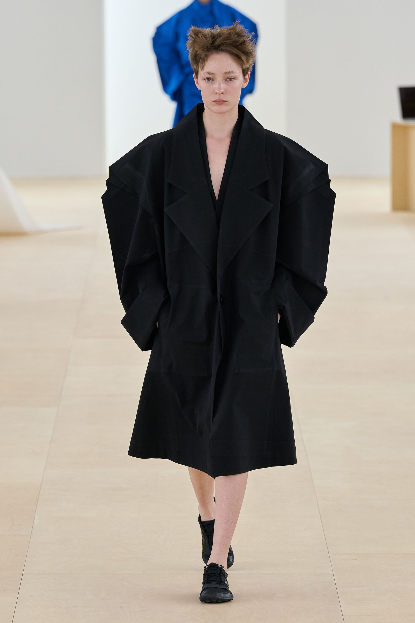 Some large-silhouette jackets and coats appeared so considerable thanks to the way in which the front and back facing pieces of material were placed flat against each other around the edge of the front-facing physical facade: this was a little reminiscent of last season’s collection, and retained an impressive combination of substance and lightness. The soundsystem played a bassline so heavy and loud that the pieces of washi paper hanging across the runway turned and trembled as the models walked breezily by.