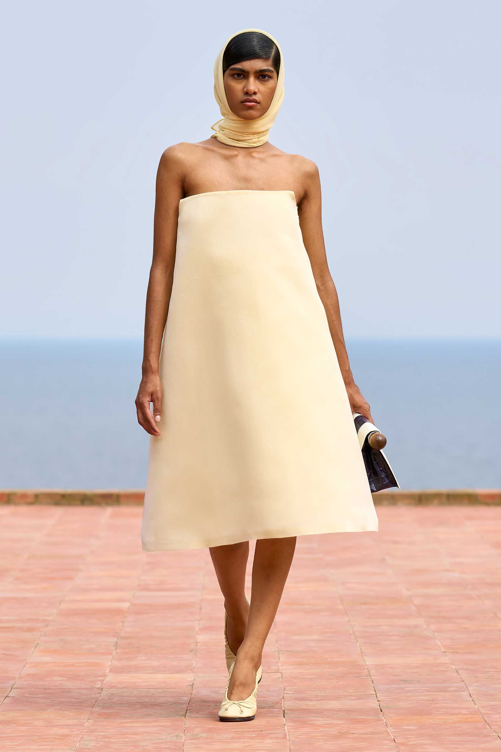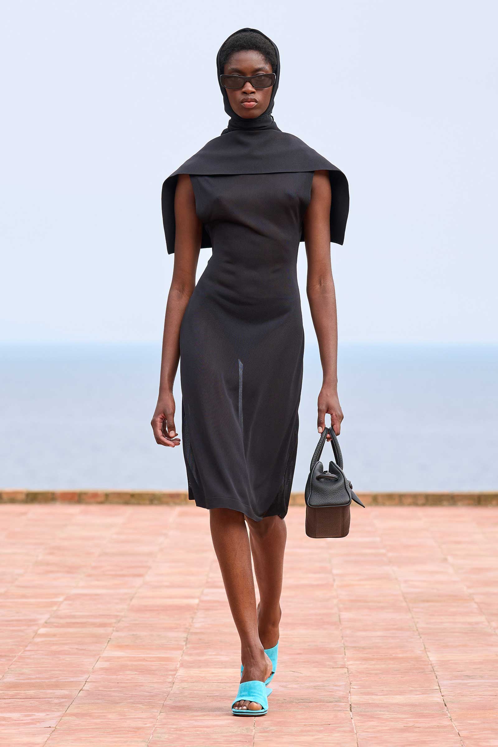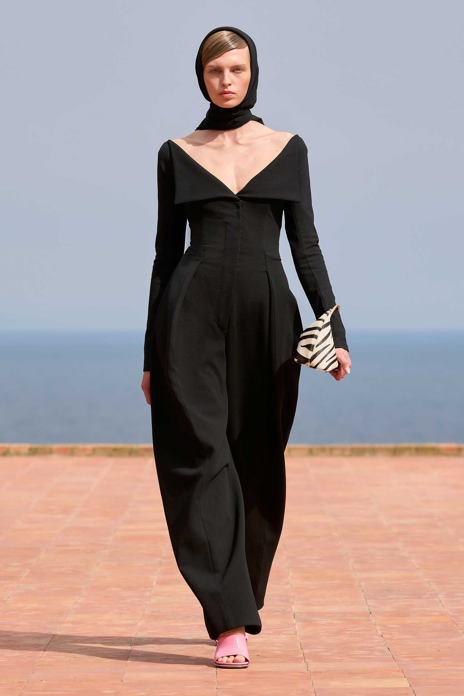 Cineasts will know that the plot of Le Mepris involves a meta-theme of a movie within a movie—Fritz Lang plays an auteur making a version of Homer’s Odyssey. Porte Jacquemus’s departure into sinuous draped chiffon or jersey dresses—swooping in the back, or slit at the sides to reveal bodysuits—seemed to touch off that reference. Plenty of skin-show has been part and parcel of the Jacquemus brand until now. It’s not that this resort collection abandoned it—bared shoulders, backs, and the side-exposing narrowness of his halter dresses said that. But in the nuance, there was something more sophisticated going on here. “I wanted it to be surprising, sensual, more ‘woman’” is the way he framed it.