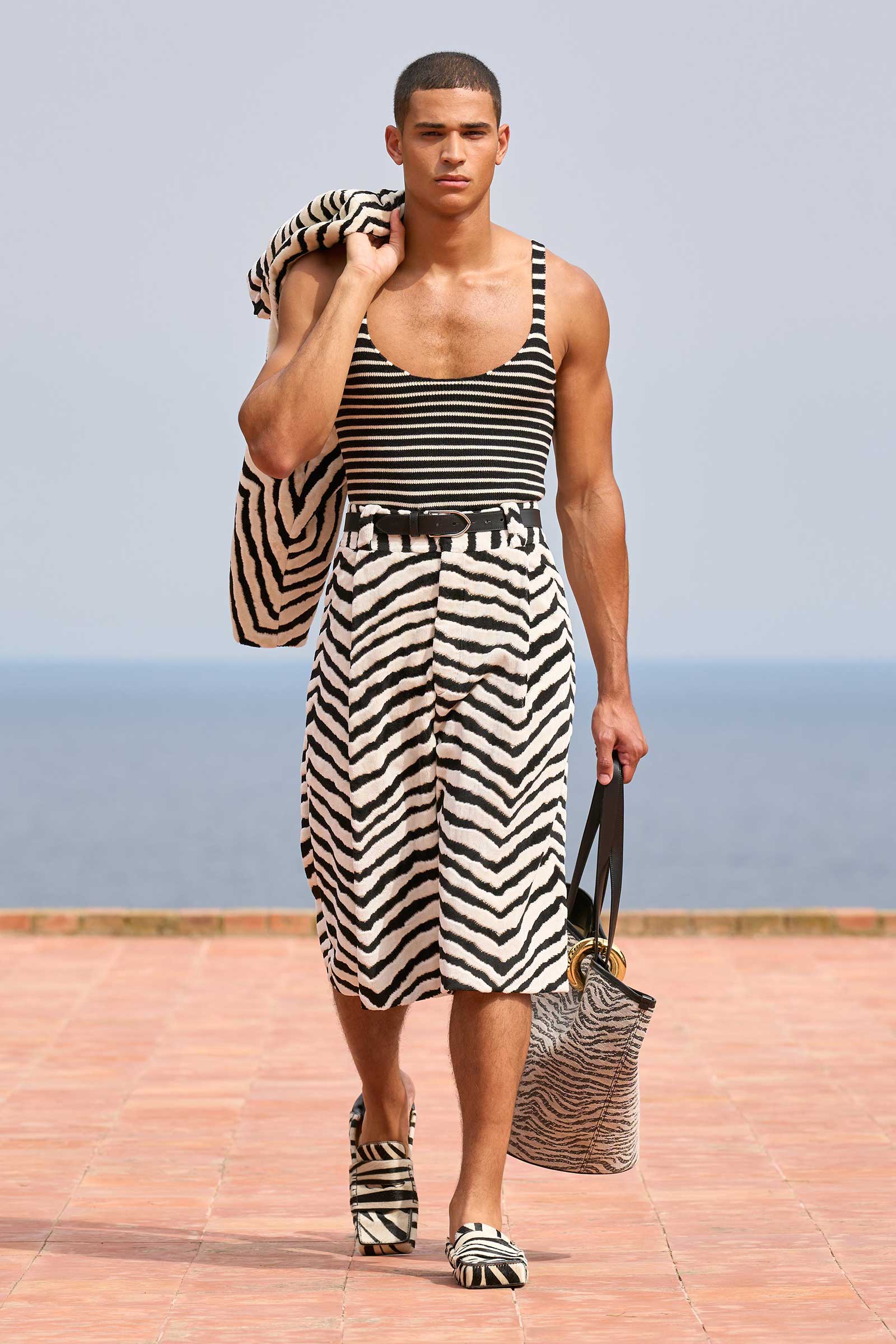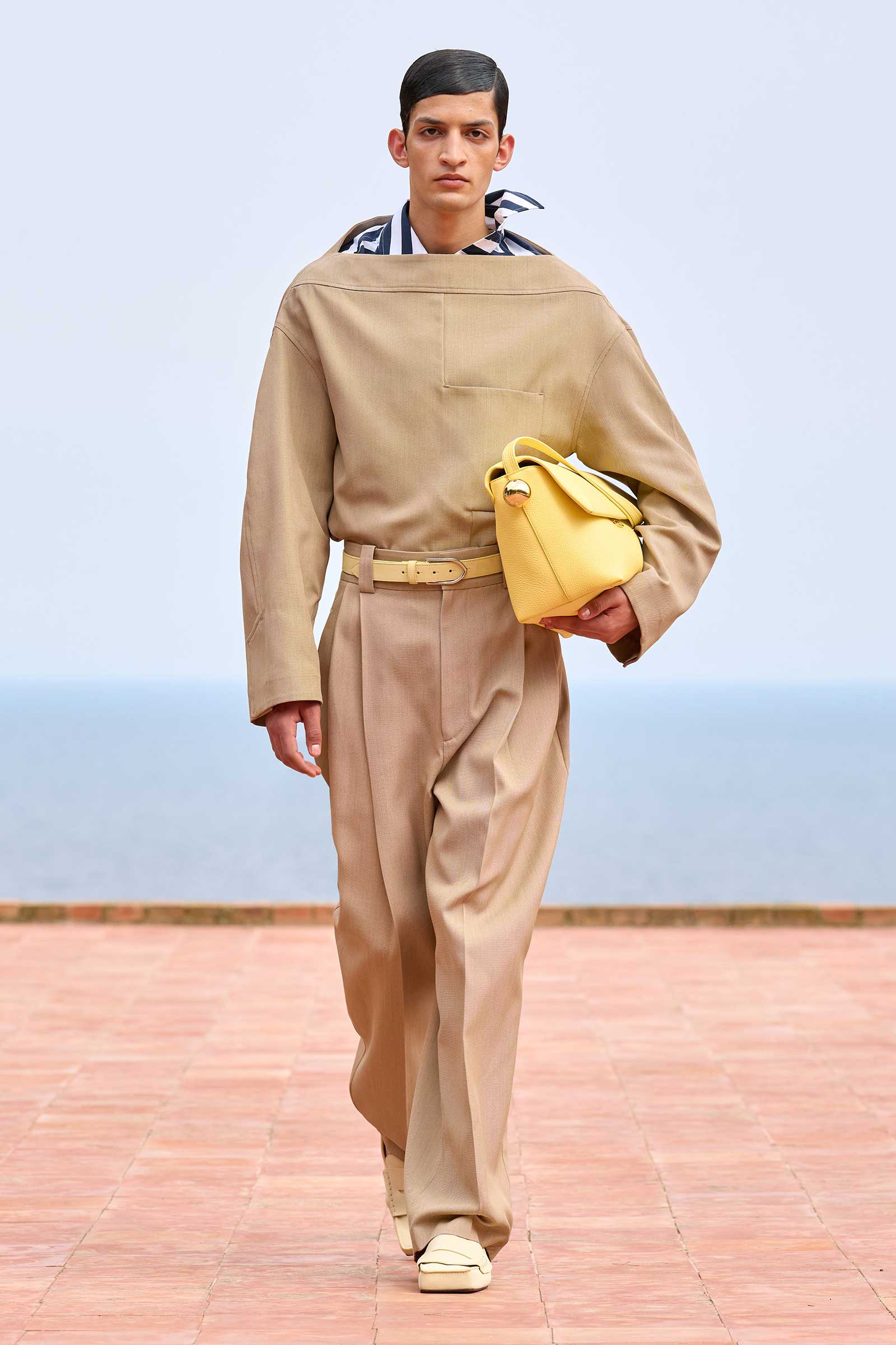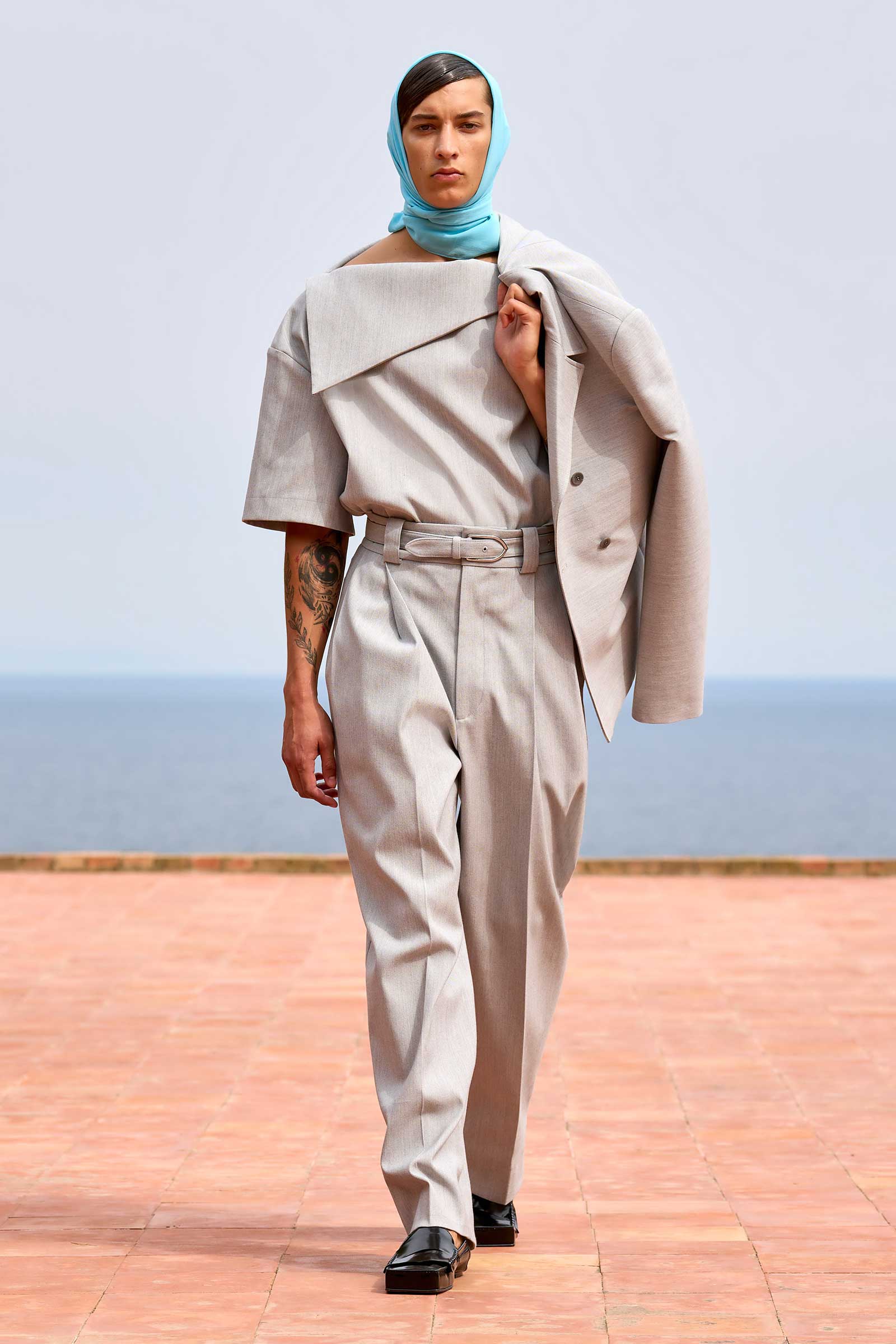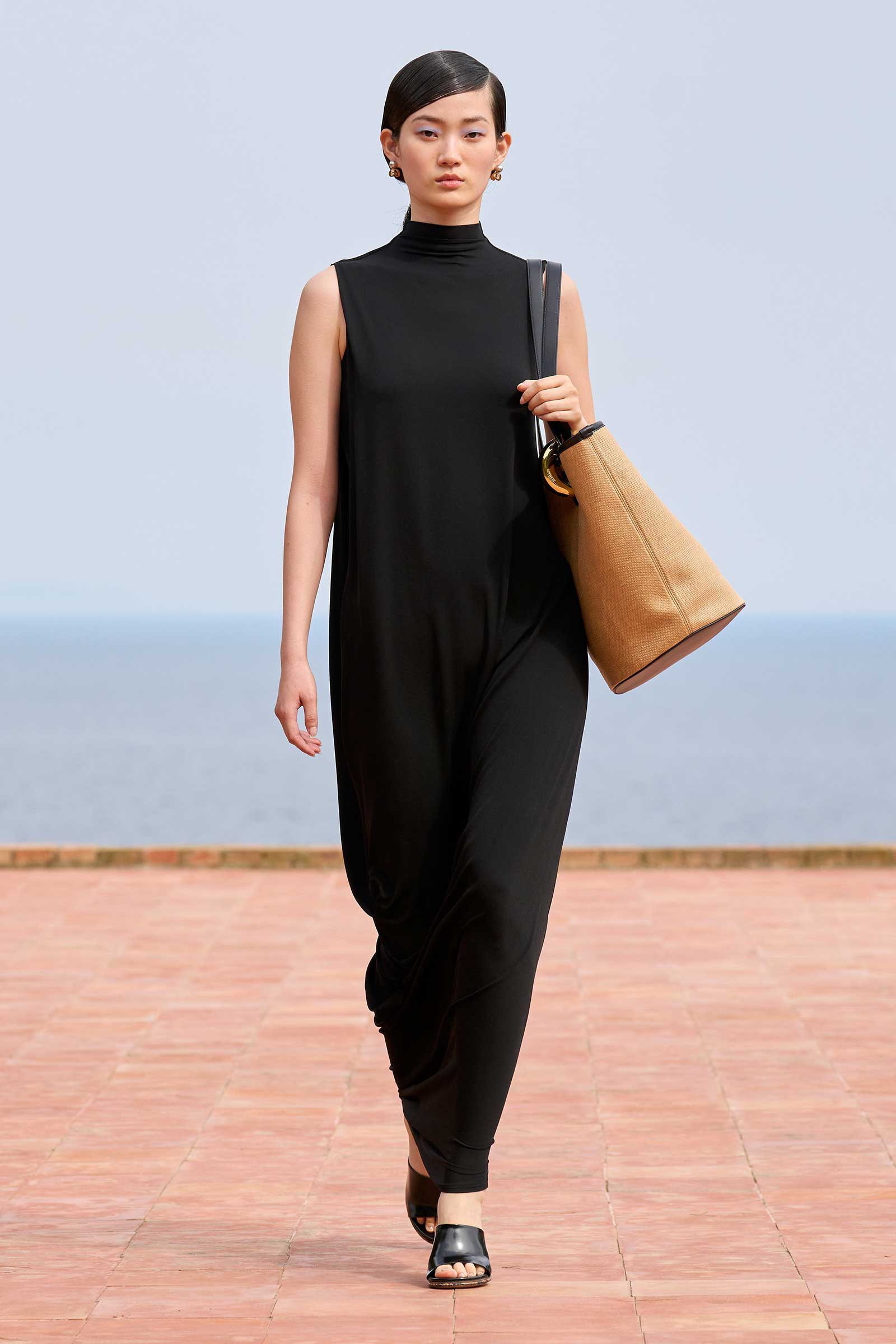 Cineasts will know that the plot of Le Mepris involves a meta-theme of a movie within a movie—Fritz Lang plays an auteur making a version of Homer’s Odyssey. Porte Jacquemus’s departure into sinuous draped chiffon or jersey dresses—swooping in the back, or slit at the sides to reveal bodysuits—seemed to touch off that reference. Plenty of skin-show has been part and parcel of the Jacquemus brand until now. It’s not that this resort collection abandoned it—bared shoulders, backs, and the side-exposing narrowness of his halter dresses said that. But in the nuance, there was something more sophisticated going on here. “I wanted it to be surprising, sensual, more ‘woman’” is the way he framed it.