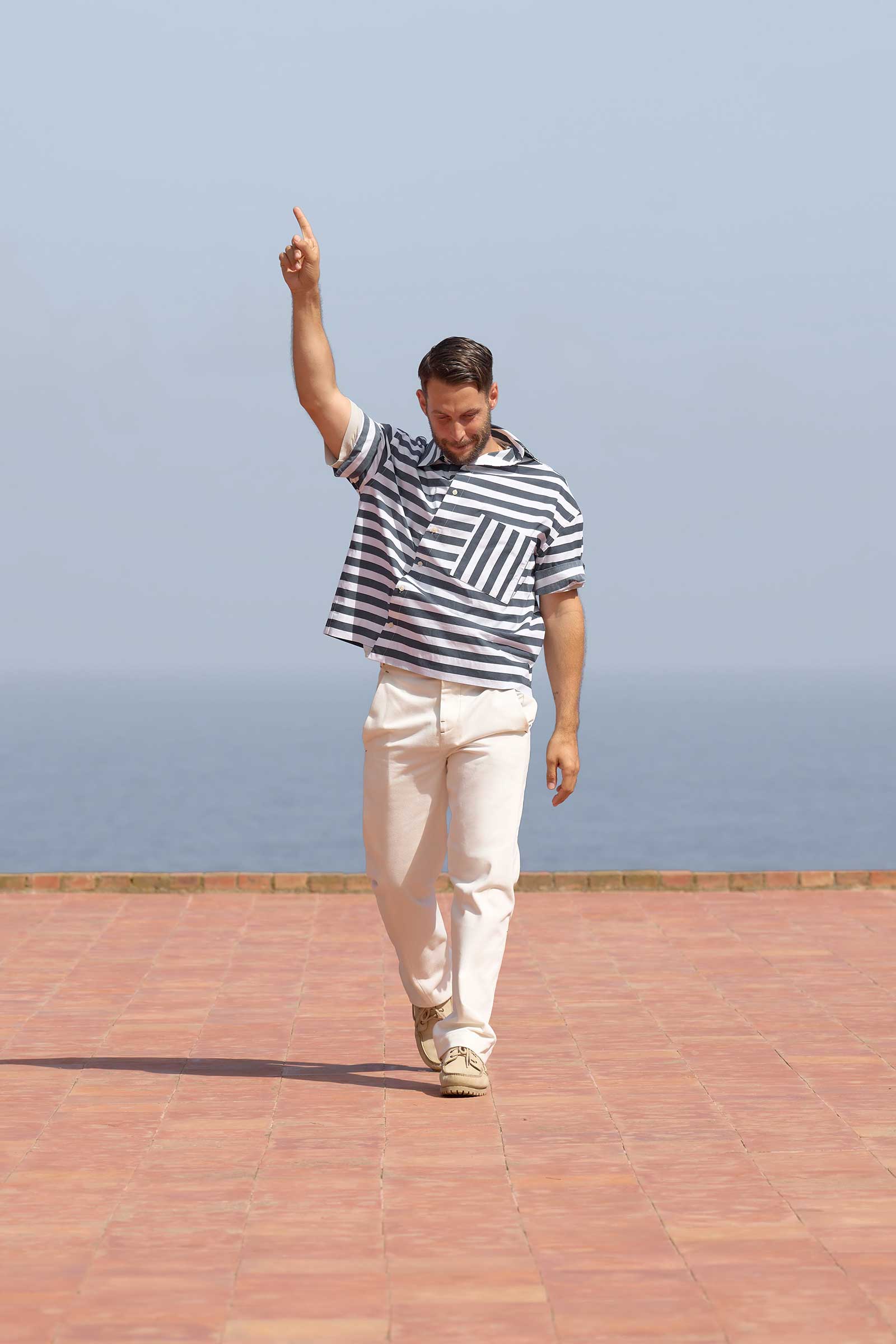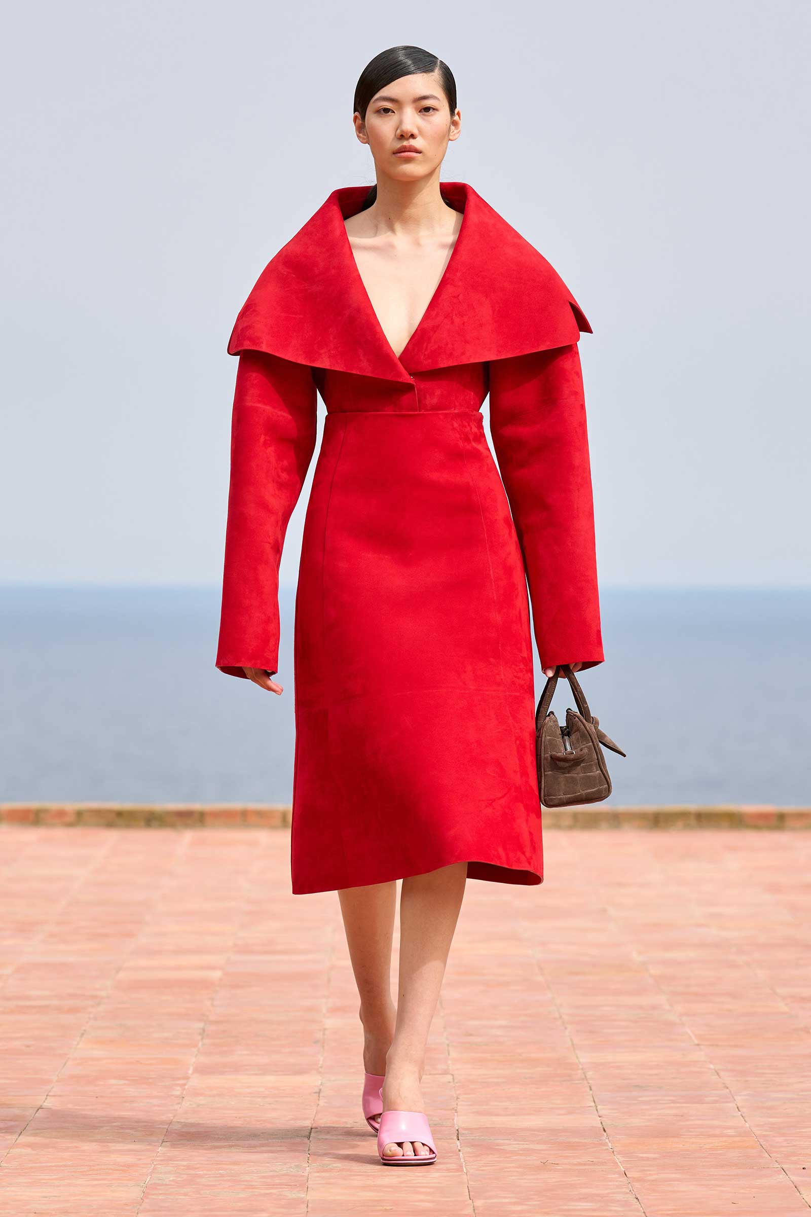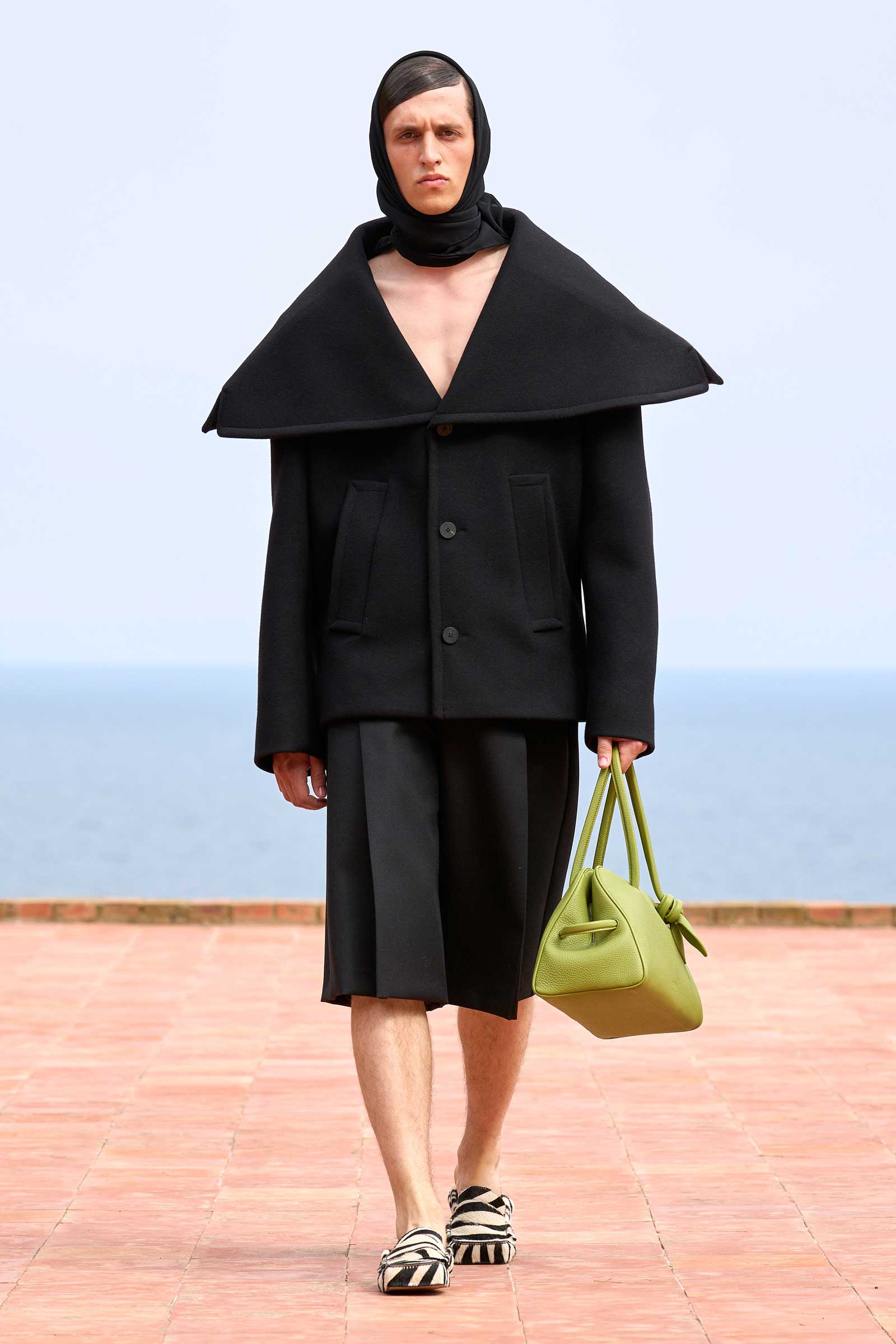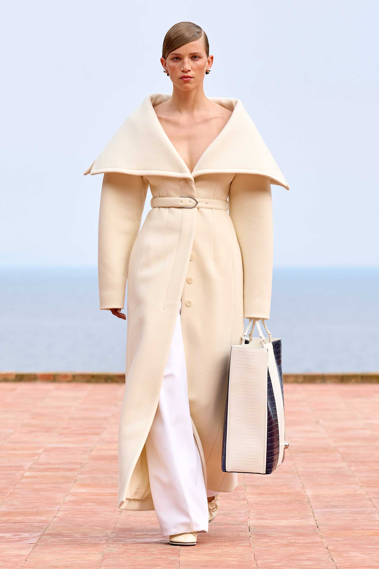 Surrounded by drones shooting footage over the Mediterranean and boats plying to and fro far below, models stepped up the long open-air staircase and onto the rooftop. The entry of the opening look, a creamy-pale tufted bathrobe coat, nodded subtly to the famous Brigitte Bardot Le Mepris scene shot on that very terrace. Following were Jacquemus-recognizable silhouettes: his shawl-collared Provencal-derived jackets, now carved in vermillion, yellow, stark black, or white, smoothly matched with high-waisted A-line below-the-knee skirts, full tailored pants, or bermudas.