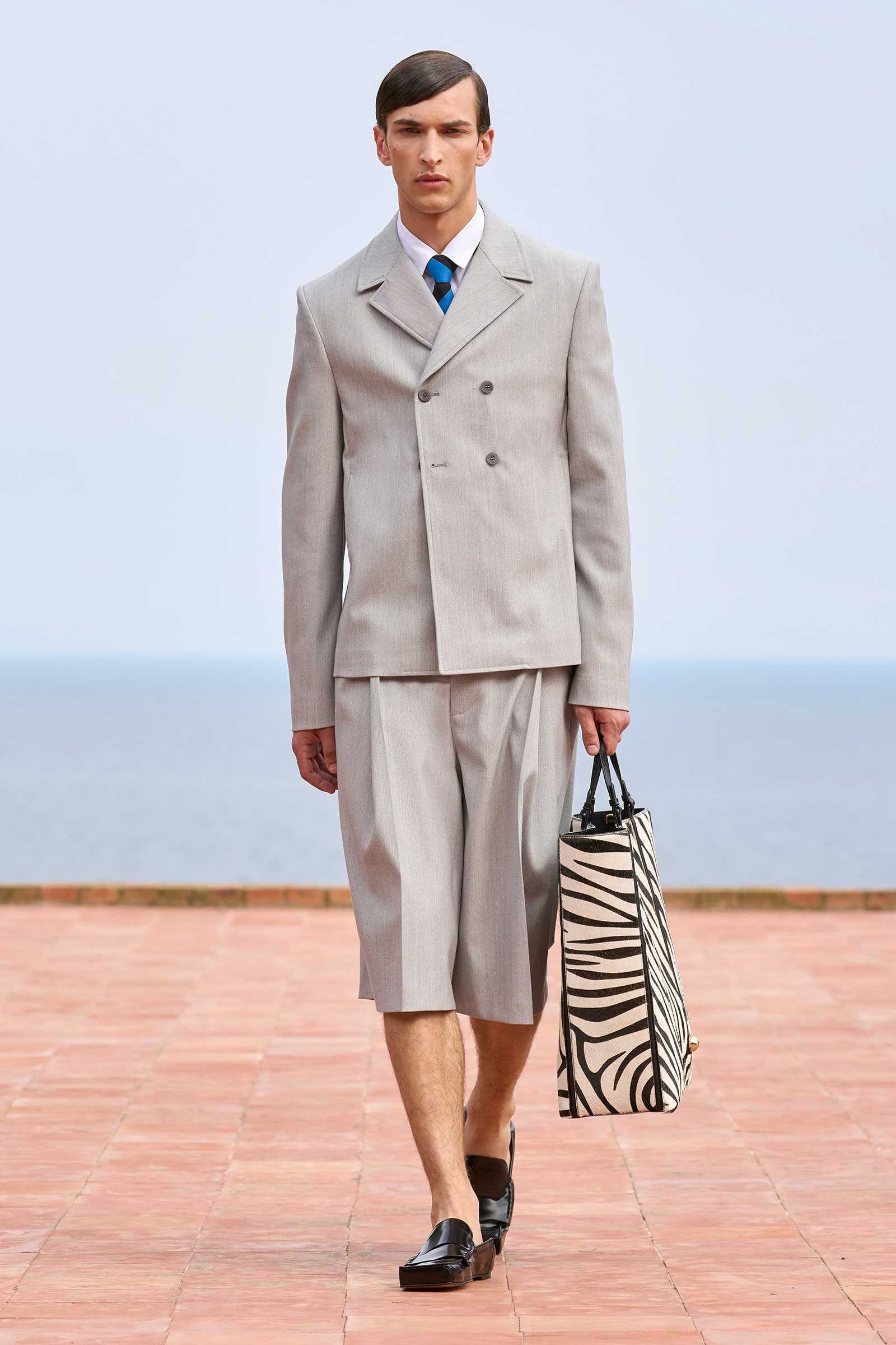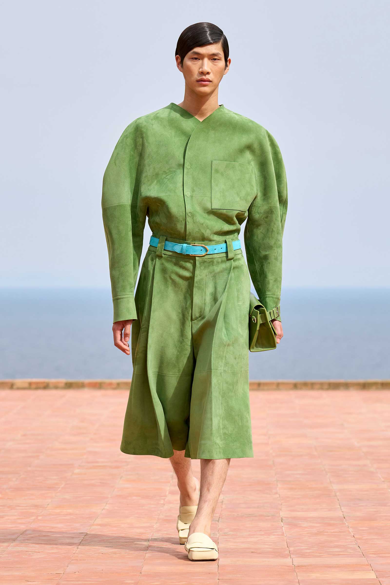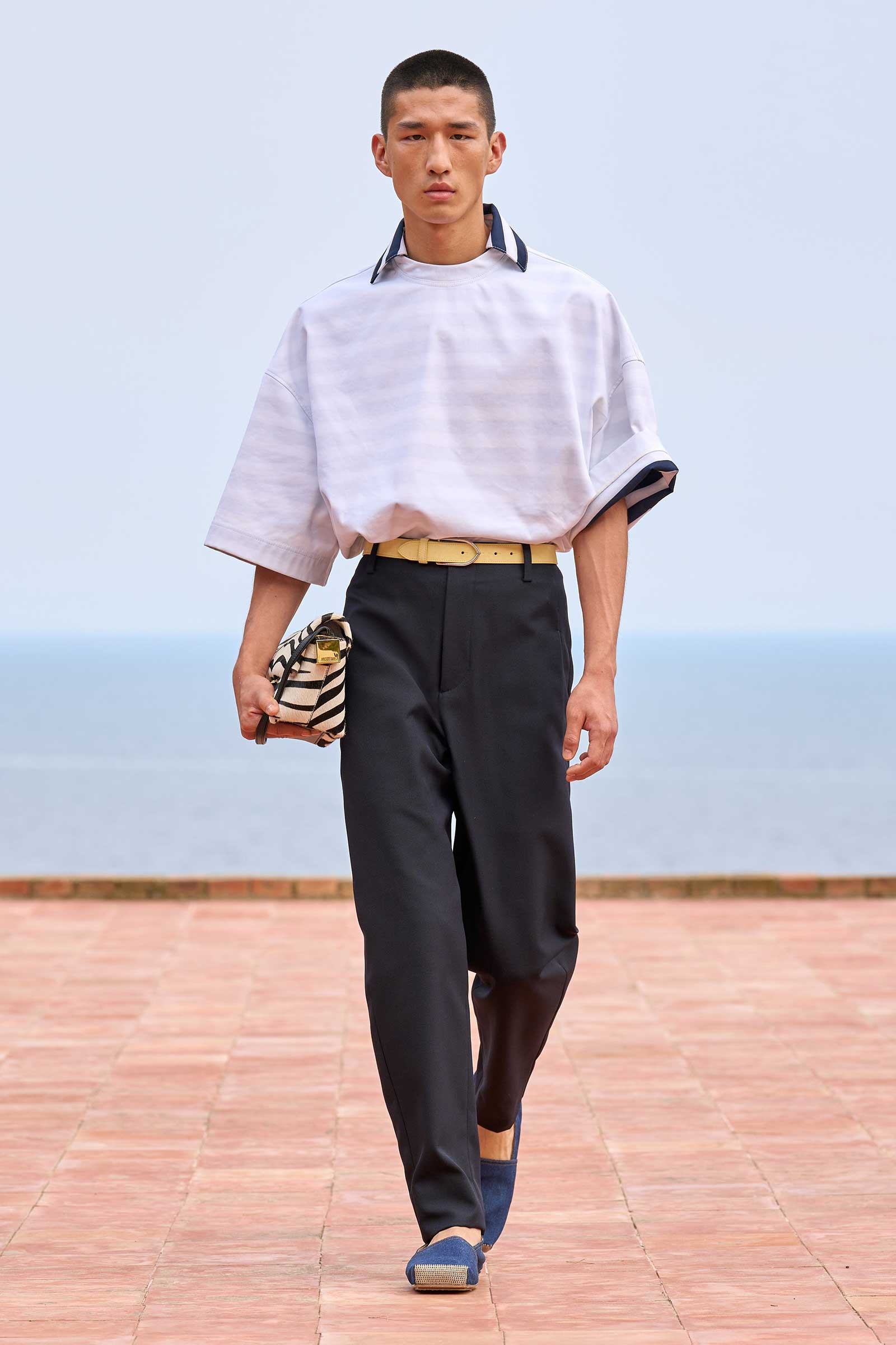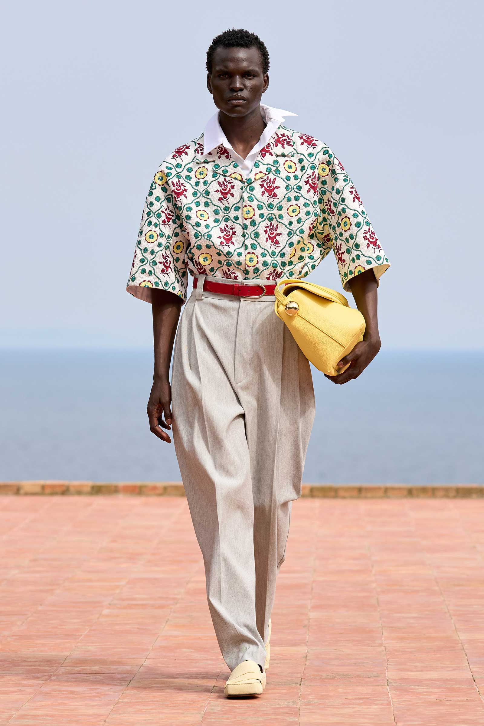 Walking amongst them, came the menswear: tops derived from sailor’s smocks, over asymmetrically-collared shirts, smartly color-coordinated with pleat-front trousers. With every look, a bag; soft fold-over clutches, top-handled bags, and shopping totes in pops of color: turquoise, leaf-green, pink, or yellow.