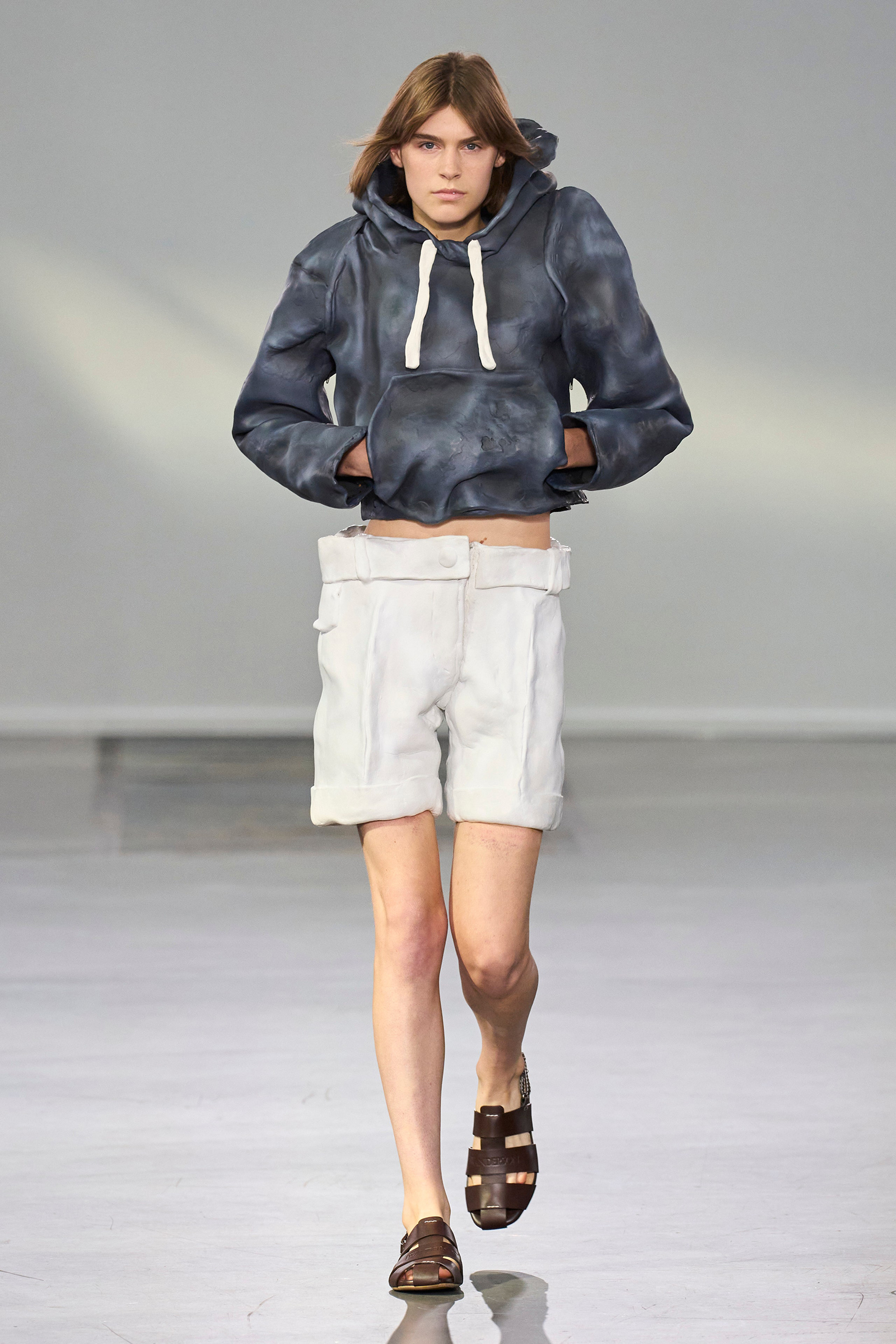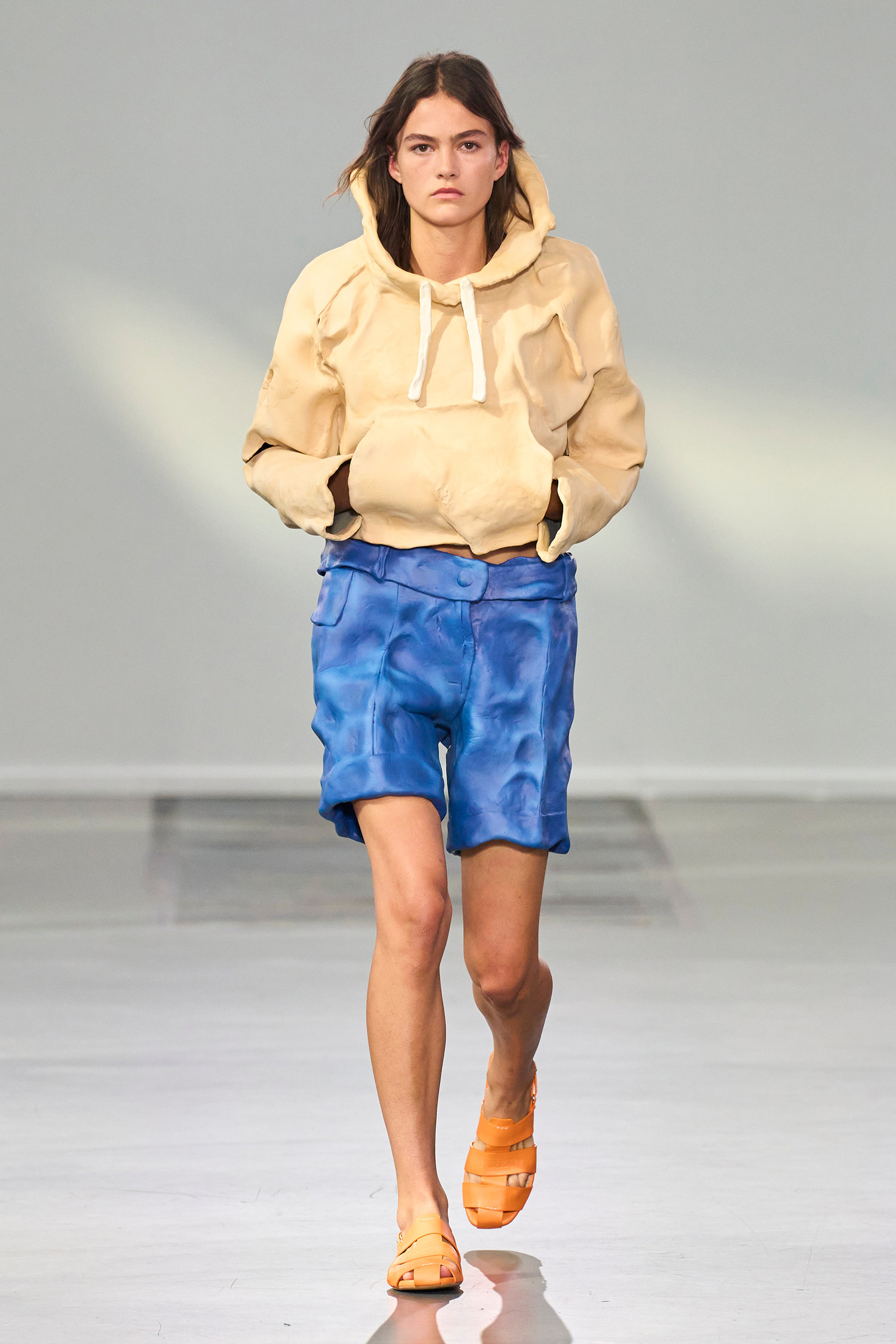 Plasticine! That’s what the blue hoodie and white shorts were molded from by Jonathan Anderson at the beginning of his eponymous London show. We’re used to conceptual illusions from him, but for anyone British, the revelation of the material raised fond smiles and innocent childhood memories of our first stabs at creating things. Plasticine is the play clay invented by William Harbutt in 1897, the U.K. equivalent of America’s Play-Doh. Anderson discovered that Plasticine is still being manufactured in Northern Ireland, the place of his birth.