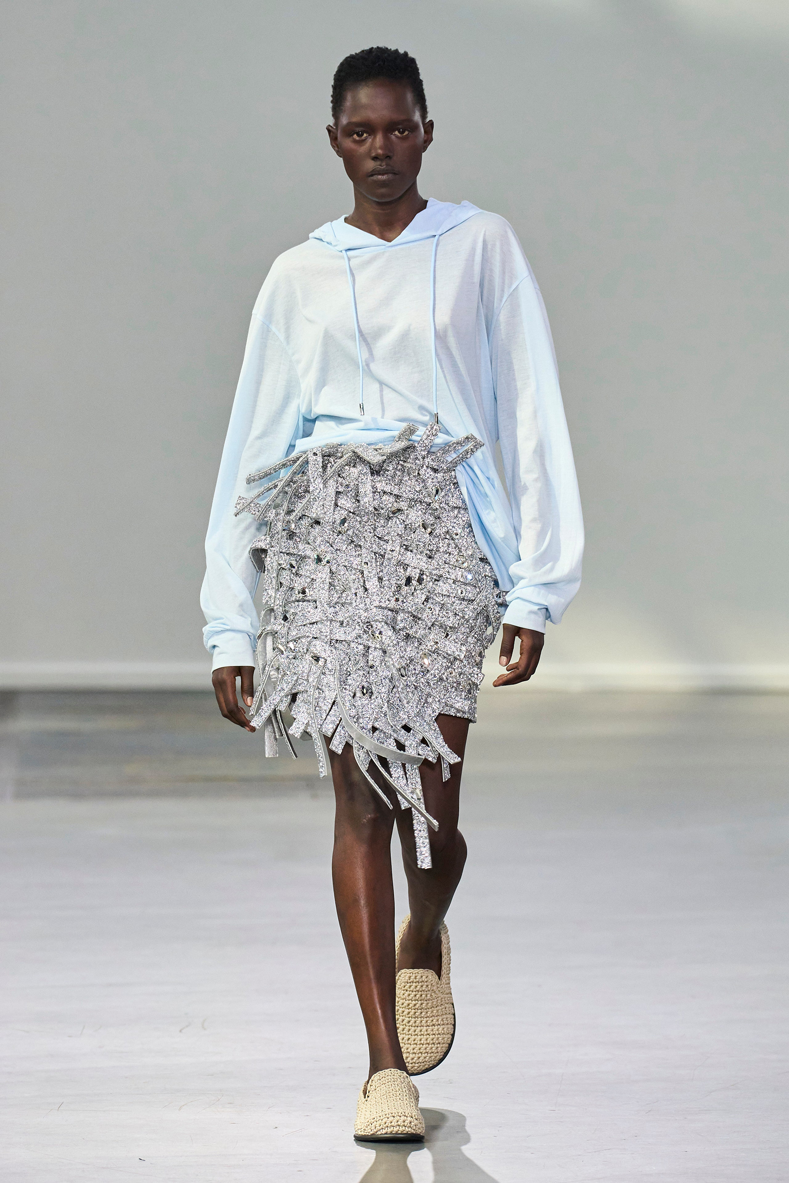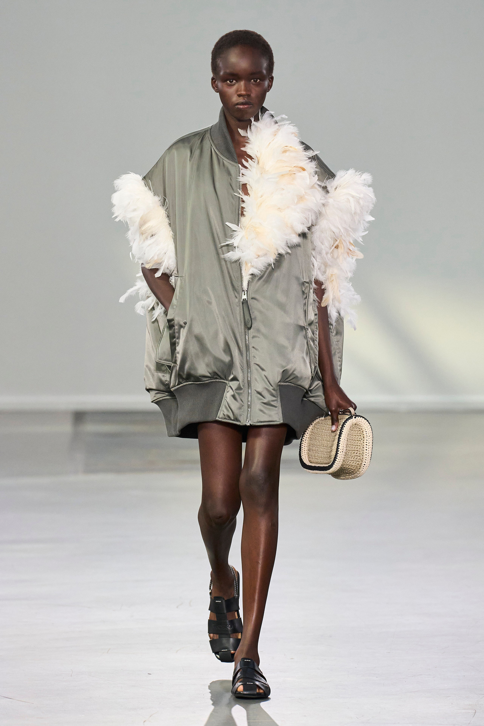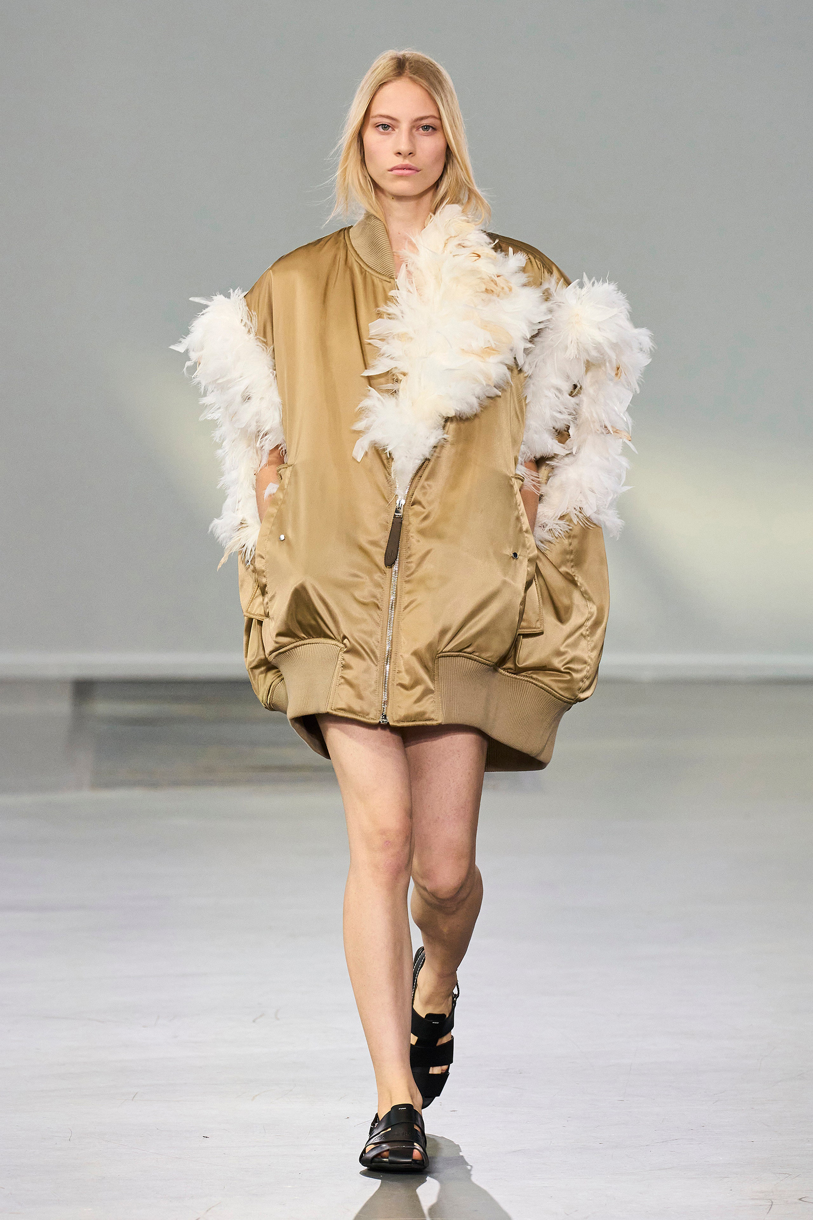 Then: adding glamour to the MA-1 archetype by inflating it as a cocoon and having feathers explode from the seams. And putting something that might have been a Hula-Hoop up the skirt of a knitted dress. Playfulness balanced with practicality might be a way to sum it up. Or as Anderson put it, “Finding the strangeness in the mundane.”