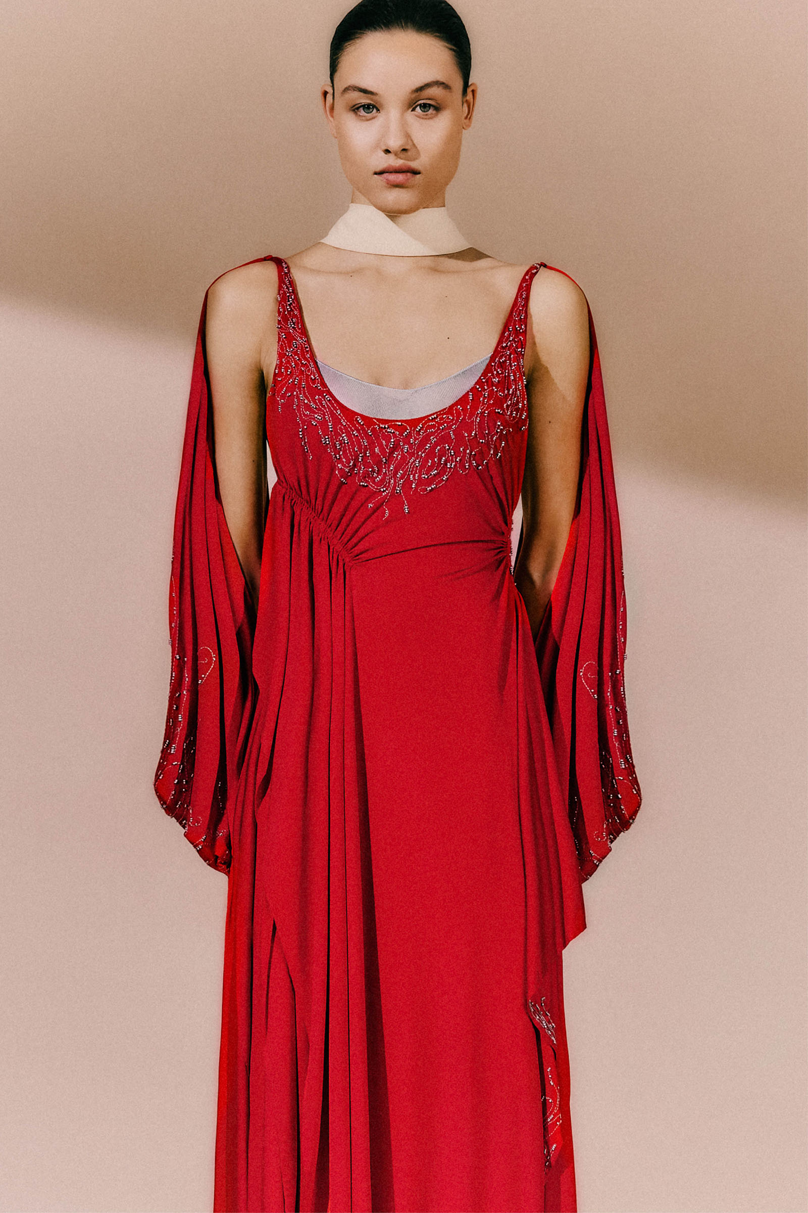 As Karl Lagerfeld once observed of Jeanne Lanvin: “Her image wasn’t as strong as that of Chanel because she was a nice old lady and not a fashion plate.” That enigmatic quality freed the house’s team to shape a tight collection that was rooted in 1920s style despite it being a period when Lanvin’s most contemporaneously revered volumes were themselves slightly out of time. There was some highly impressive chain and pearl detailing that created a wonderful opalescence on fringe-edged or pleat-fronted and cuffed dresses. And there were hints of the medieval (a Lanvin 1.0 motif) in cross-laced and keyhole heart necklines. In the look book, but not on show at the presentation, was a concession to that volume in hotly colored tailoring.