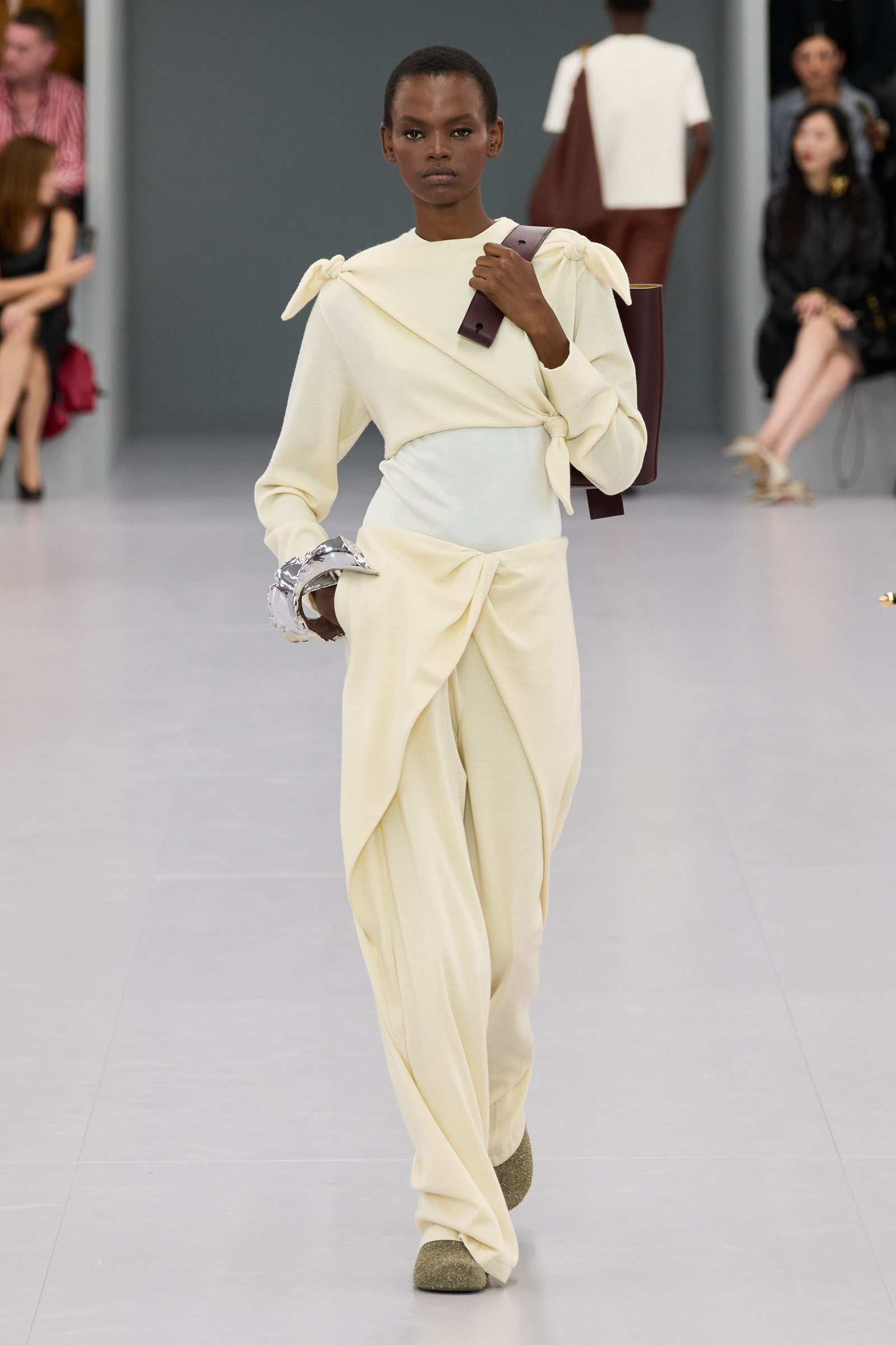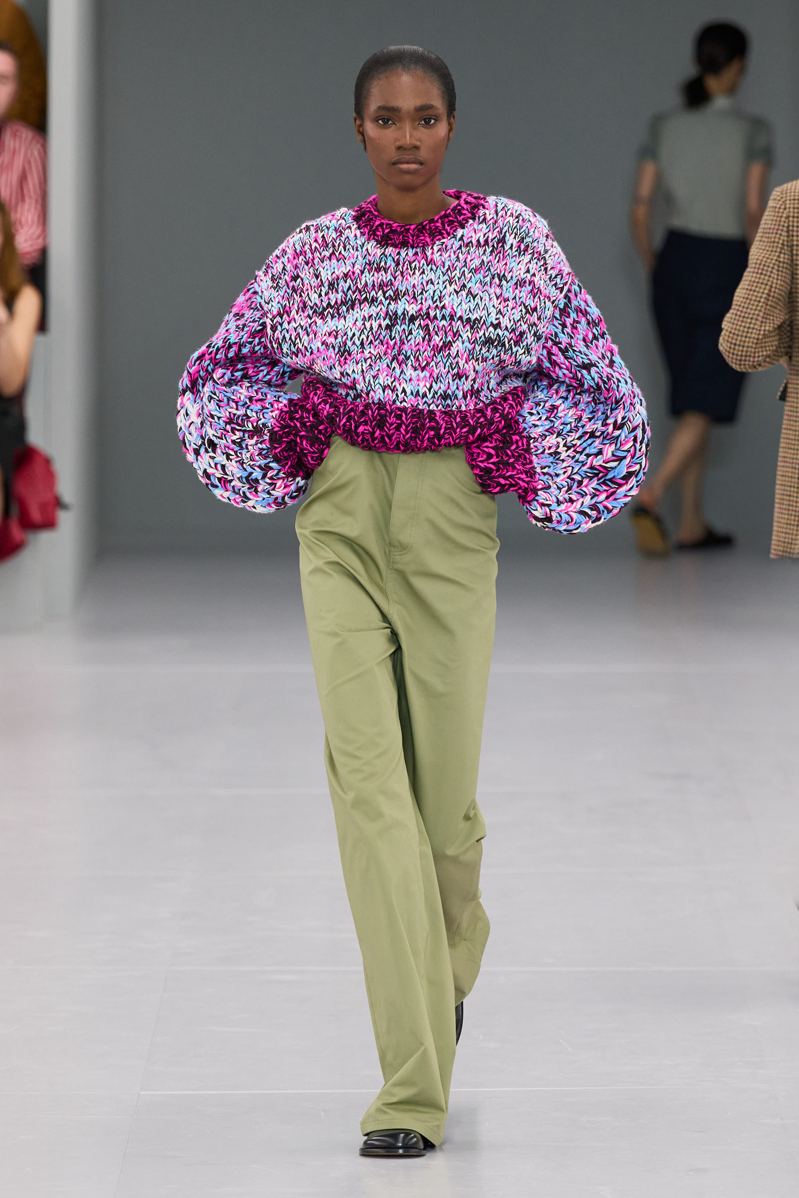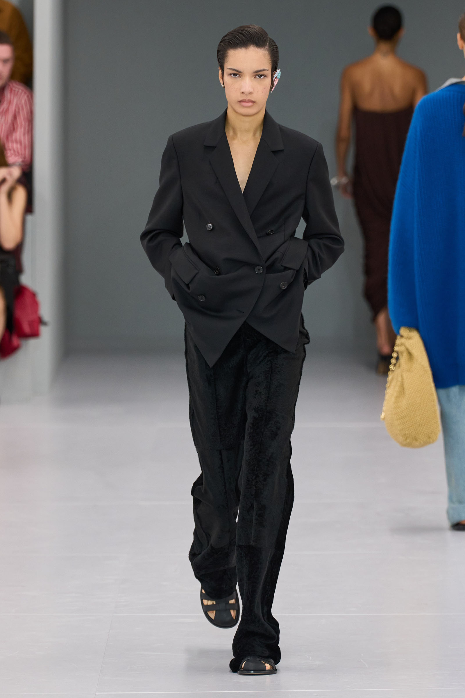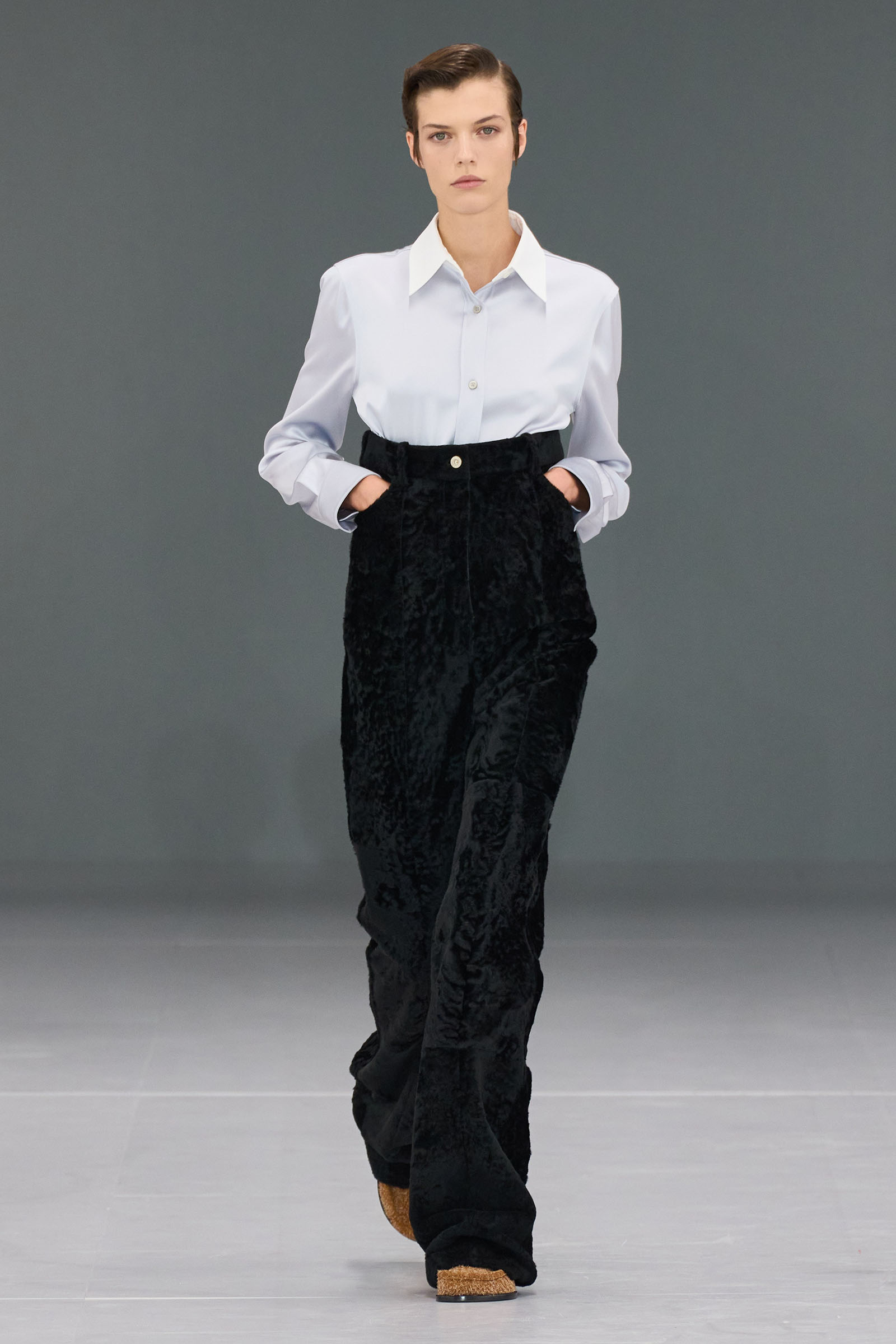 He mentioned in passing how much the Spanish roots of Loewe inspires him. When you think about that, was there the subtlest hint of the matador silhouette behind those high-waist trousers? Anderson first showed them on men at Loewe in June. “There’s a small corset inside” to keep them up, he added—which happens to be an inner detail of a bullfighter’s costume too.