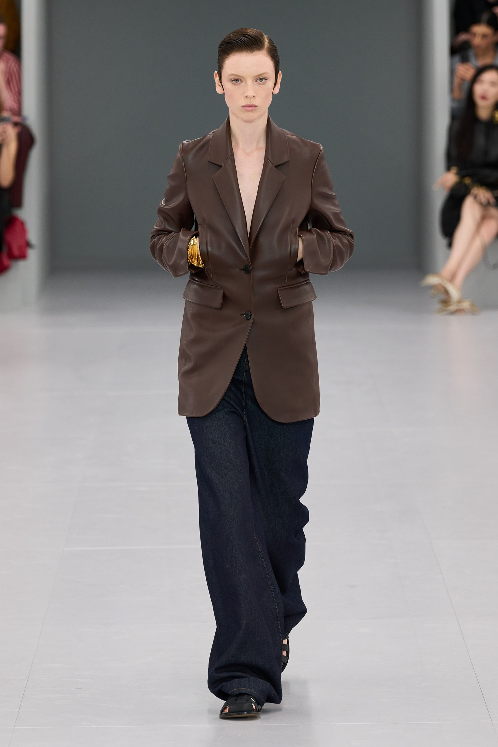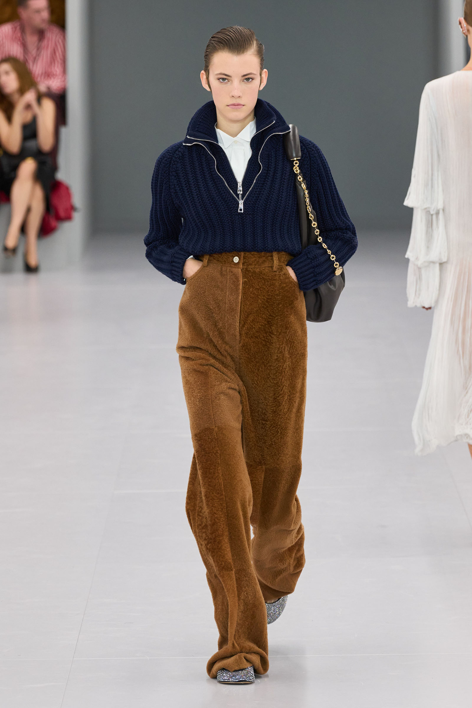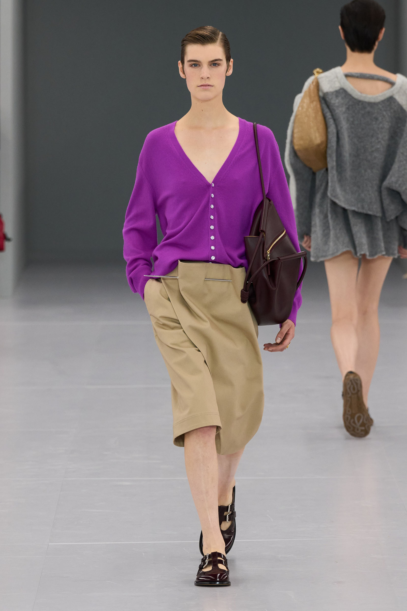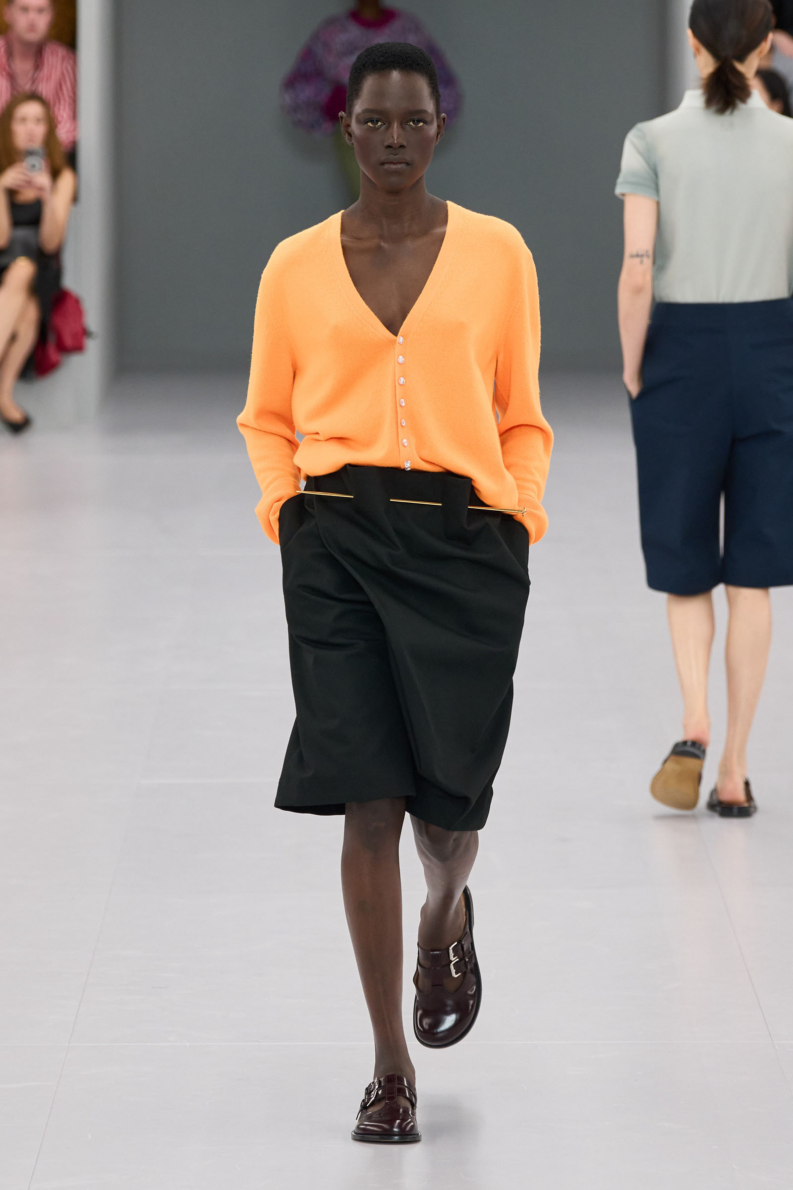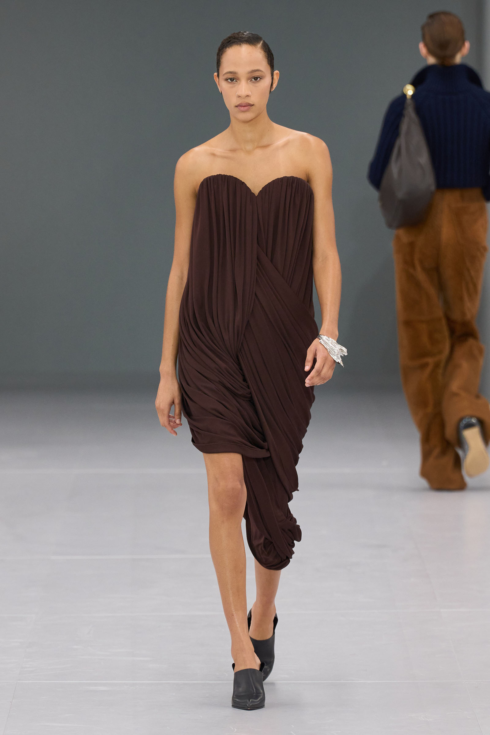 He mentioned in passing how much the Spanish roots of Loewe inspires him. When you think about that, was there the subtlest hint of the matador silhouette behind those high-waist trousers? Anderson first showed them on men at Loewe in June. “There’s a small corset inside” to keep them up, he added—which happens to be an inner detail of a bullfighter’s costume too.