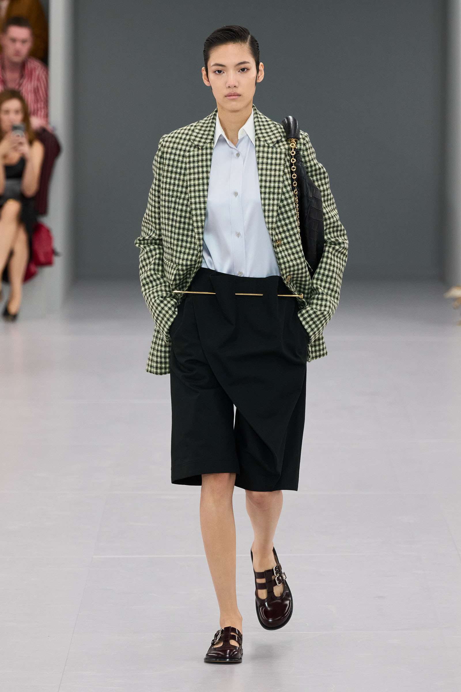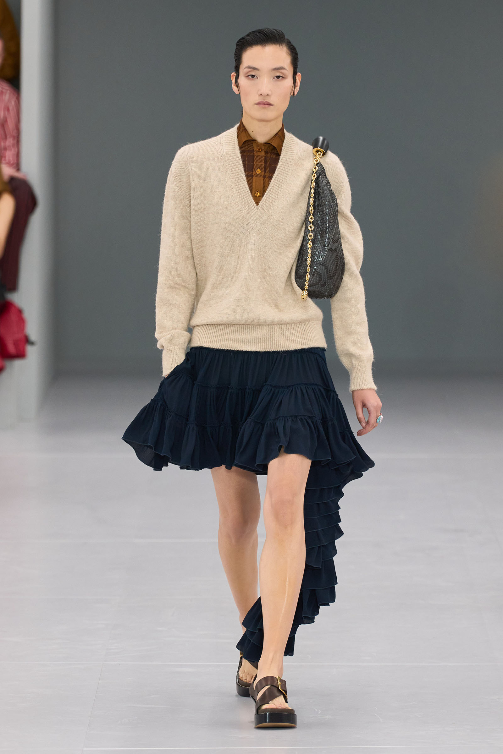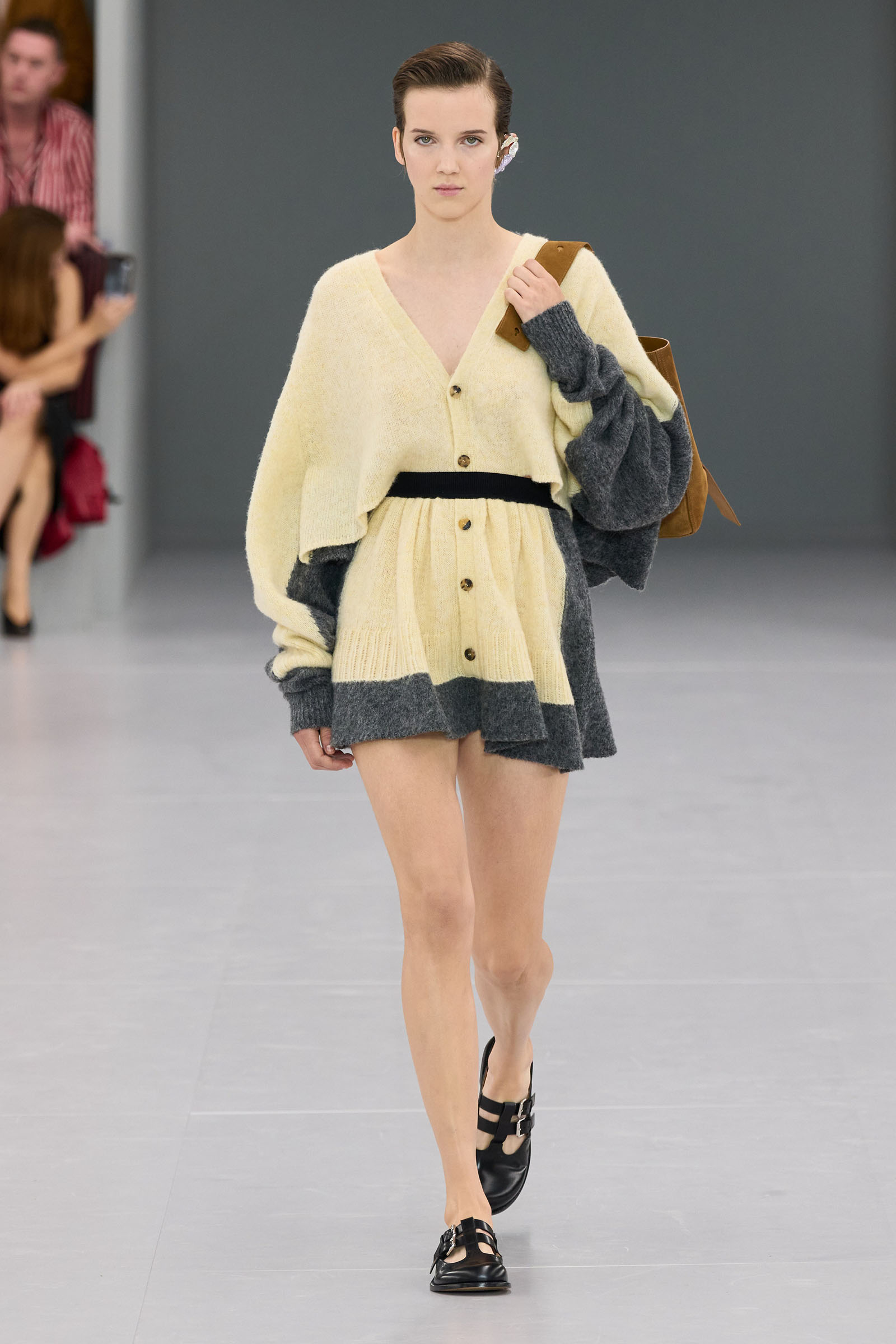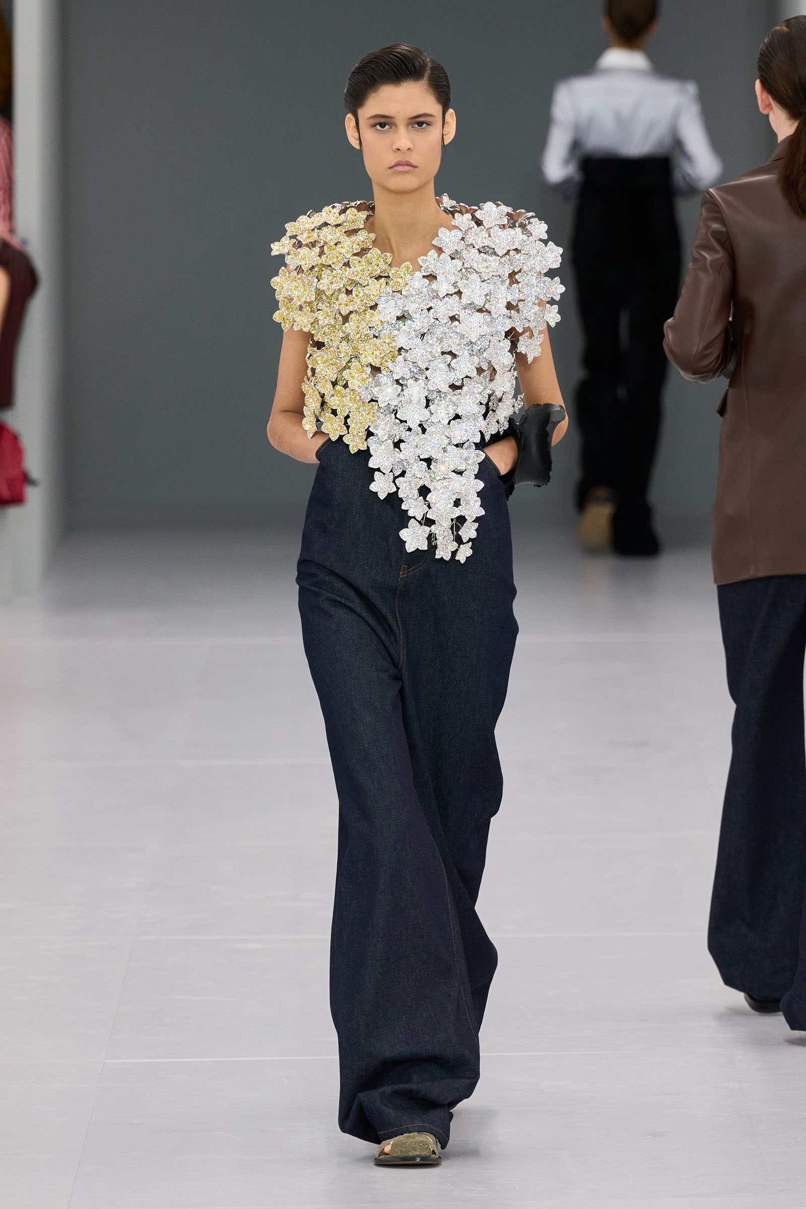 Surrealism was a preoccupation Anderson worked into his post-pandemic Loewe collections and his JW Anderson brand in London. Bringing zing to generics—rugby shirts, knits, T-shirts—is the other side of his talent, plus his unerring knack for bags and accessories. Both of these came together—focused and reiterated—in 14 different ways of wearing his extreme high waists: as “micro-shirts,” as he called them, with a narrow English gamekeeper check jacket, wildly conceptual glittery flower breast pieces, chunky cropped sweaters, and part of a tailored suit.