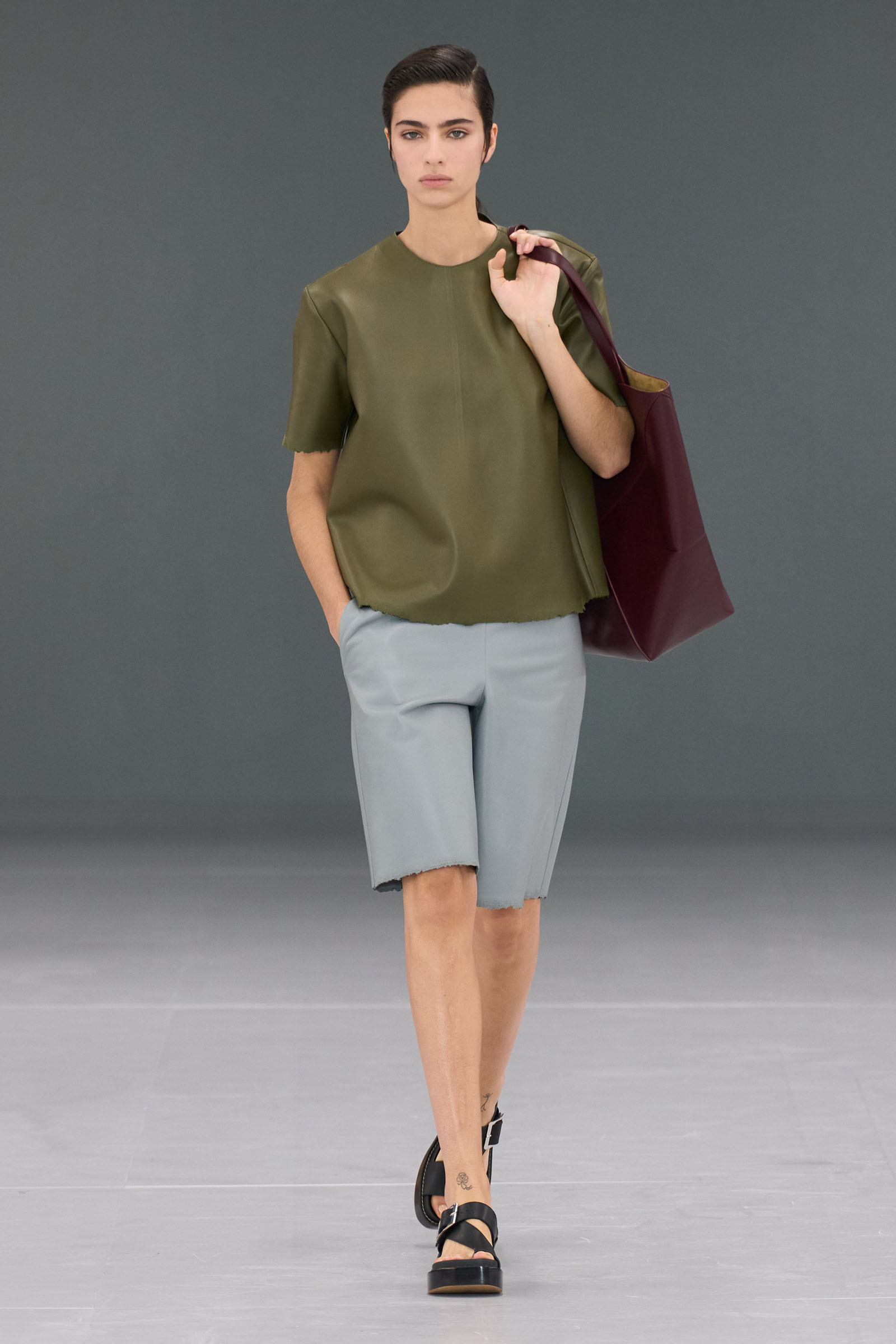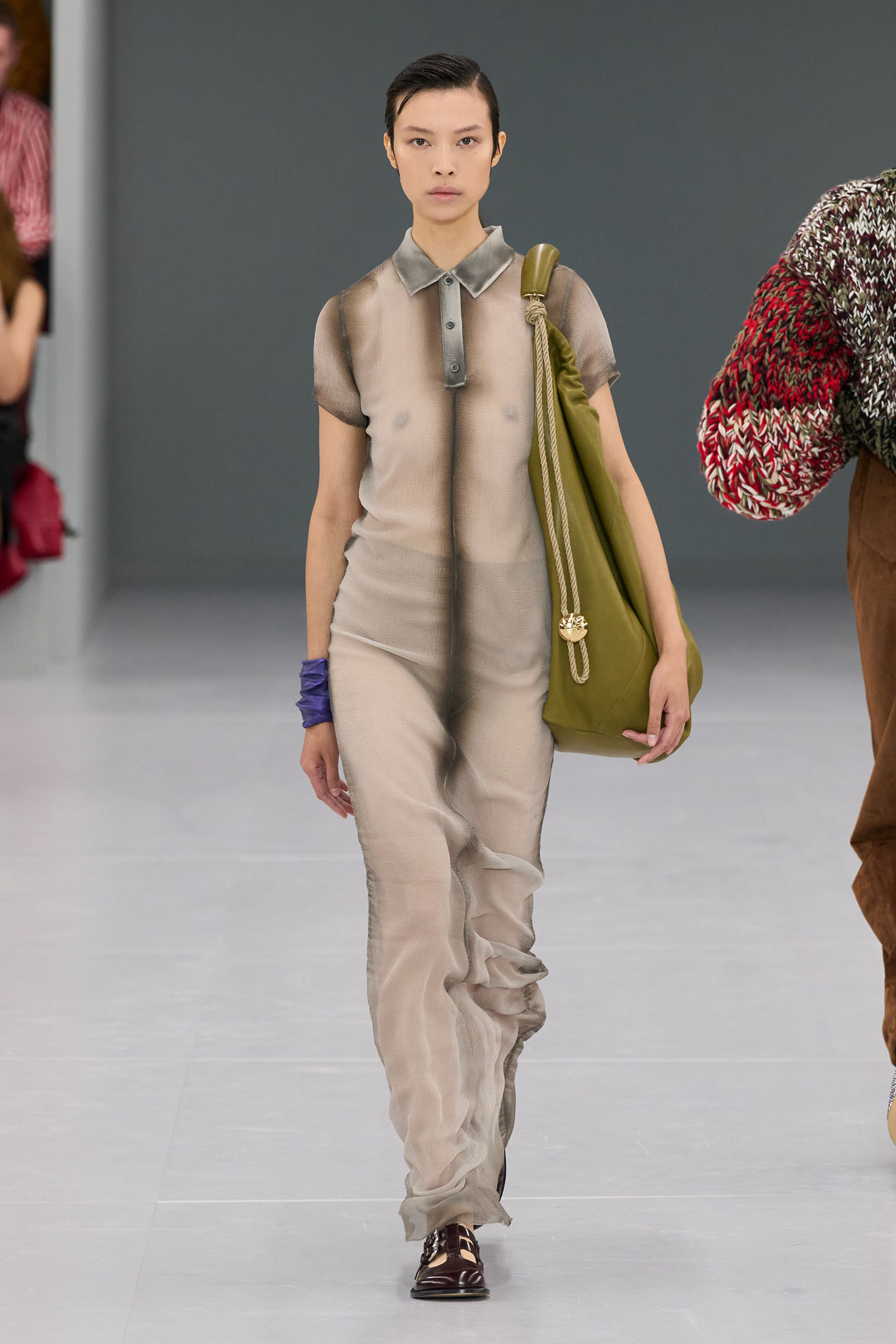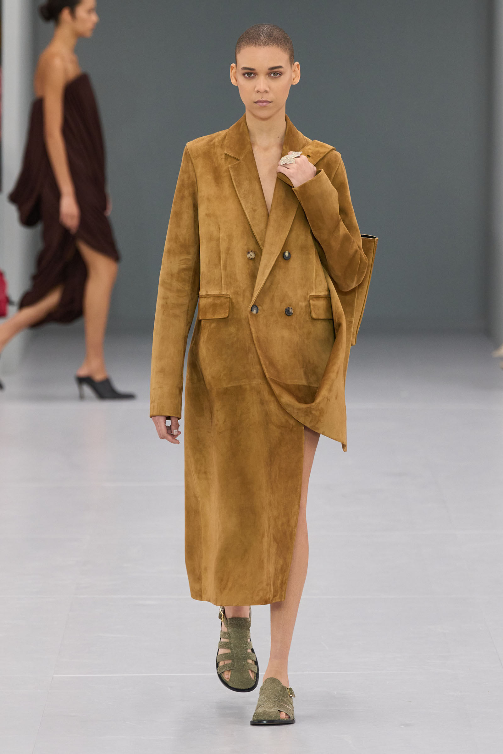 Anderson is renowned for embracing randomness; throwing spanners in the works of logic; making free with experiments, illusions, and oblique channelings of the confused mental states we’re living in today. There was a funny “accidental” moment when coats got caught up in bags. Other pieces came out skewered with huge metal pins. The sophisticated craft capabilities of Loewe were demonstrated both in the luxurious minimalism of raw-edged leather T-shirts and shorts, and in elaborately delicate dresses constructed from strands of some impossibly fine fringing technique.