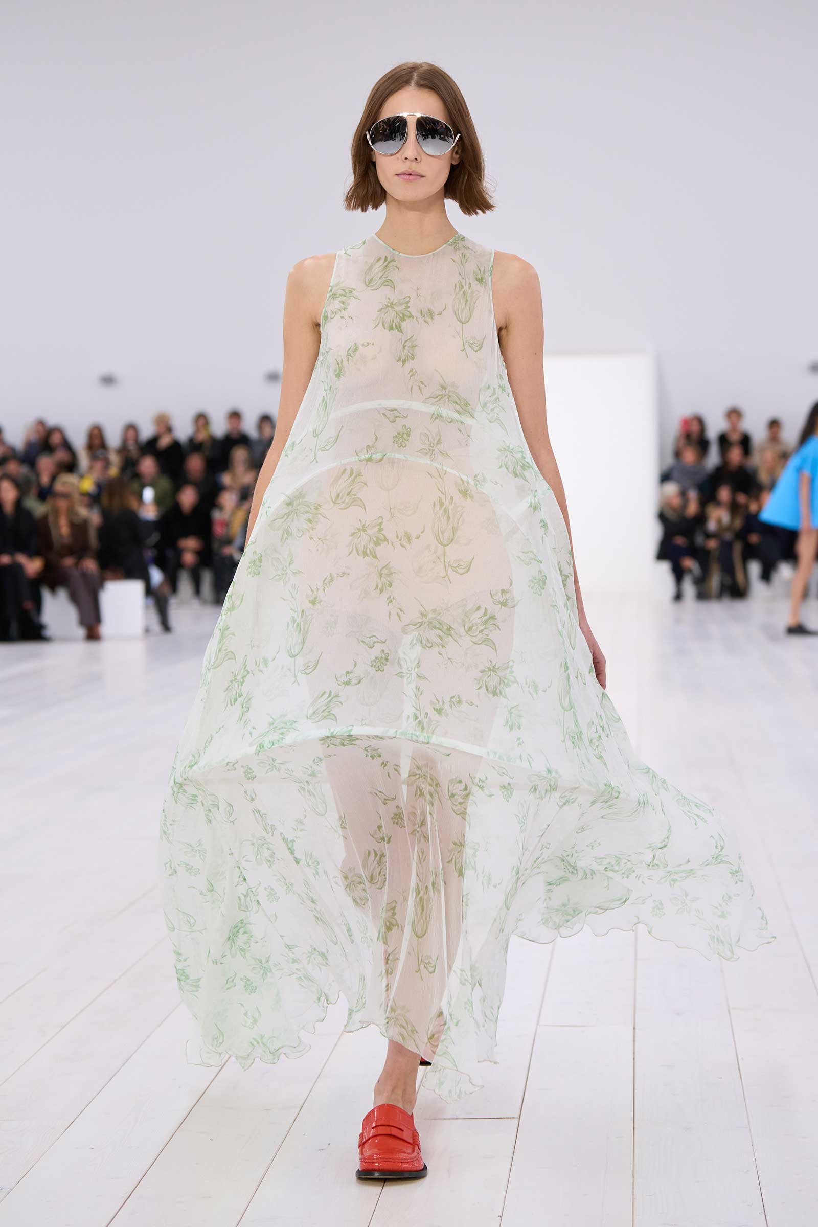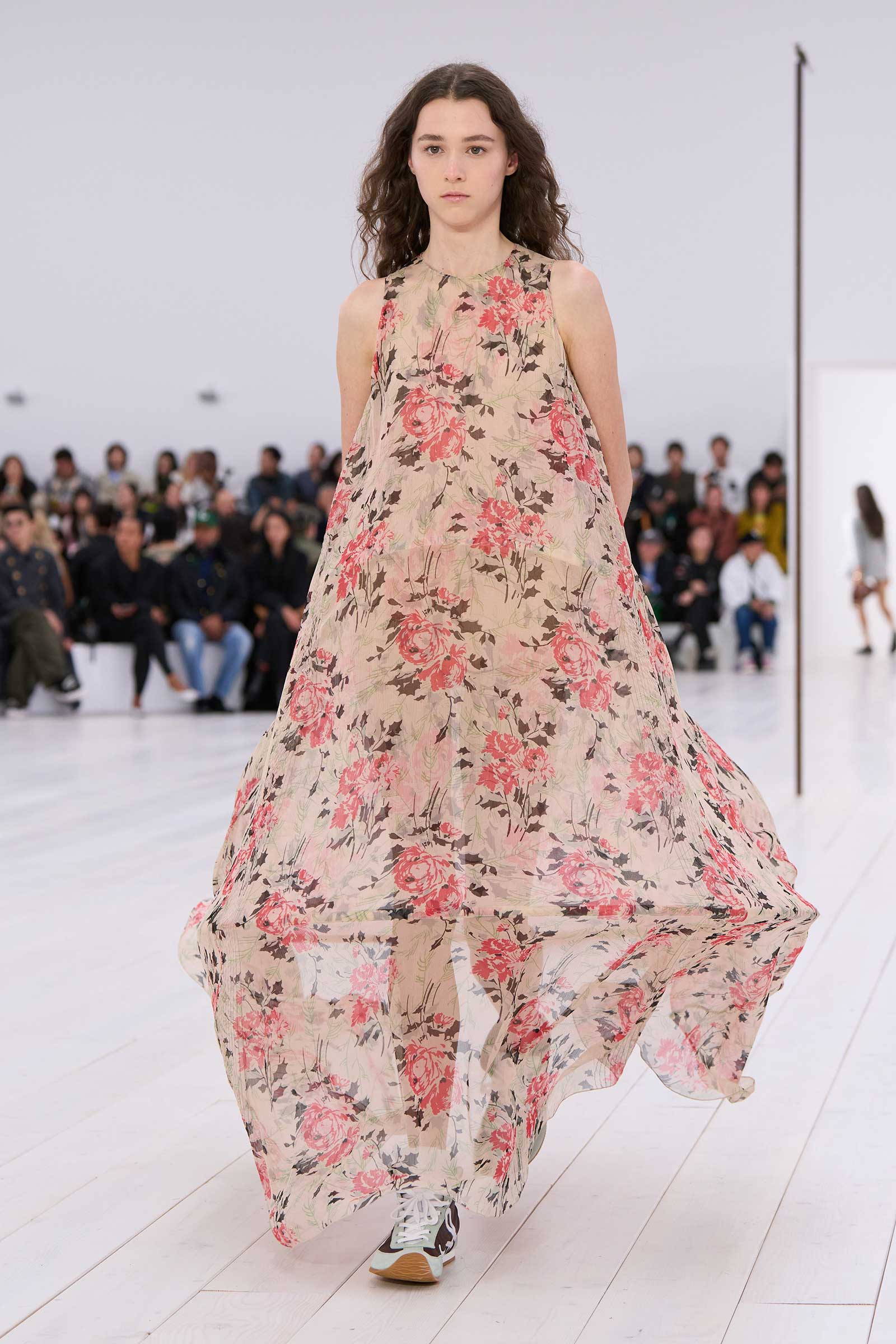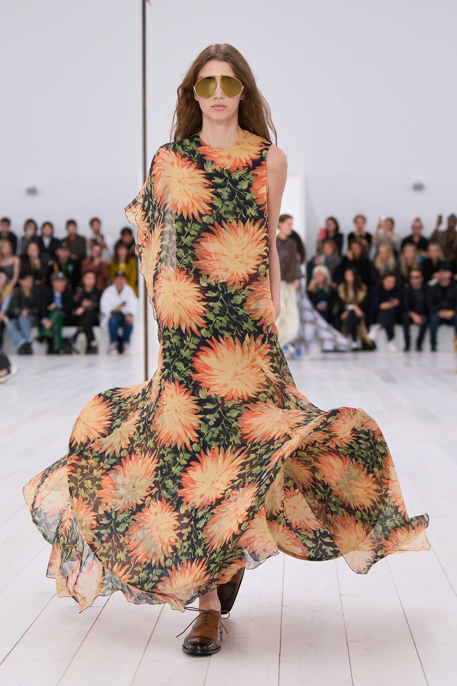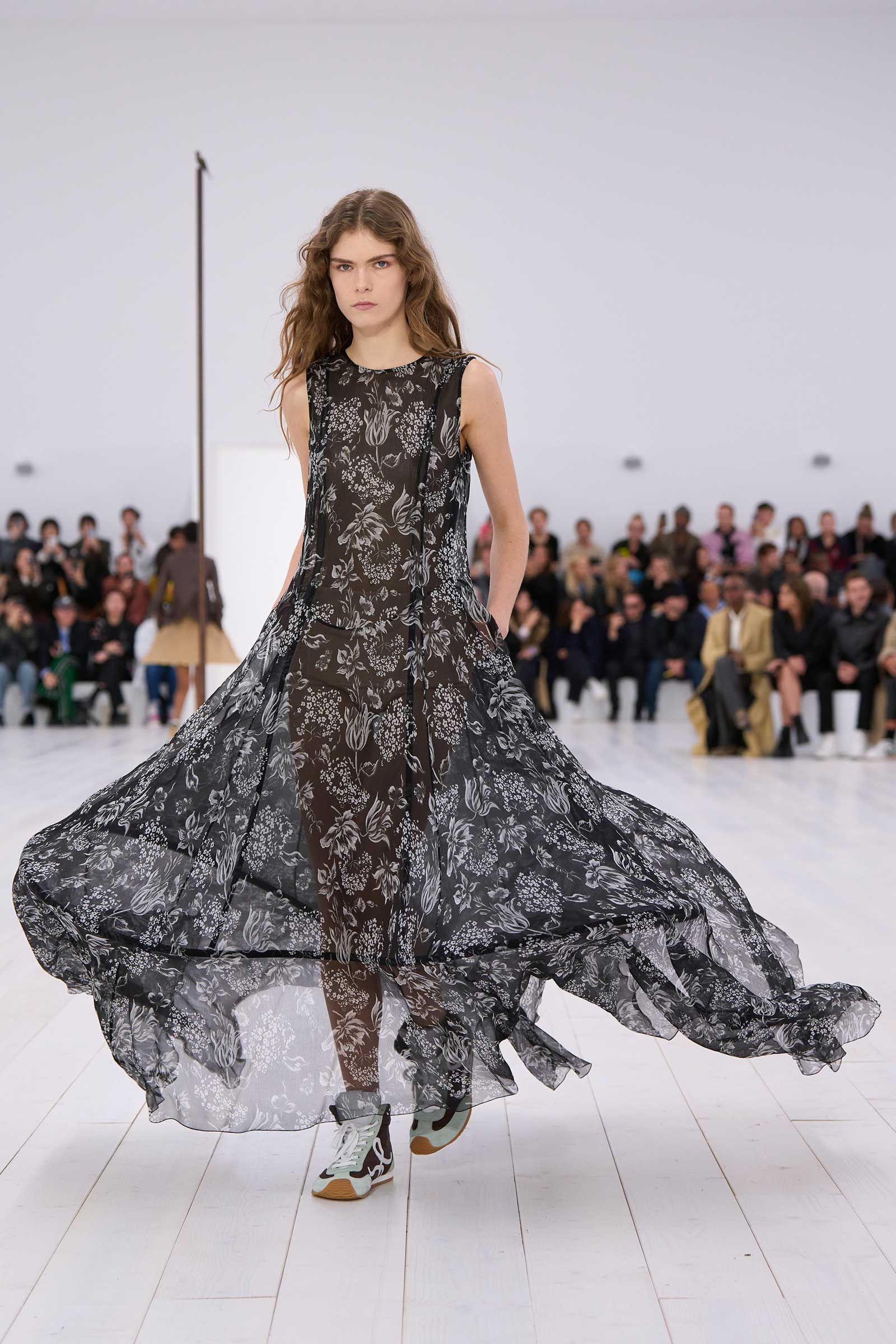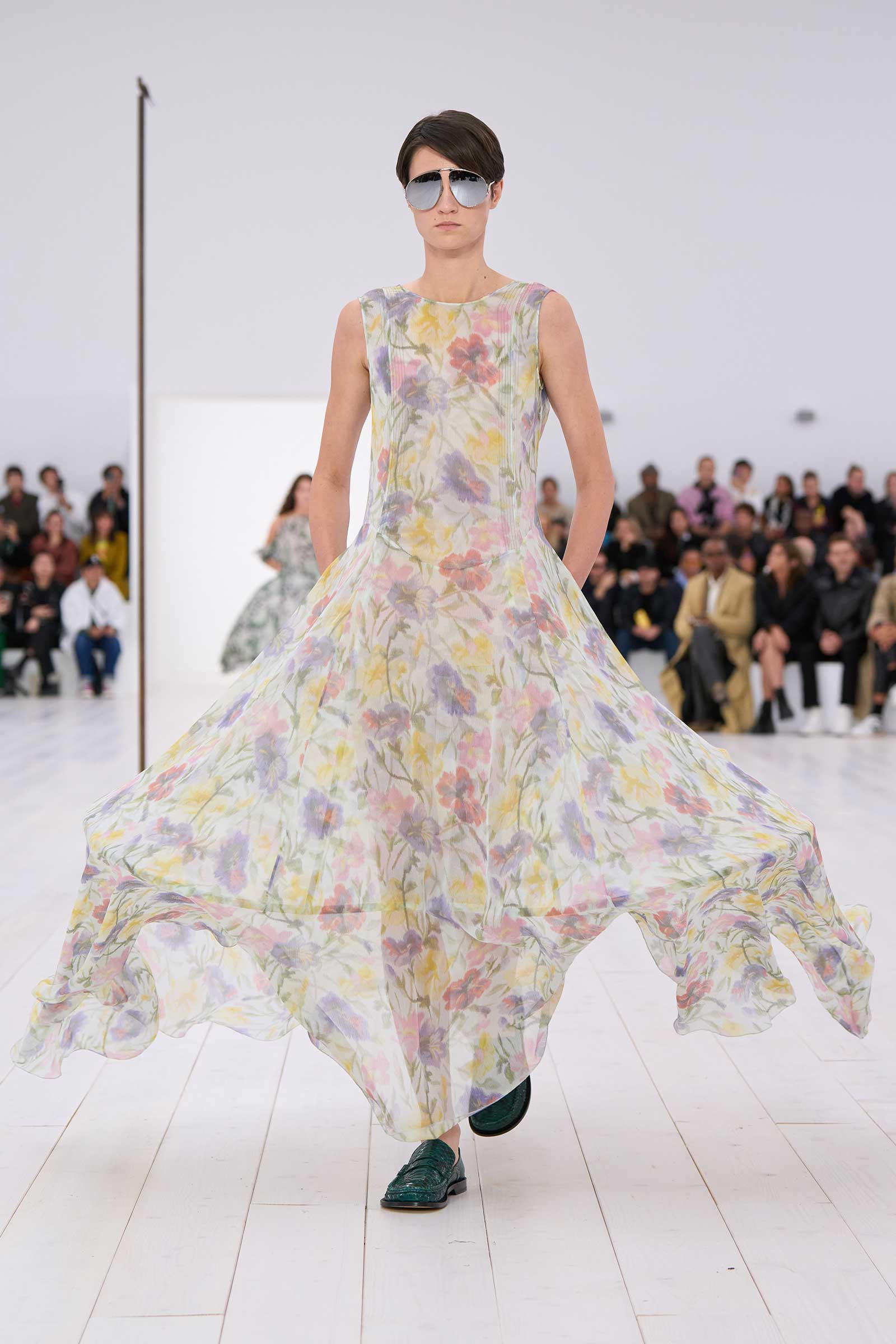 Jonathan Anderson rounded off his decade at Loewe with a show in the round. It began with a bouncingly light, flowered, off-the-shoulder crinoline dress, whose visible underhoops were also circular. Intake of breath: Corseting-free and hands in pockets, the models zipped around in two-tone oxfords and oversized, silver-mirrored aviators, for all the world as casually as if they were wearing sweatshirts and jeans.
