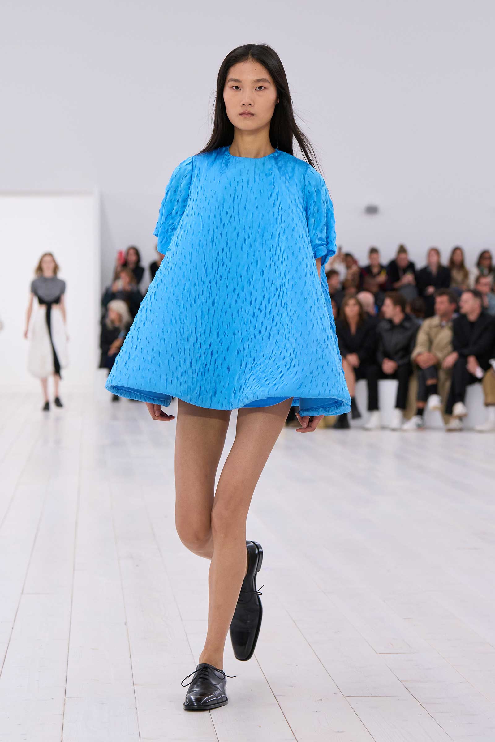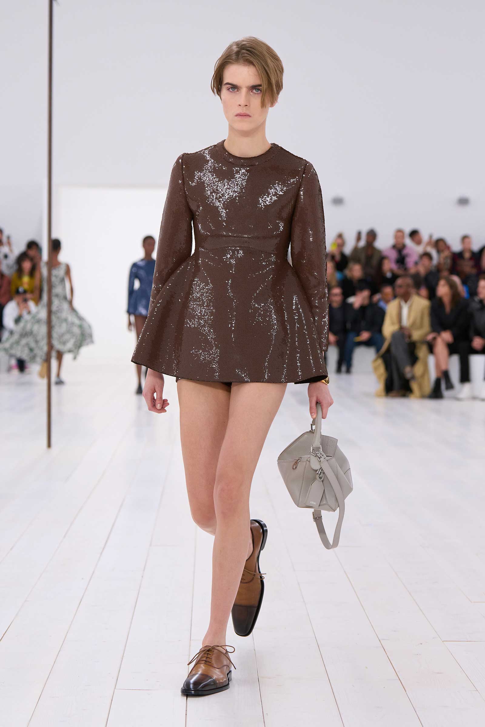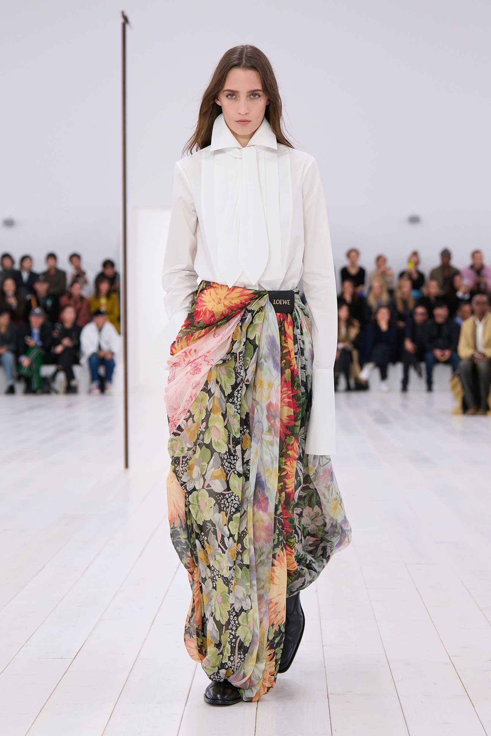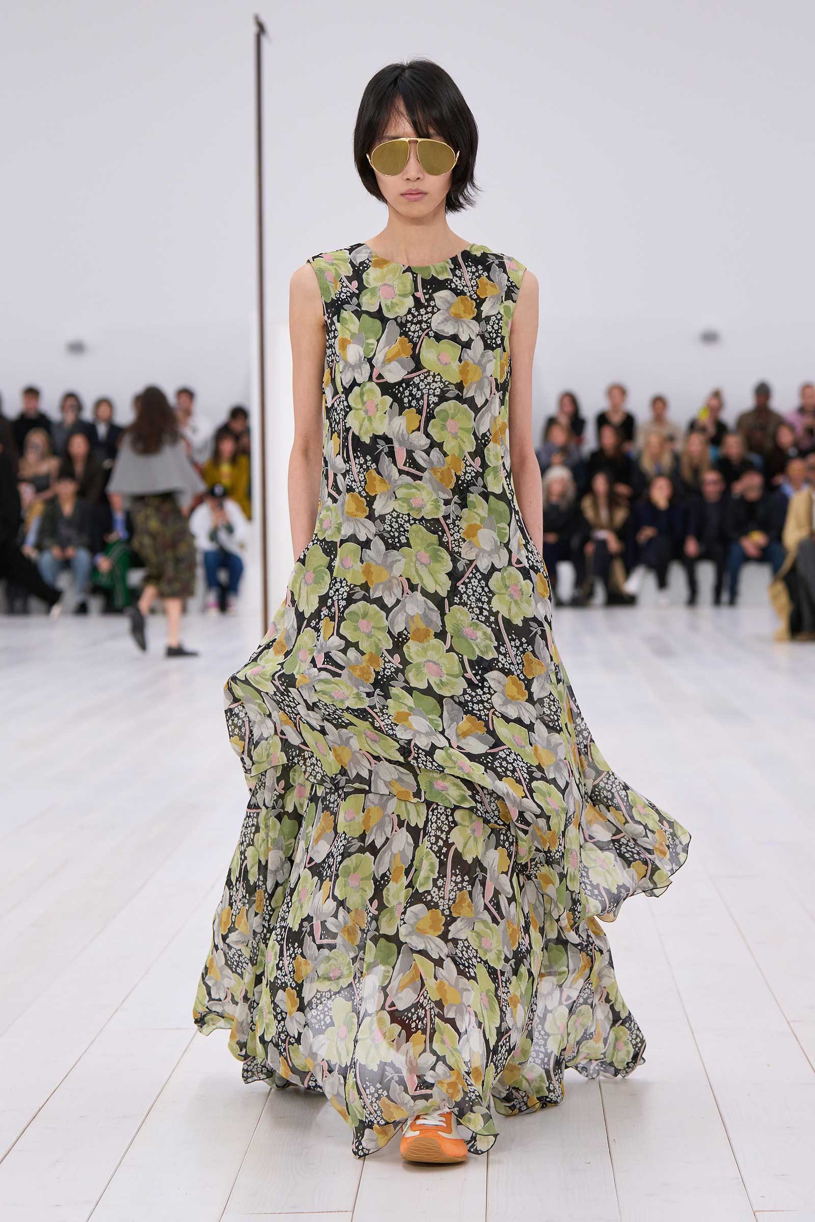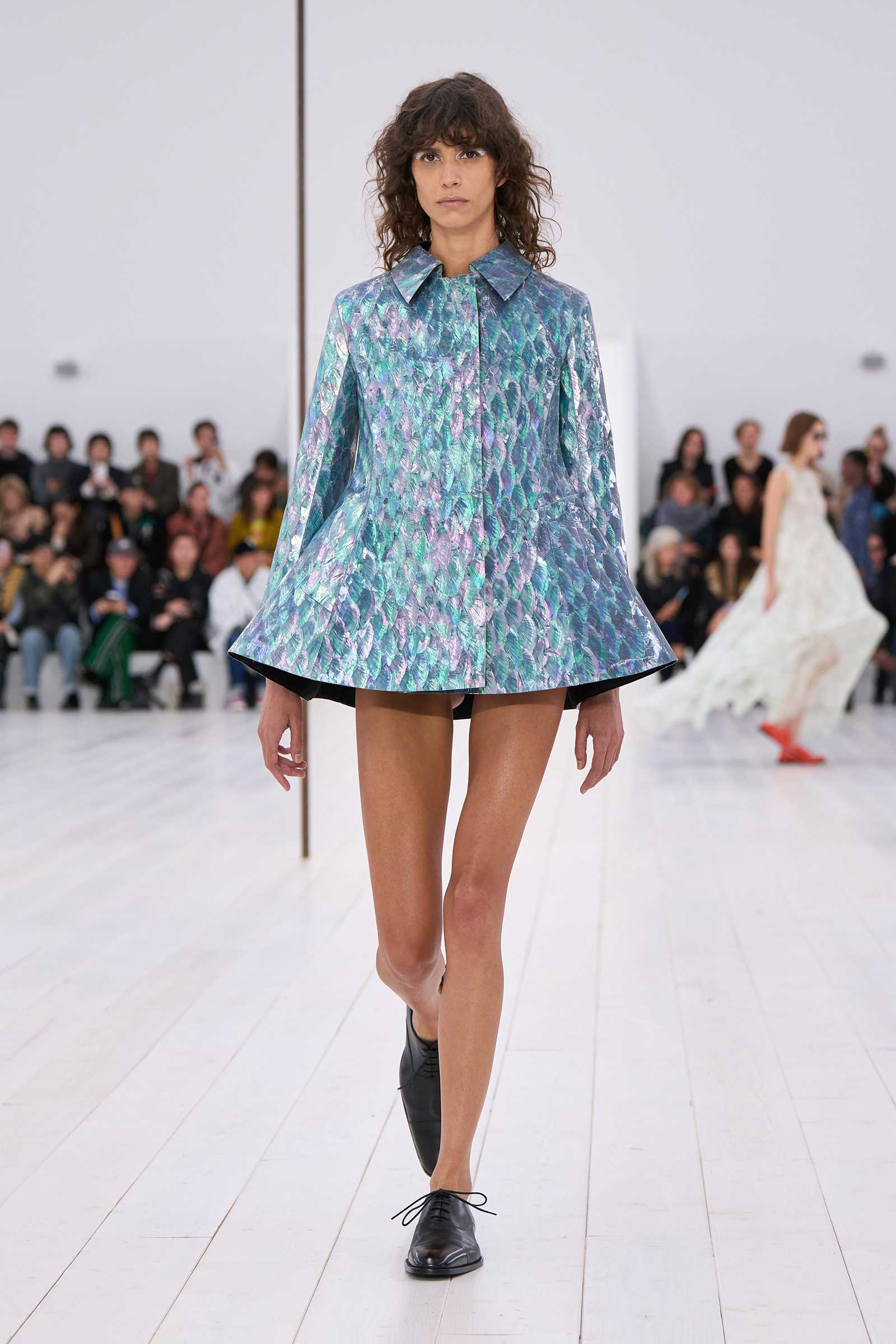 Jonathan Anderson rounded off his decade at Loewe with a show in the round. It began with a bouncingly light, flowered, off-the-shoulder crinoline dress, whose visible underhoops were also circular. Intake of breath: Corseting-free and hands in pockets, the models zipped around in two-tone oxfords and oversized, silver-mirrored aviators, for all the world as casually as if they were wearing sweatshirts and jeans.