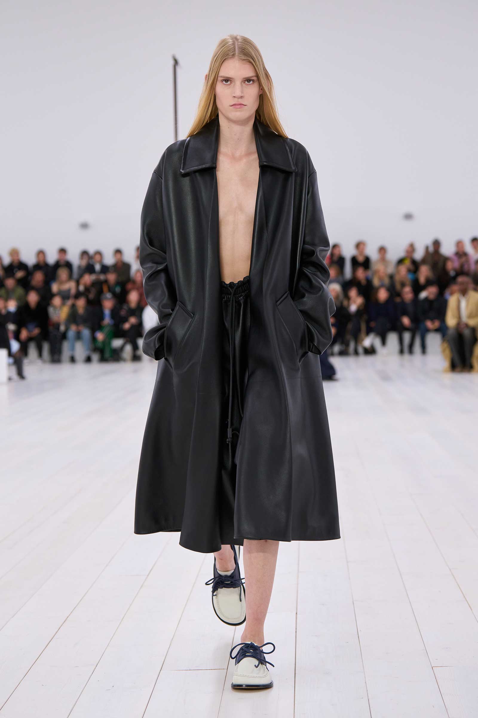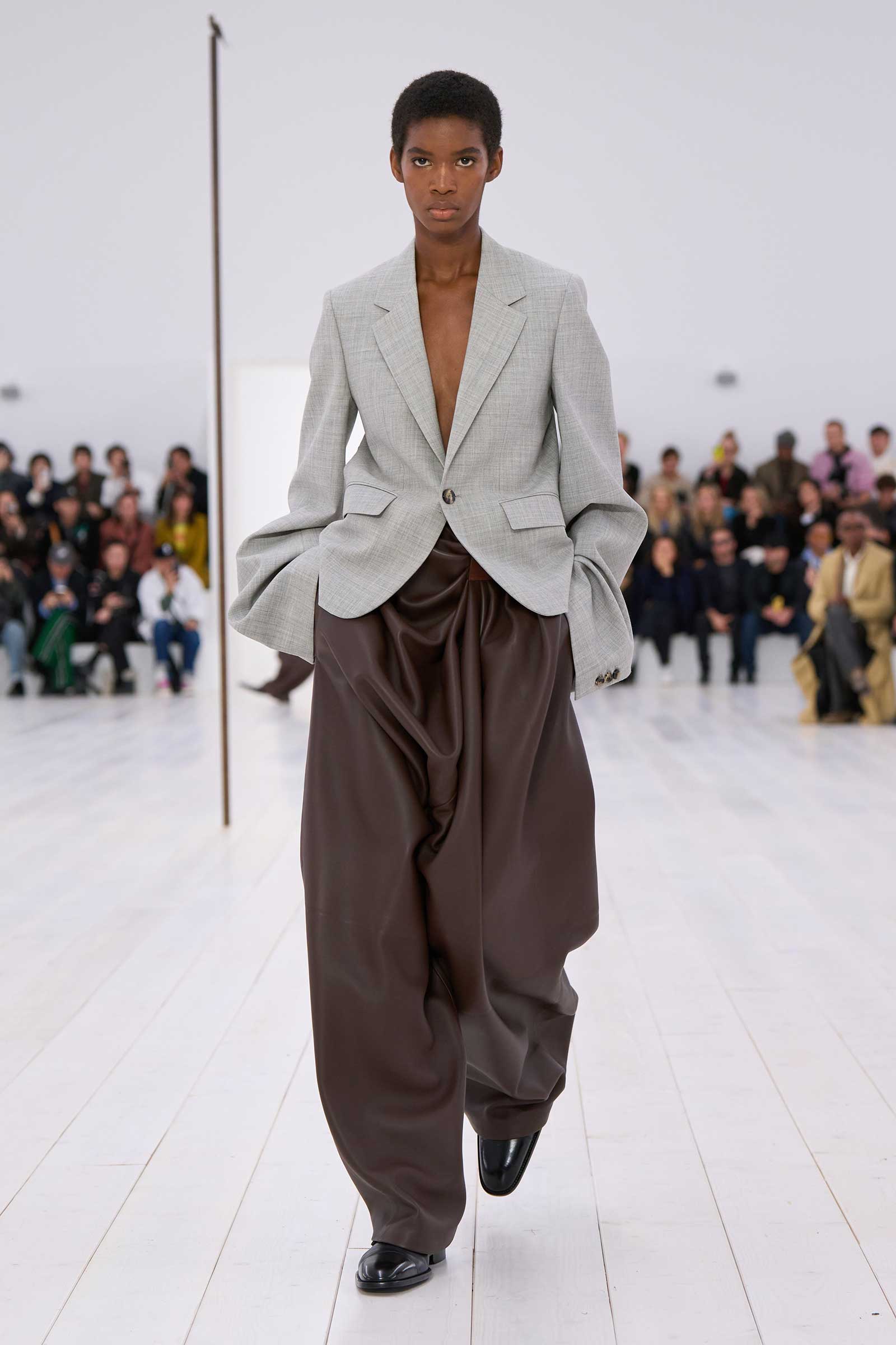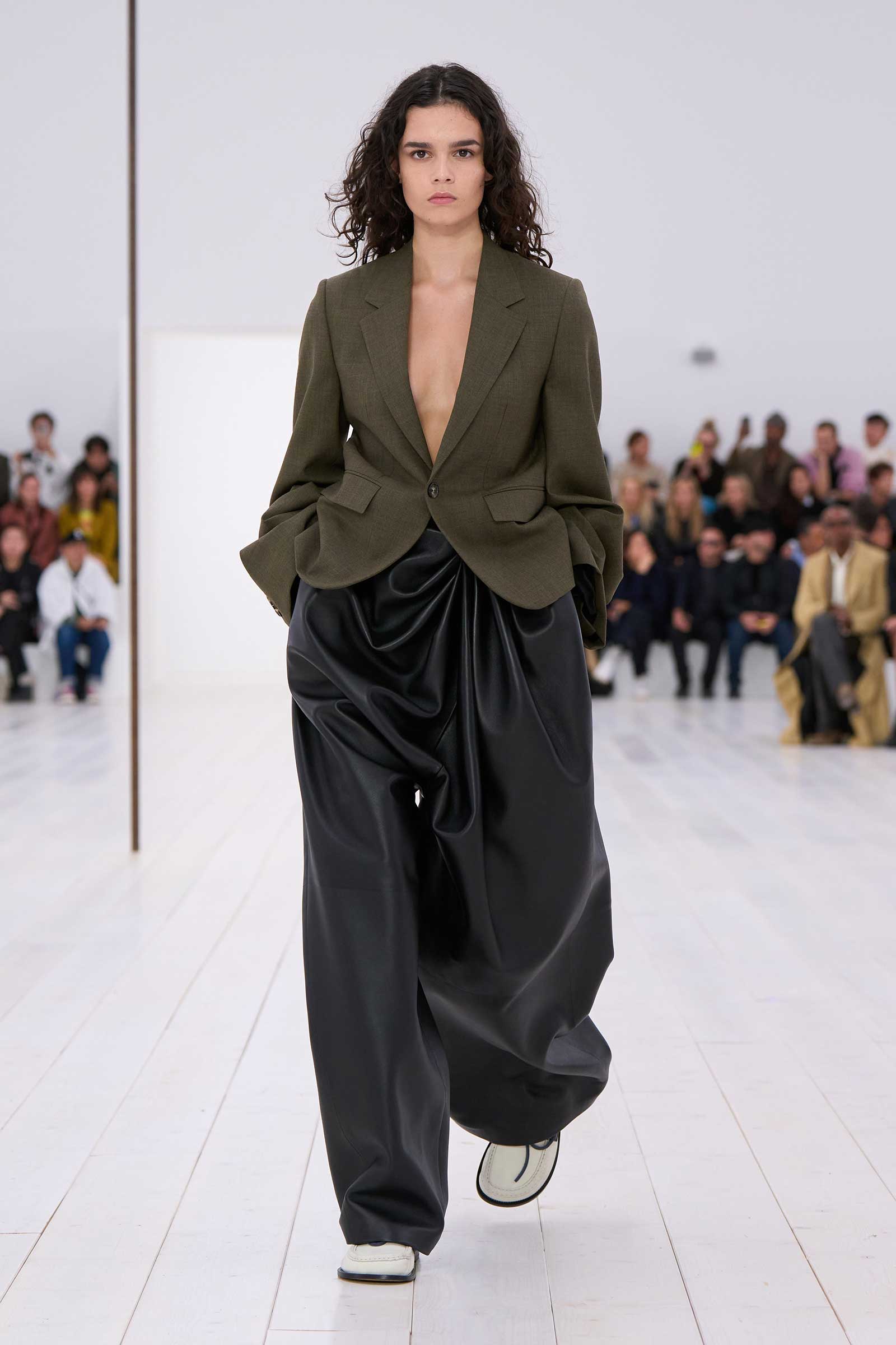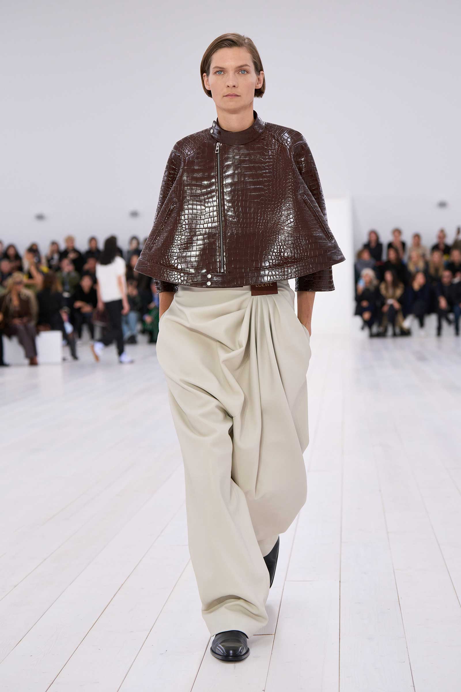 There was no sense that this was a 10-year retrospective of Anderson’s work at Loewe. But then again, the imprint of what he’s done for the formerly little-known Spanish leather house was all over the collection. It emanated maturity, modernity, and a calm ownership of sophisticated tailoring—blazers over elegantly draped voluminous trousers; classic leather coats carved with a turned-up fillip in the hem. This quite apart from creating all the commercial catnip signatures—ultra-desirable bags and the Ballet Runner logo sneakers—that are recognized and wanted by every girl and her mother worldwide.