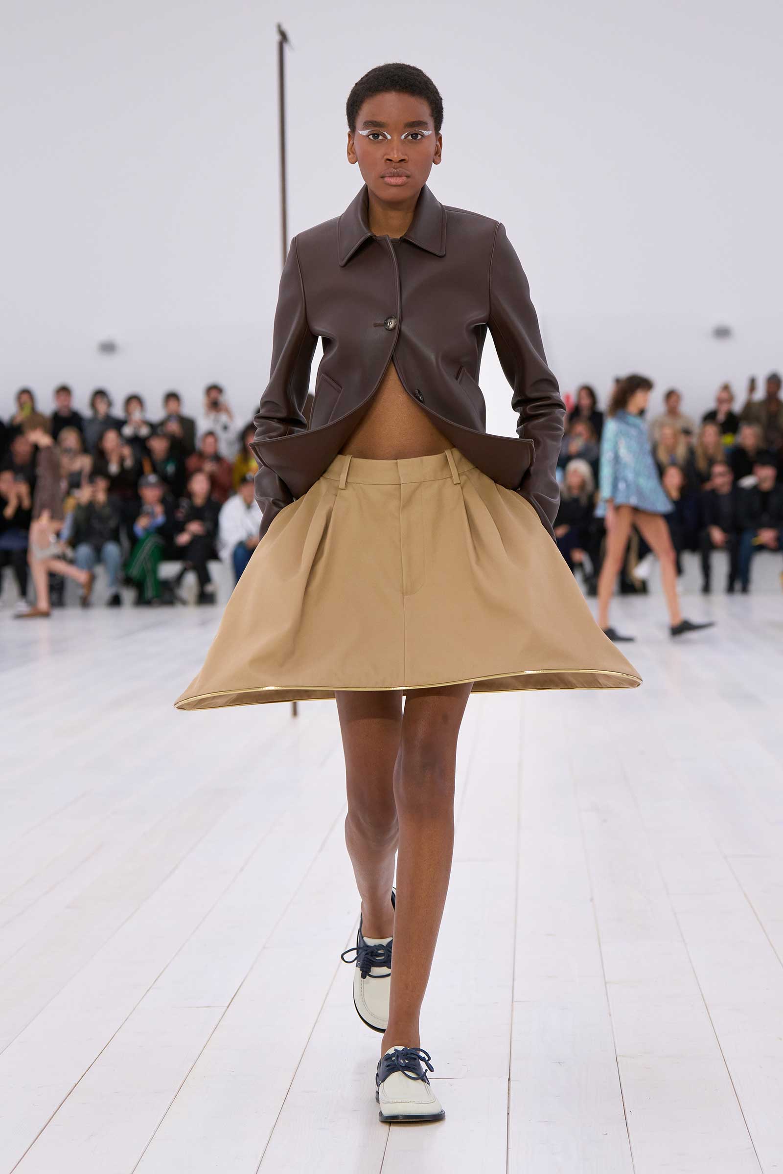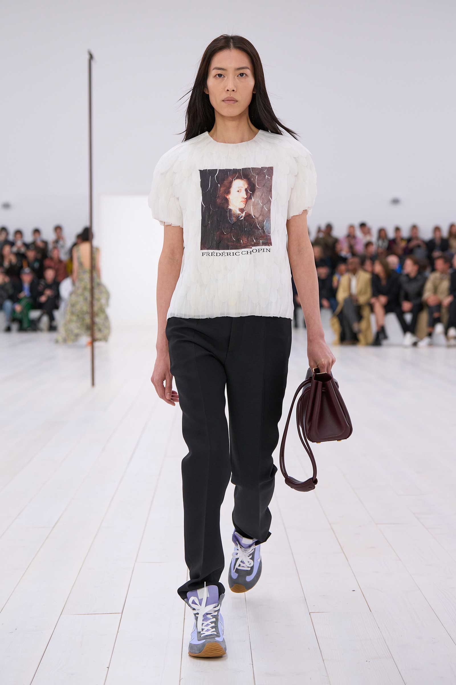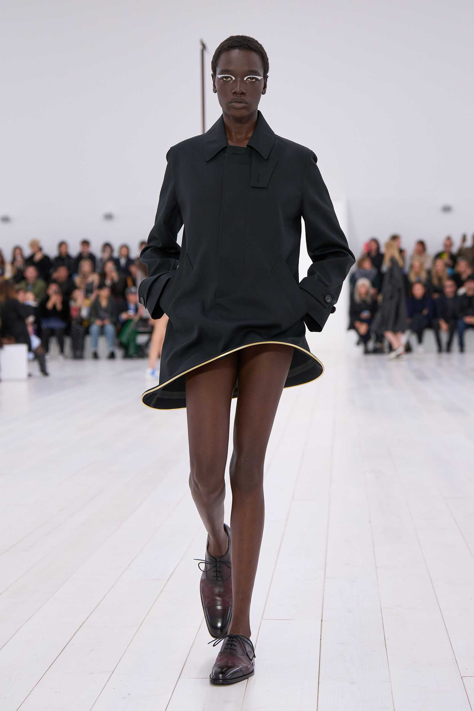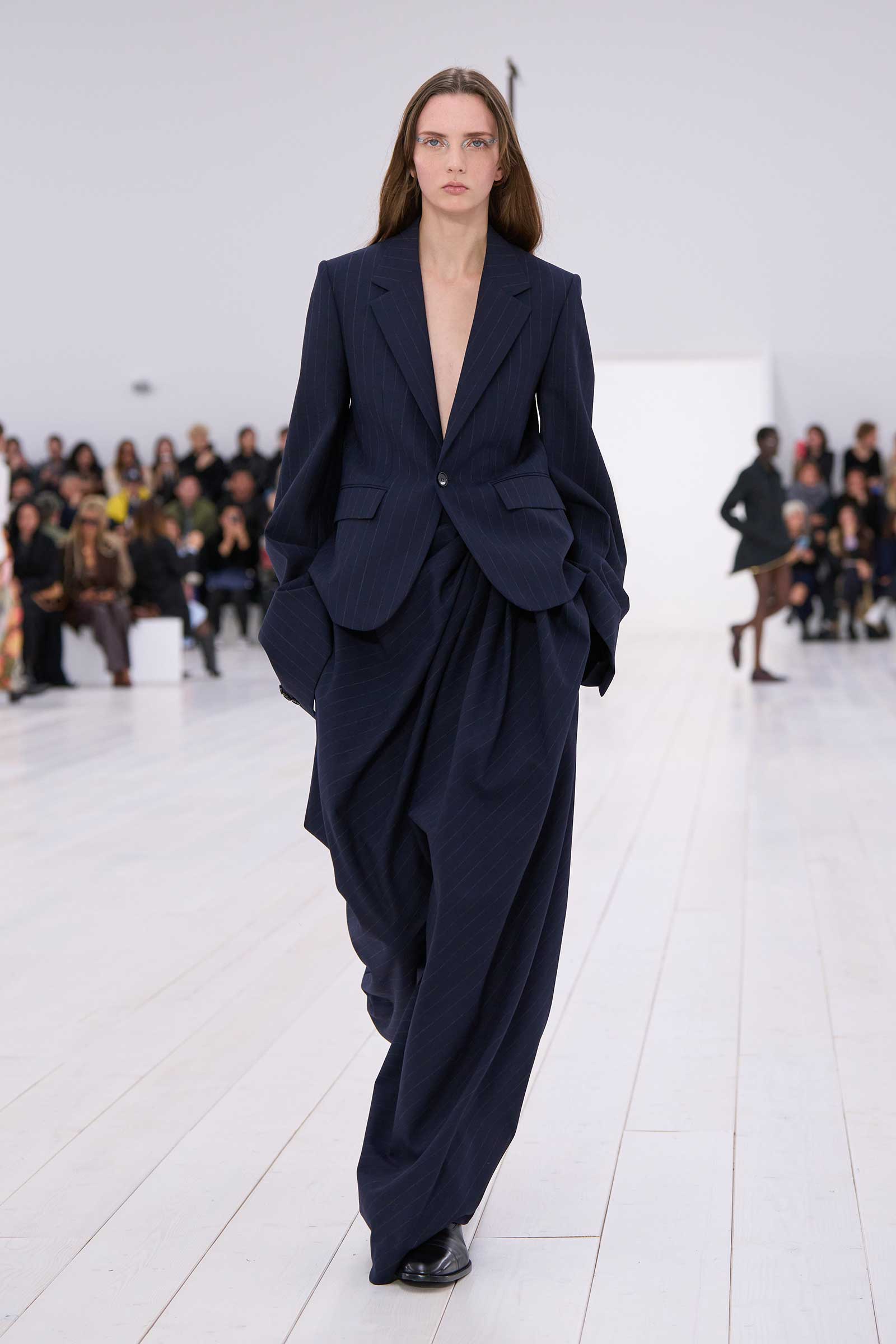 There was no sense that this was a 10-year retrospective of Anderson’s work at Loewe. But then again, the imprint of what he’s done for the formerly little-known Spanish leather house was all over the collection. It emanated maturity, modernity, and a calm ownership of sophisticated tailoring—blazers over elegantly draped voluminous trousers; classic leather coats carved with a turned-up fillip in the hem. This quite apart from creating all the commercial catnip signatures—ultra-desirable bags and the Ballet Runner logo sneakers—that are recognized and wanted by every girl and her mother worldwide.