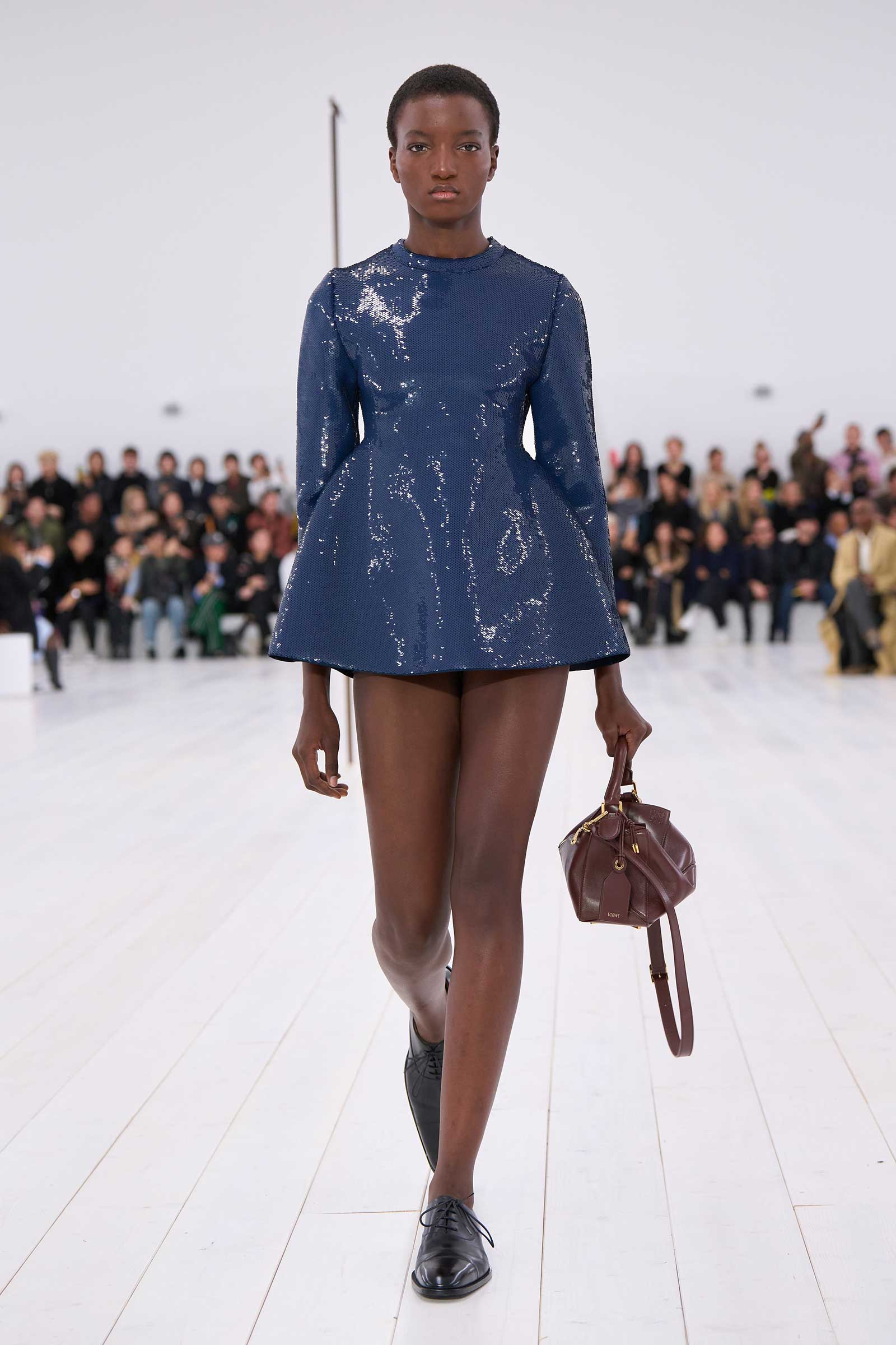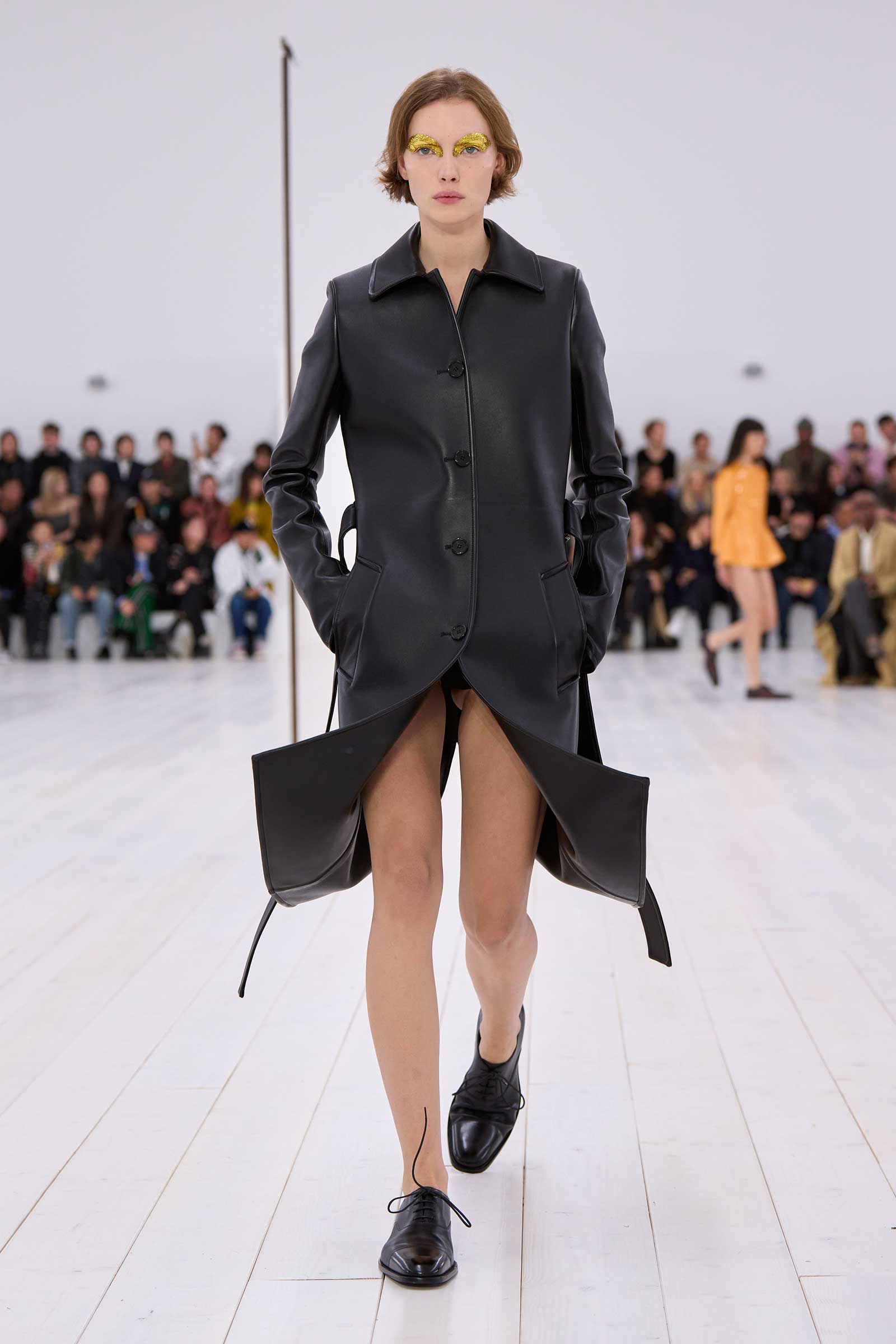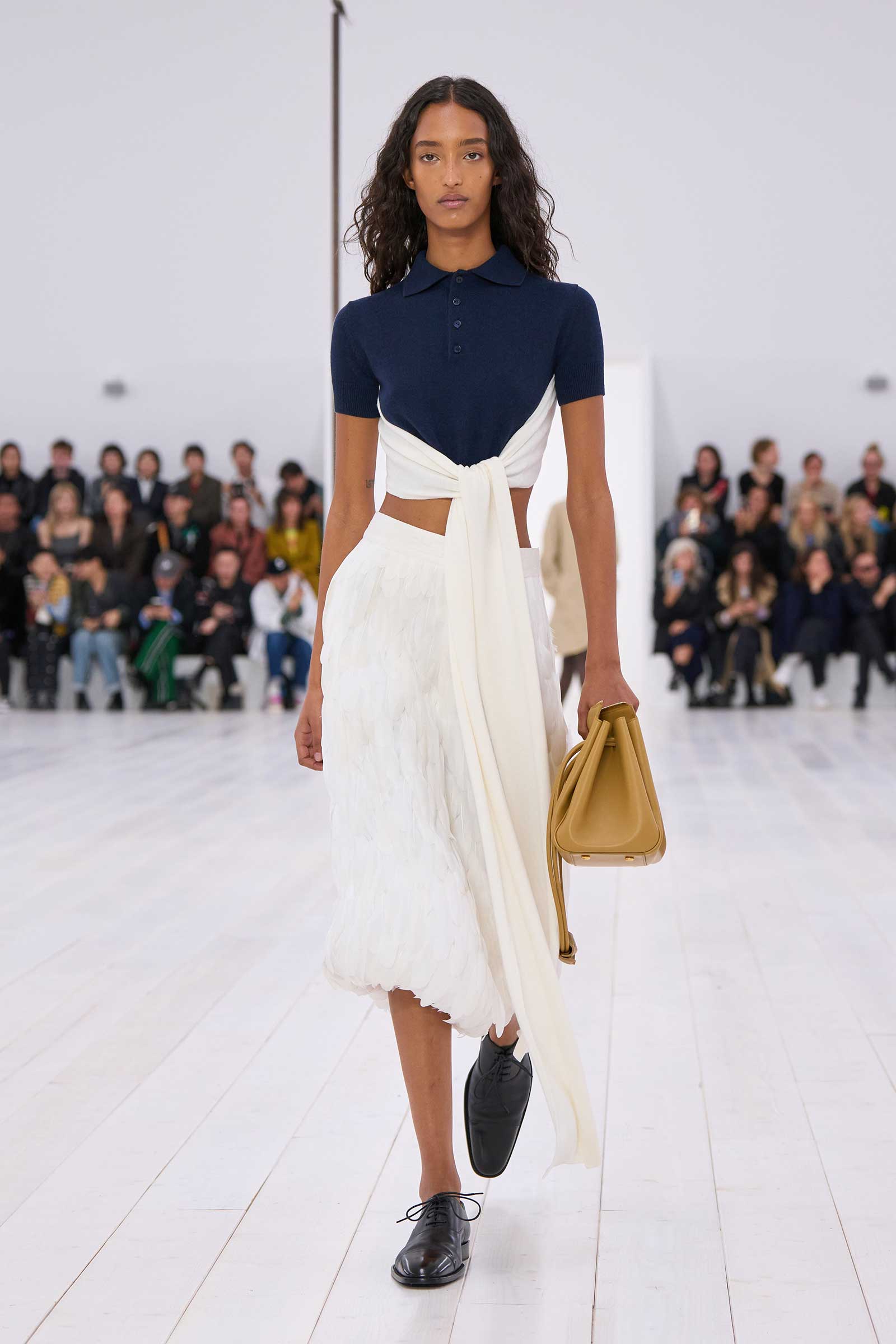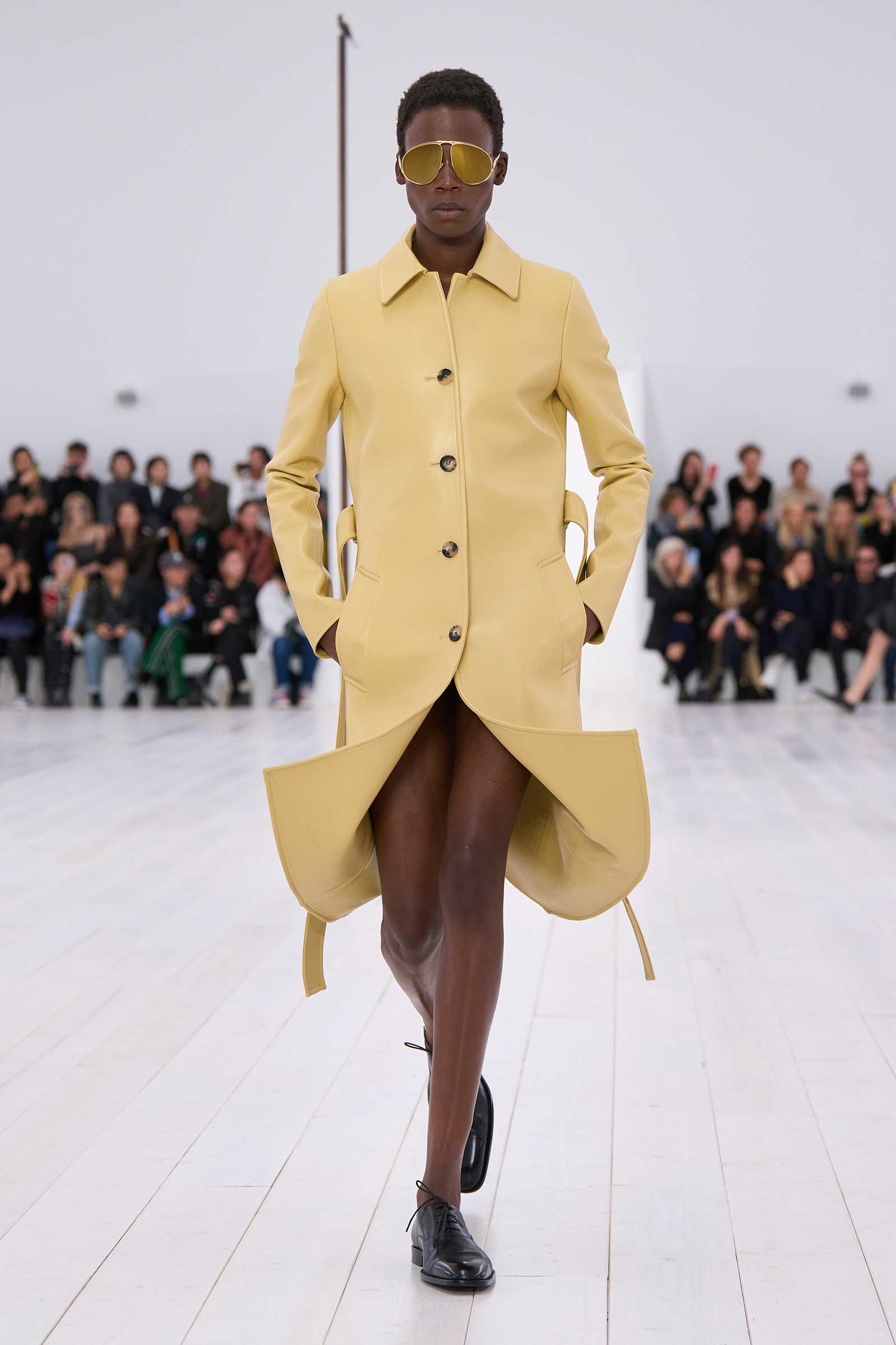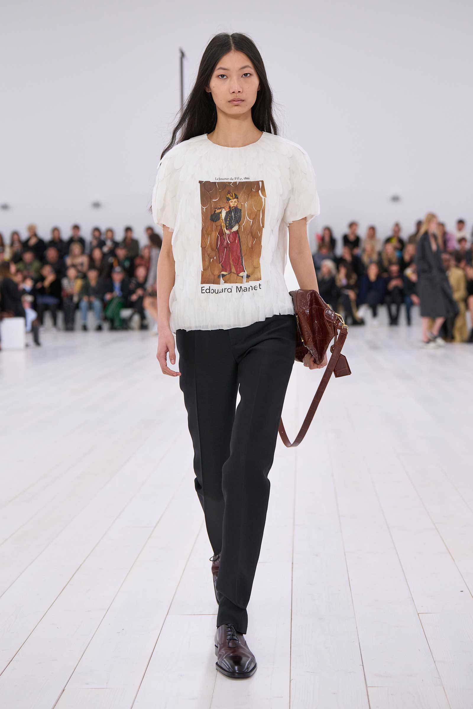 There was no sense that this was a 10-year retrospective of Anderson’s work at Loewe. But then again, the imprint of what he’s done for the formerly little-known Spanish leather house was all over the collection. It emanated maturity, modernity, and a calm ownership of sophisticated tailoring—blazers over elegantly draped voluminous trousers; classic leather coats carved with a turned-up fillip in the hem. This quite apart from creating all the commercial catnip signatures—ultra-desirable bags and the Ballet Runner logo sneakers—that are recognized and wanted by every girl and her mother worldwide.