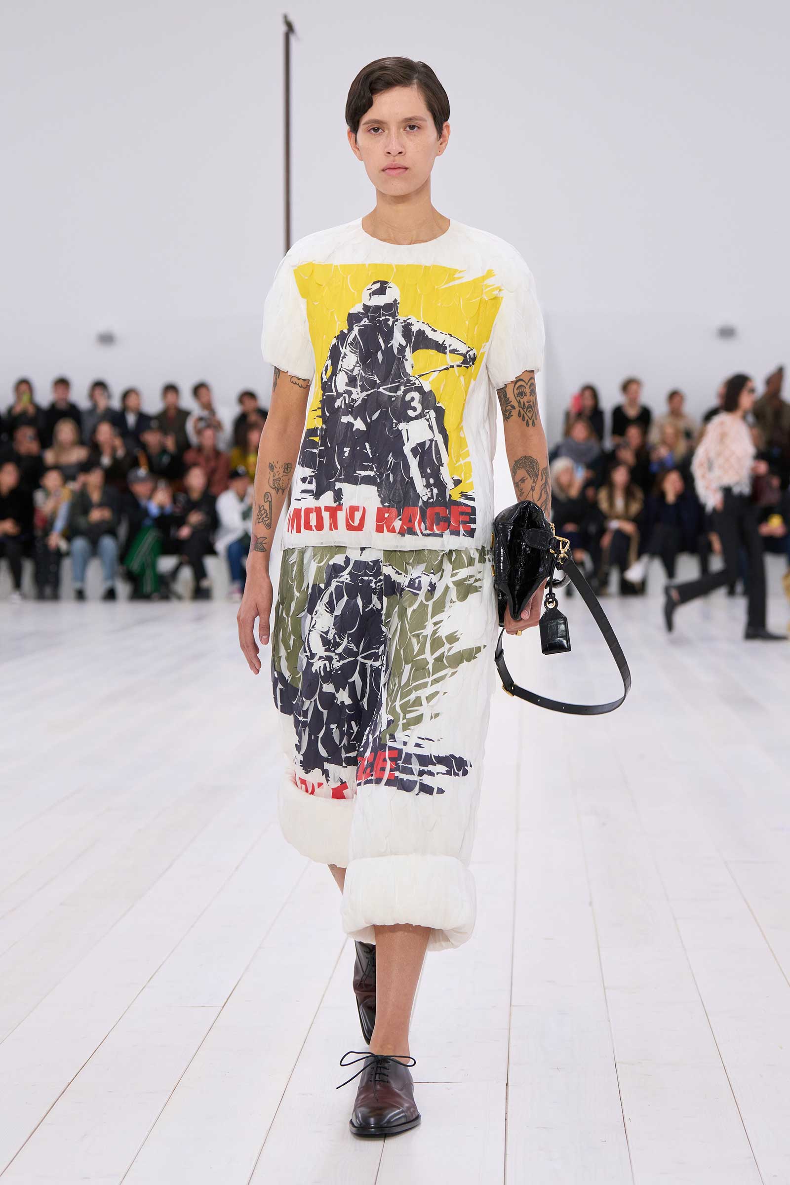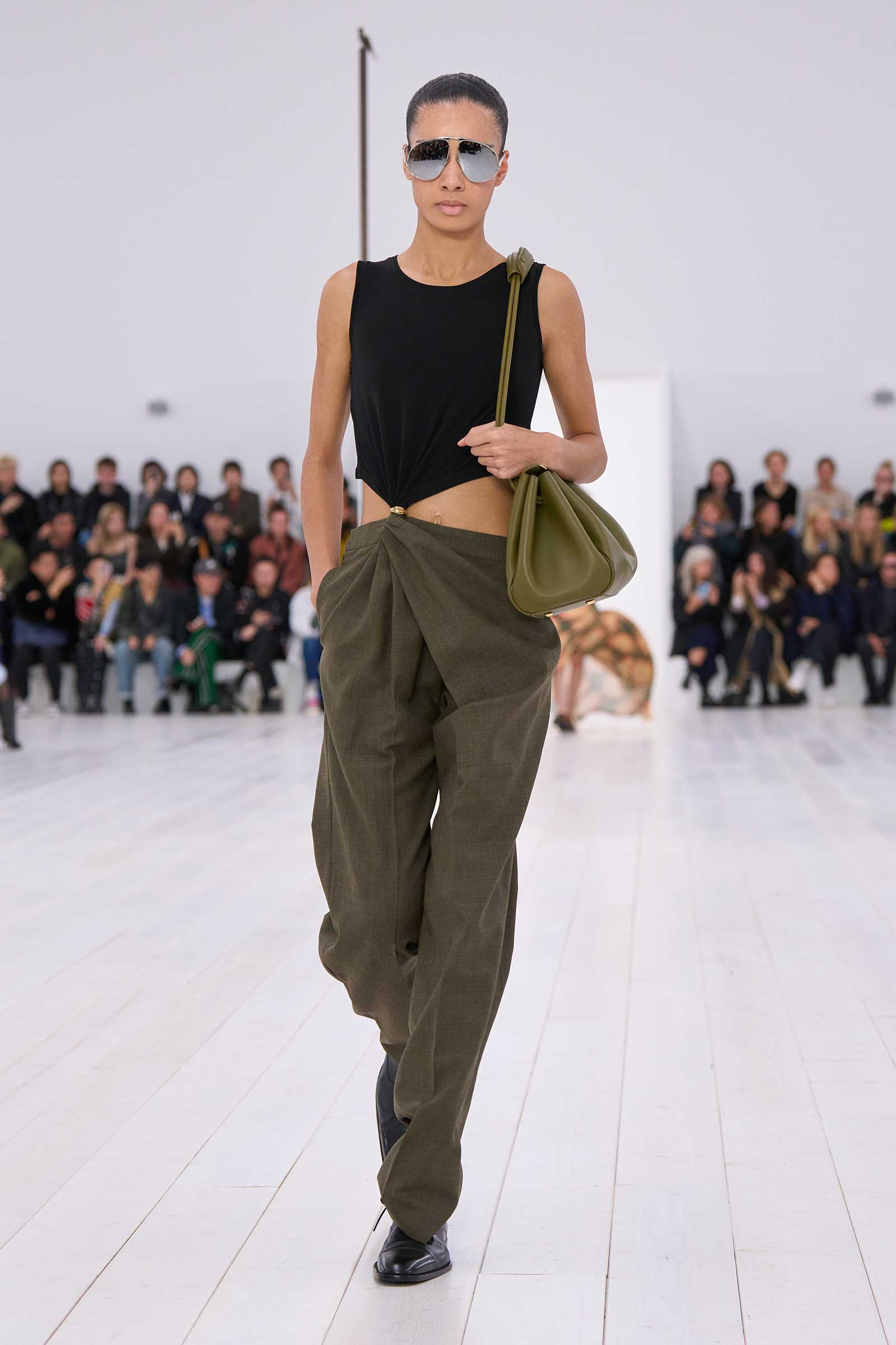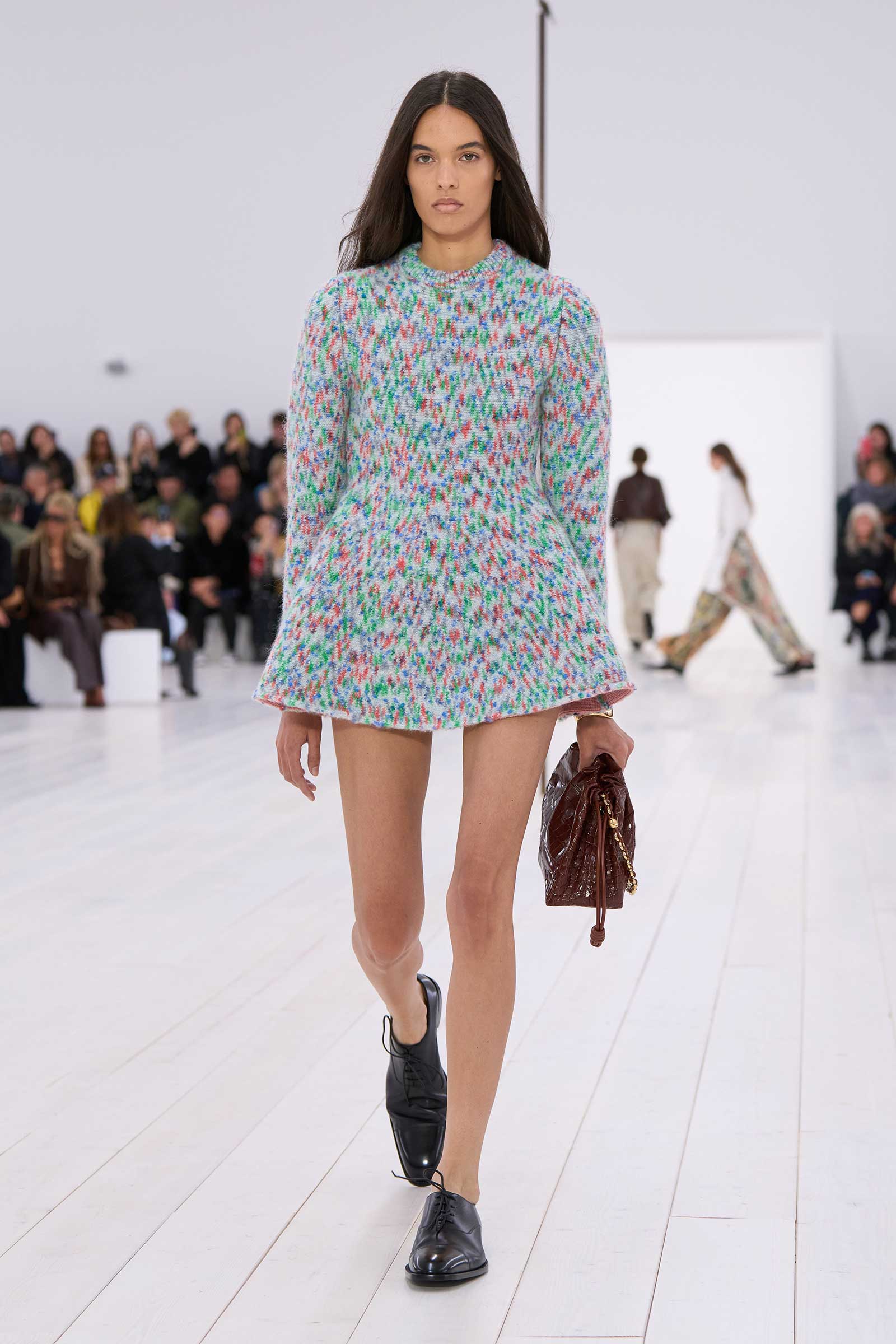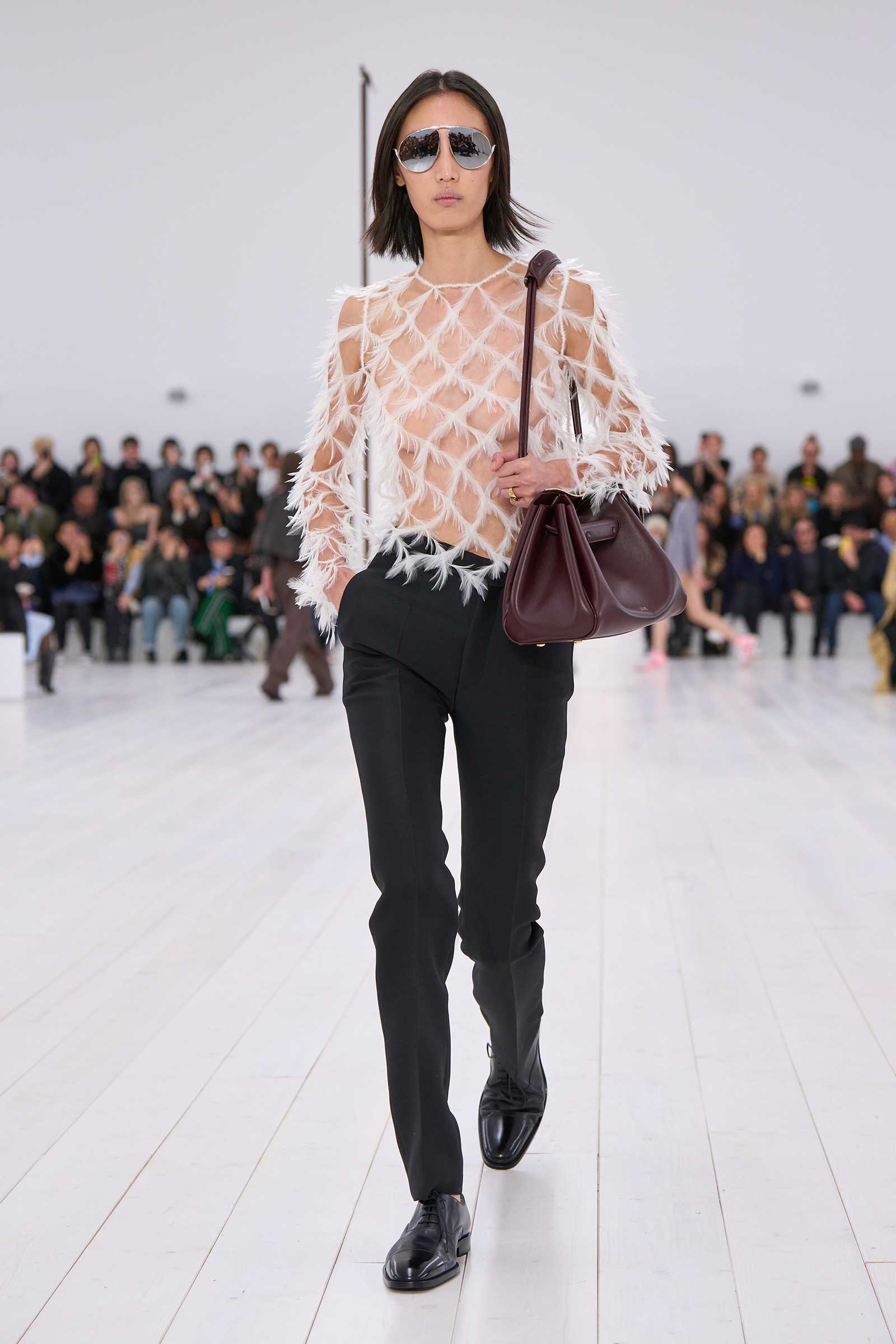 There was no sense that this was a 10-year retrospective of Anderson’s work at Loewe. But then again, the imprint of what he’s done for the formerly little-known Spanish leather house was all over the collection. It emanated maturity, modernity, and a calm ownership of sophisticated tailoring—blazers over elegantly draped voluminous trousers; classic leather coats carved with a turned-up fillip in the hem. This quite apart from creating all the commercial catnip signatures—ultra-desirable bags and the Ballet Runner logo sneakers—that are recognized and wanted by every girl and her mother worldwide.
