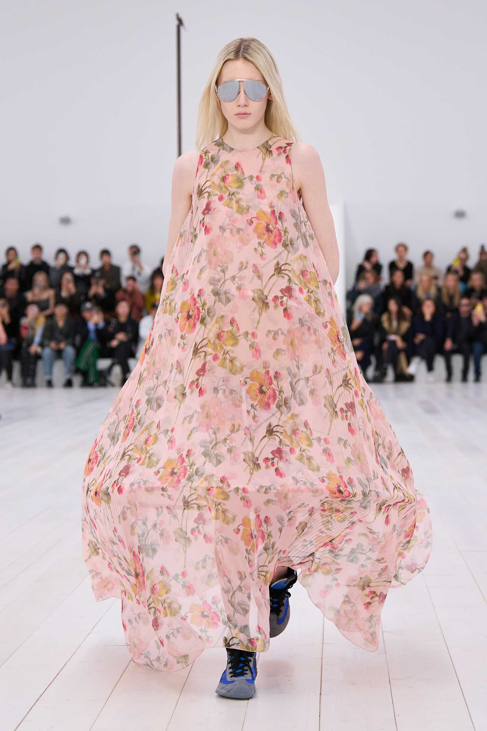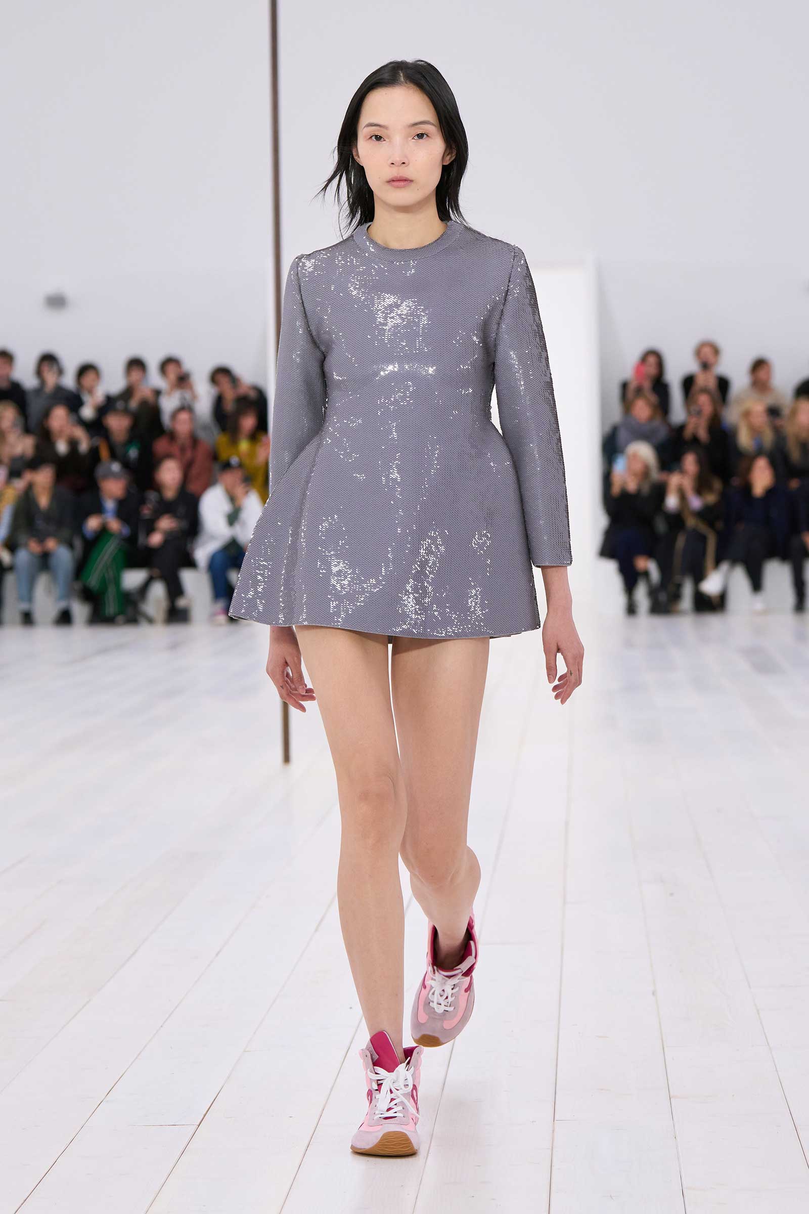 Then there were his multiple reimagined French golden age couture dresses, all hoops and semisheer flower prints and trapeze-line silhouettes abbreviated to teeny-tiny minis. It’s been a long time since a fashion designer has taken on the grandeur of event dressing, respected the beauty and joy of it, and yet shown such a delightfully unpainful way to wear it—with sneakers. “I think it’s interesting when you strip out the fussiness,” Anderson said.