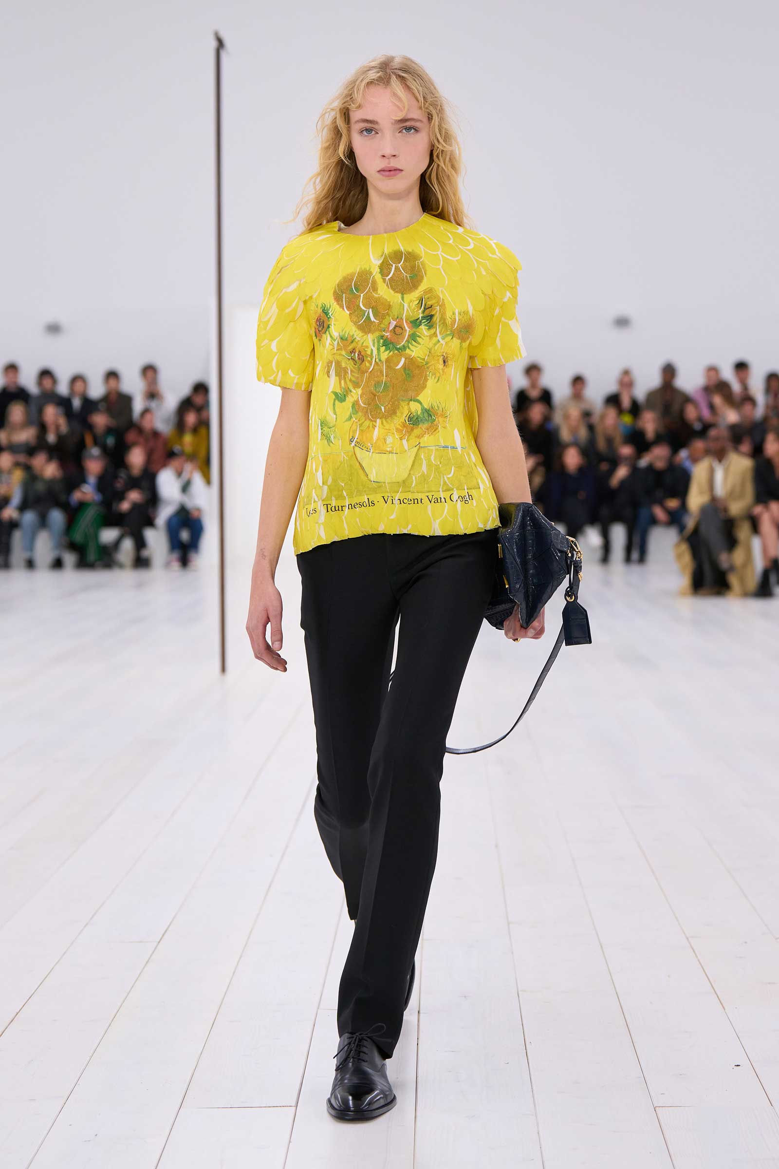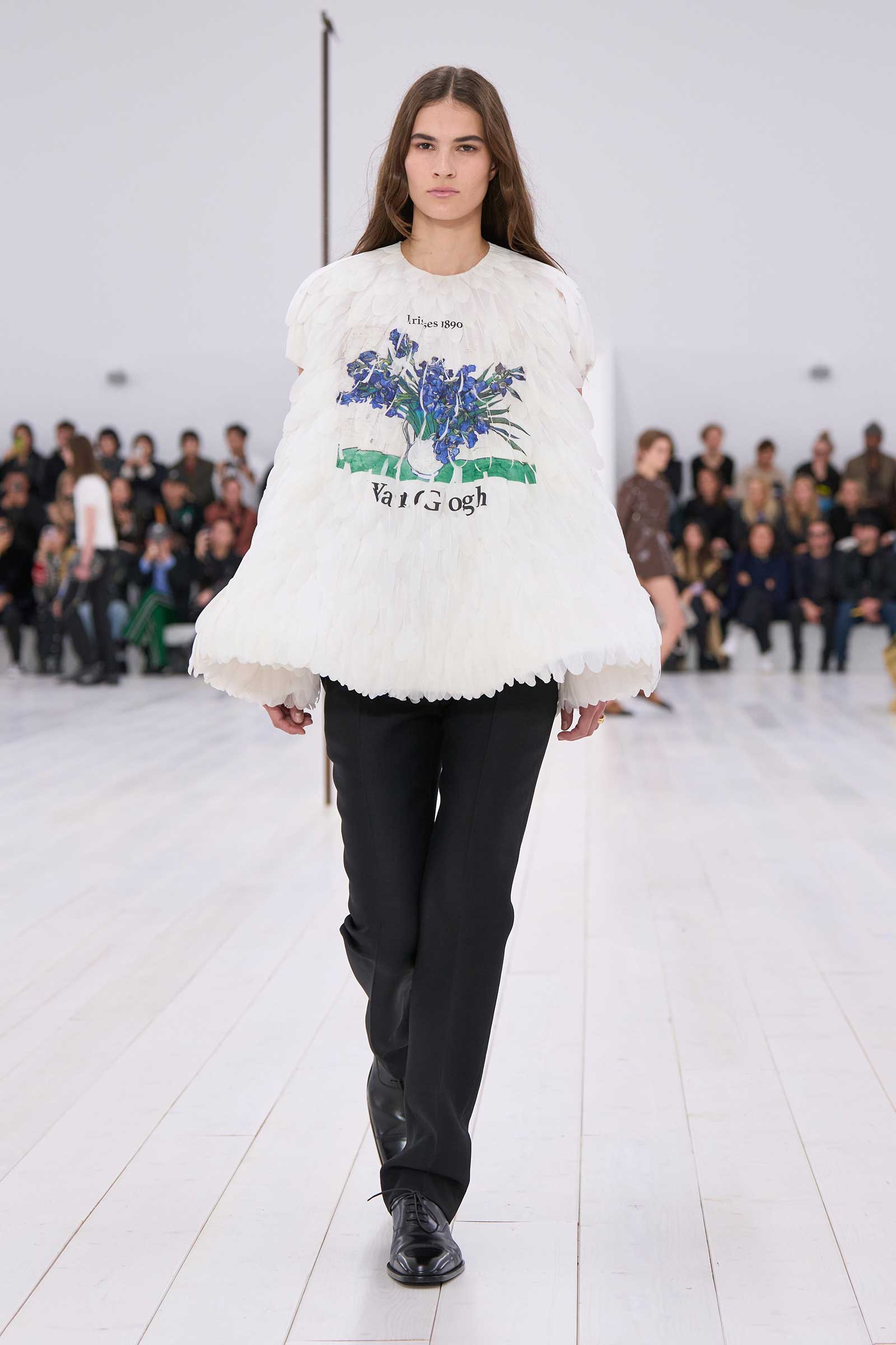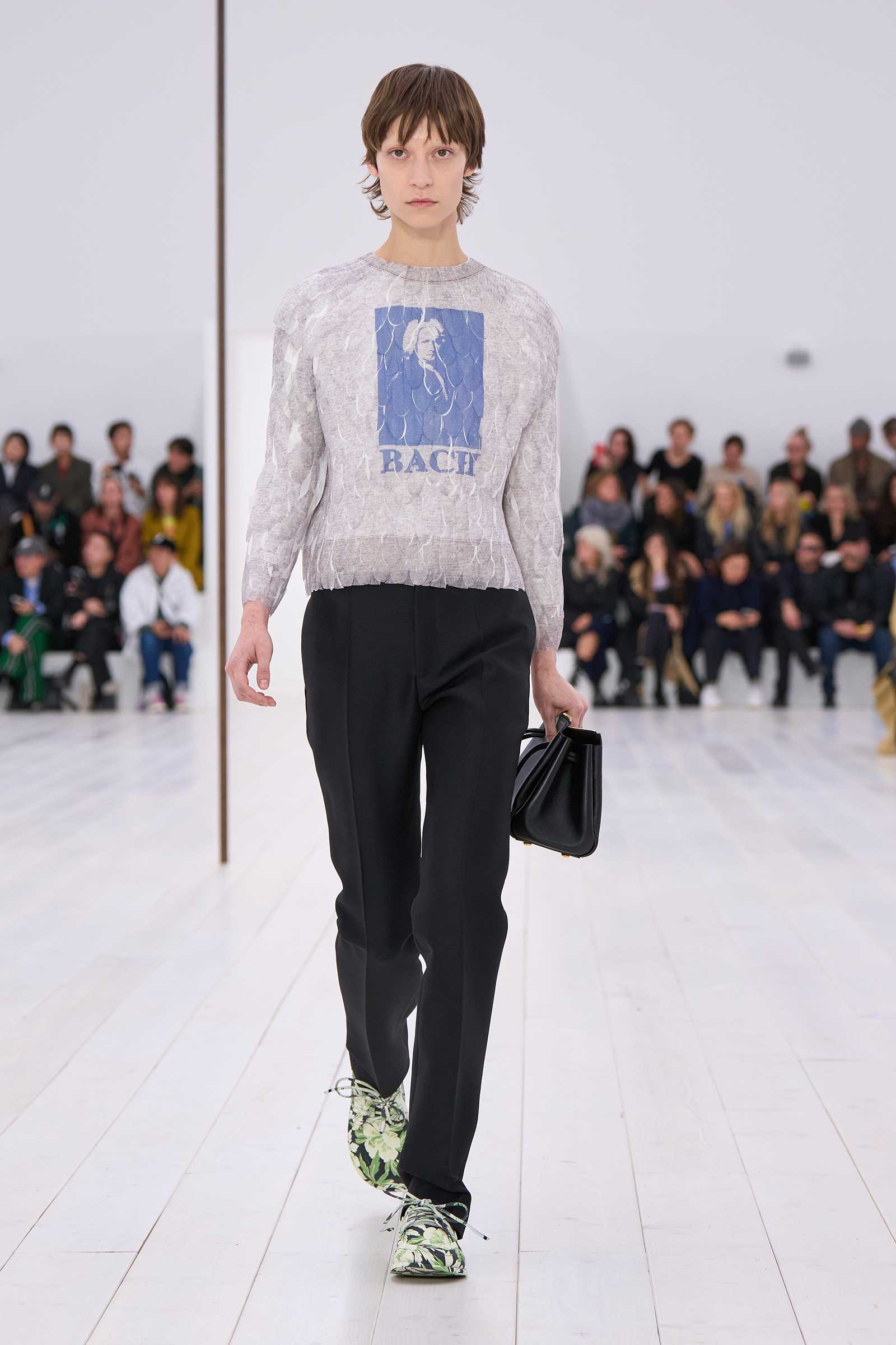So there we were, seated in a stripped-back arena of benches in a white box, from which to spectate upon nothing but his clothes. Out came a visual deluge of high skills and crisp editing. Mind-bending references to classical composers and painters on T-shirts—made, scarcely believably, in feathers—pictured Mozart, Chopin, Bach, Van Gogh’s Sunflowers, and a Manet soldier boy. “I like this idea that they’re kind of like pinup rock stars,” Anderson said. “Like when you go to a museum or you go to a concert: experiential things that you want to take a memento of with you. The idea that music reminds us of moments in our lives.”