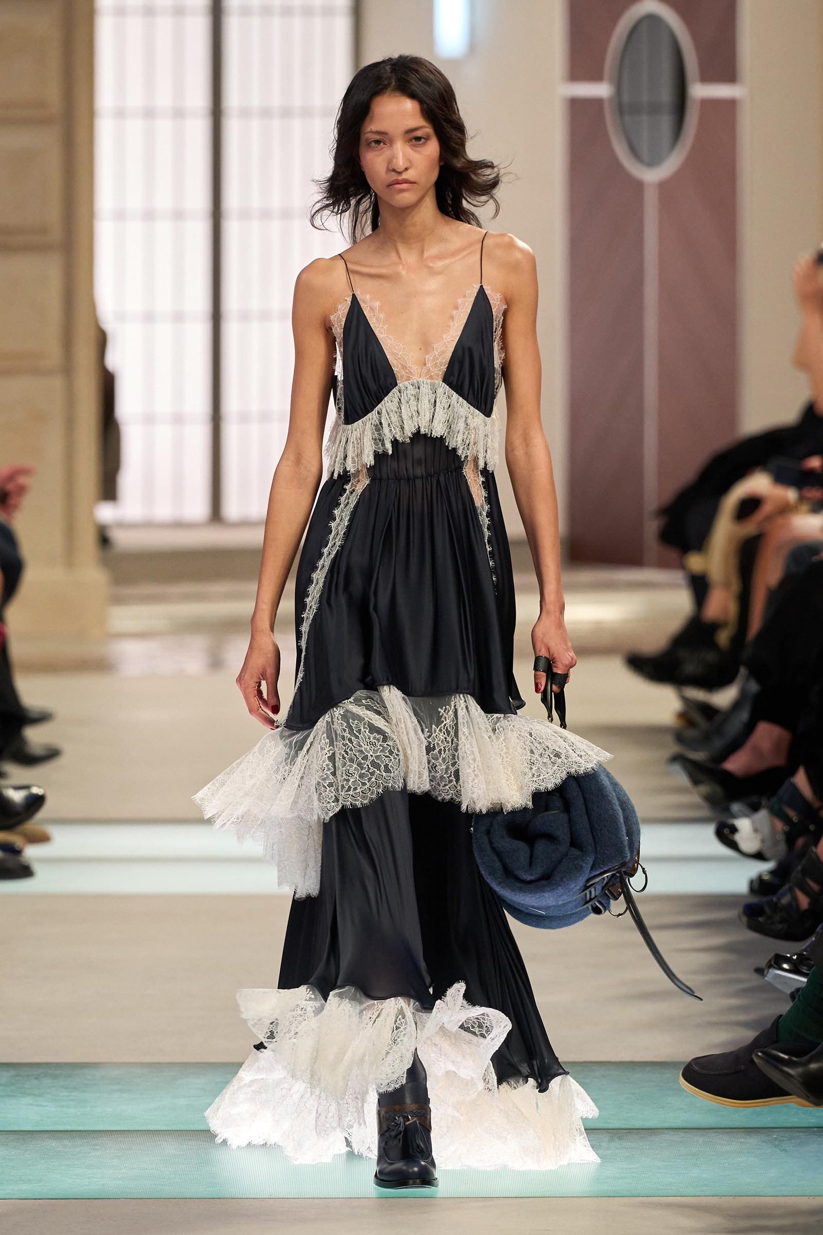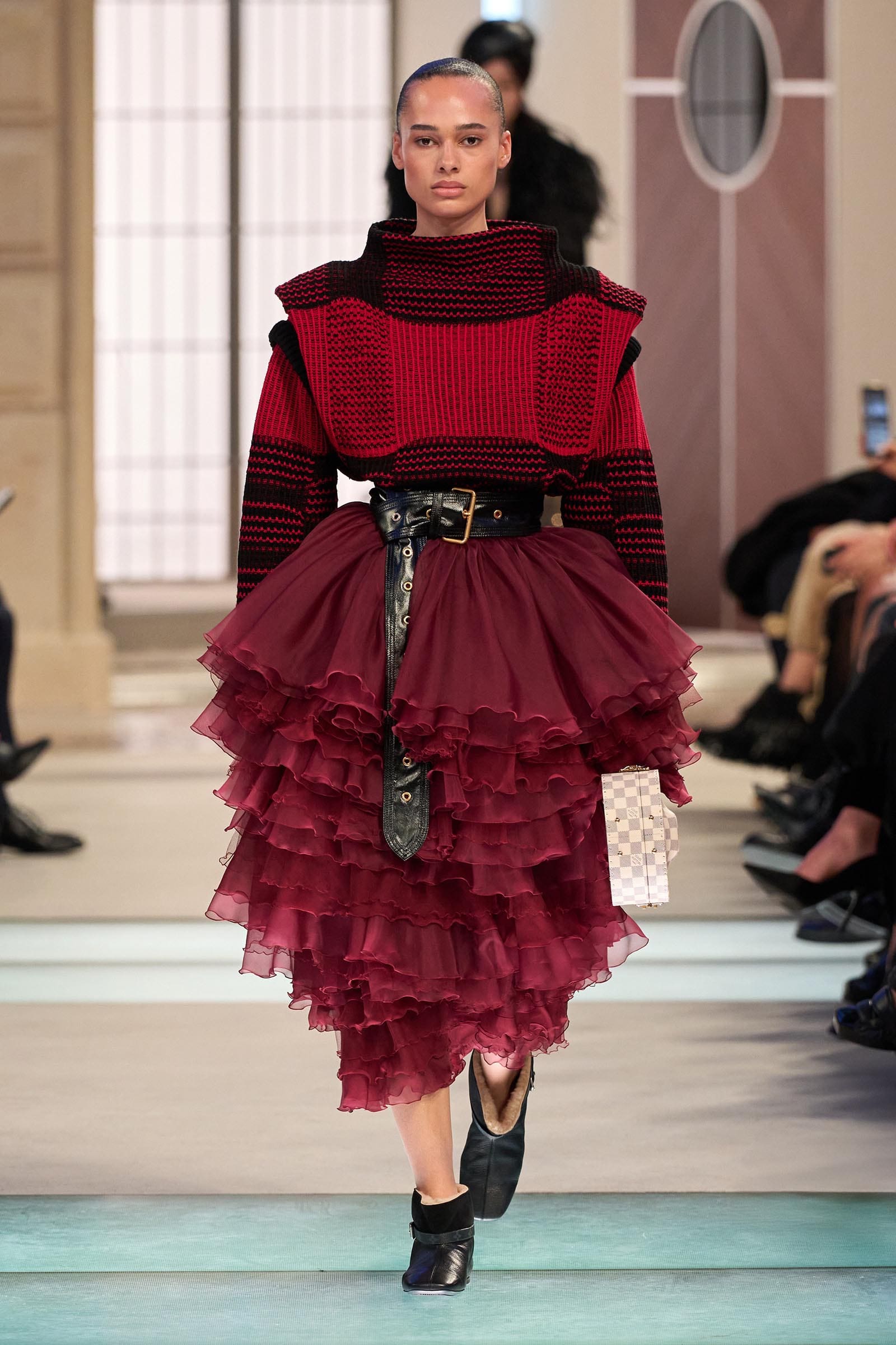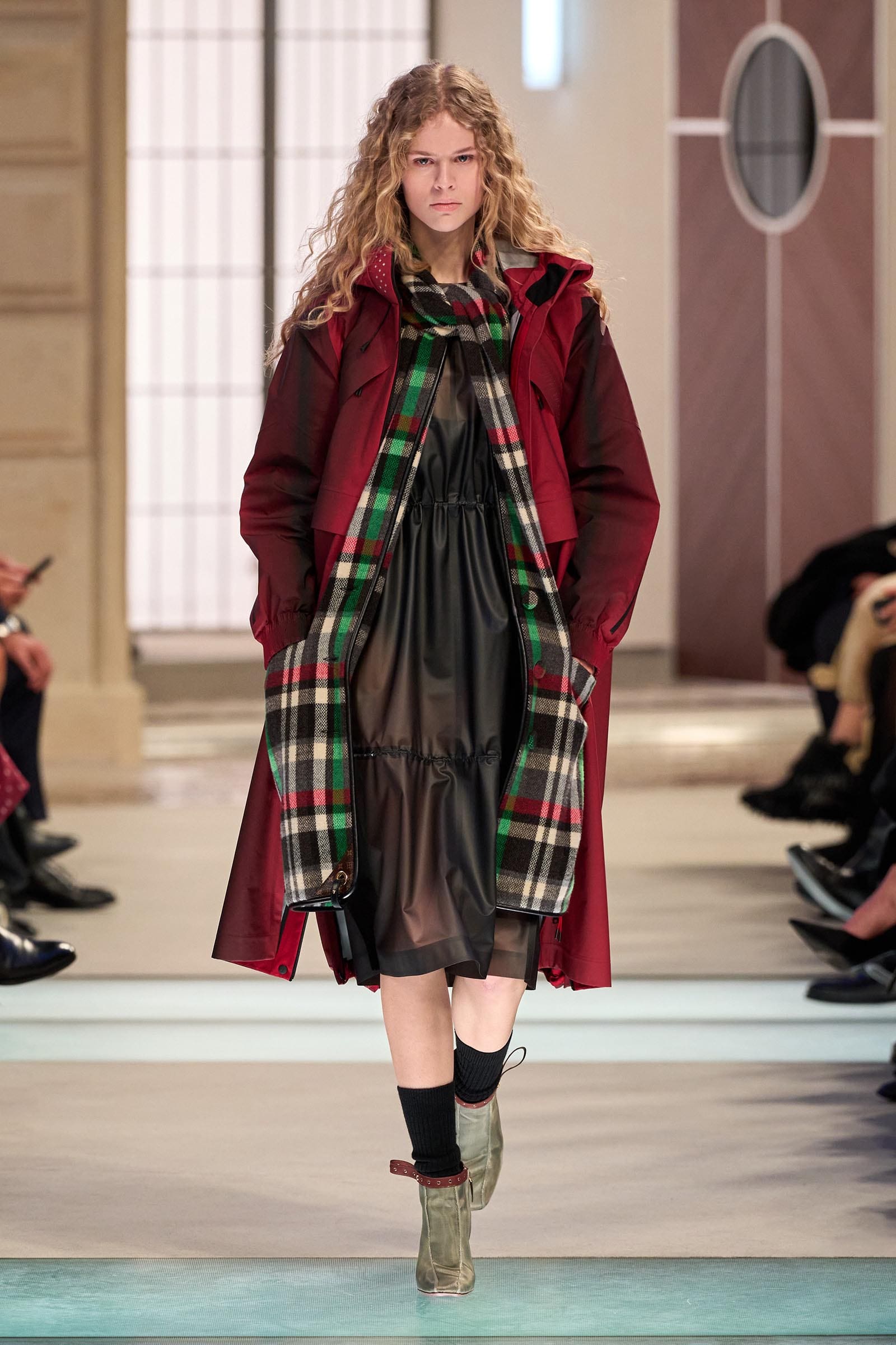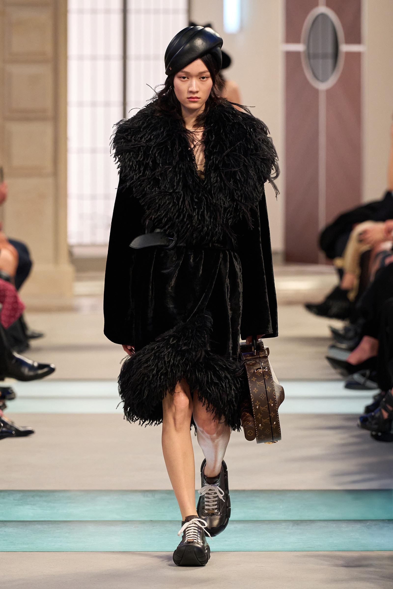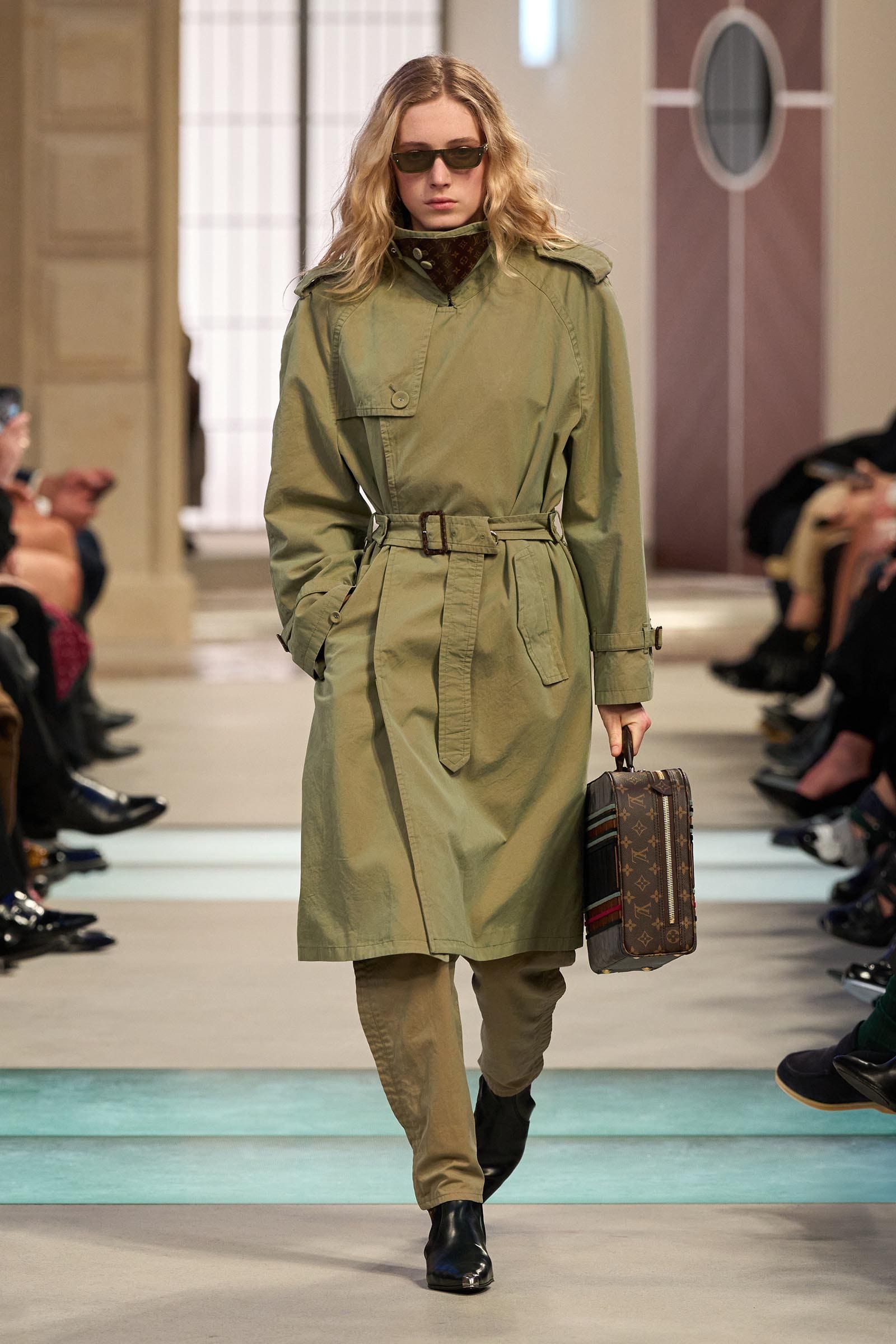 There were no obvious links between the movie references and the outfits that wended their way down a runway lined with low seats of the kind you might sit on in a train hall; instead Ghesquière gave us characters. Some were headed home for the holidays in a city-country mix; others were on fishing trips wearing blanket coats and pannier bags on their hips, or out for a day hike in LV gorp core. A few were booked on the Orient Express—“the Concorde of trains,” he said—and dressed to match in hand-painted velvet dévoré. Then you had your commuters in a sturdy trench or sporty jacket carrying hard case bags.
