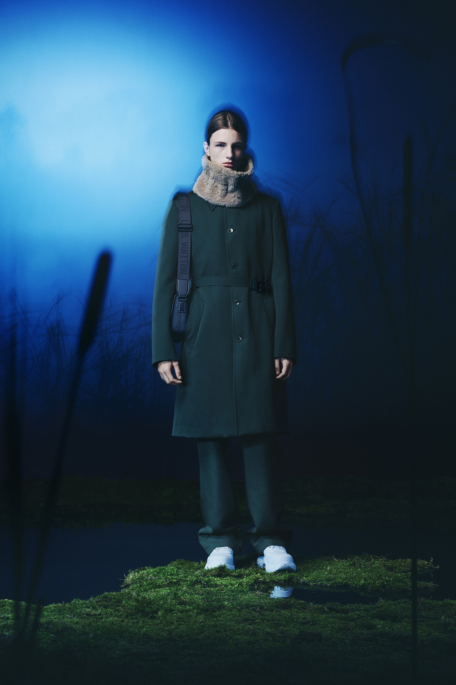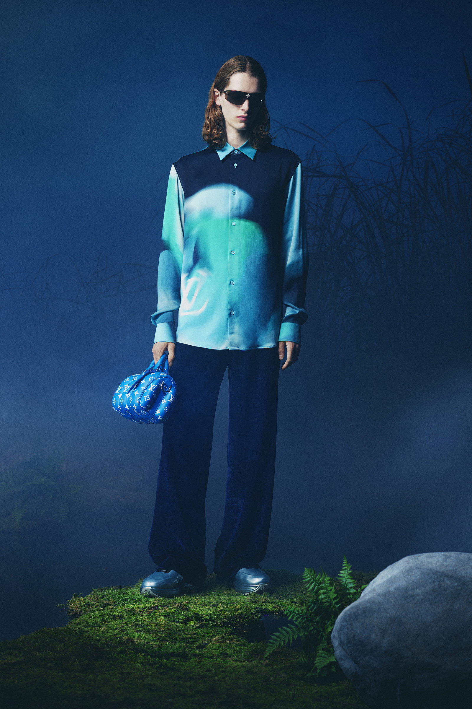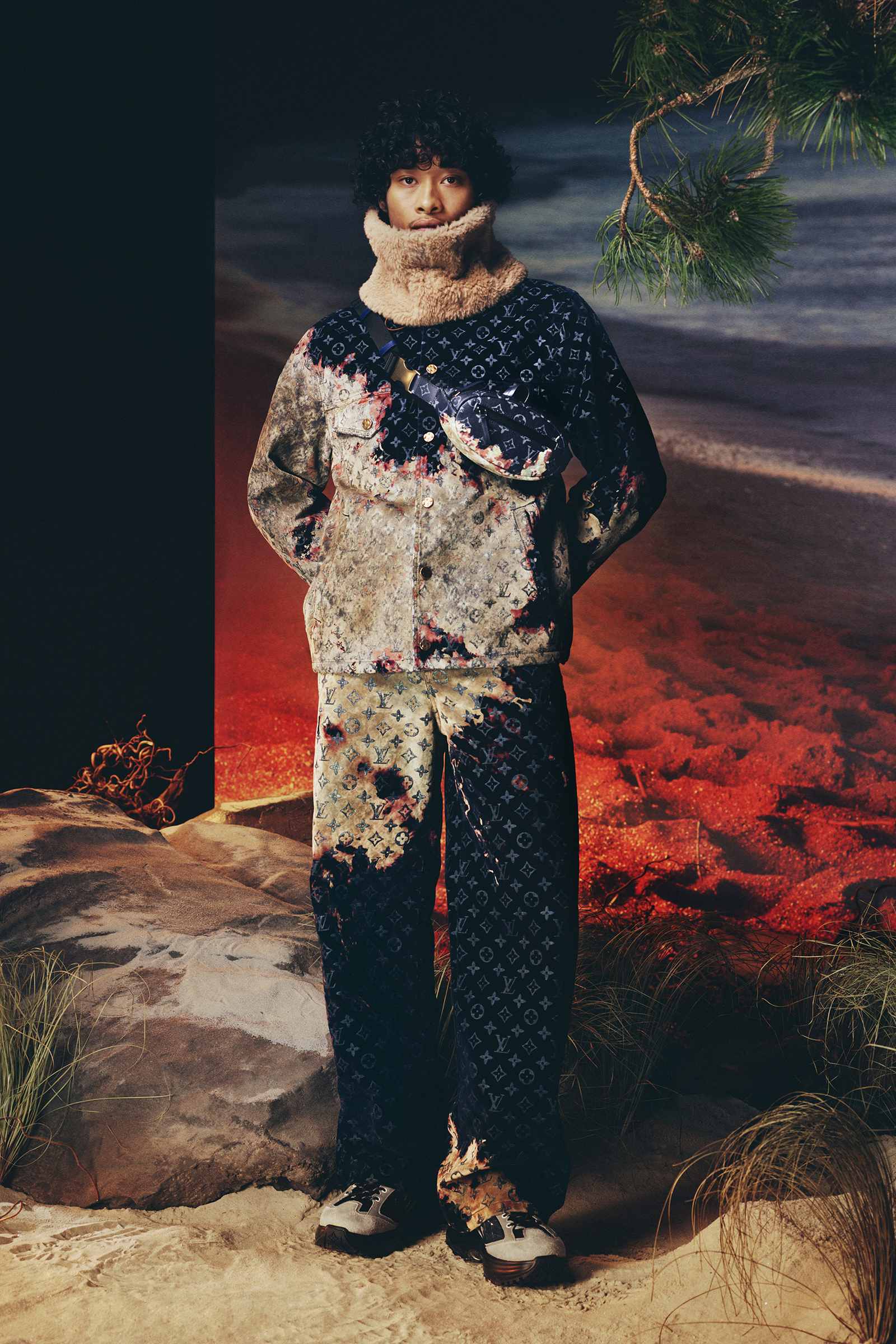 Tailoring was one of Abloh’s rubrics. His shows typically opened with a suit and it was a category he grew more confident in as his time at LV went on. Here we got a single breasted two-piece in a camouflage pattern that close inspection revealed to be formed from a world map. For the most part, though, suits were downplayed in favor of more logo driven luxury street- and sportswear of the sort that he played such a large role in popularizing in the 2010s: large scale Damier checks printed with an Epi leather-like texture on matching shirt and pant sets, camouflage fleece sweatpants and vests with supersize LVs worked into the pattern, and monogrammed denim pieces that looked seared.