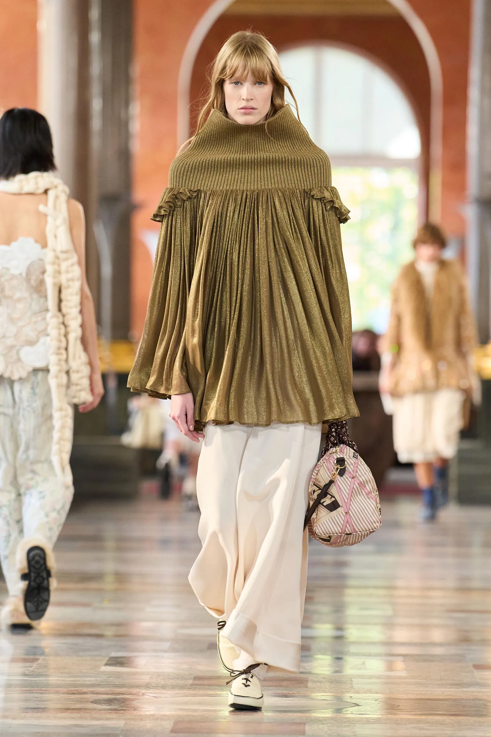 The comforts of home were on Ghesquière’s mind this season. “The Louvre did the restoration of this gallery. They will set up the statues, and it will be like that forever,” he said. “So it was this wonderful moment when we could take [over] the apartment, and it was a very big starting point for thinking about this collection, which is somehow in praise of intimacy, for an art de vivre: you know, dressing for yourself first… It’s like a trip around your apartment somehow.”