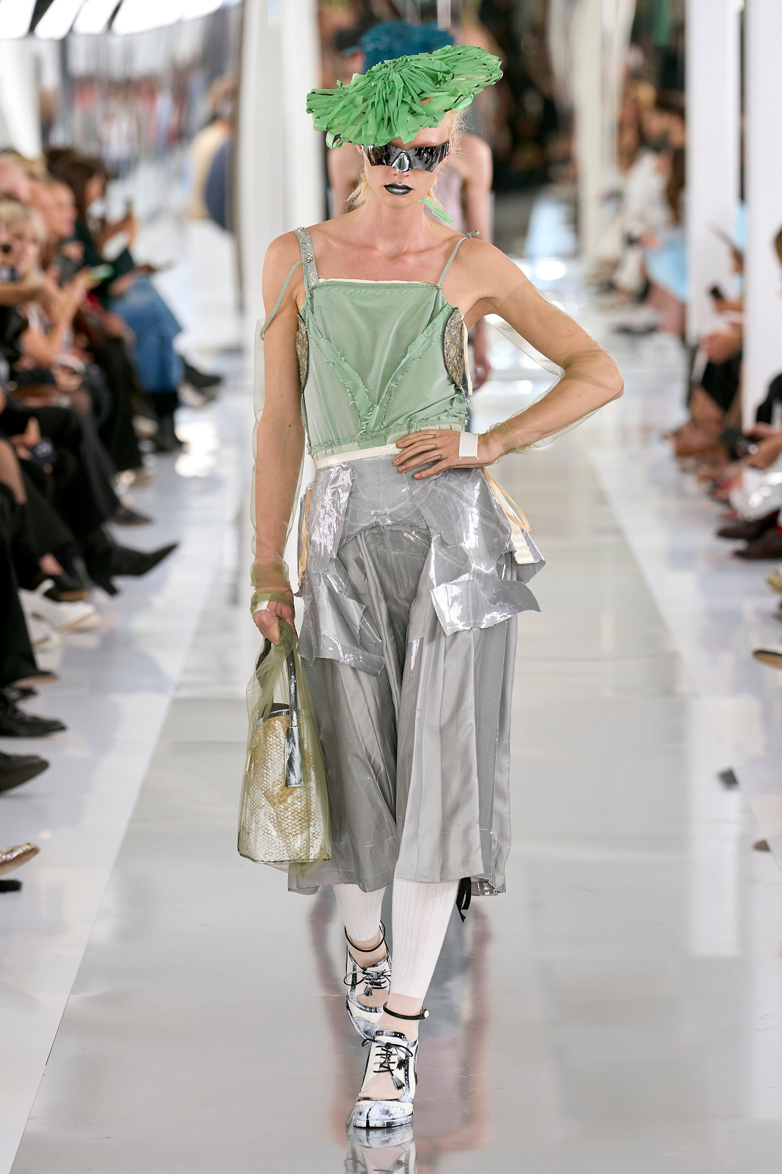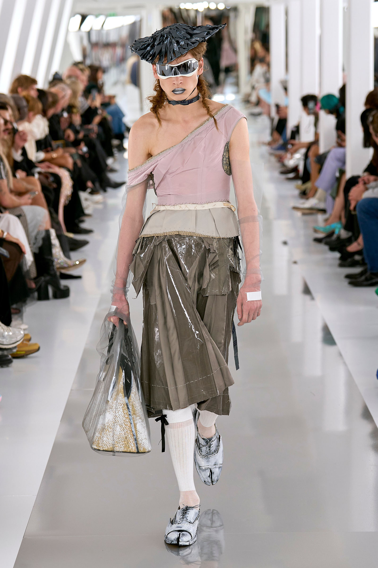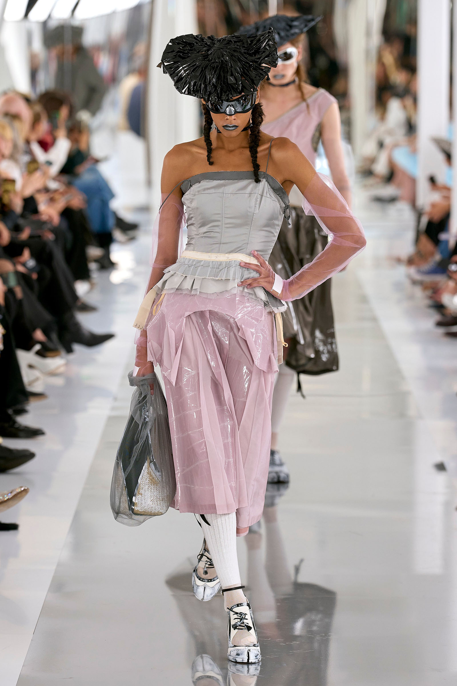 The spell that Galliano cast involved all of the genius he brings from a lifetime’s experience in fashion—his fluency in techniques learned from years at a couture house combined with all the rule-breaking energy of his Central Saint Martins student days. It reveled in the archaeology of vintage garments—bodices, linings, and petticoats chopped up, turned inside out, and cobbled together again with a zinging sense of color. It involved trash bags, laminated plastic, and wonkily chic lampshade hats made out of wire. The cast of young models projected it all with a perfectly rehearsed forward-lunging attitude, hands on hips, a troupe of ’50s couture mannequins gone rogue.