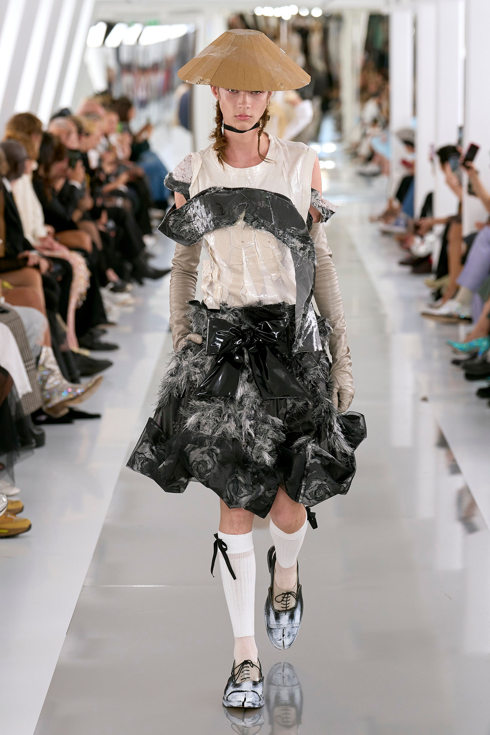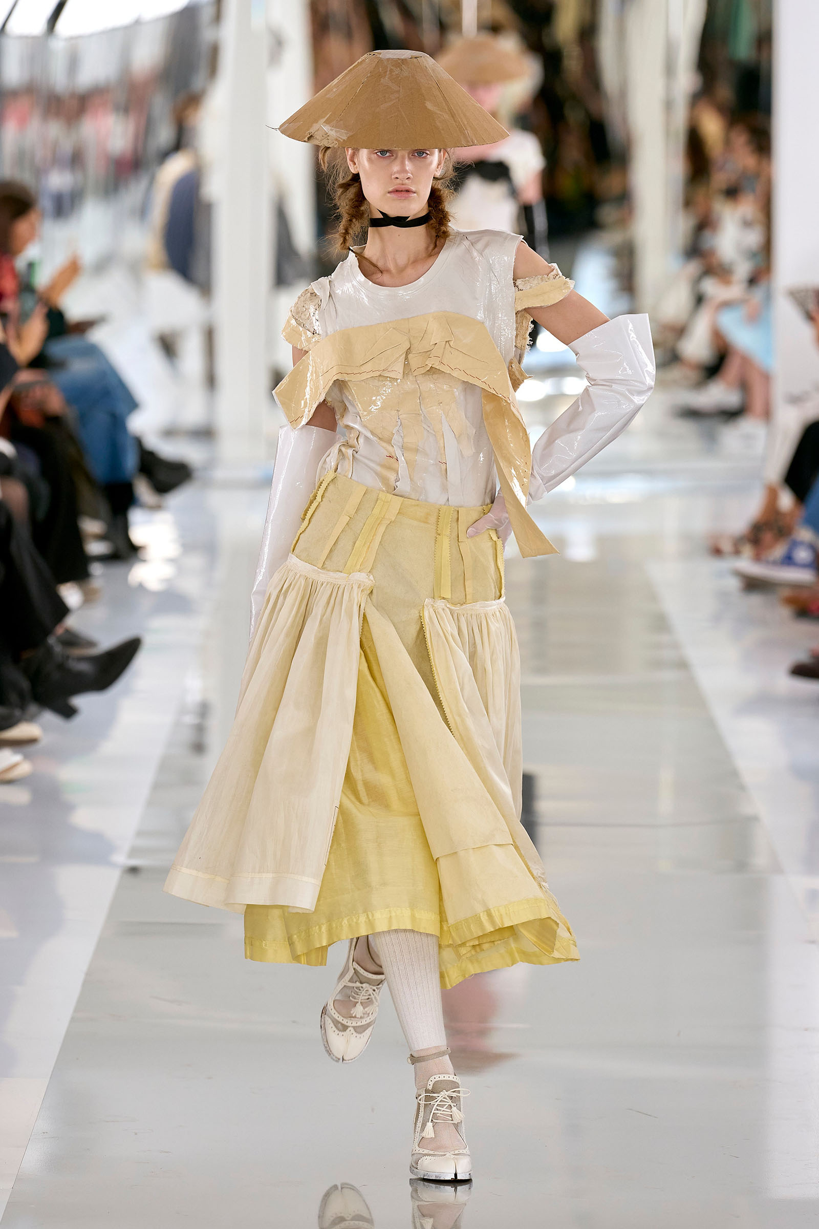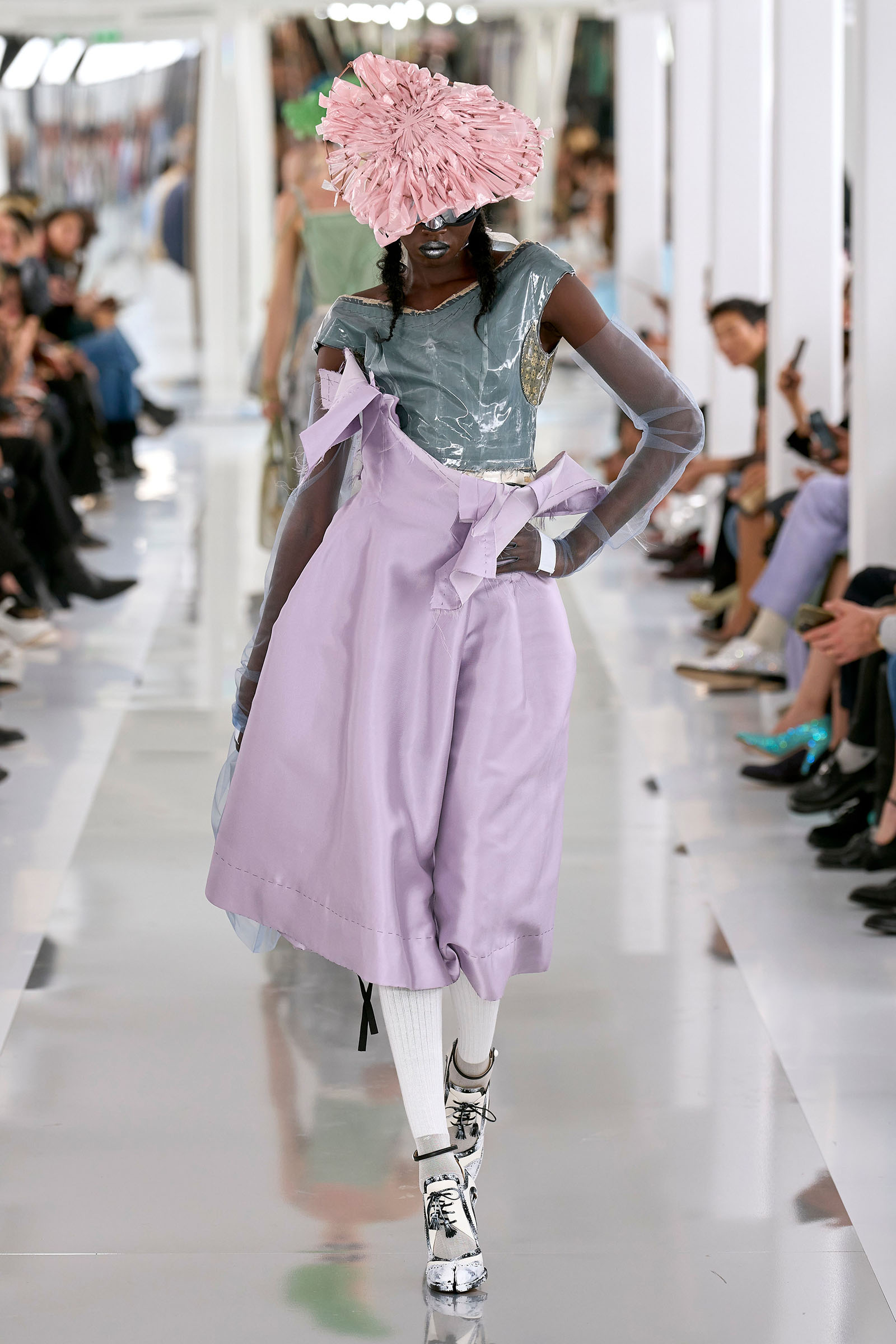 The spell that Galliano cast involved all of the genius he brings from a lifetime’s experience in fashion—his fluency in techniques learned from years at a couture house combined with all the rule-breaking energy of his Central Saint Martins student days. It reveled in the archaeology of vintage garments—bodices, linings, and petticoats chopped up, turned inside out, and cobbled together again with a zinging sense of color. It involved trash bags, laminated plastic, and wonkily chic lampshade hats made out of wire. The cast of young models projected it all with a perfectly rehearsed forward-lunging attitude, hands on hips, a troupe of ’50s couture mannequins gone rogue.