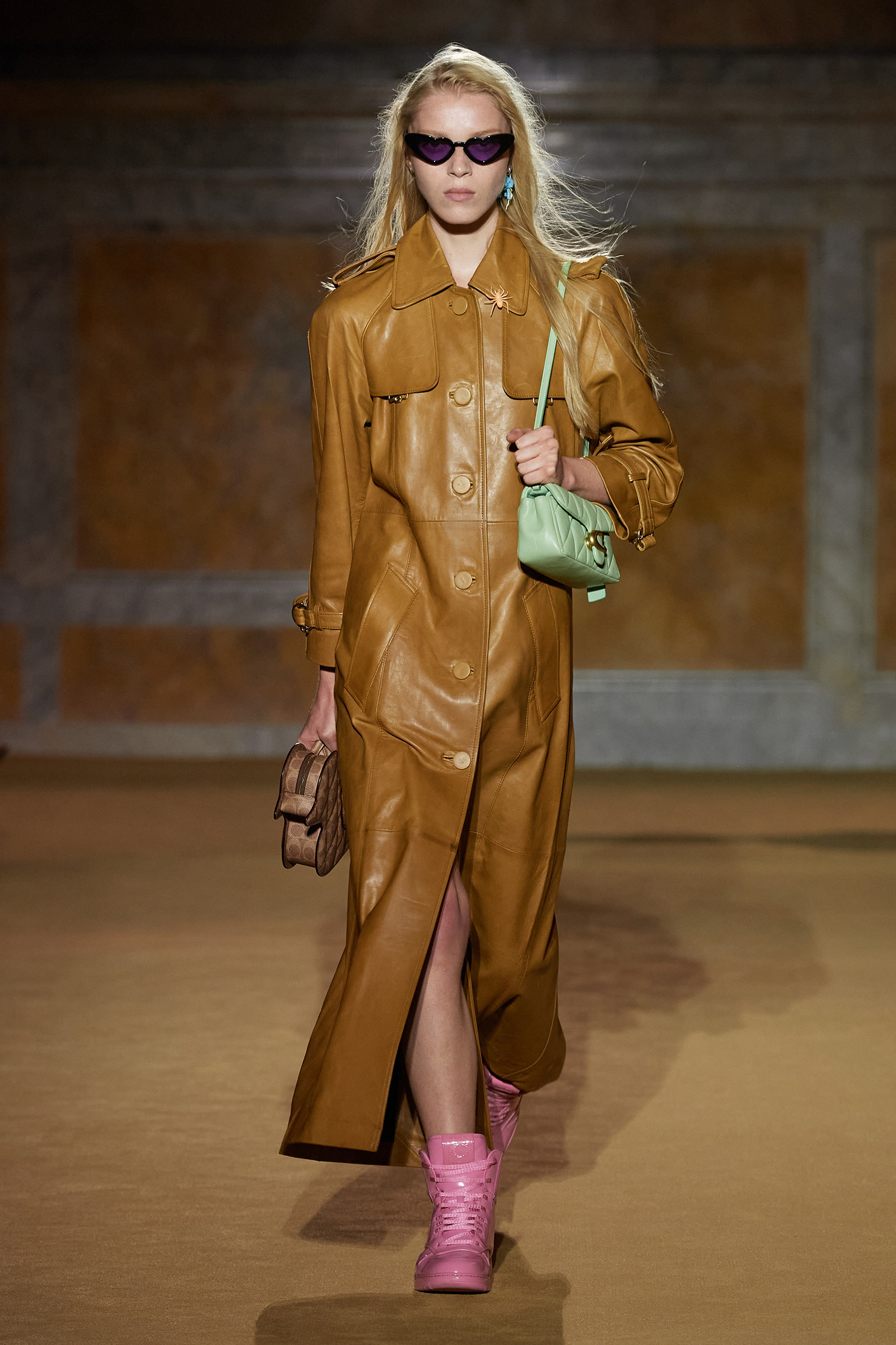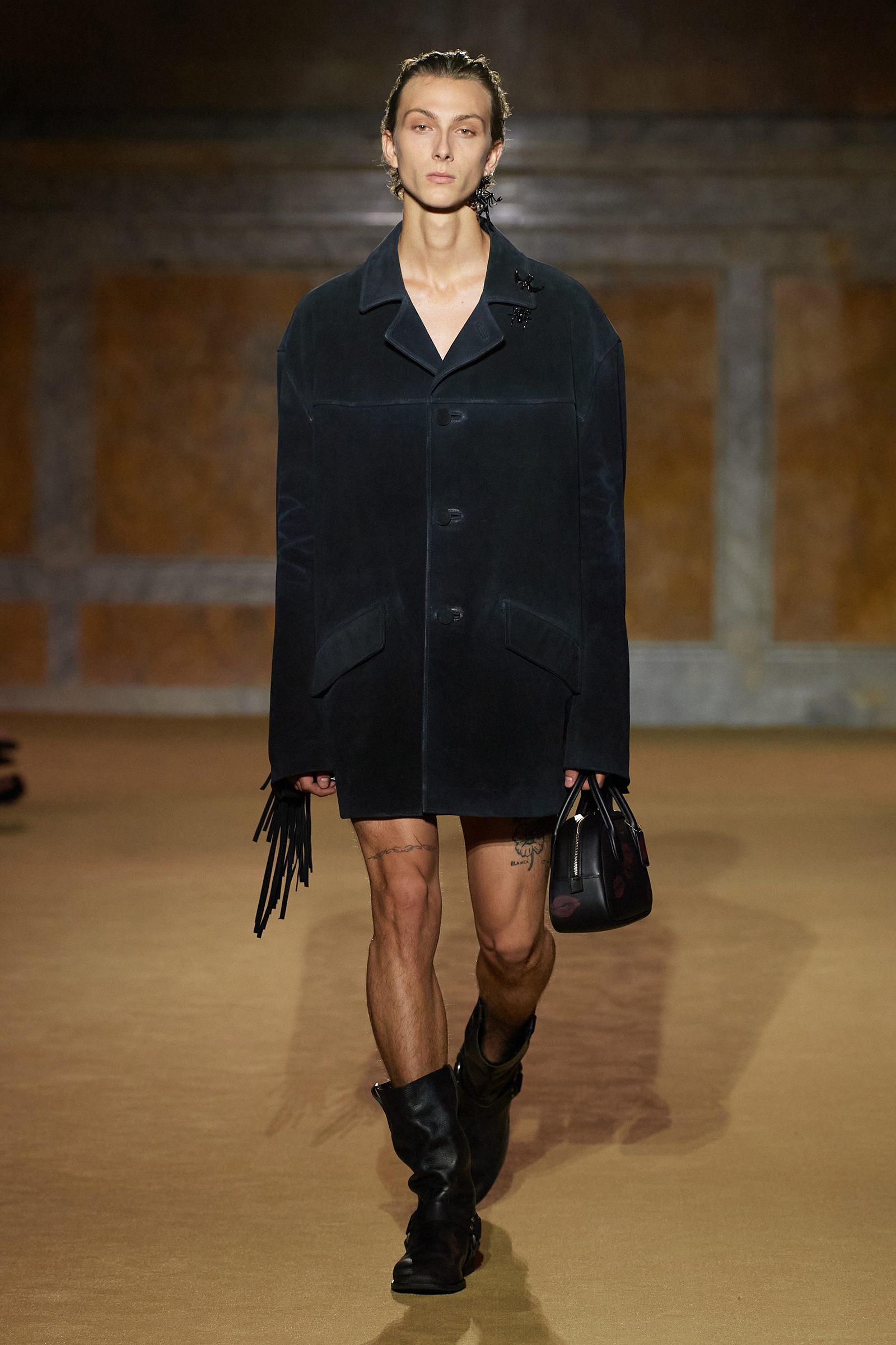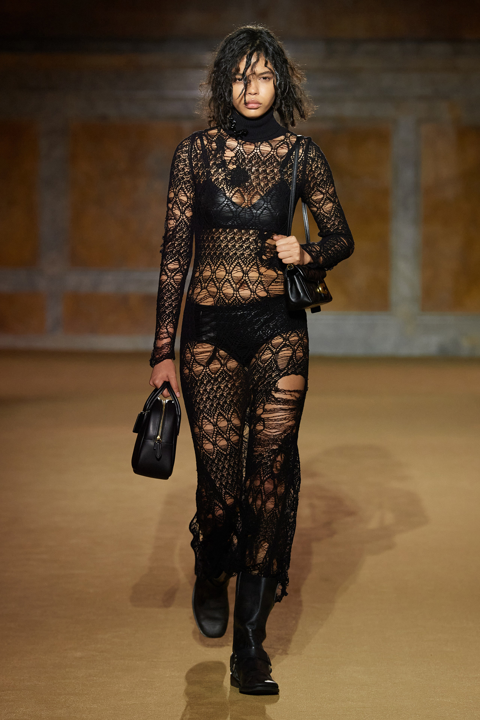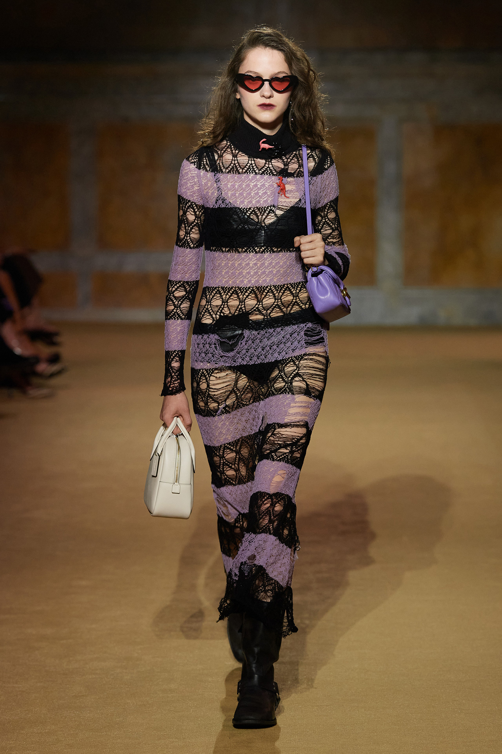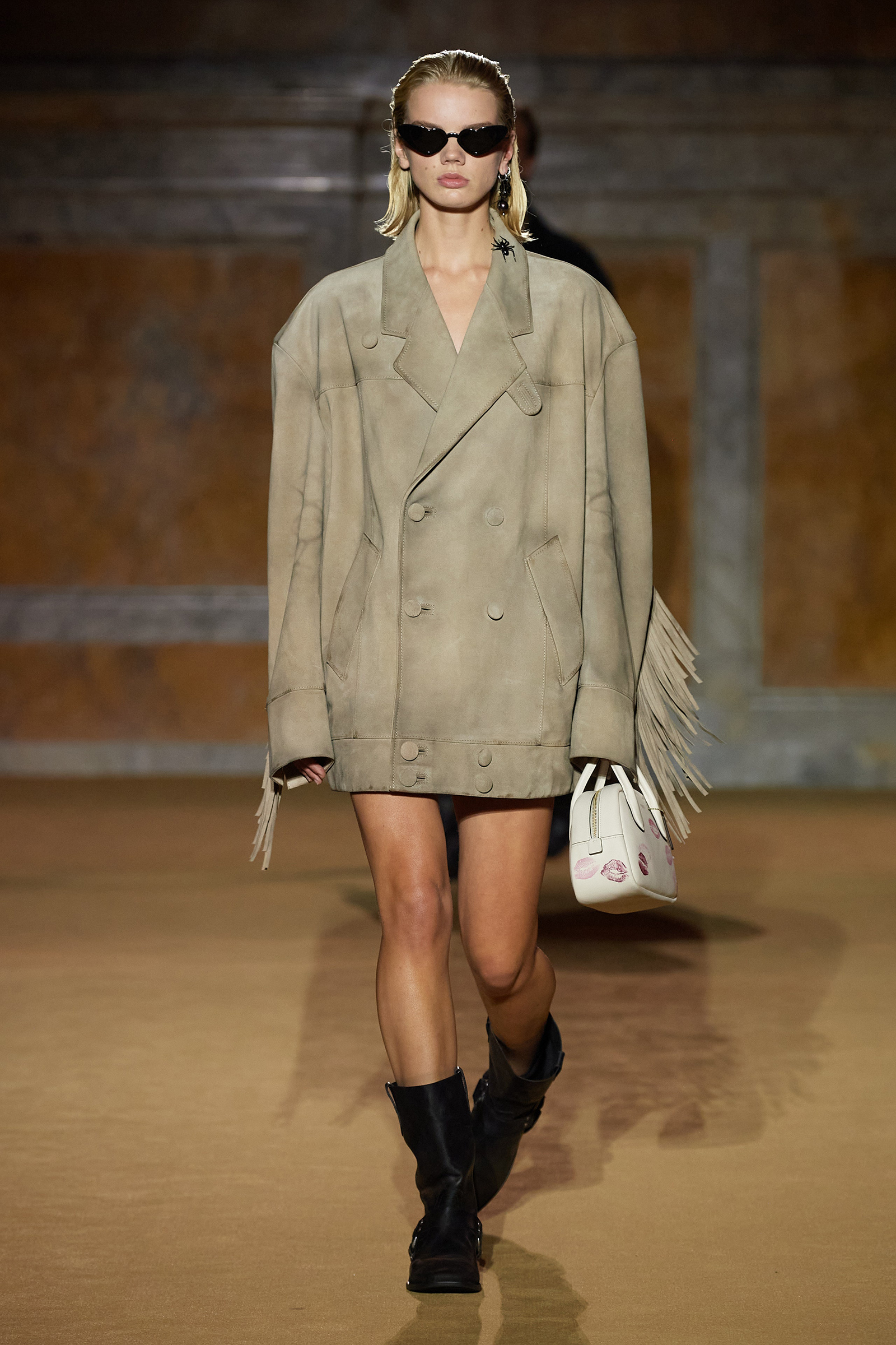 But what about the clothes? Although Vevers was in a wistful mode, this wasn’t about bringing back the greatest hits from his early collections. Rather, it was a continuation of the shapes and experiments on construction and silhouette that he’s been developing in recent seasons. The show opened with a black slipdress made from pieced-together leather with exposed stitches, moto boots, and a cool little rounded bowling bag. “There was no archival reference for them,” he said. “It was just what I imagined a Coach bag should be—and maybe that’s a reflection of my time at Coach.” Vevers’s great fascination with oversized leather jackets continued: a single-breasted blazer, worn over a mesh turtleneck and pointy jelly flats, was a very chic proposition indeed. There were also fringed suede jackets, and upcycled denim jackets, with the let-out hems acting as a trim detail on pockets.