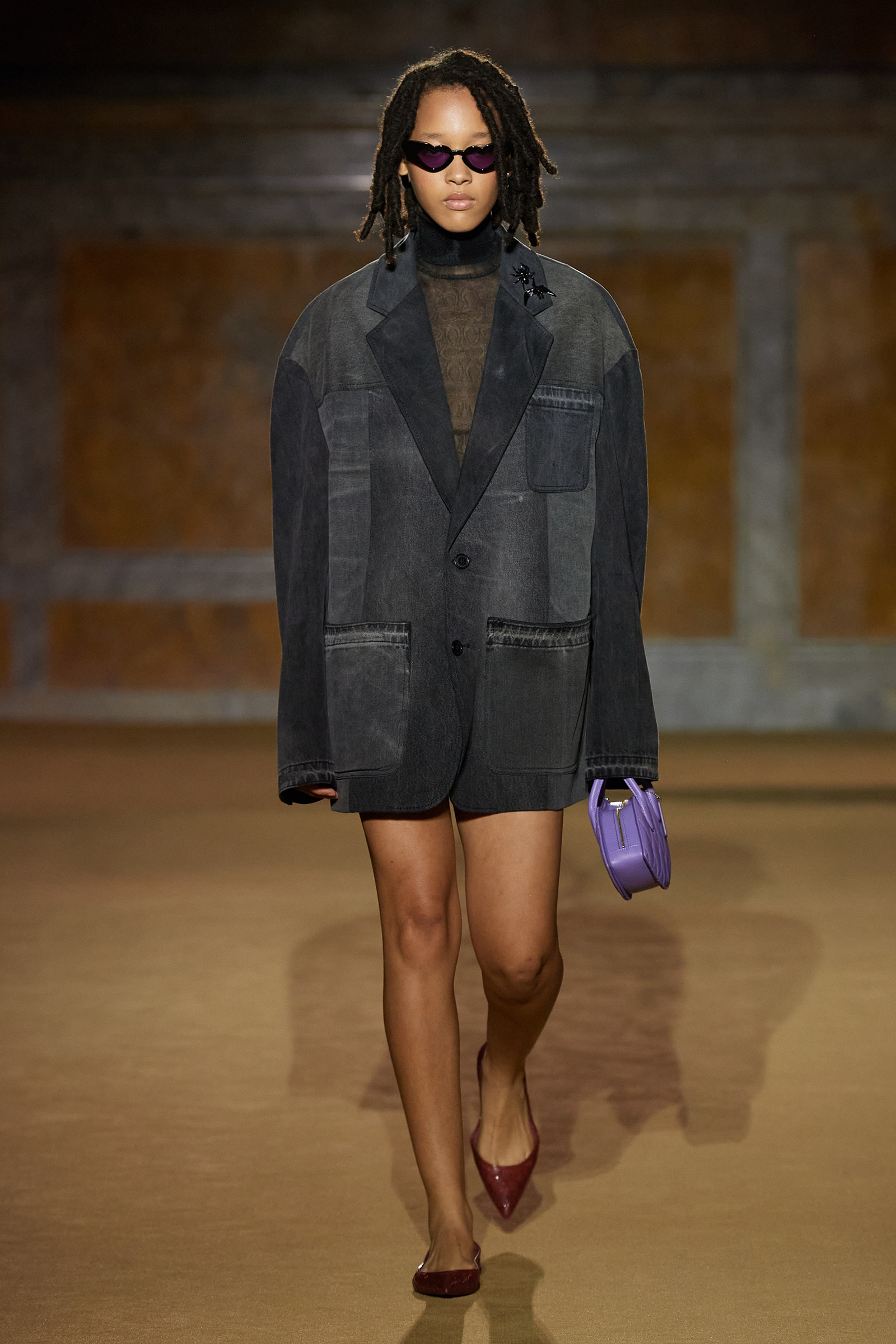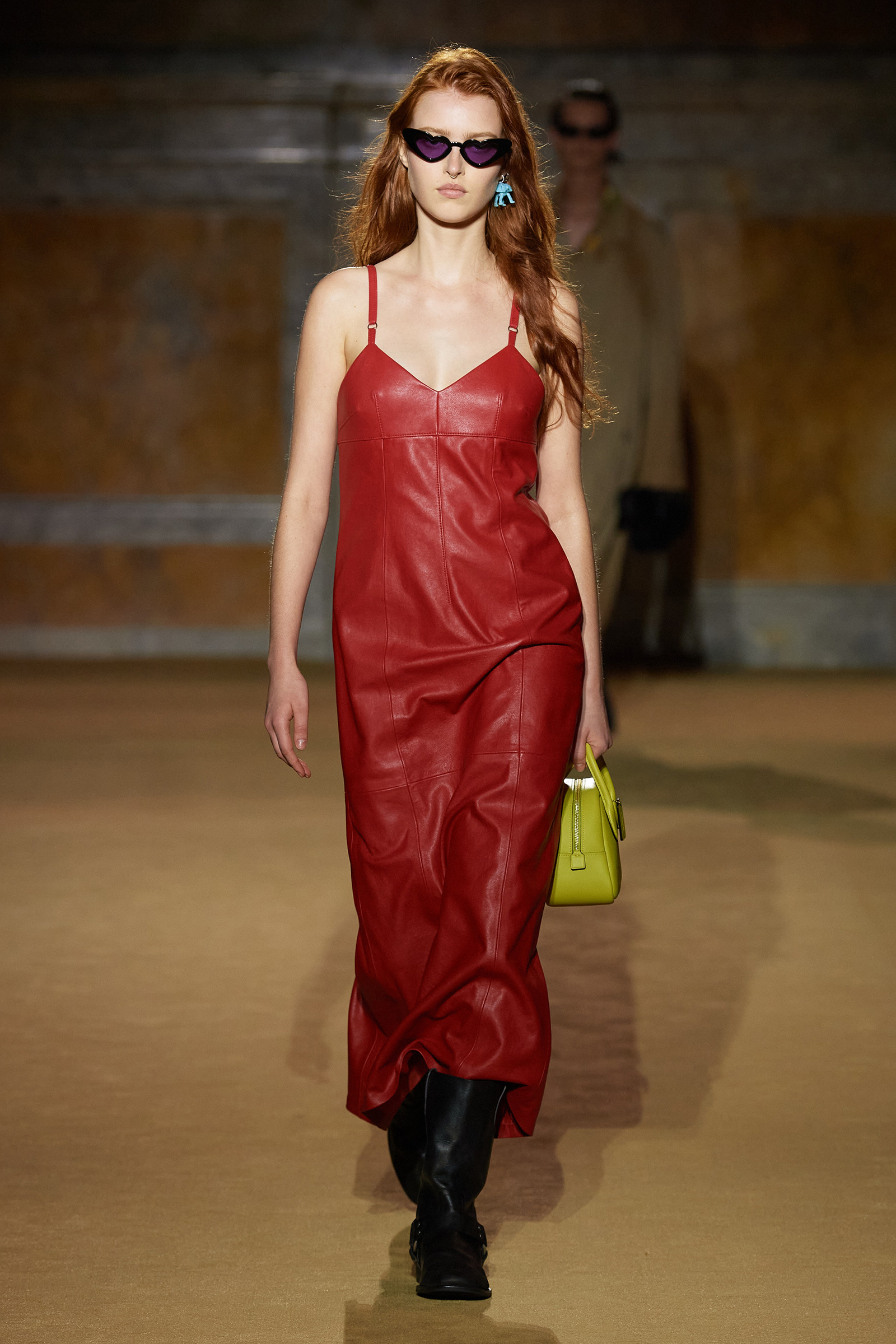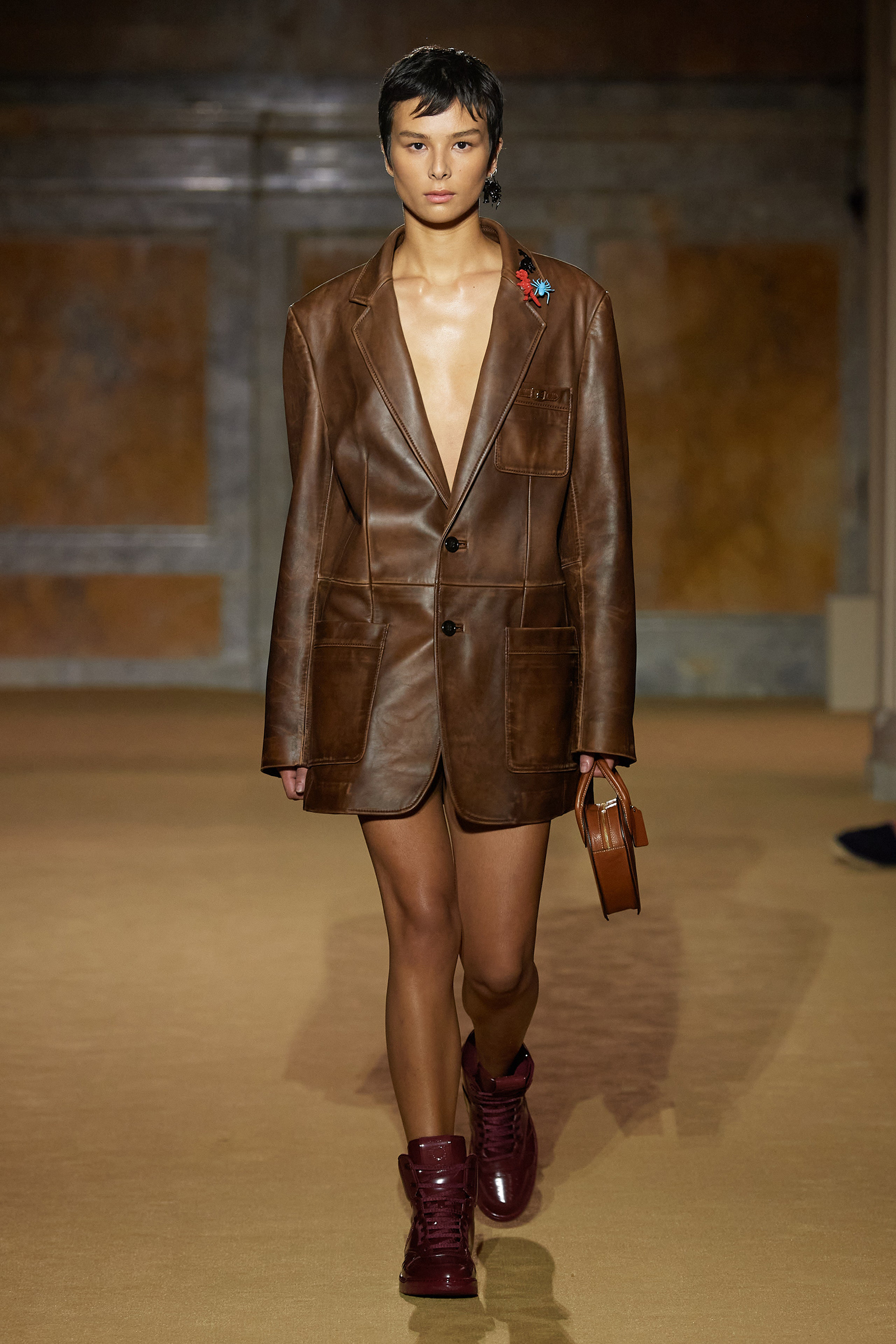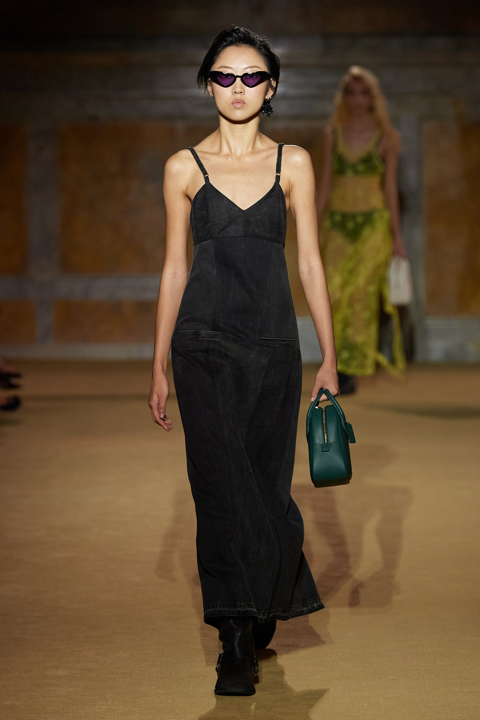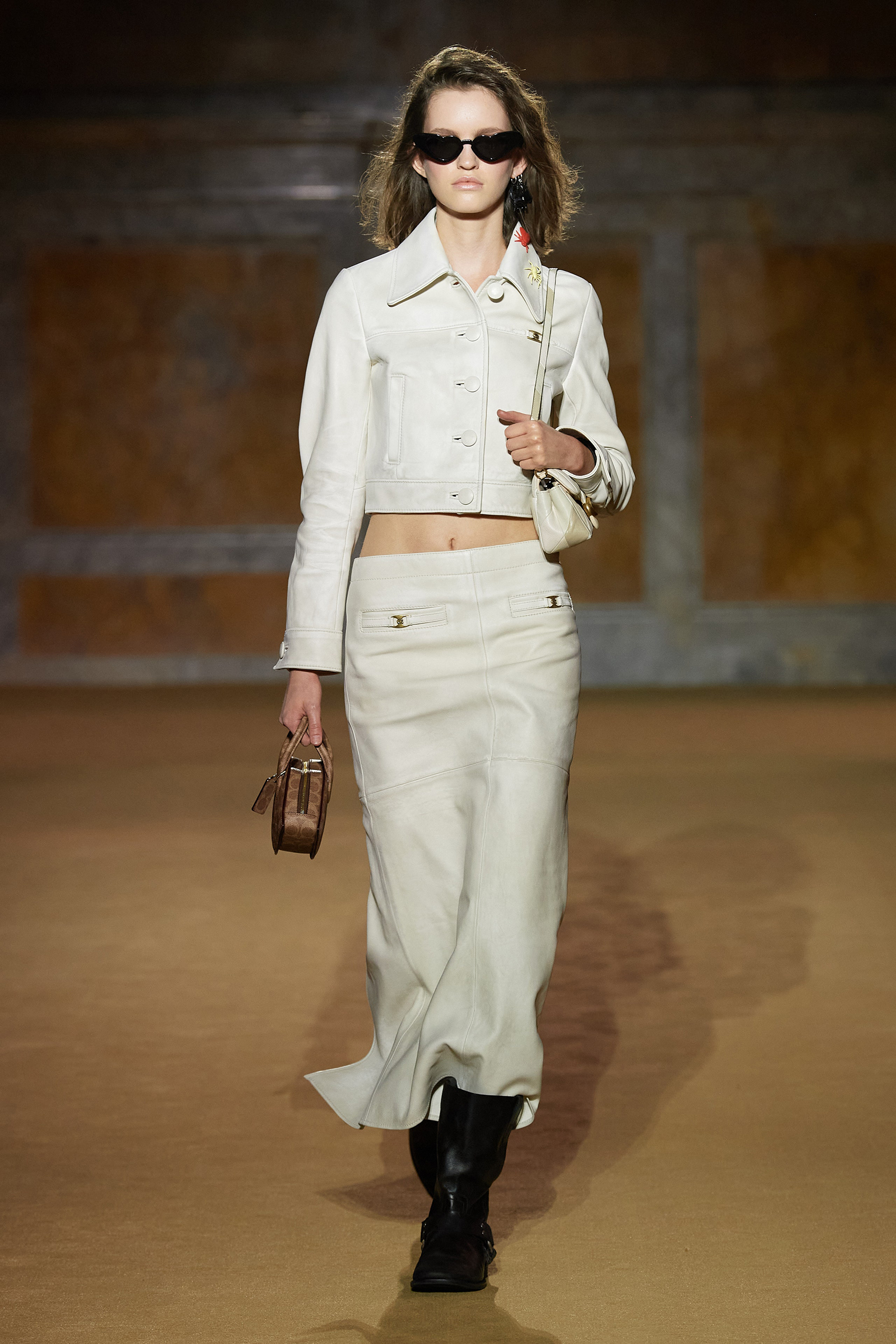 But what about the clothes? Although Vevers was in a wistful mode, this wasn’t about bringing back the greatest hits from his early collections. Rather, it was a continuation of the shapes and experiments on construction and silhouette that he’s been developing in recent seasons. The show opened with a black slipdress made from pieced-together leather with exposed stitches, moto boots, and a cool little rounded bowling bag. “There was no archival reference for them,” he said. “It was just what I imagined a Coach bag should be—and maybe that’s a reflection of my time at Coach.” Vevers’s great fascination with oversized leather jackets continued: a single-breasted blazer, worn over a mesh turtleneck and pointy jelly flats, was a very chic proposition indeed. There were also fringed suede jackets, and upcycled denim jackets, with the let-out hems acting as a trim detail on pockets.