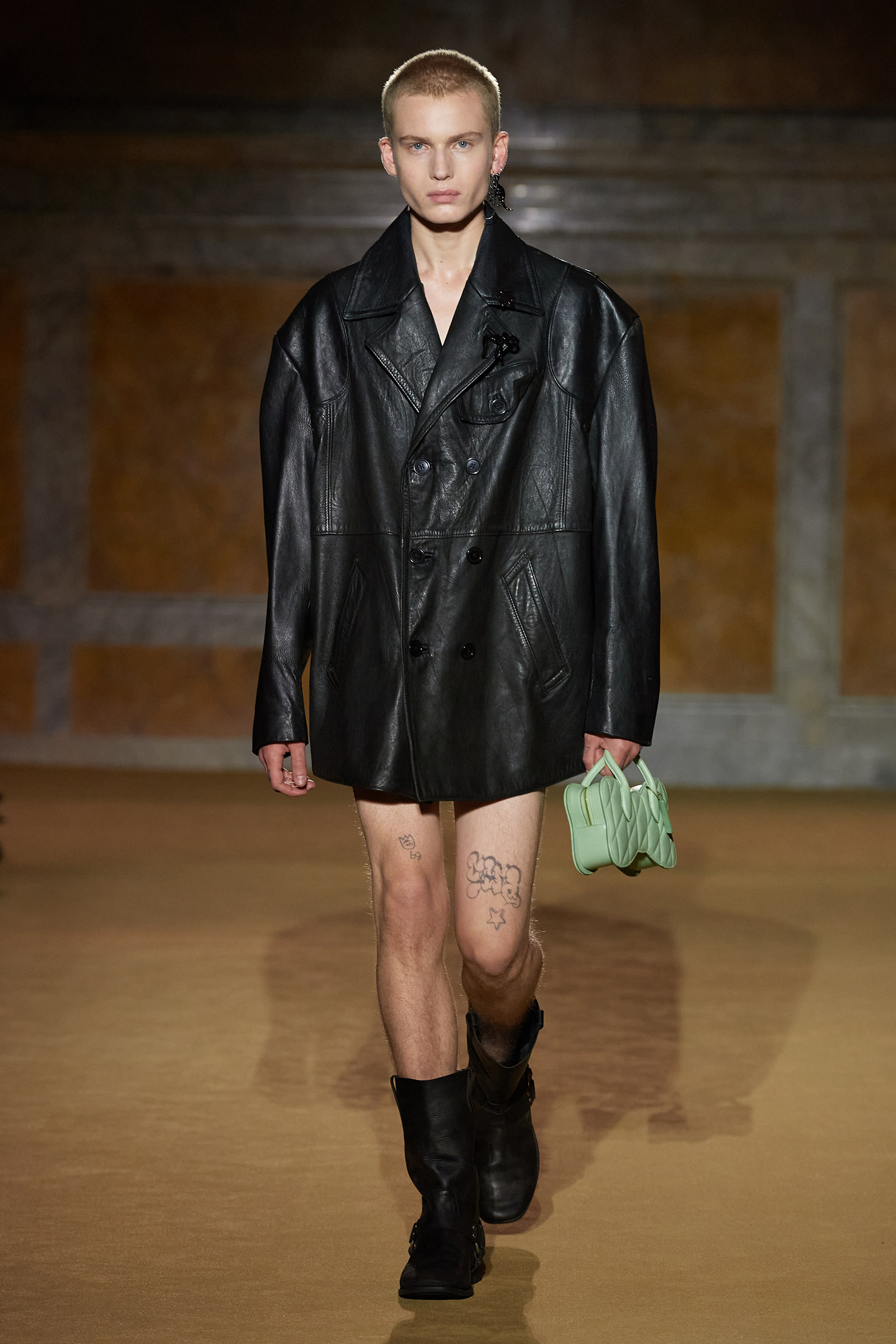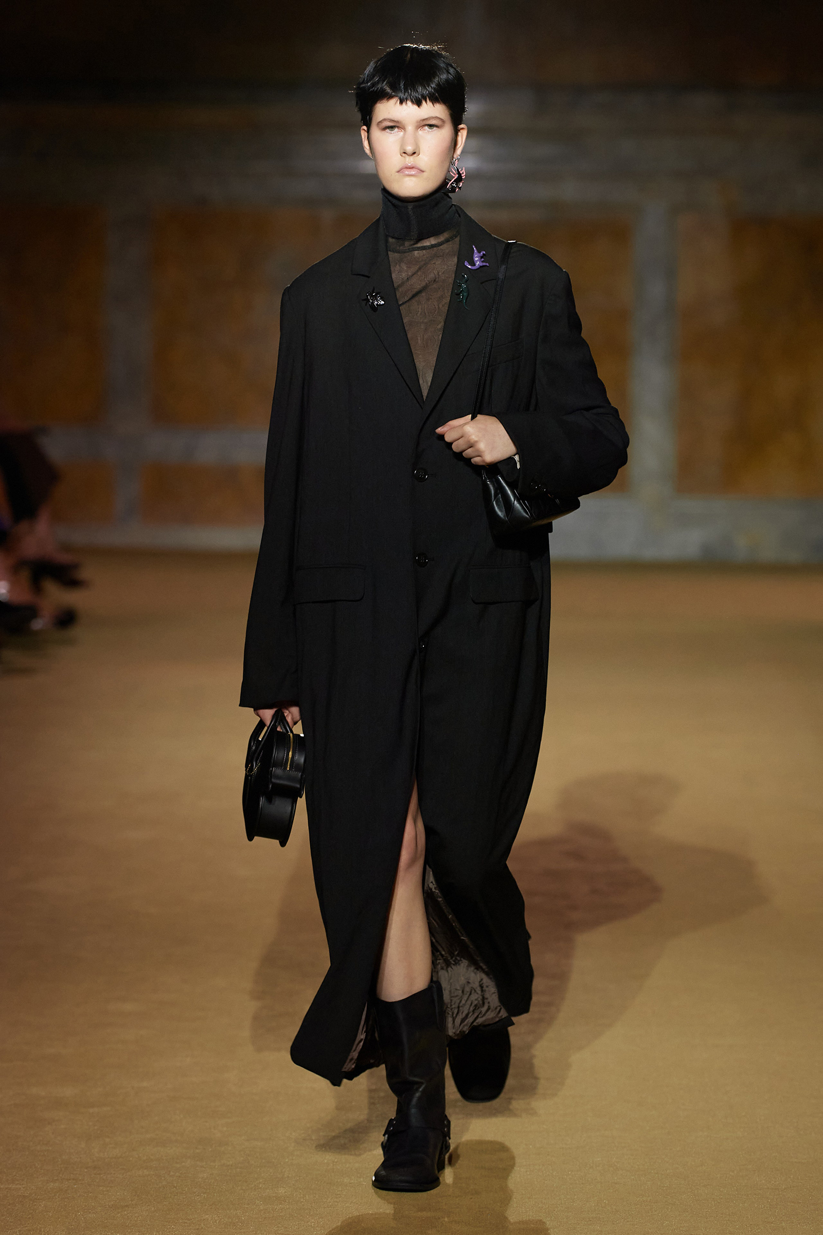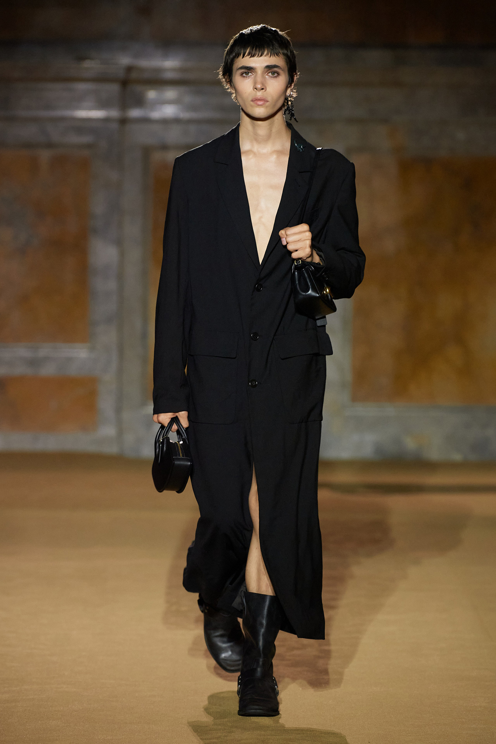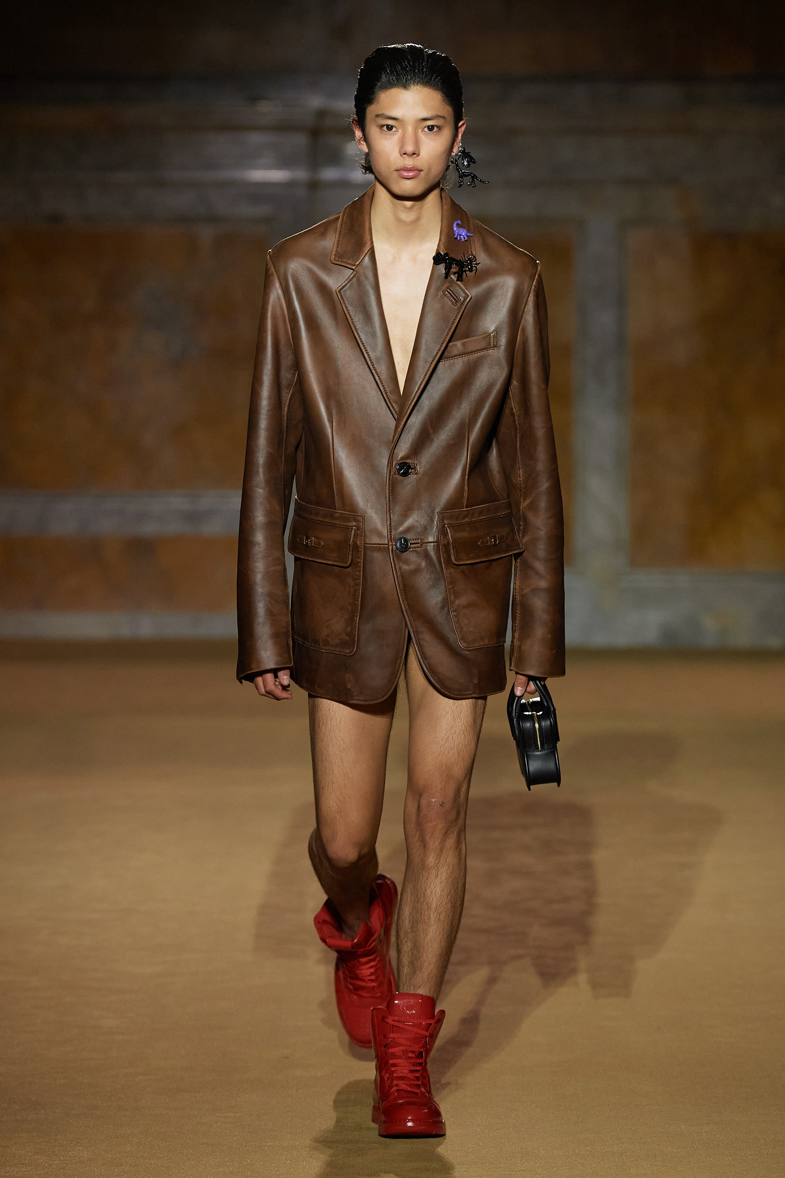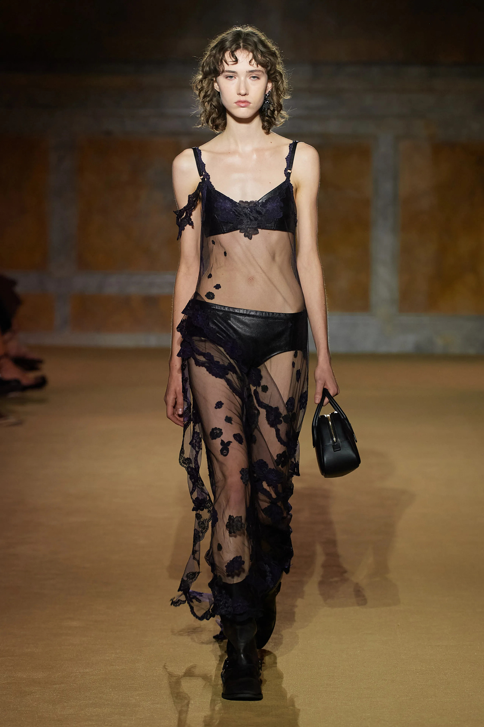 But what about the clothes? Although Vevers was in a wistful mode, this wasn’t about bringing back the greatest hits from his early collections. Rather, it was a continuation of the shapes and experiments on construction and silhouette that he’s been developing in recent seasons. The show opened with a black slipdress made from pieced-together leather with exposed stitches, moto boots, and a cool little rounded bowling bag. “There was no archival reference for them,” he said. “It was just what I imagined a Coach bag should be—and maybe that’s a reflection of my time at Coach.” Vevers’s great fascination with oversized leather jackets continued: a single-breasted blazer, worn over a mesh turtleneck and pointy jelly flats, was a very chic proposition indeed. There were also fringed suede jackets, and upcycled denim jackets, with the let-out hems acting as a trim detail on pockets.