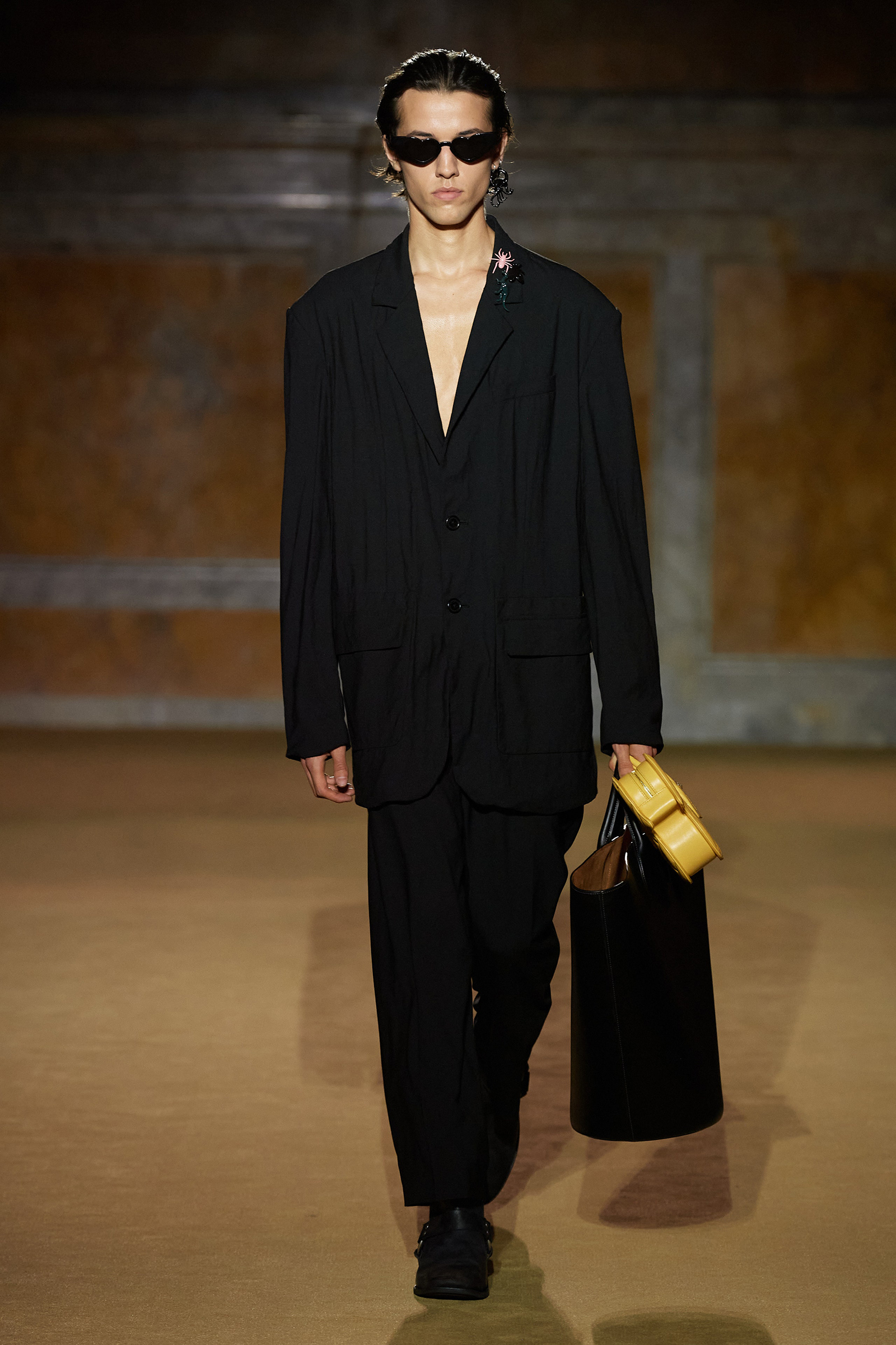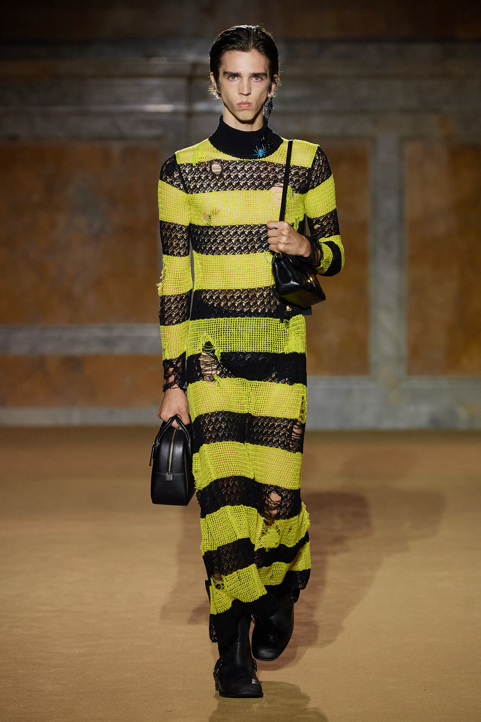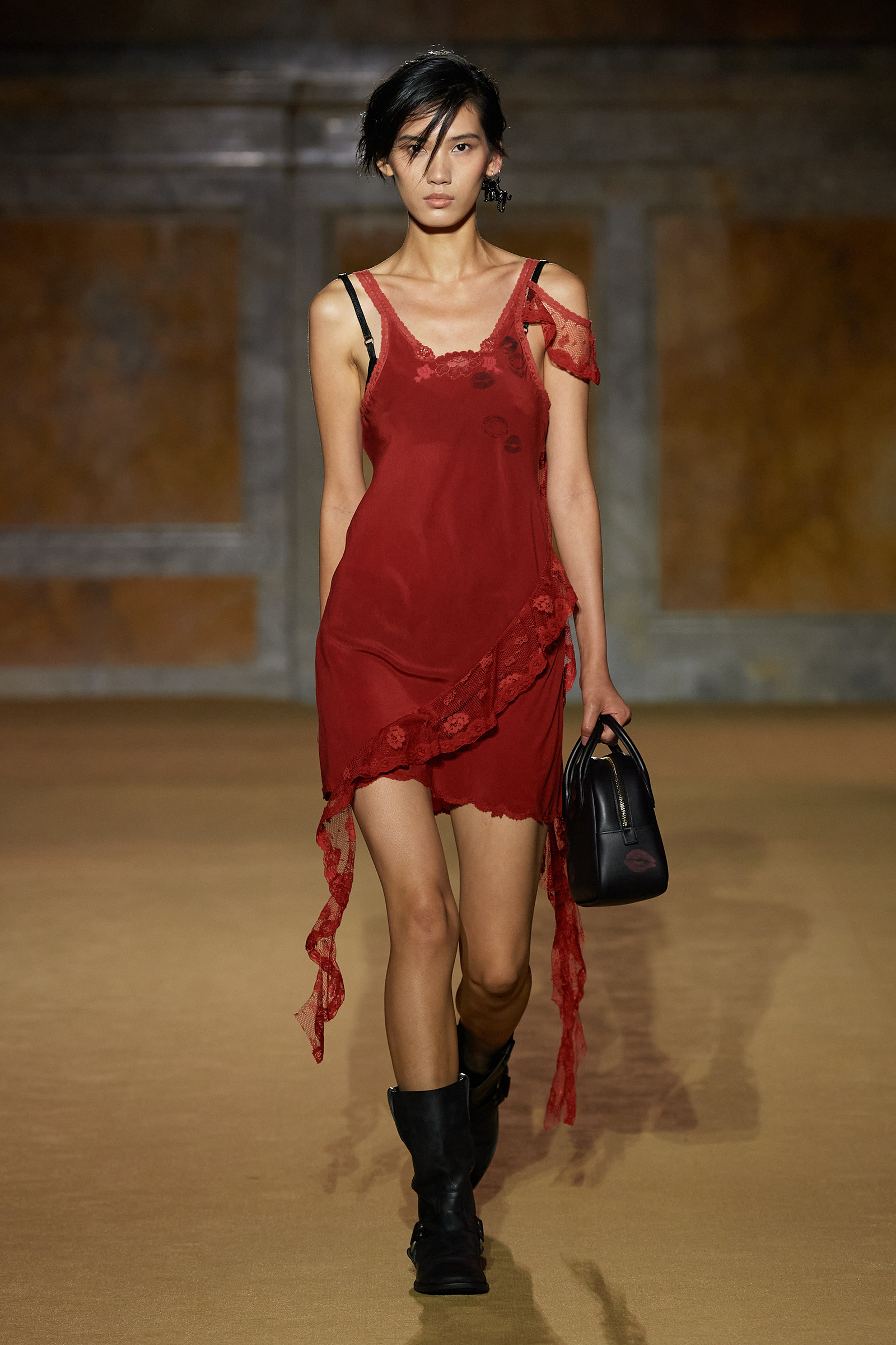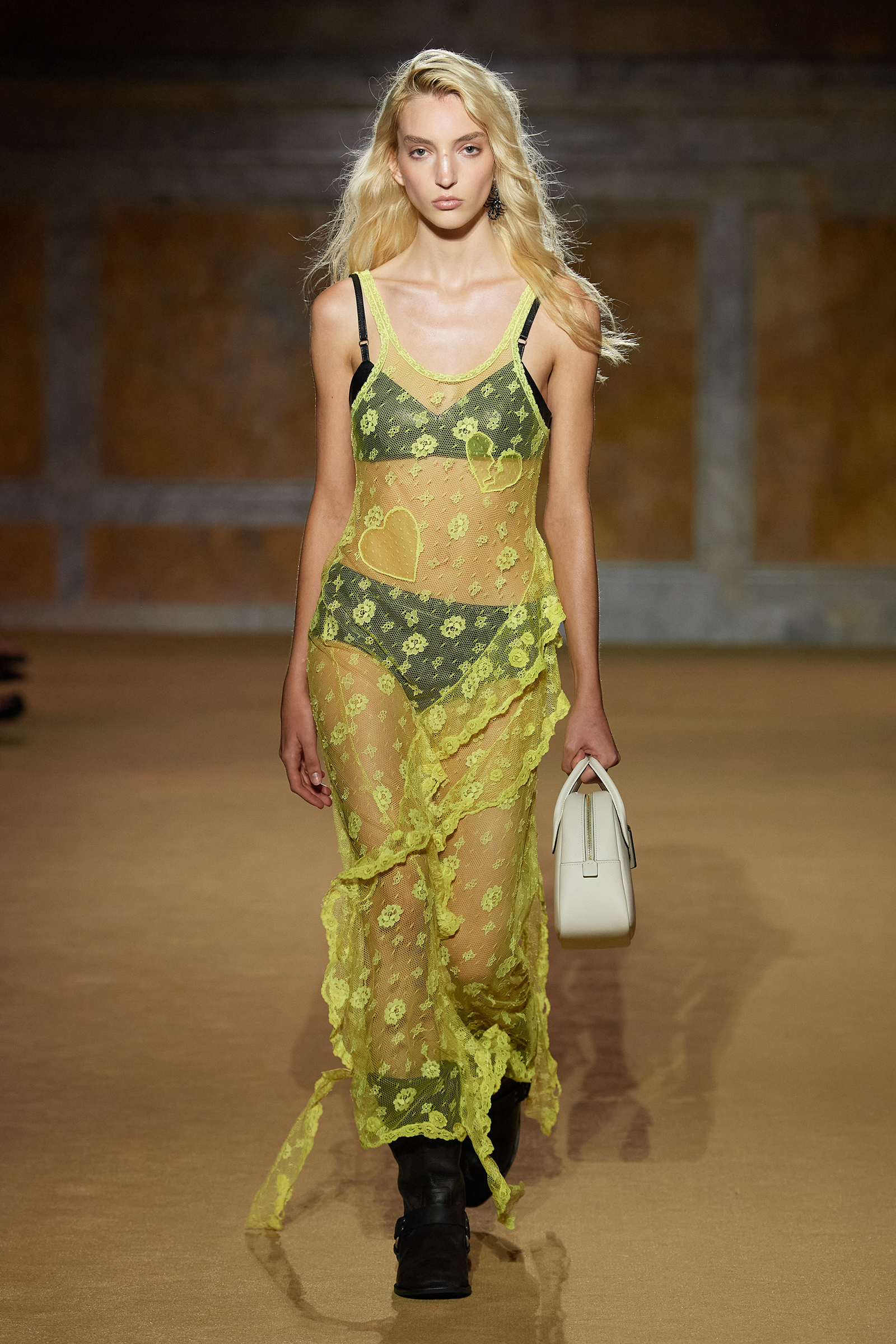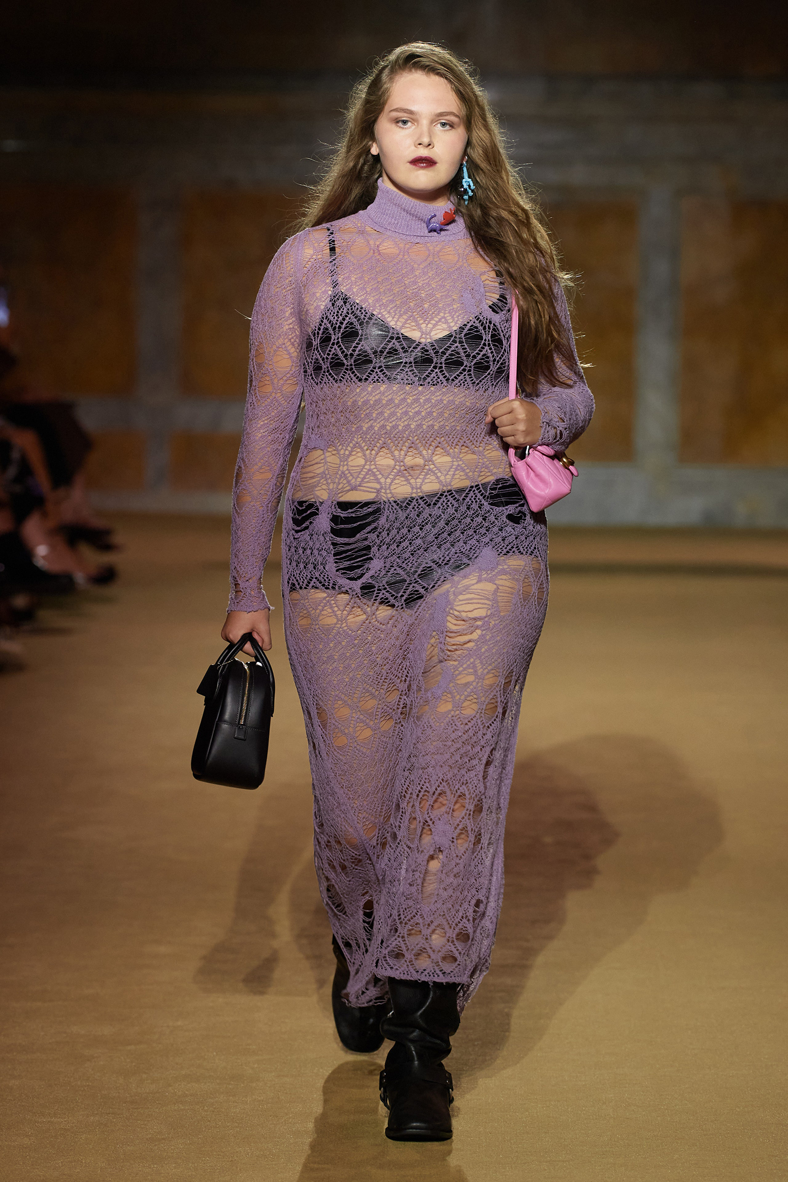 But what about the clothes? Although Vevers was in a wistful mode, this wasn’t about bringing back the greatest hits from his early collections. Rather, it was a continuation of the shapes and experiments on construction and silhouette that he’s been developing in recent seasons. The show opened with a black slipdress made from pieced-together leather with exposed stitches, moto boots, and a cool little rounded bowling bag. “There was no archival reference for them,” he said. “It was just what I imagined a Coach bag should be—and maybe that’s a reflection of my time at Coach.” Vevers’s great fascination with oversized leather jackets continued: a single-breasted blazer, worn over a mesh turtleneck and pointy jelly flats, was a very chic proposition indeed. There were also fringed suede jackets, and upcycled denim jackets, with the let-out hems acting as a trim detail on pockets.