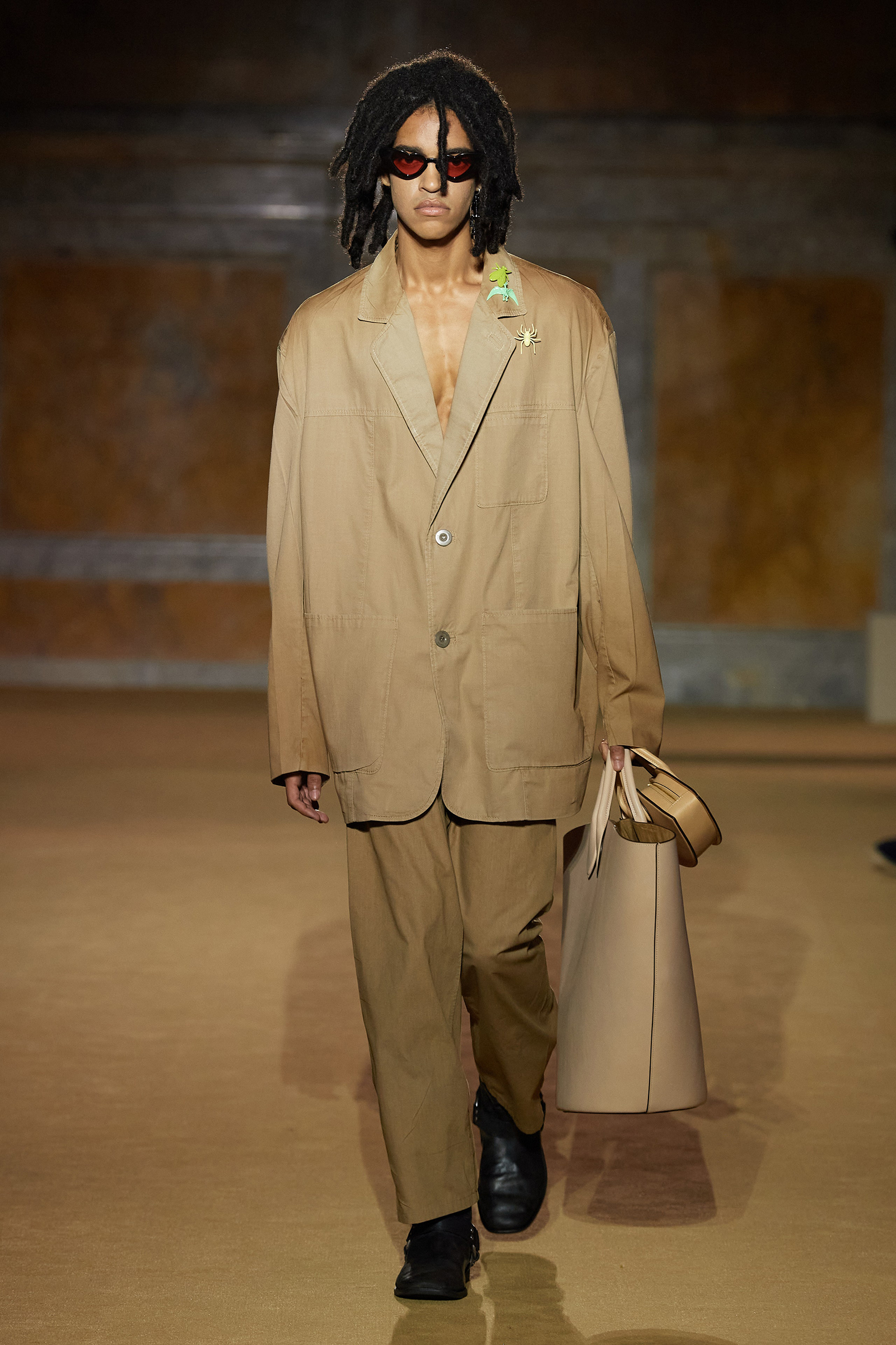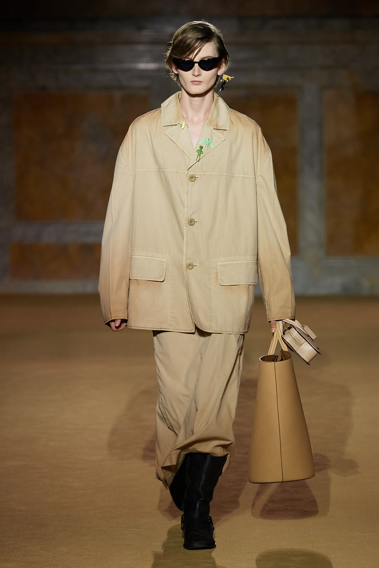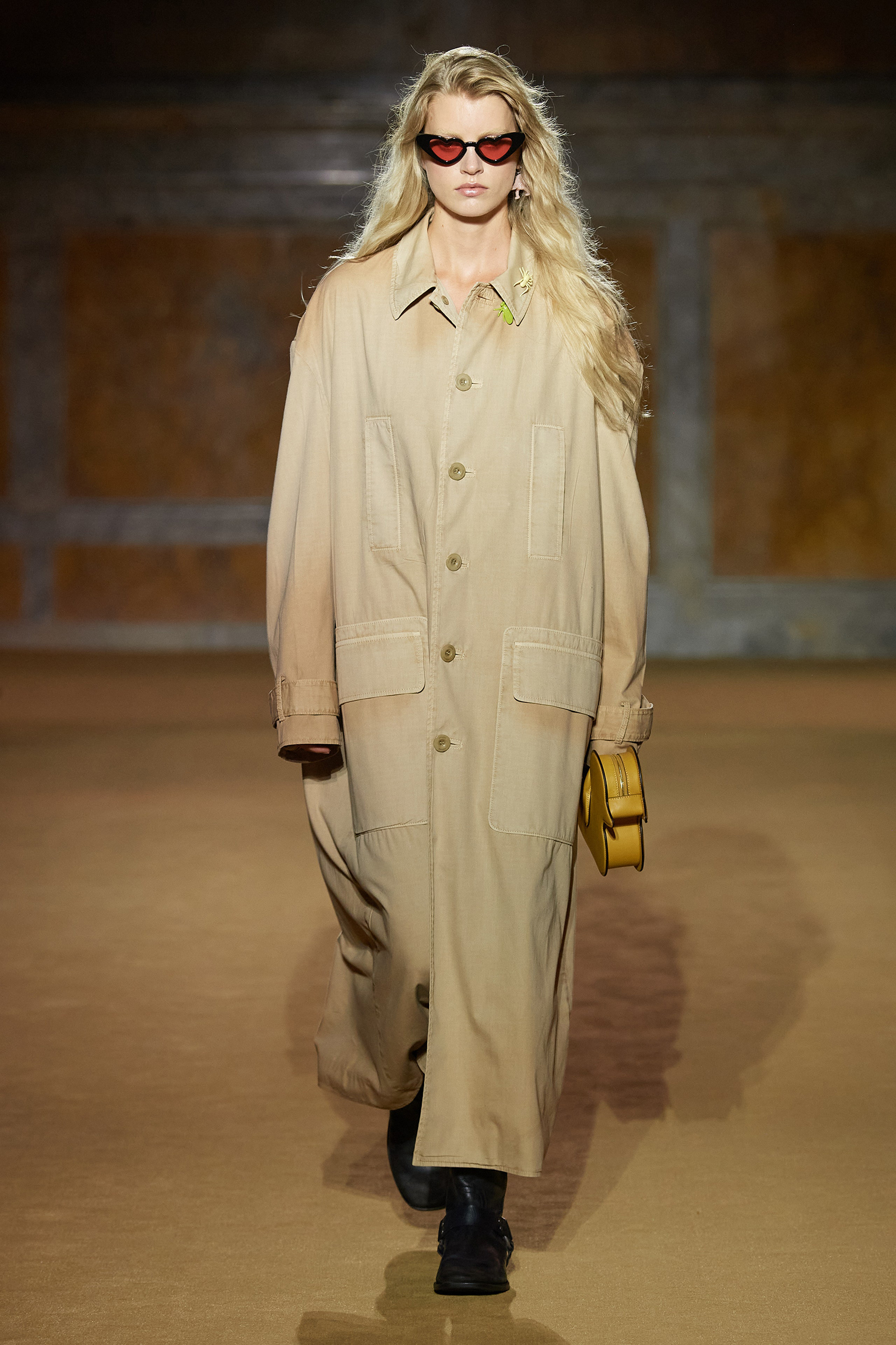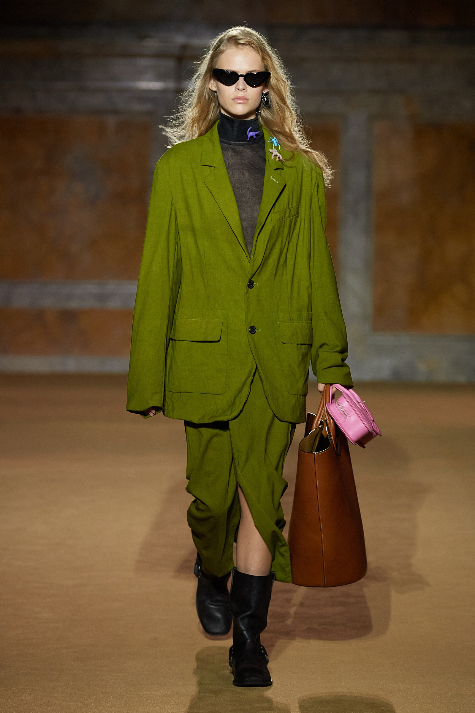 Coach may be a house of leather, but the big news tonight was the introduction of soft suiting made from cotton or wool that had been overused and washed, and subtly “aged” to perfection. A mossy green suit with an oversized, slouchy jacket worn with a matching slim maxi skirt—a continuation of the silhouette Vevers began exploring last season—was certainly one of the collection’s brightest propositions (literally and figuratively). Ditto a version with a chore jacket in khaki, the shoulder seams darkened from the imagined wear and tear of a bag or also just life.