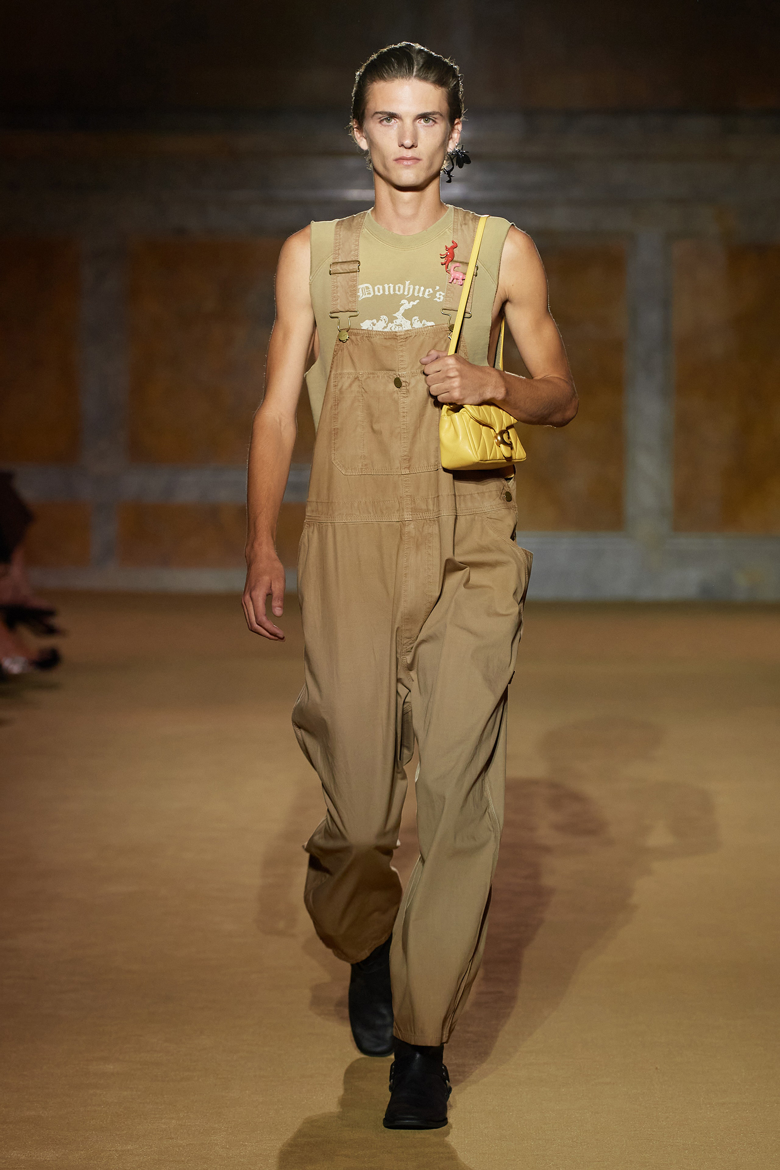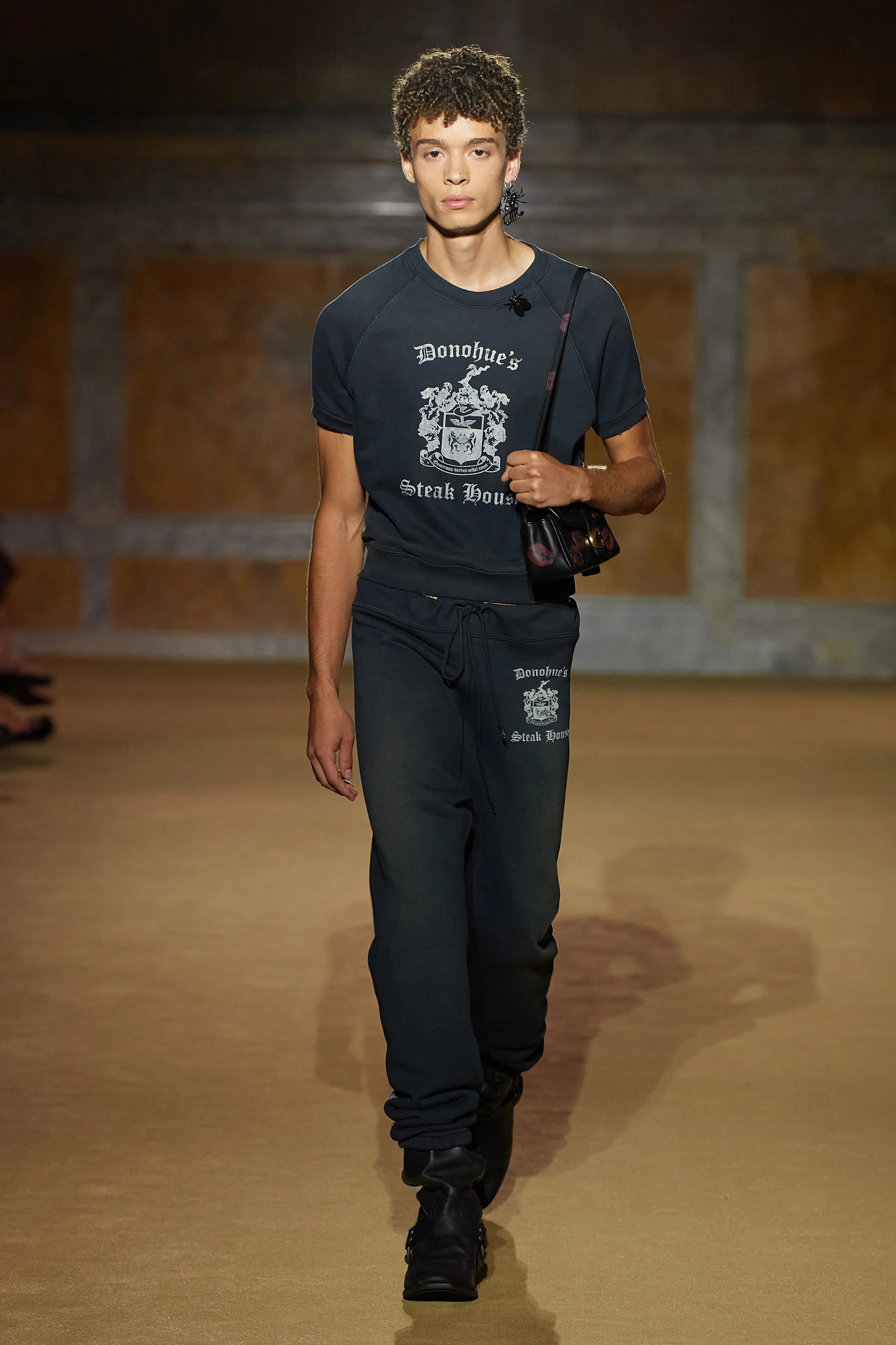 “The thing that I always talk about at Coach is that I want things to feel love-worn,” Vevers said. Which in a way all the pieces were, love-worn by his own memories of being young in the city, going to dance at the Pyramid club, or being older in the city and still having a meal at a favorite restaurant that feels like it’s frozen in time. That would be Donohue’s, a steakhouse on Lexington. “It was my favorite then and it’s my favorite still and it’s full of characters and doesn’t seem to have been updated since maybe the ’60s,” he said. The logo adorned a series of T-shirts and matching short sleeve sweatshirts and sweatpants whose distinctly collegiate vibe was at humorous odds with the source material; but you know, that’s New York, too.