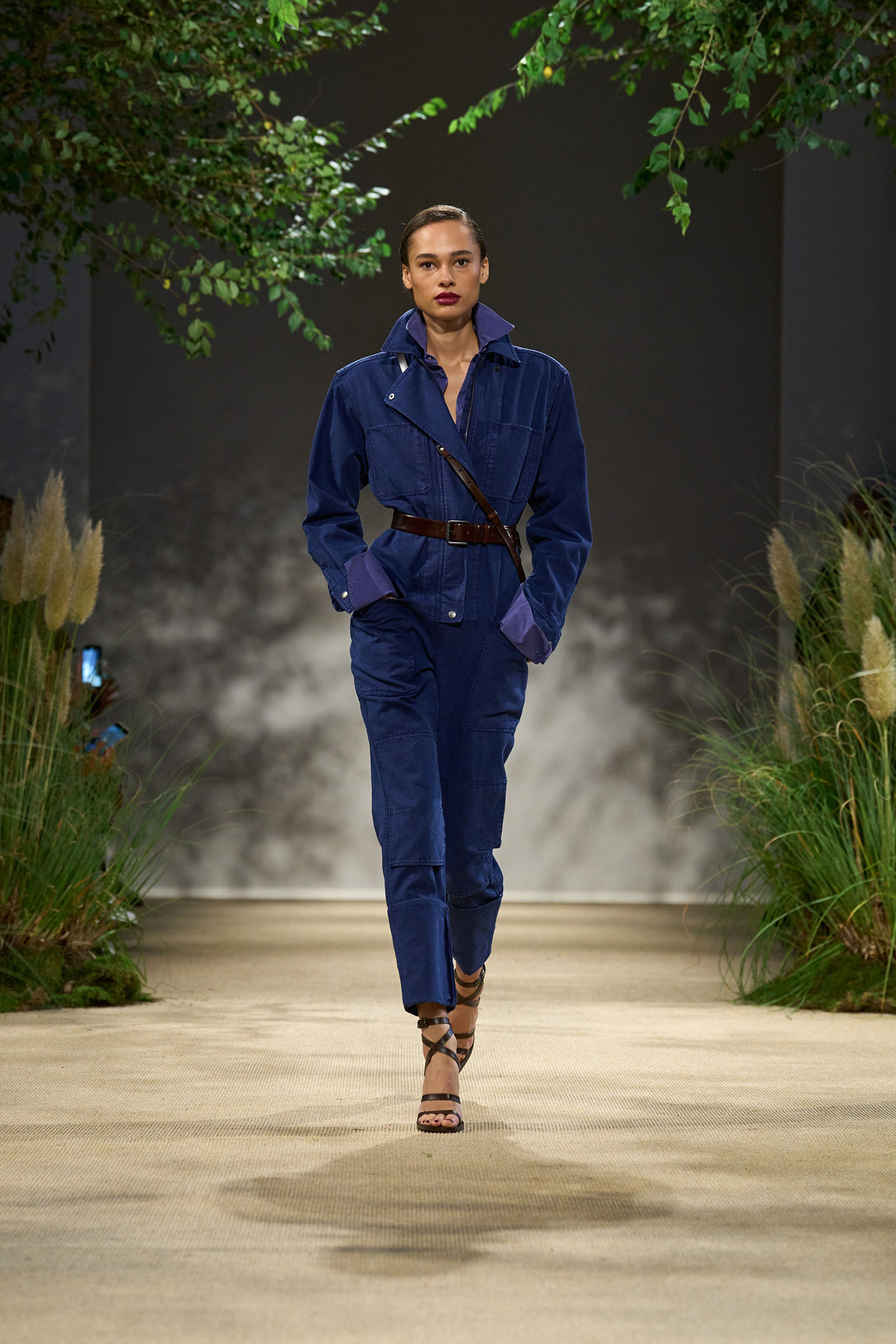 Bill Cunningham bleu de travail in various garment-dyed shades of cotton was applied to long Don-style work jackets, backless narrow-cut apron-front pencil dresses, double-kneed narrow-cut work pants, and bellows-pocketed and epauletted shirt-skirts and overalls. The palette pivoted to rosy pinks as Griffths pruned his hemlines high with patch-pocketed hot pants under a tunic and a romper. Gorgeous leather-edged canvas gardening bags and bridle-leather binocular cases were tucked under the arms of high-waisted green blousons and washed cotton wide-lapel varieties of Max Mara’s heritage-specialism coat. A wide-gauge knit jersey in green featured irregular cotton patches on one shoulder and the opposite arm in tribute to the source-era’s make-do-and-mend ethos.