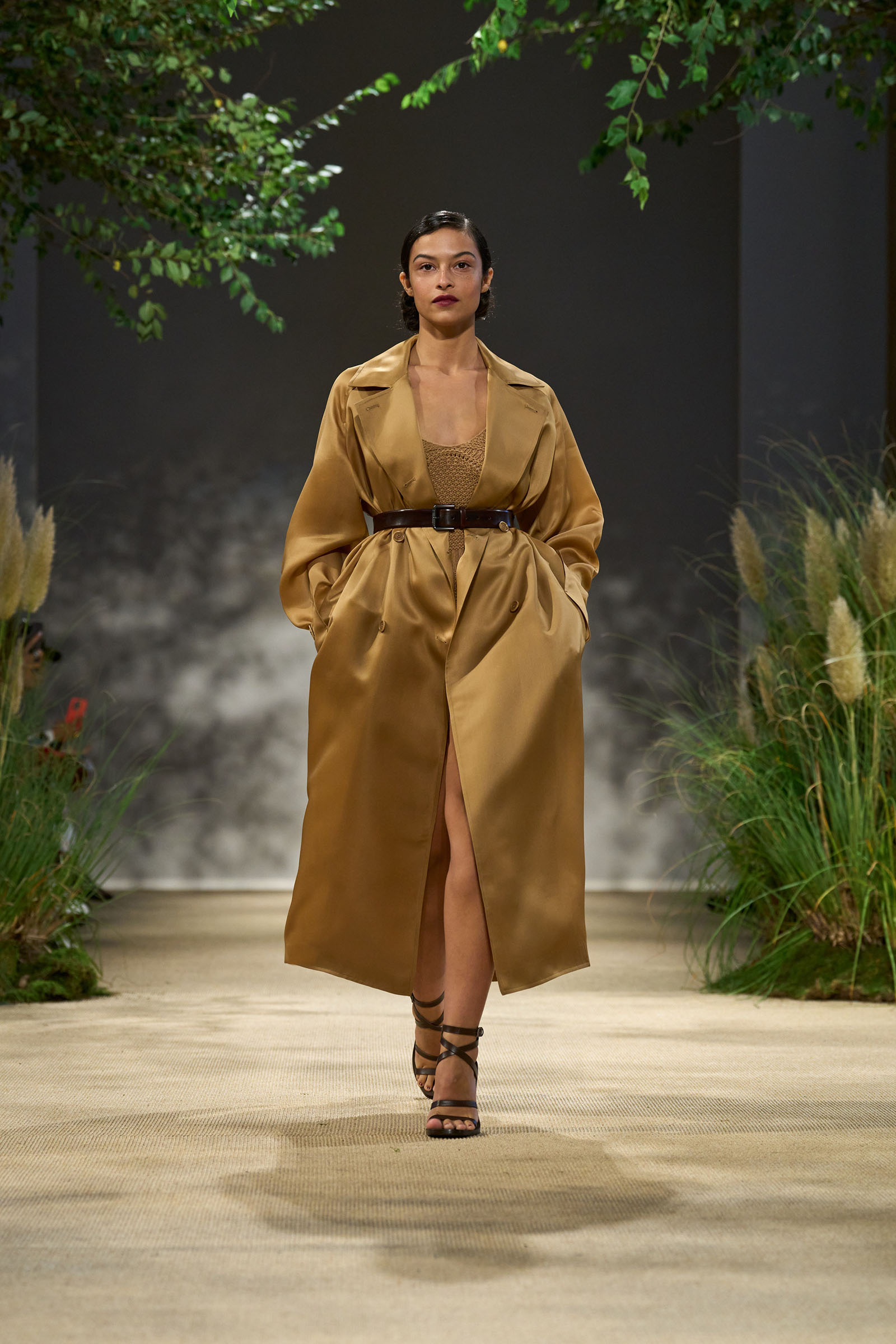 A highish-hem fishtail parka over wide-cuffed shirt signaled the switch towards more autumnal shades, and the inevitable harvest of core-to-the-house camel. The hotpants and work jackets we’d seen earlier were iterated as knits, and the camel coat in a generously-volumed satin finished fabric. Jodhpur pants, a parachute-strapped corset and what looked like a Pacific-theater US officer’s tunic rather widened the scope of operations before a series of monochrome chintz looks closed this bountiful Max Mara show. Idealized 1940’s Ipswich by way of Emilia Romagna, this classy collection was clearly close to Griffiths’s gardener’s heart.