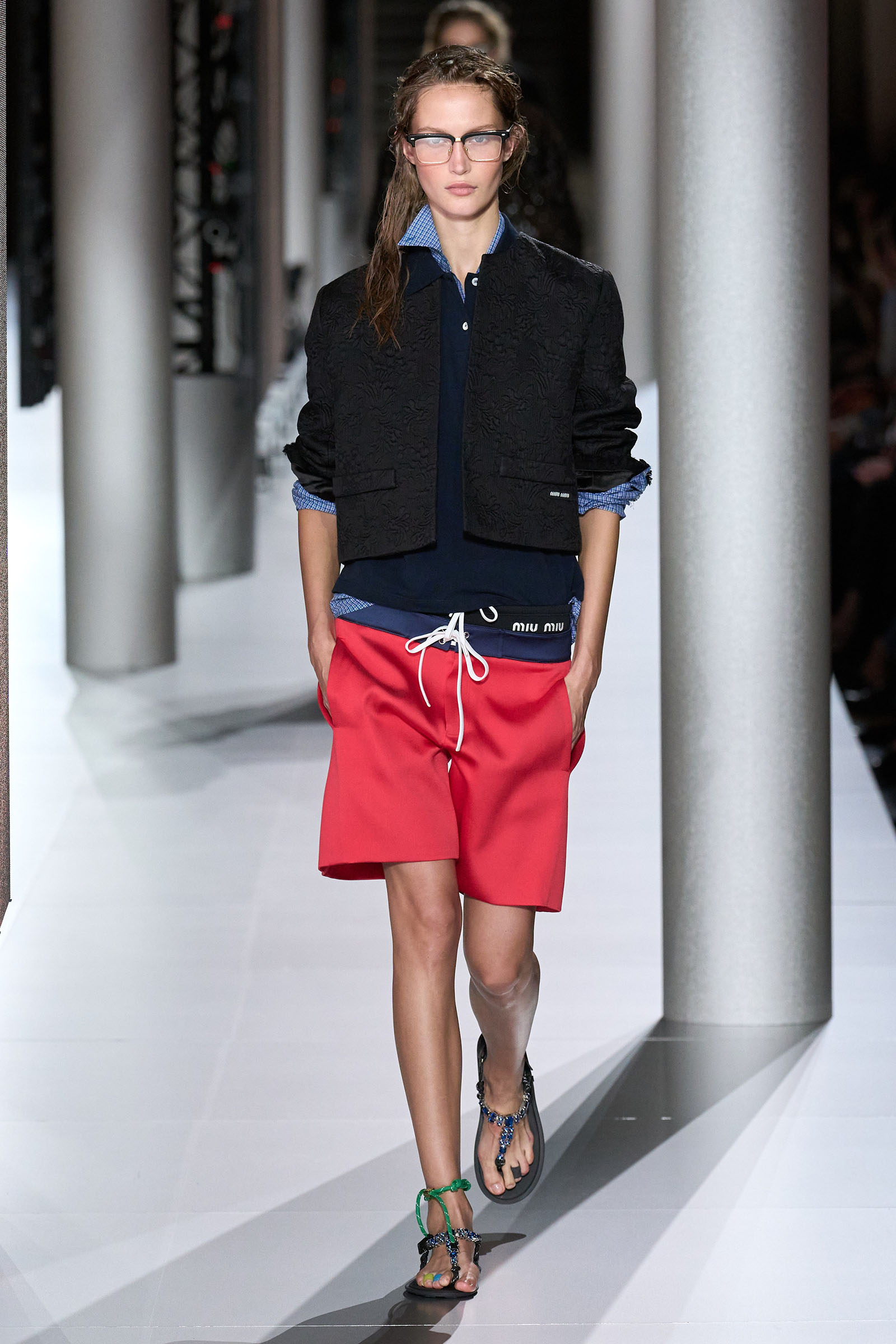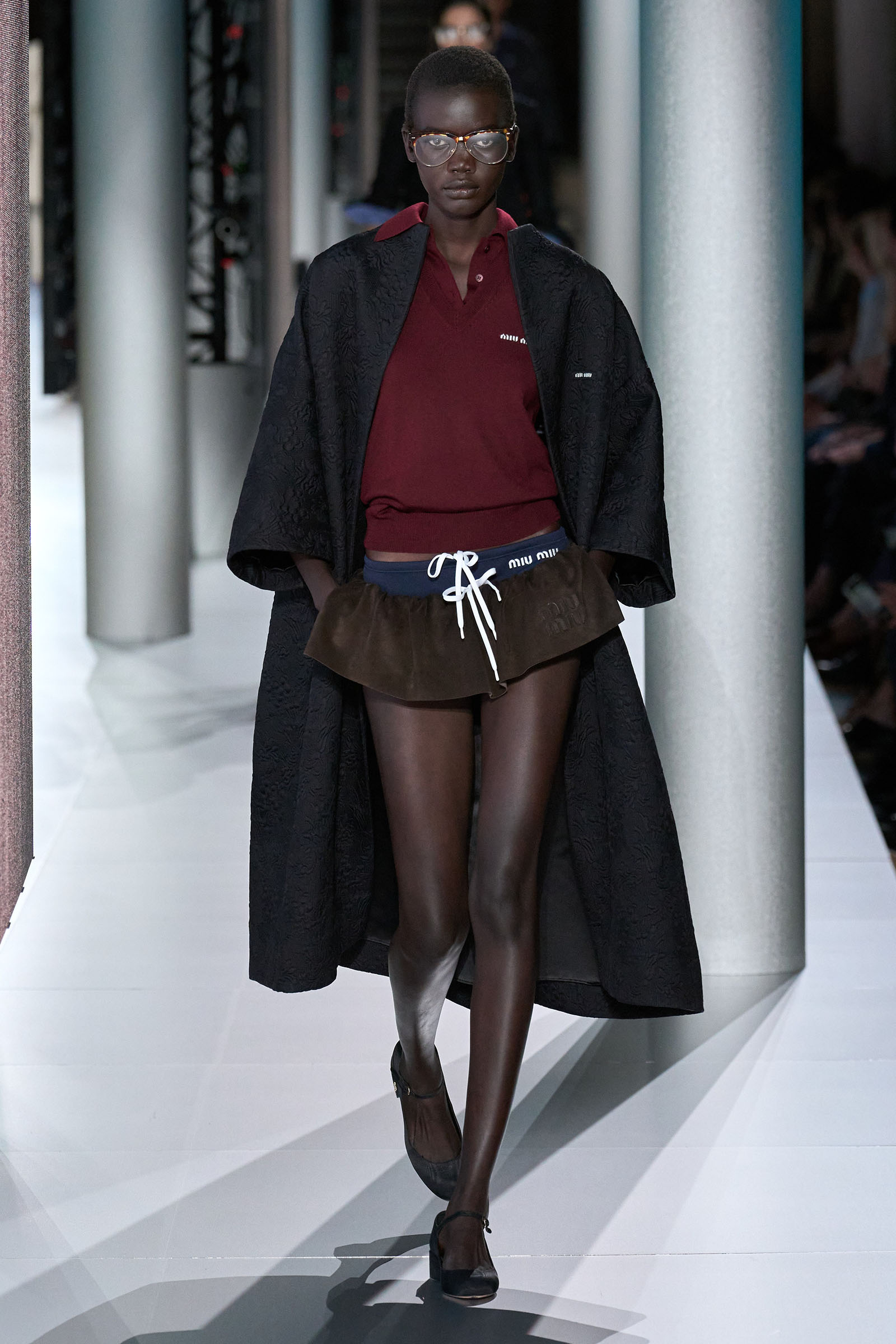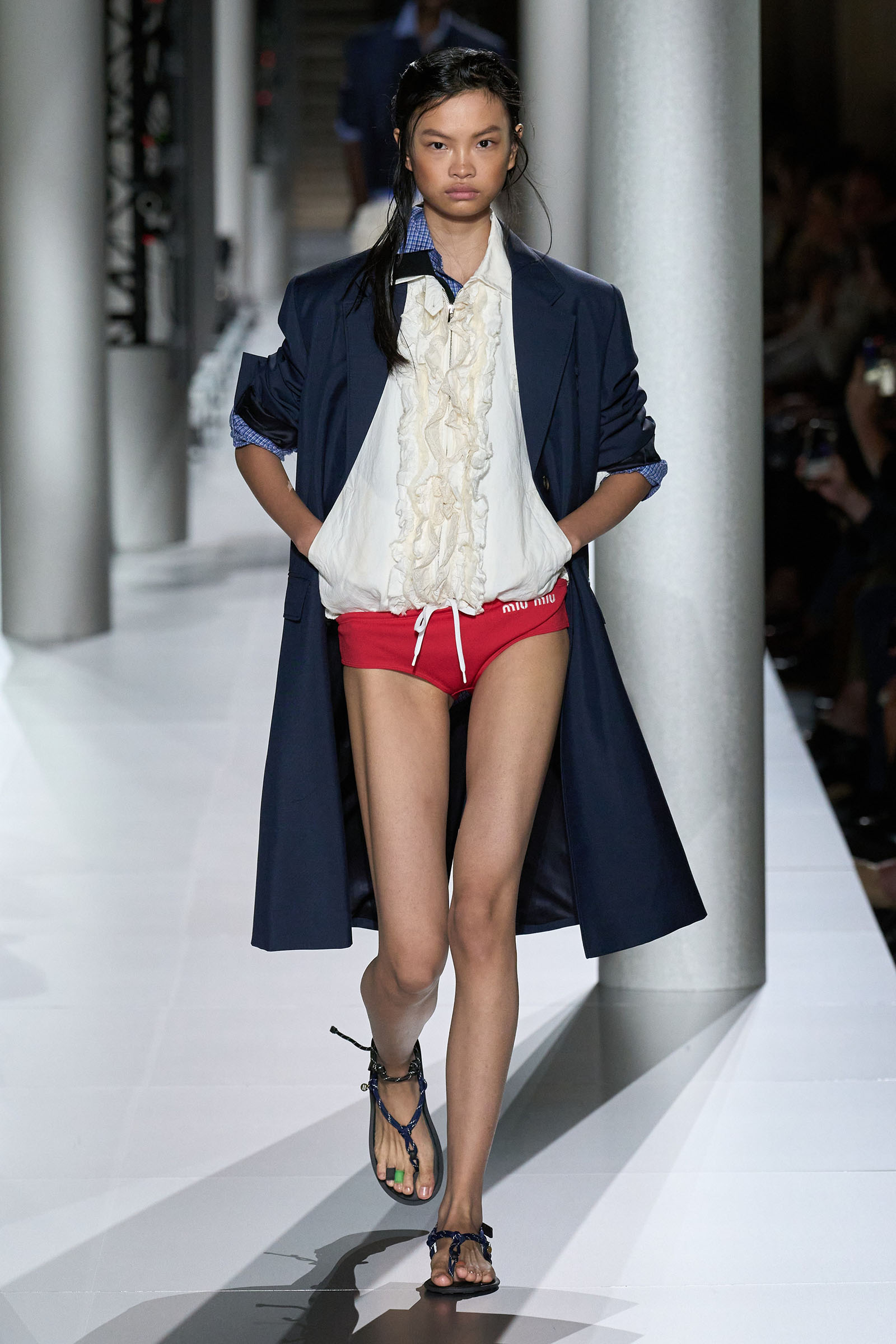 In a season when there’s been so much talk about the need for ‘real’ clothes, straight-up Miu Miu polo shirts, Oxford shirts, trench coats, and school uniform jackets were all present and correct—but then worn with Prada’s favorite underpants or funny short frilly techno-tutus topped with tracksuit drawstring waistbands.