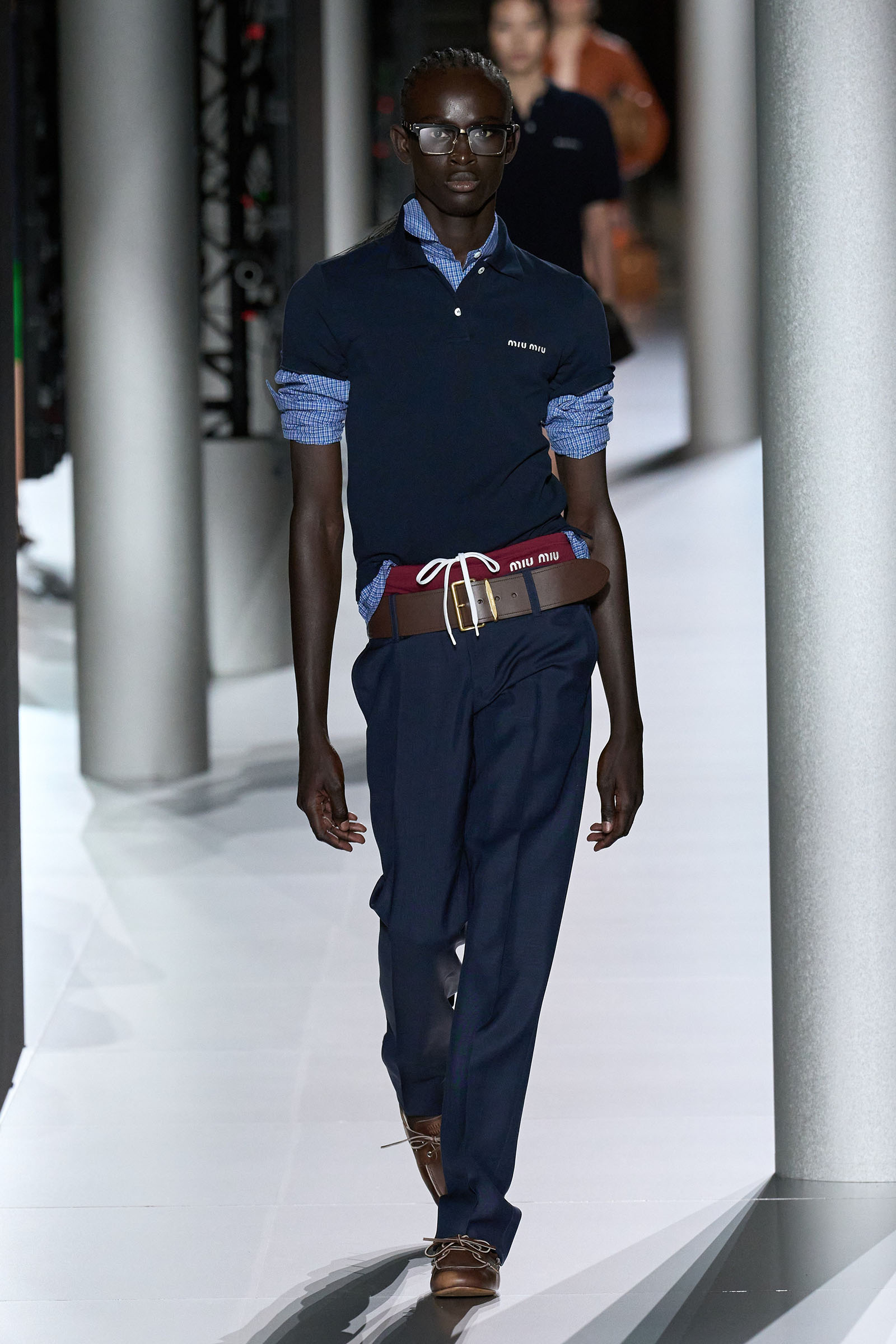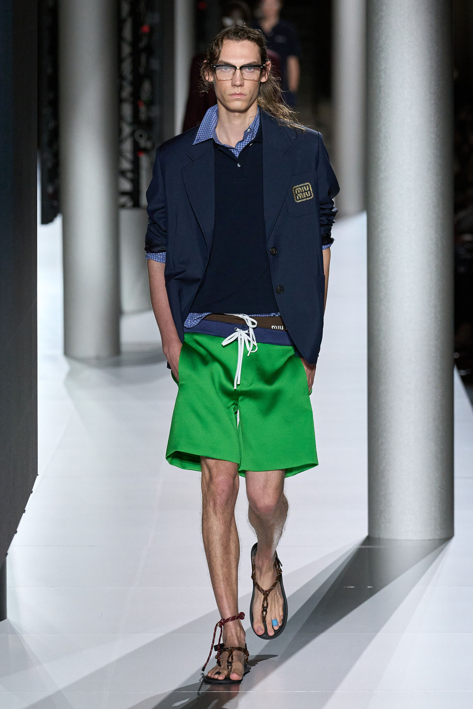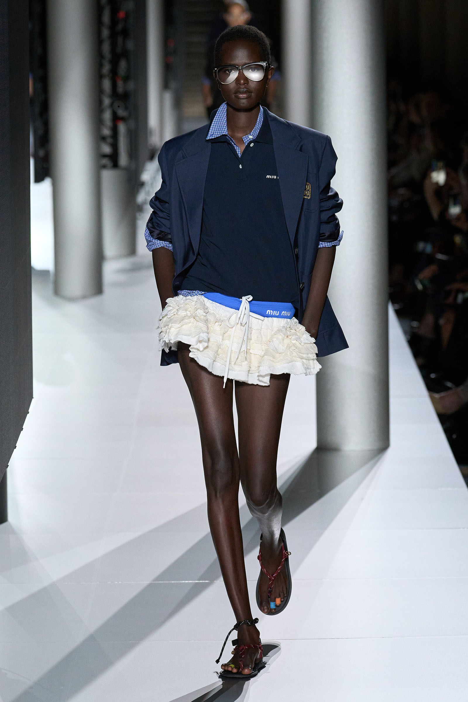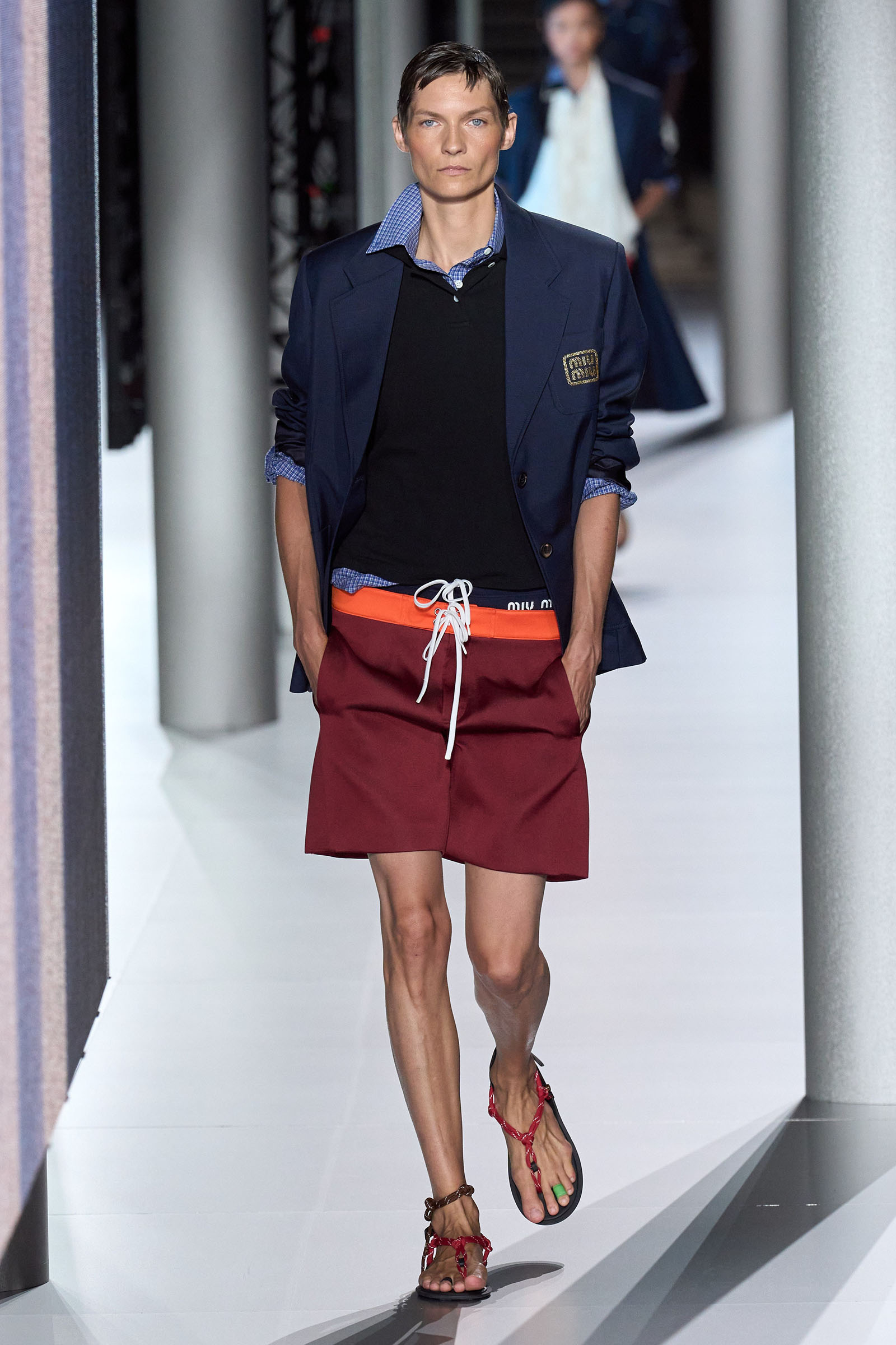 In a season when there’s been so much talk about the need for ‘real’ clothes, straight-up Miu Miu polo shirts, Oxford shirts, trench coats, and school uniform jackets were all present and correct—but then worn with Prada’s favorite underpants or funny short frilly techno-tutus topped with tracksuit drawstring waistbands.