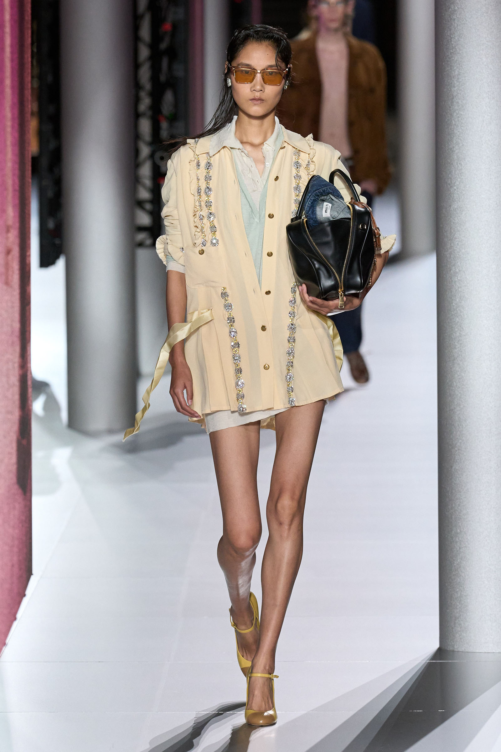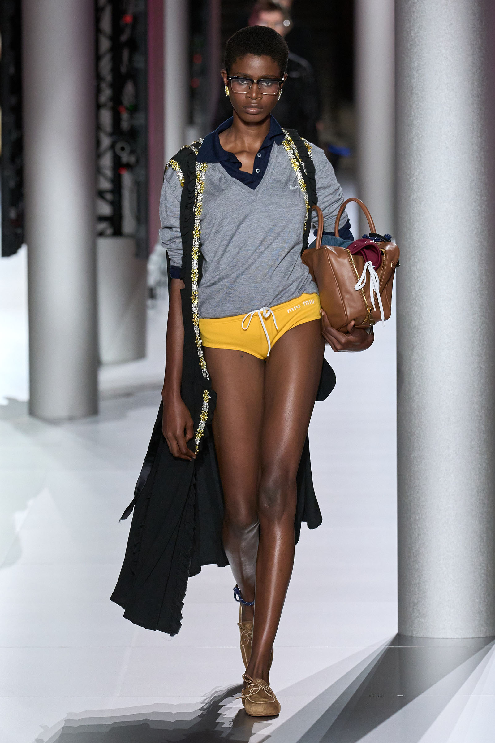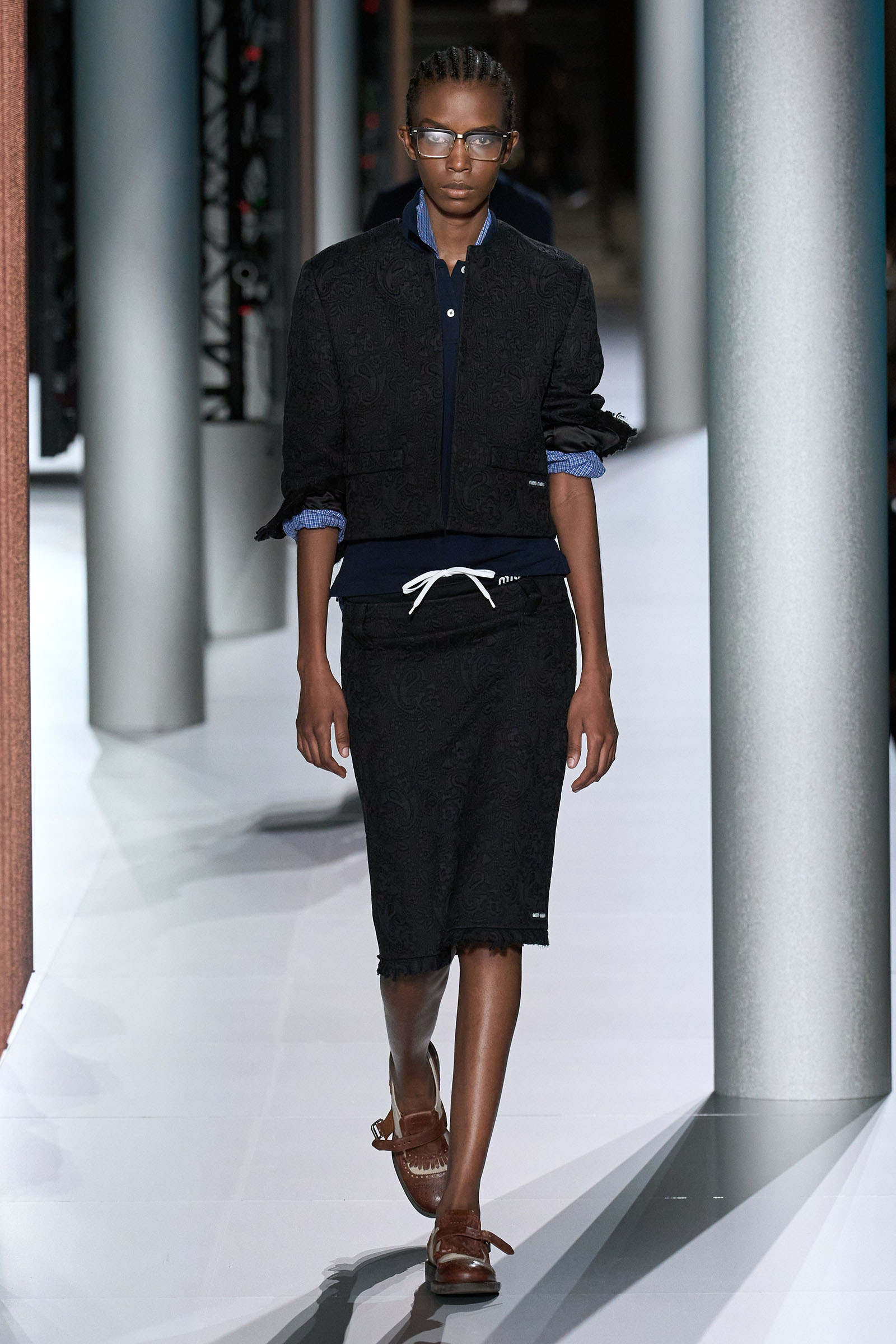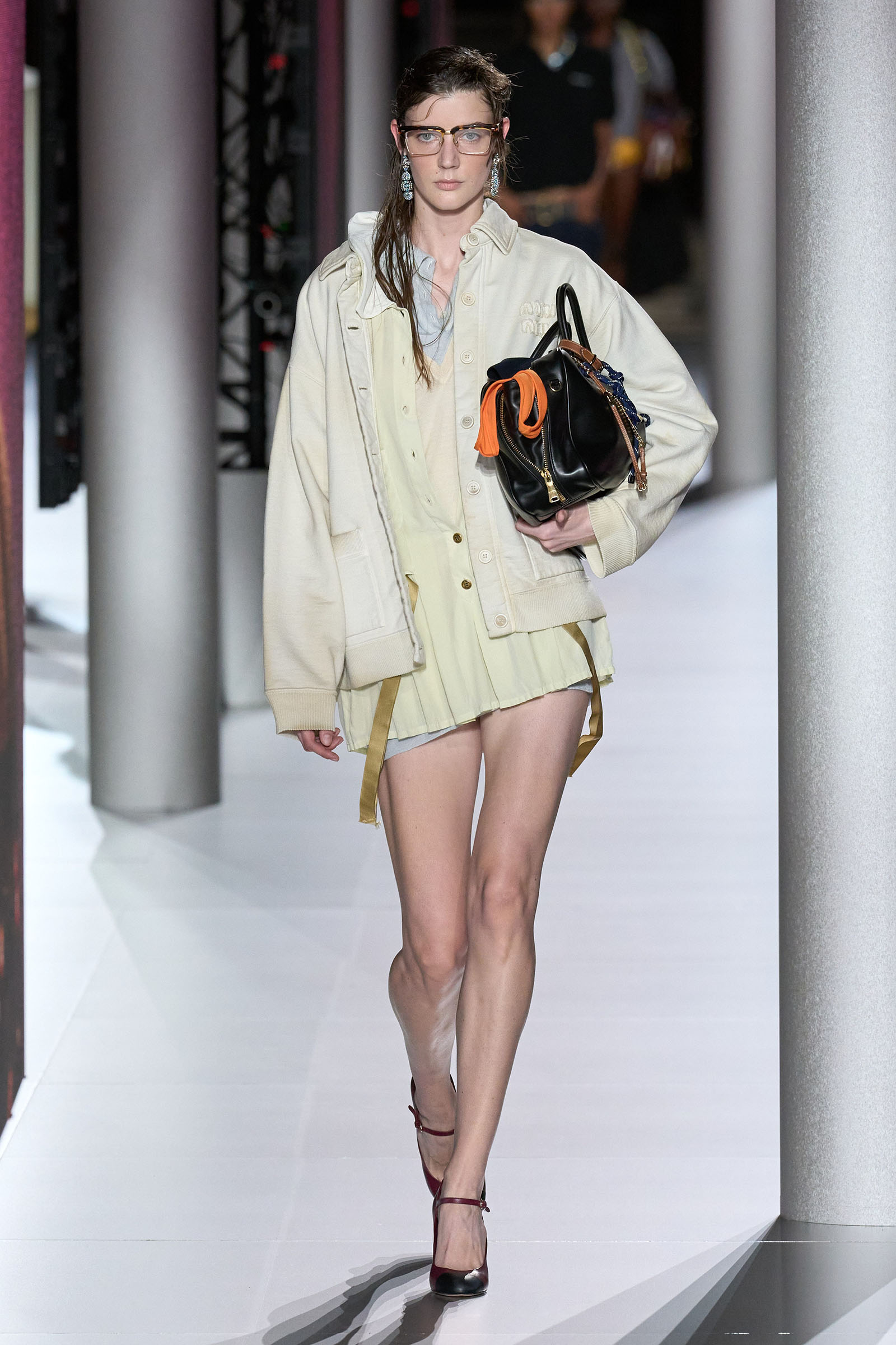 The unconventional combinations of garments—apparently happy accidents of styling—were aimed, Prada communicated in a press release, at an “embracing of unique characters, the joy of life.” Her bespectacled Miu Miu characters in action were going about their business dealing with feeling everyday messy (yet also looking great); greasy hair, coats thrown over nighties, sloppy old unbuckled saddle shoes included. Some were lugging handbags stuffed with a change of footwear, as you do.