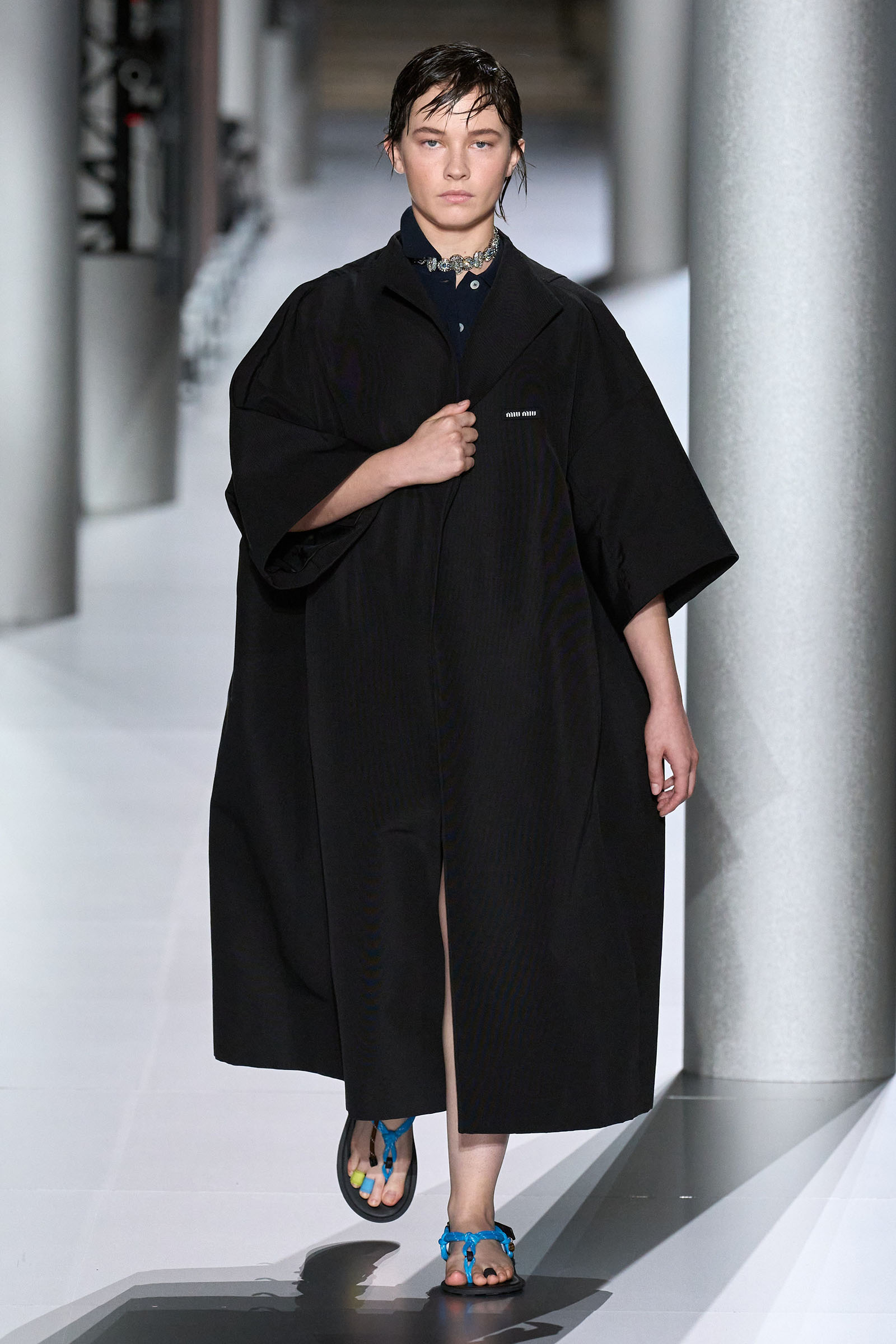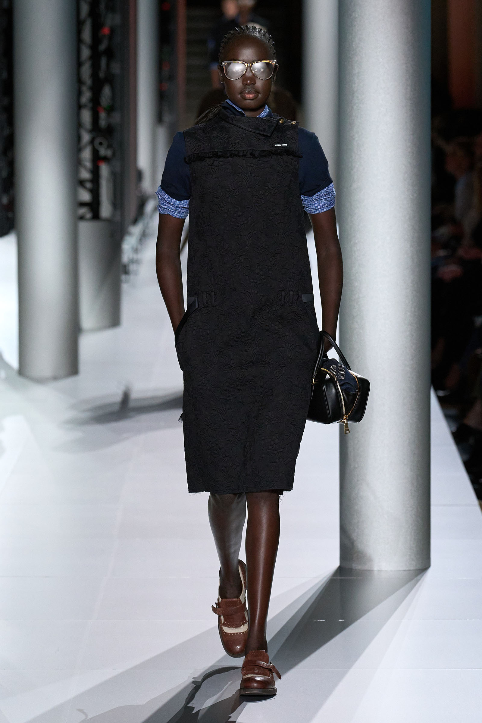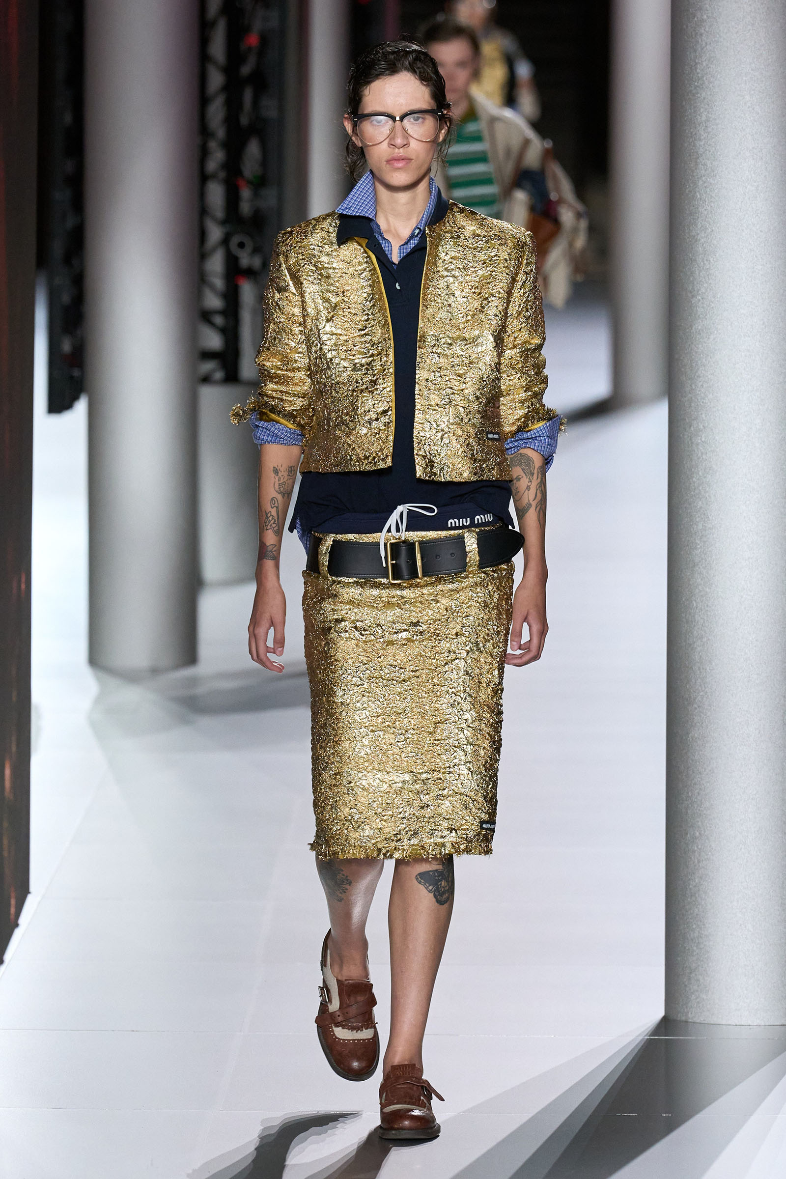 The unconventional combinations of garments—apparently happy accidents of styling—were aimed, Prada communicated in a press release, at an “embracing of unique characters, the joy of life.” Her bespectacled Miu Miu characters in action were going about their business dealing with feeling everyday messy (yet also looking great); greasy hair, coats thrown over nighties, sloppy old unbuckled saddle shoes included. Some were lugging handbags stuffed with a change of footwear, as you do.