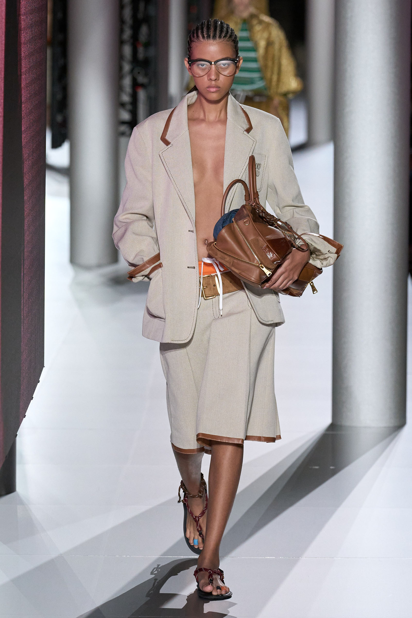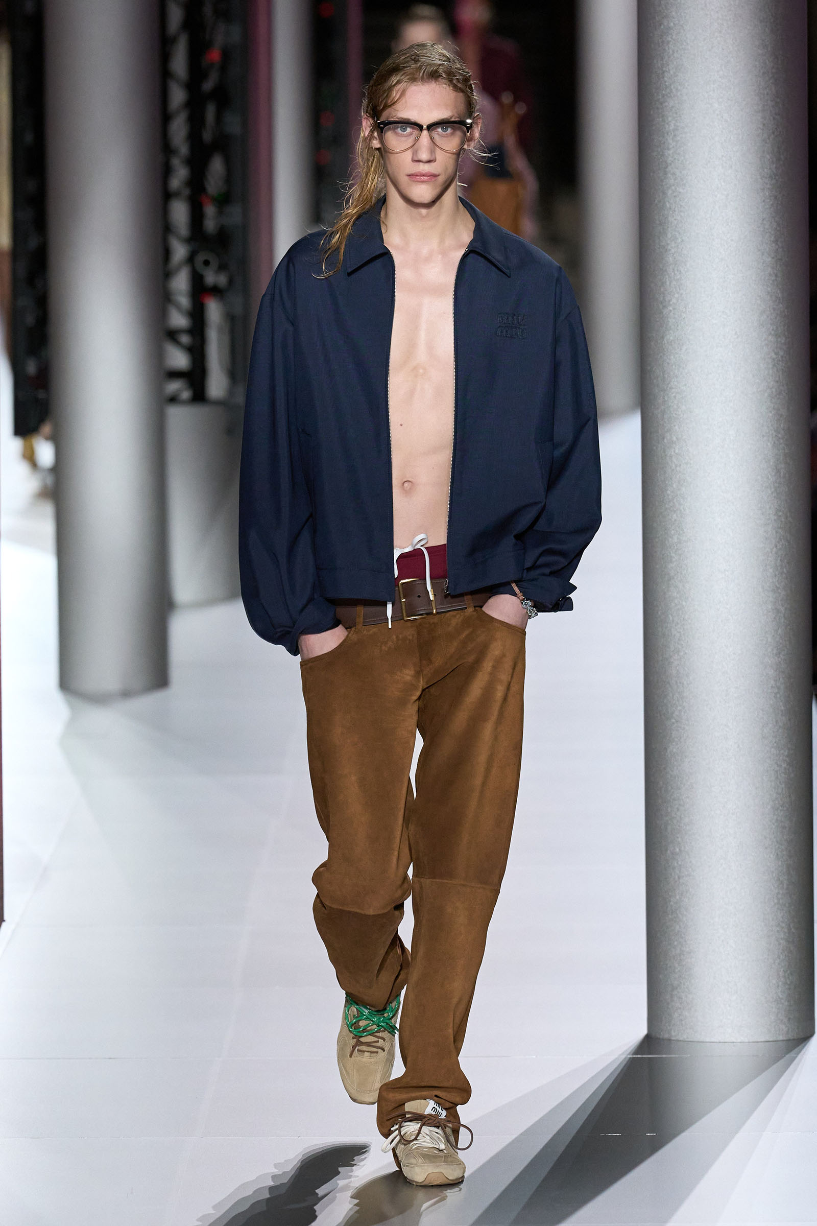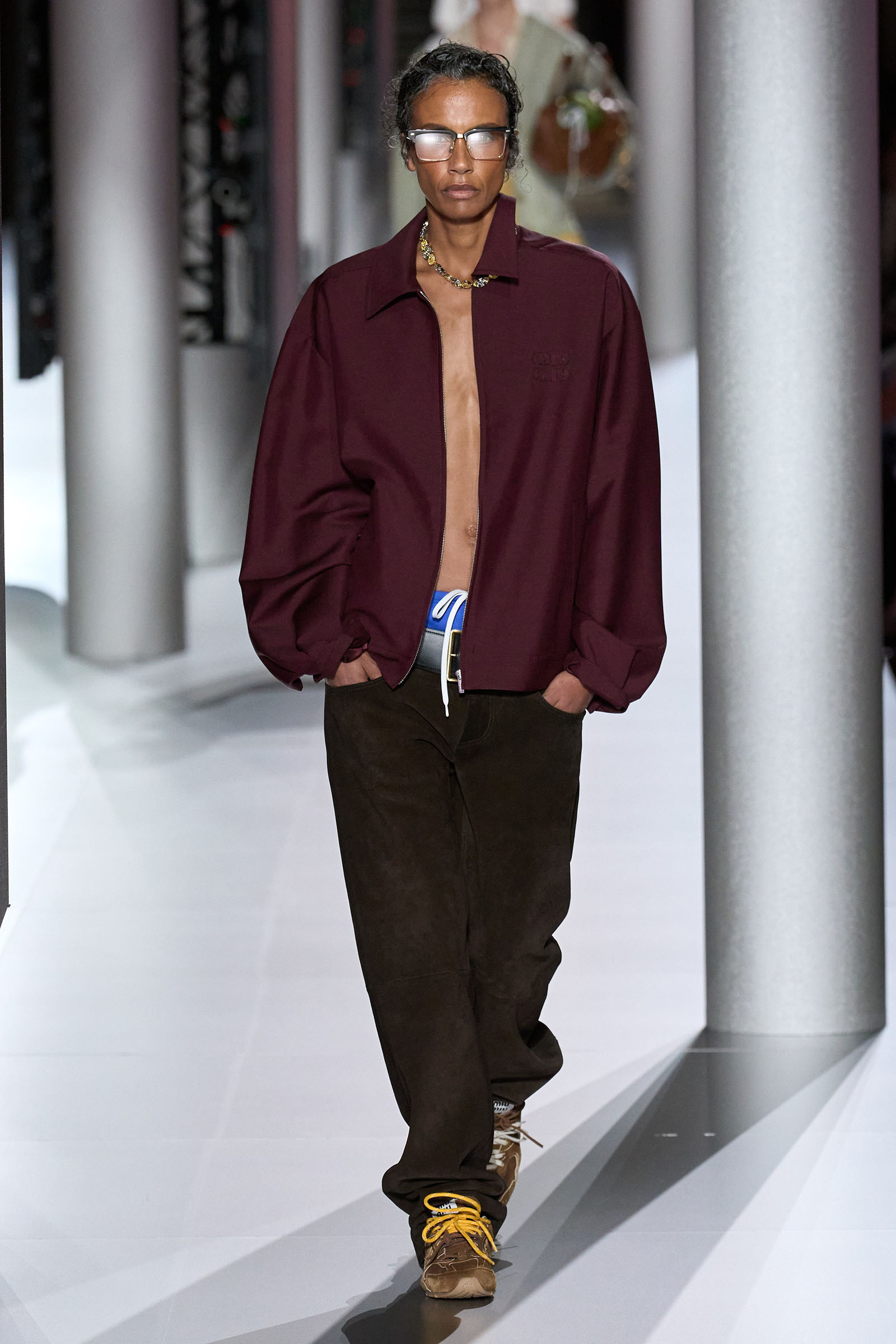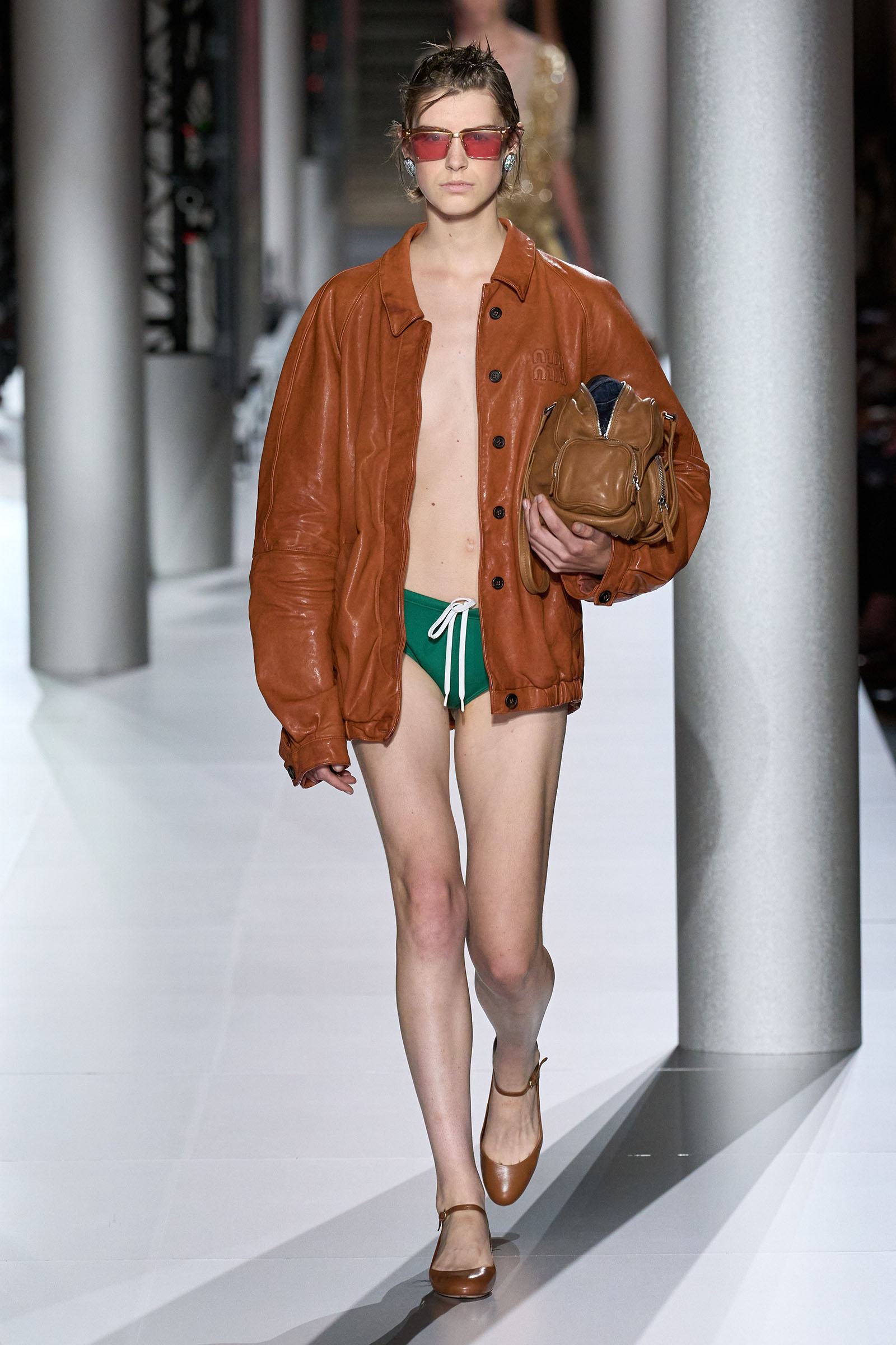 The unconventional combinations of garments—apparently happy accidents of styling—were aimed, Prada communicated in a press release, at an “embracing of unique characters, the joy of life.” Her bespectacled Miu Miu characters in action were going about their business dealing with feeling everyday messy (yet also looking great); greasy hair, coats thrown over nighties, sloppy old unbuckled saddle shoes included. Some were lugging handbags stuffed with a change of footwear, as you do.