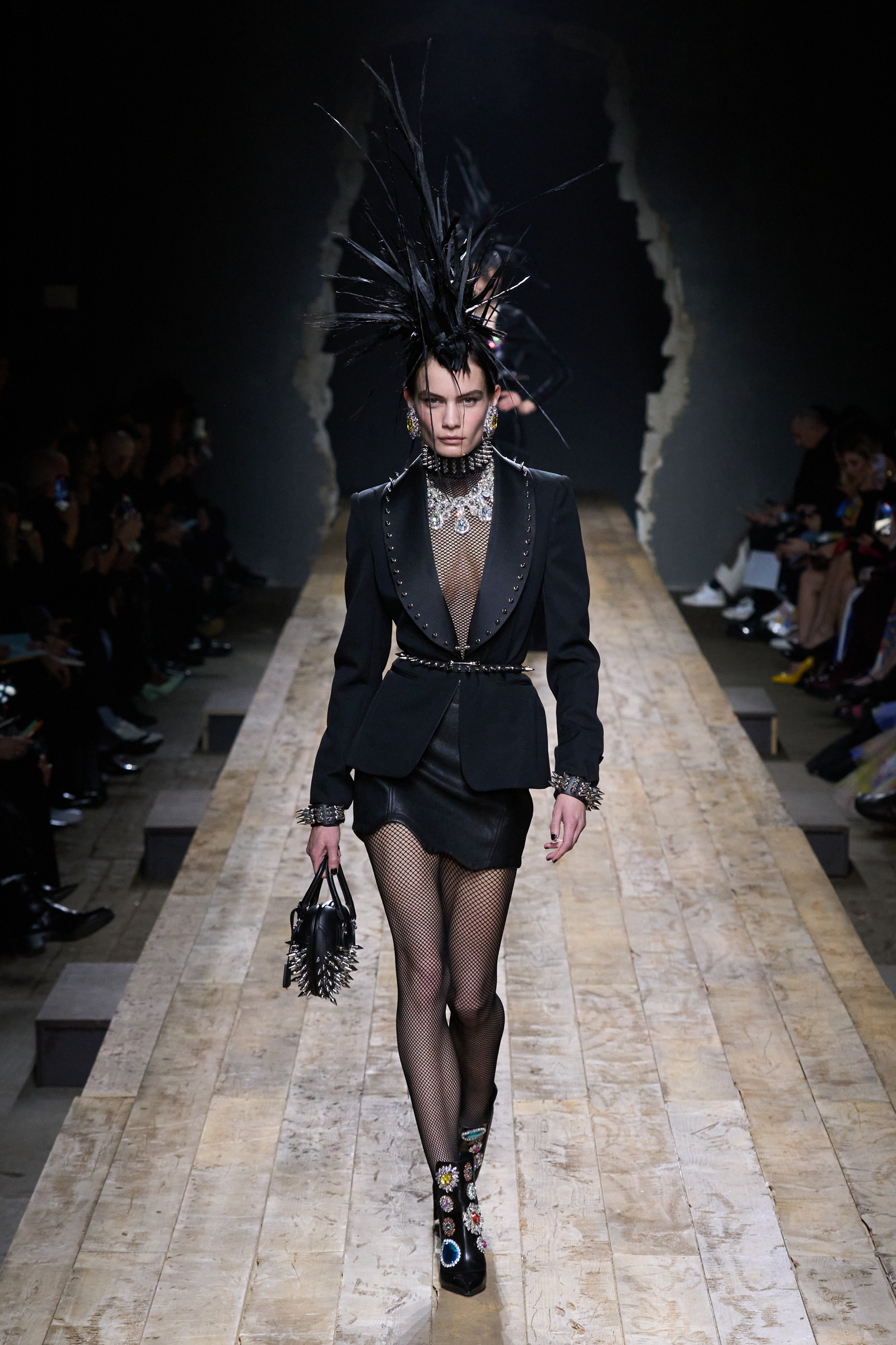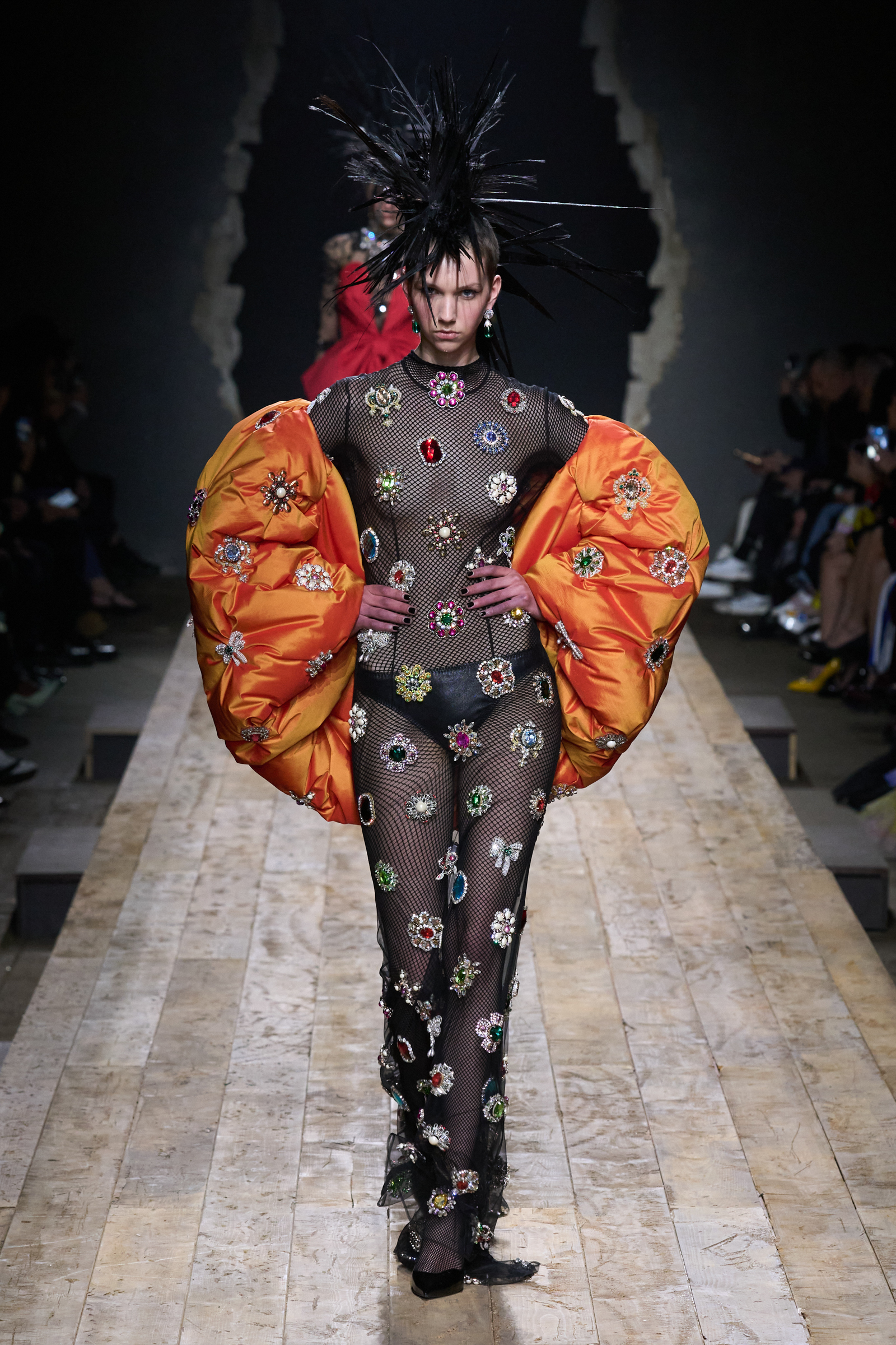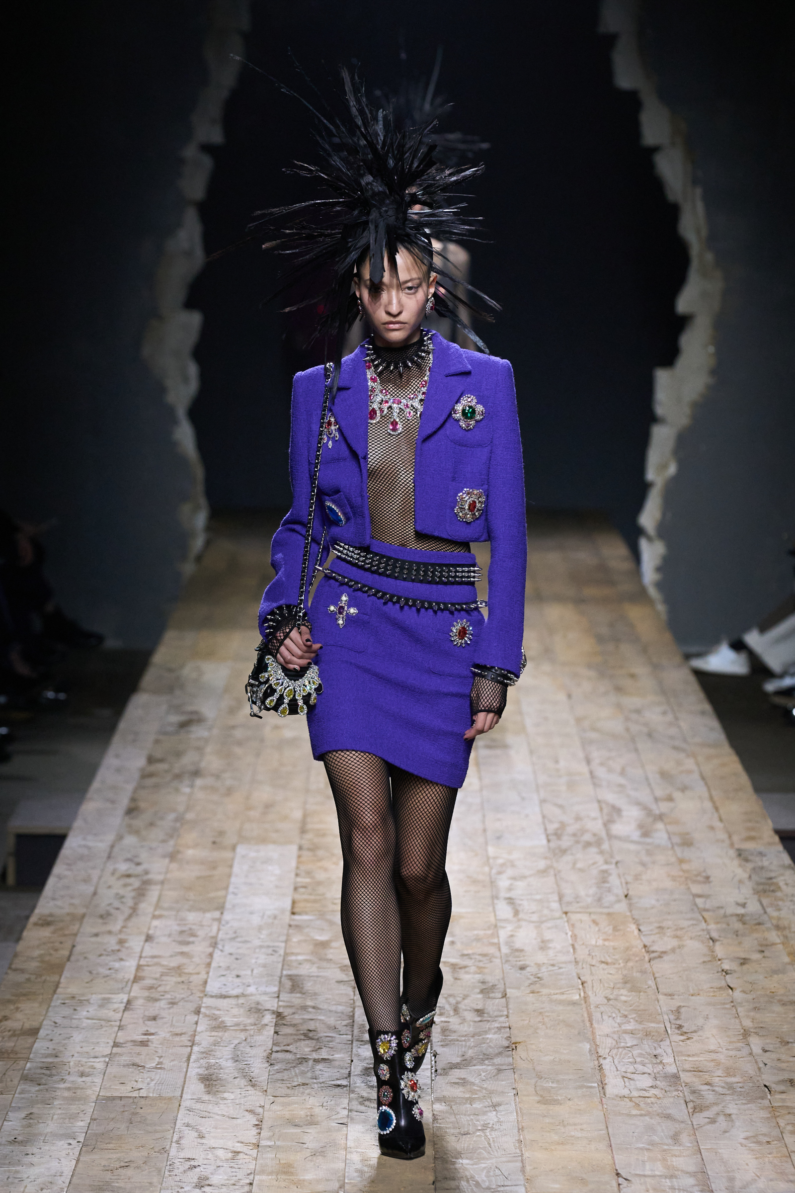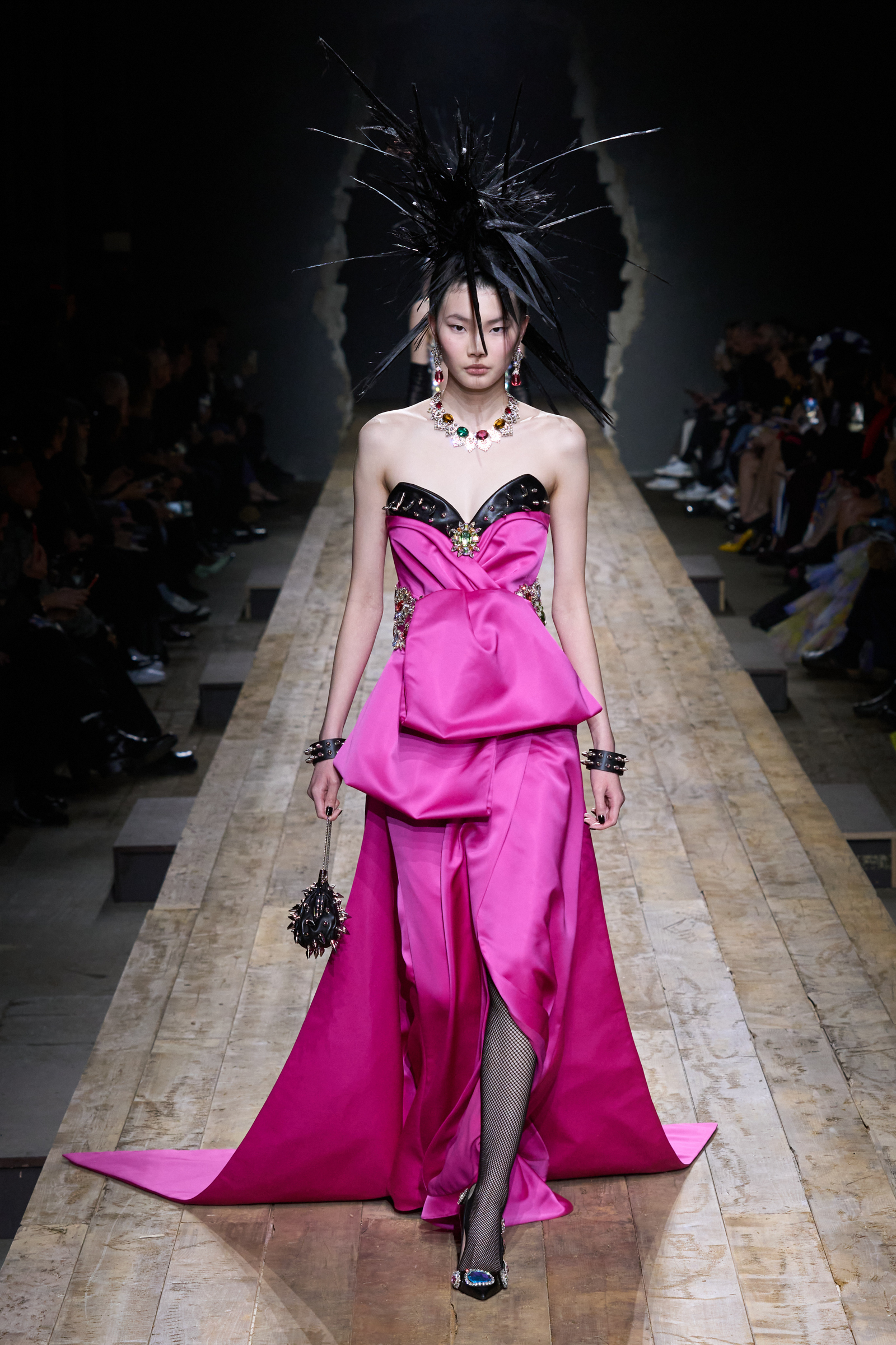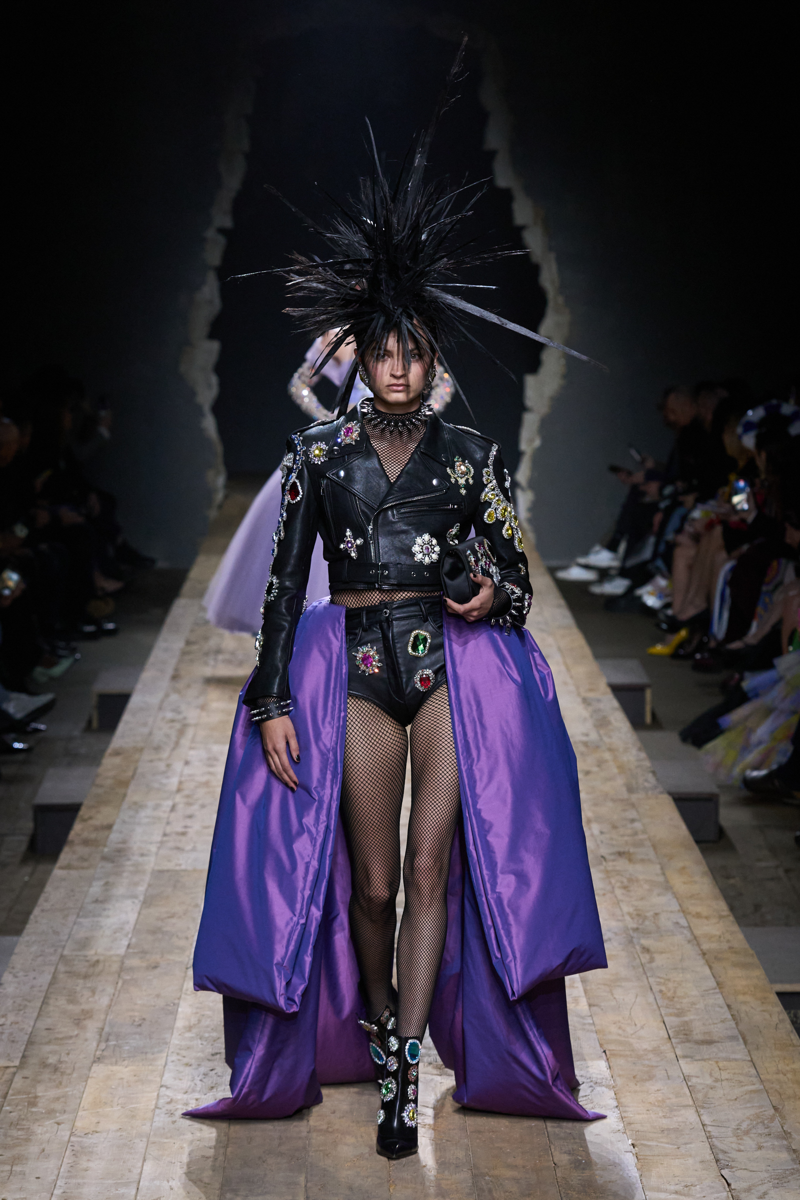 But Scott’s usual gung-ho commitment to a theme didn’t sustain itself. Midway through, the collection switched gears, and the drips were replaced by an aristo-punk vibe featuring large crystal embellishments and even larger metal spikes as motifs. Considering the monster mohawk hairpieces the models wore, it might’ve been a nod in Vivienne Westwood’s direction—we’ve seen other tributes to the late Dame Viv lately—but then again, maybe not. It’s a testament to the meaningful fun that’s usually had at Scott’s Moschino shows that this one didn’t entirely meet the moment.