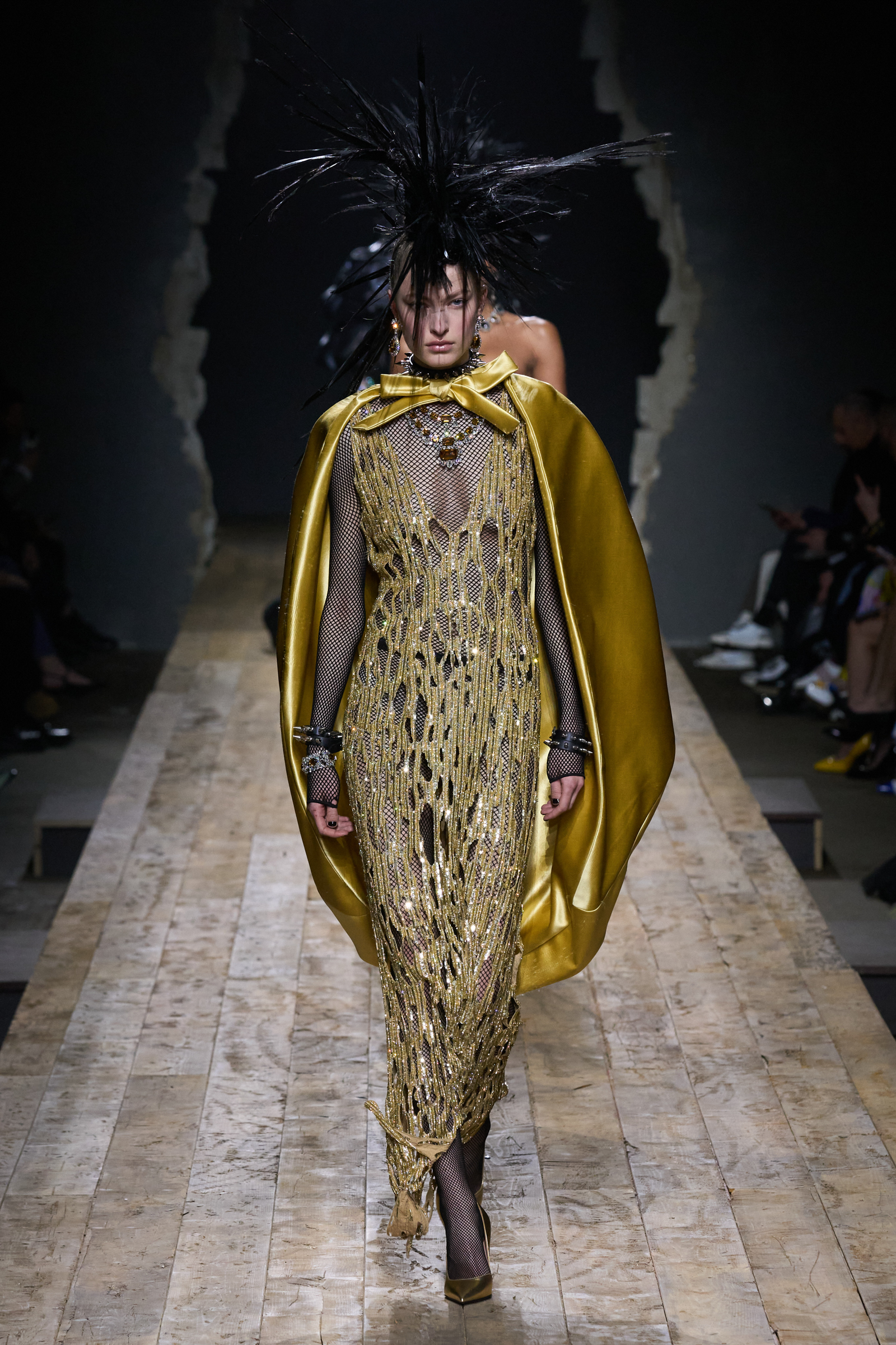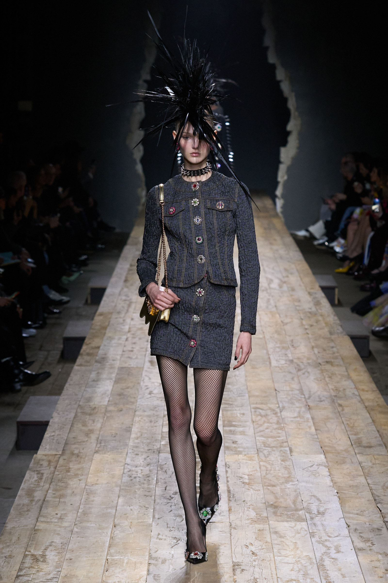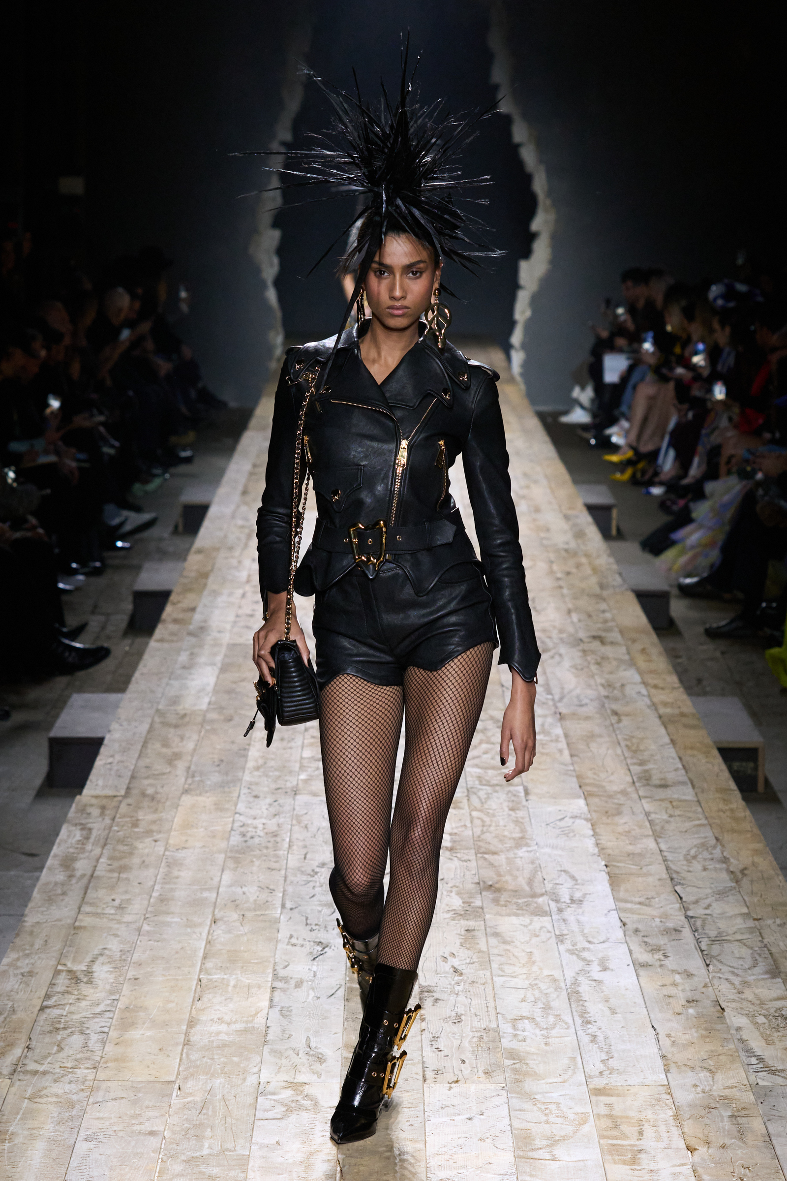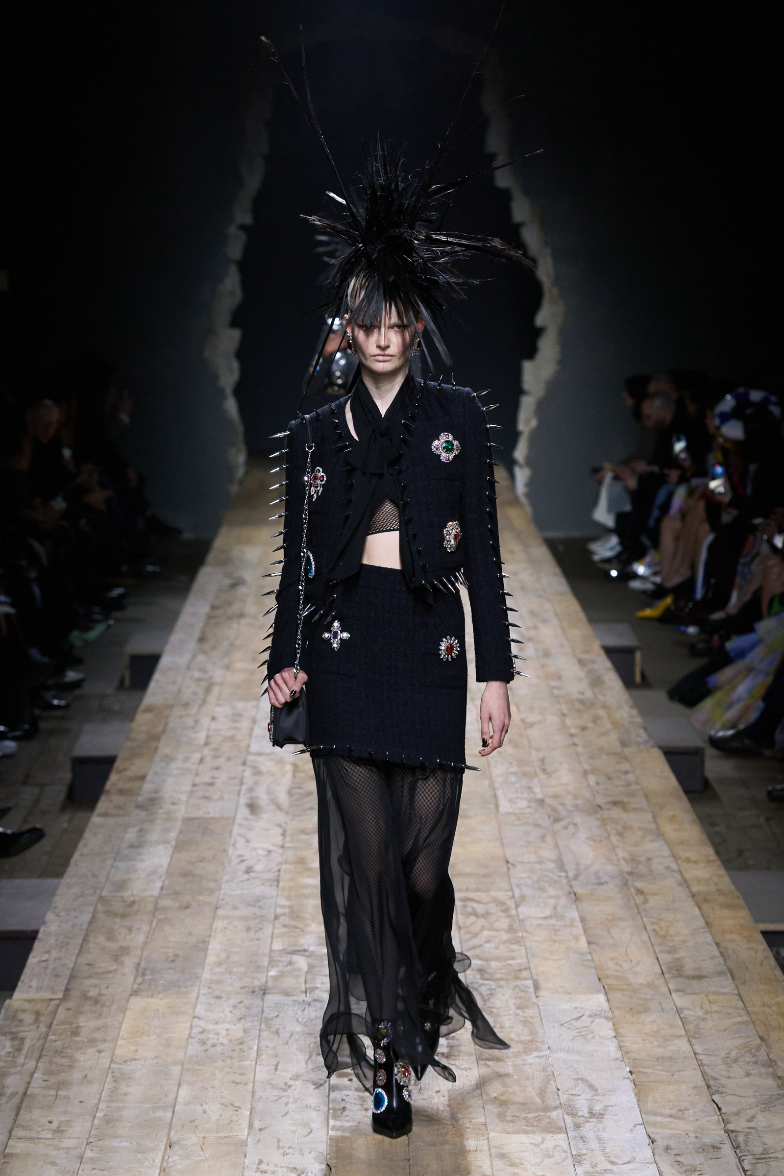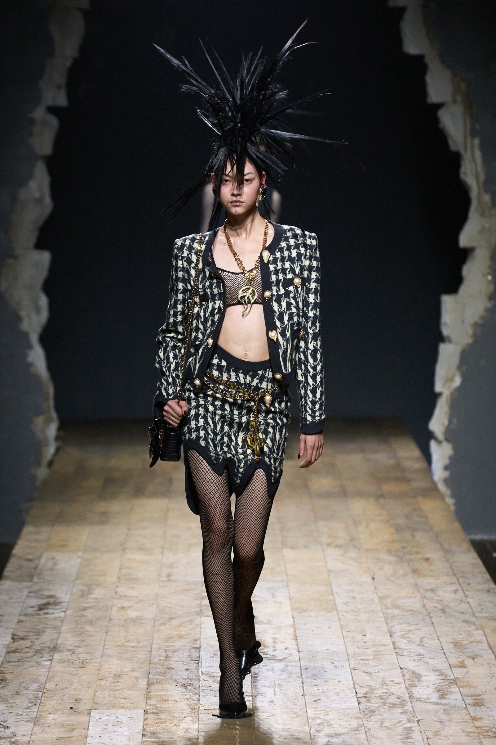But Scott’s usual gung-ho commitment to a theme didn’t sustain itself. Midway through, the collection switched gears, and the drips were replaced by an aristo-punk vibe featuring large crystal embellishments and even larger metal spikes as motifs. Considering the monster mohawk hairpieces the models wore, it might’ve been a nod in Vivienne Westwood’s direction—we’ve seen other tributes to the late Dame Viv lately—but then again, maybe not. It’s a testament to the meaningful fun that’s usually had at Scott’s Moschino shows that this one didn’t entirely meet the moment.