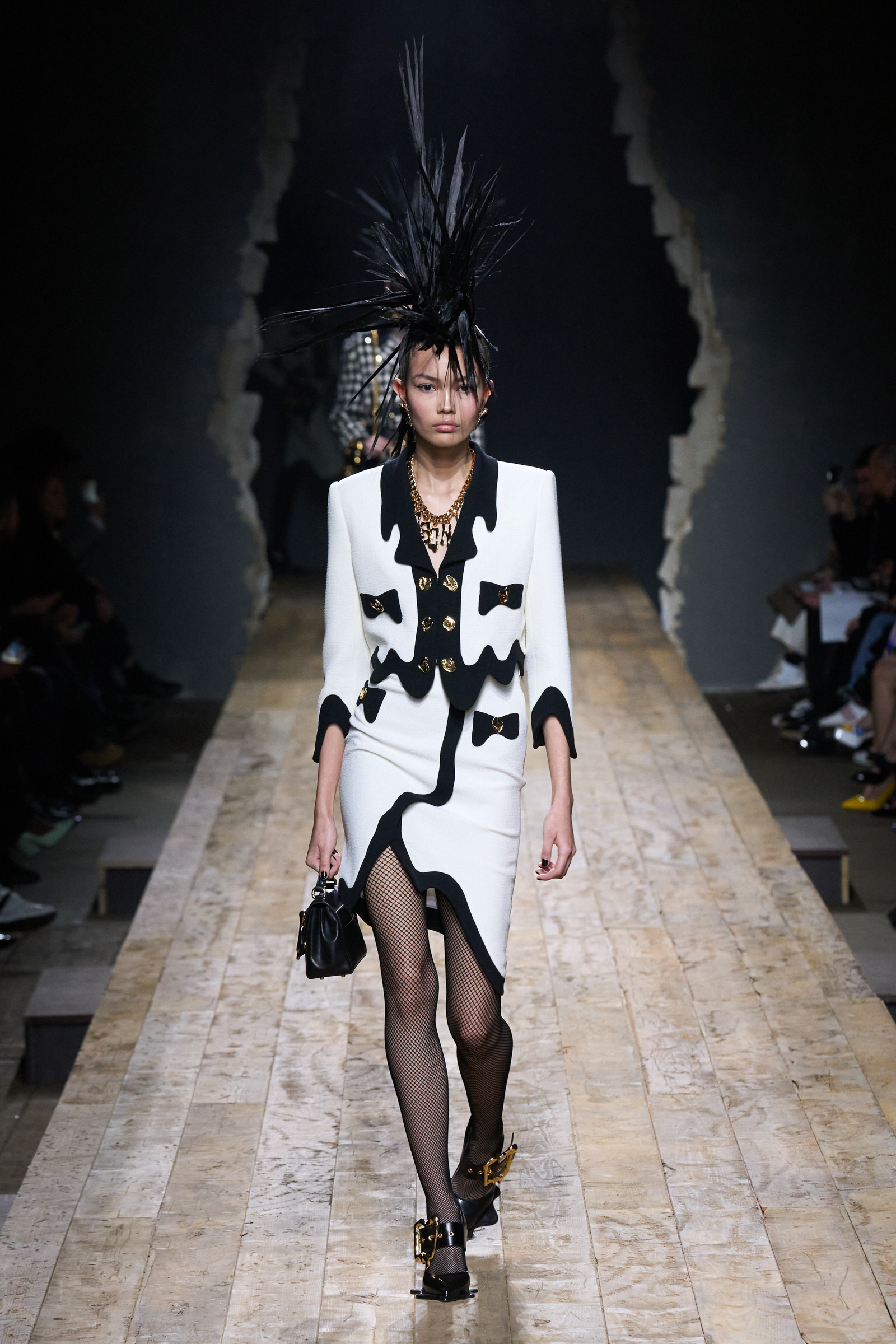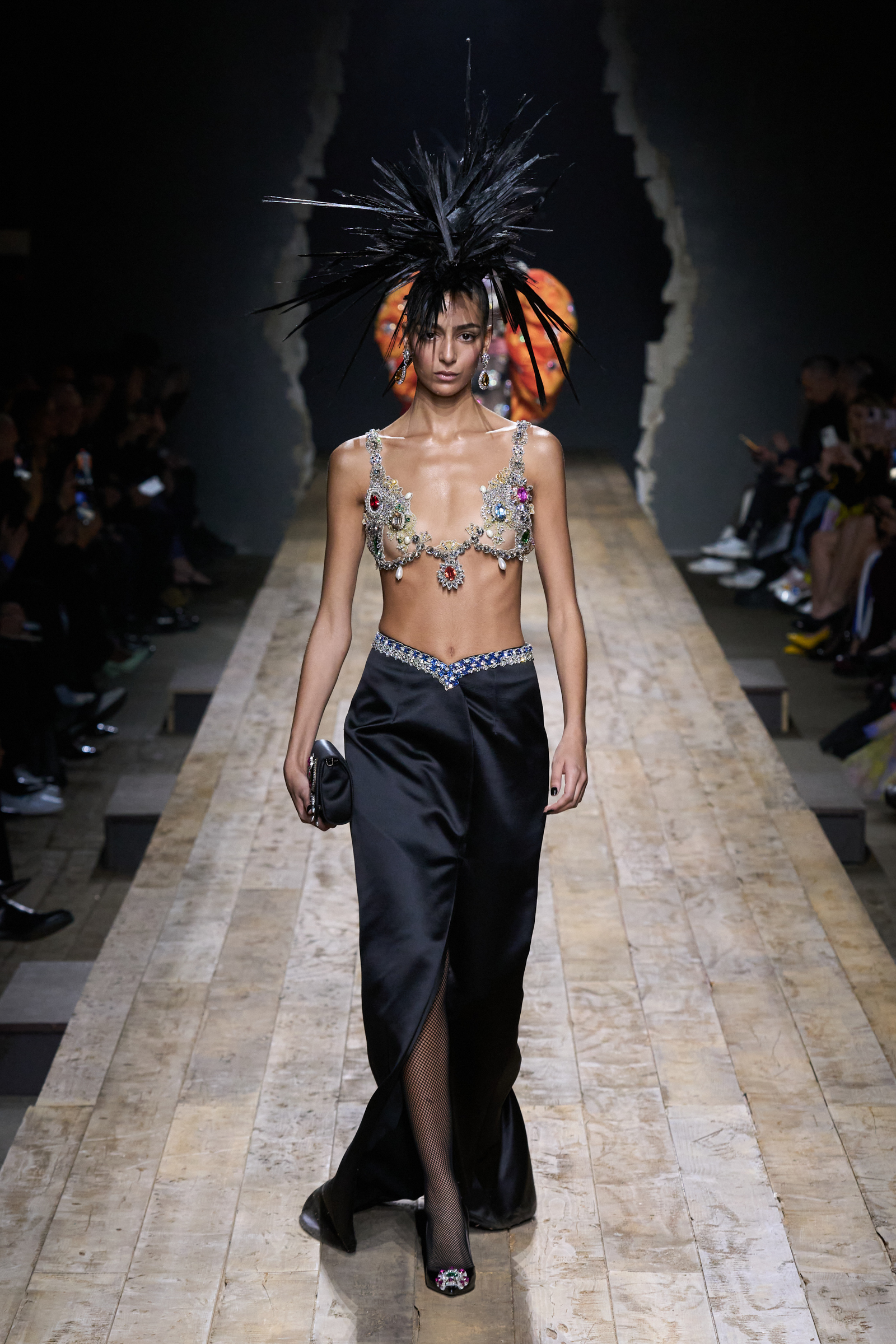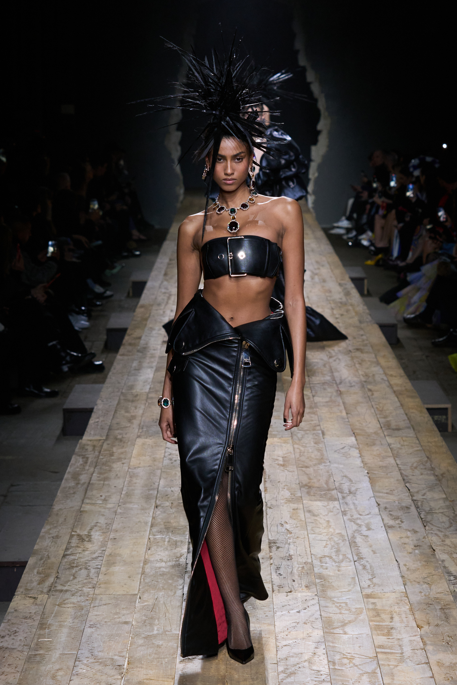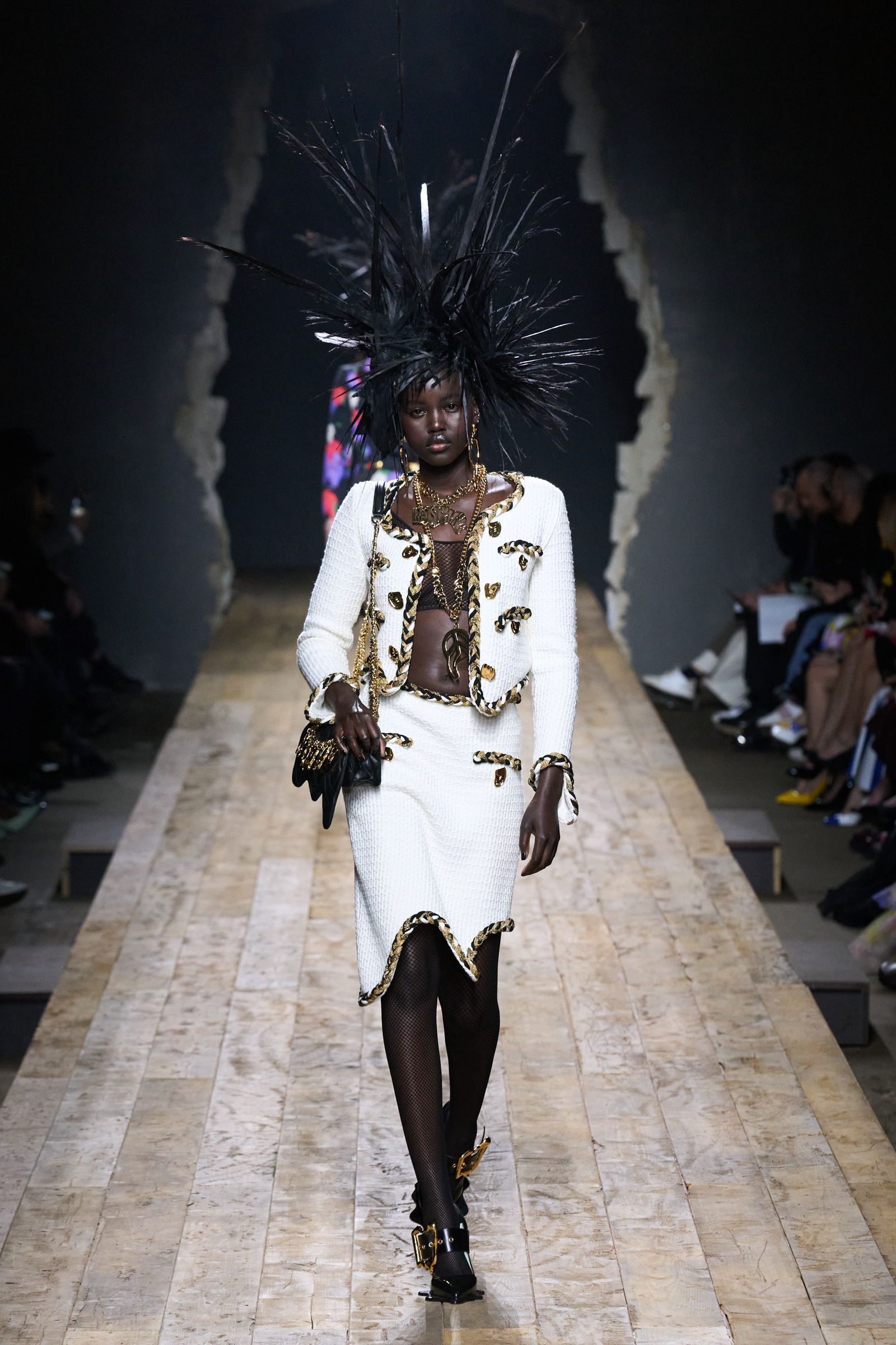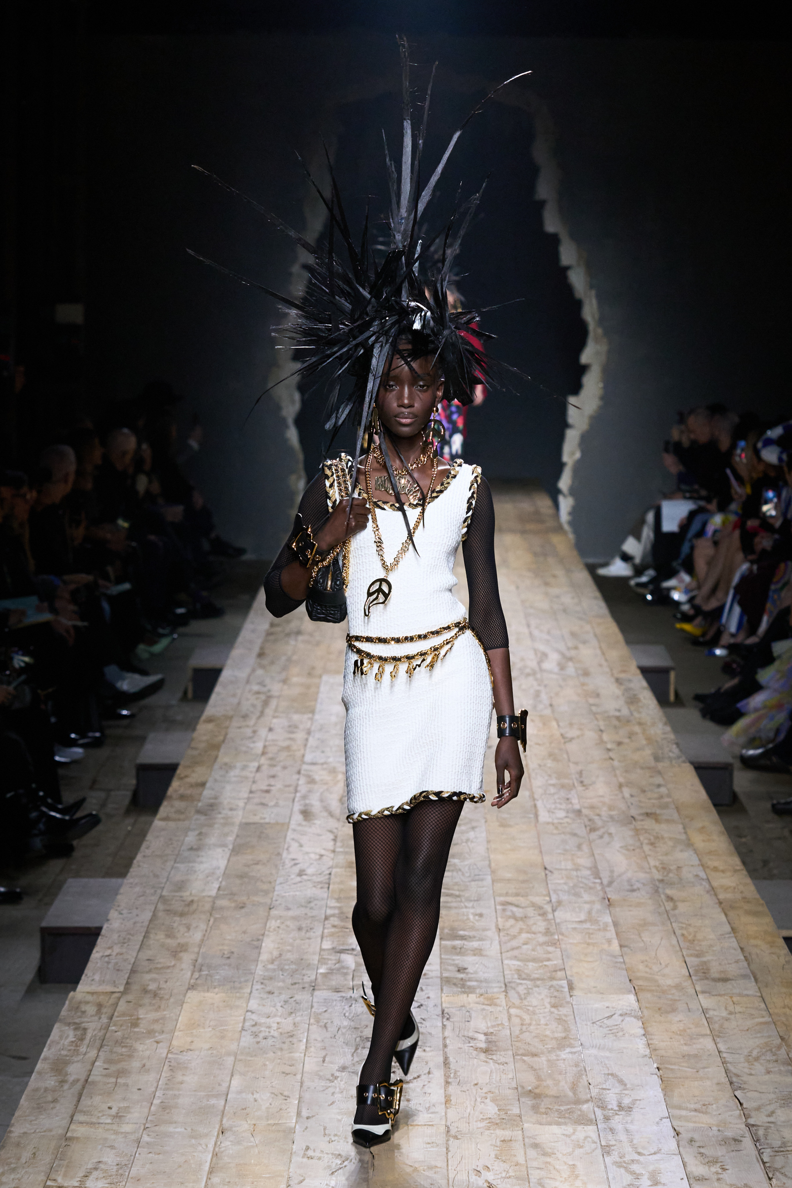But Scott’s usual gung-ho commitment to a theme didn’t sustain itself. Midway through, the collection switched gears, and the drips were replaced by an aristo-punk vibe featuring large crystal embellishments and even larger metal spikes as motifs. Considering the monster mohawk hairpieces the models wore, it might’ve been a nod in Vivienne Westwood’s direction—we’ve seen other tributes to the late Dame Viv lately—but then again, maybe not. It’s a testament to the meaningful fun that’s usually had at Scott’s Moschino shows that this one didn’t entirely meet the moment.