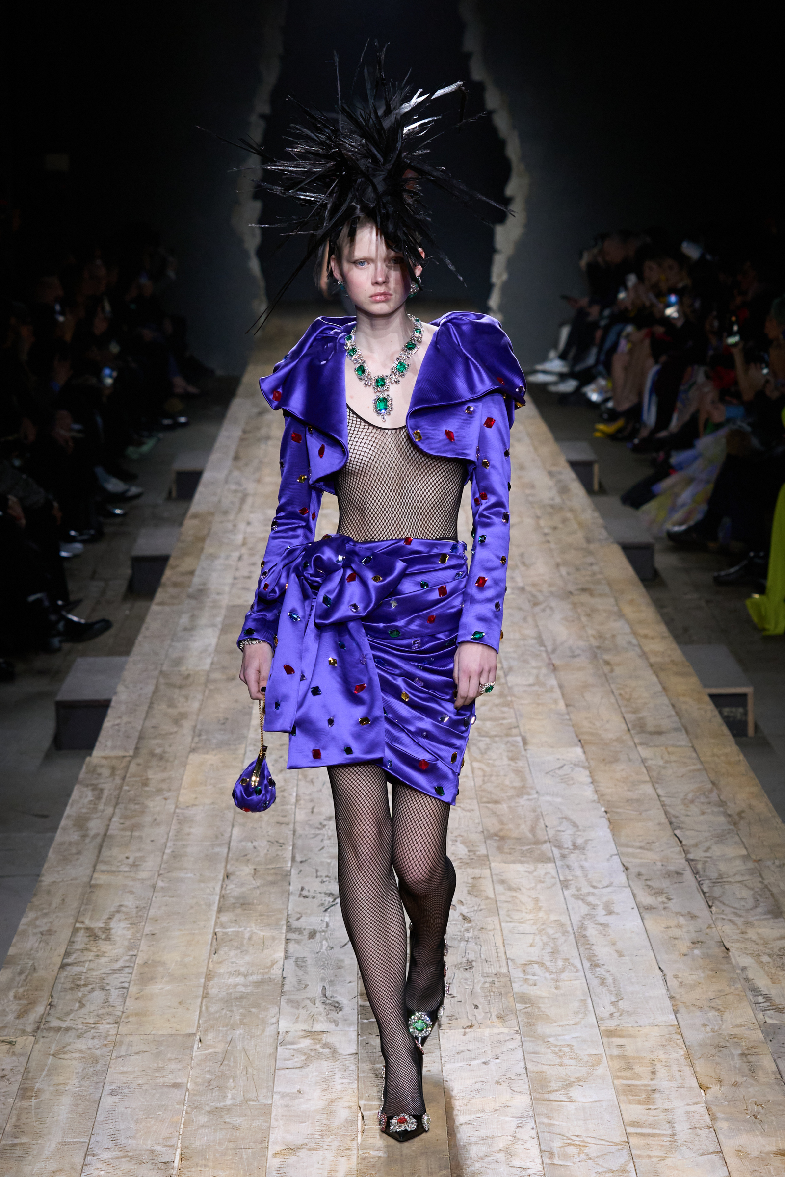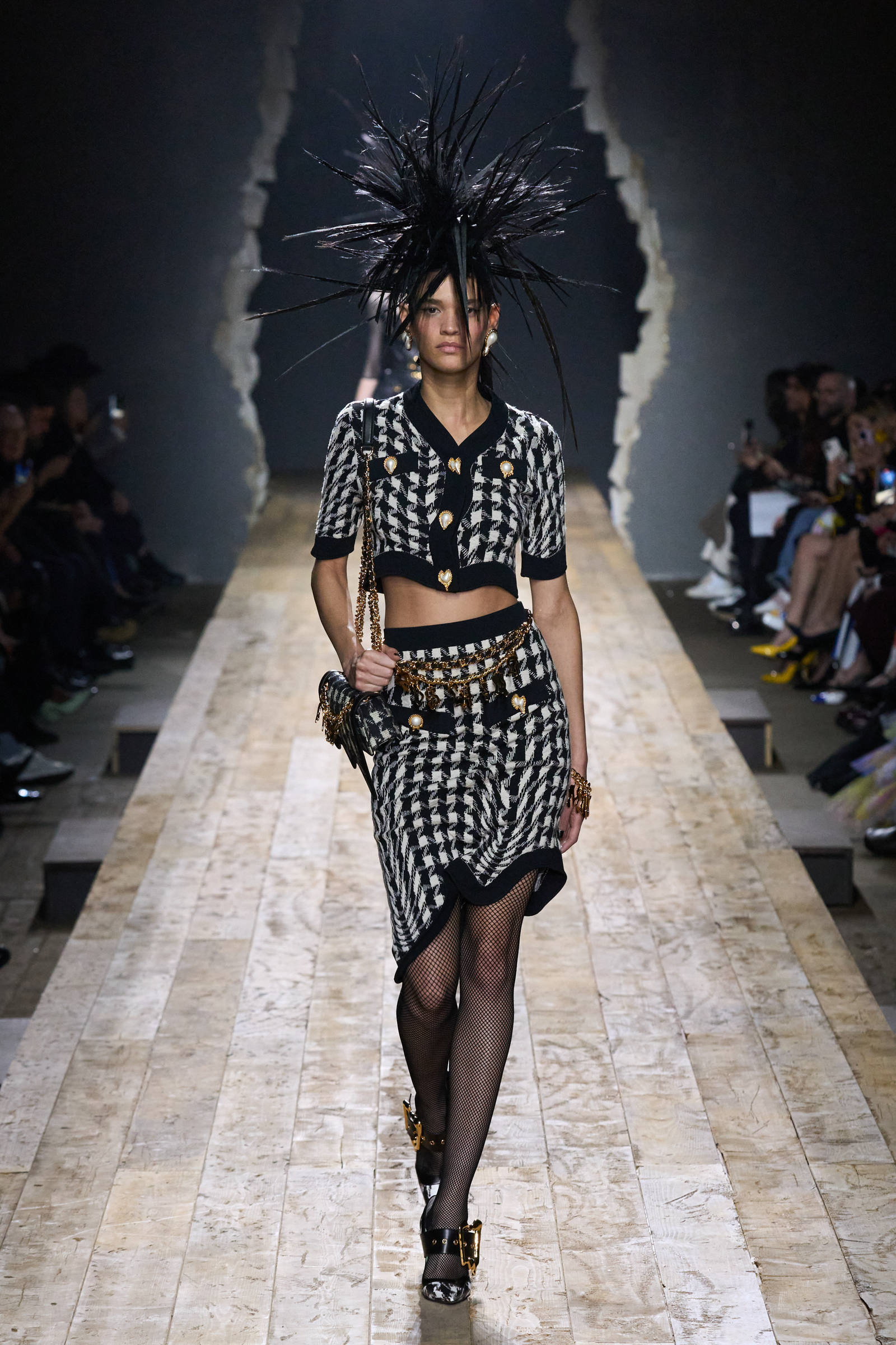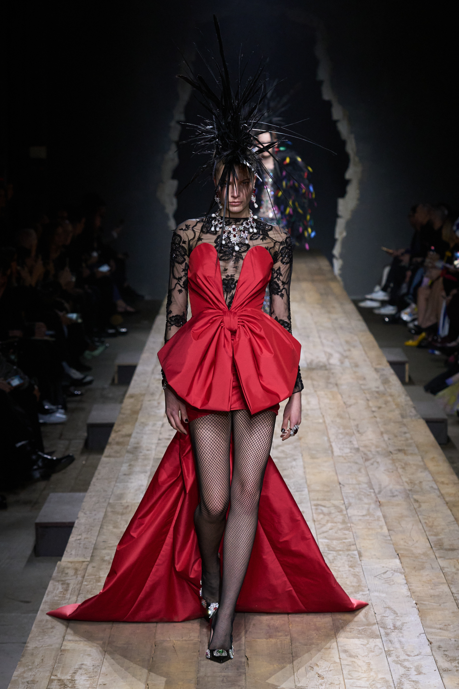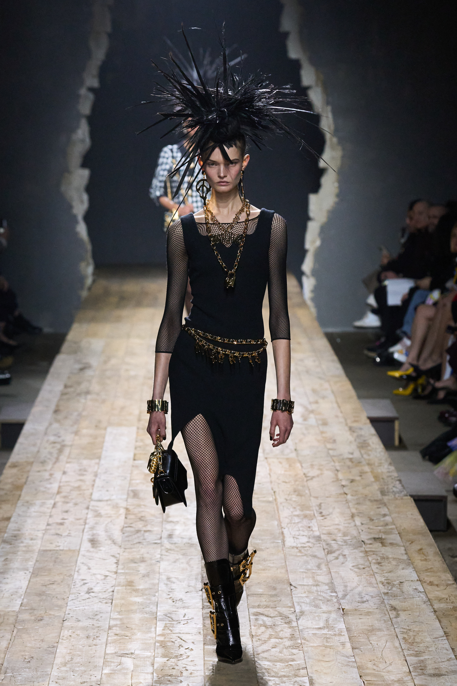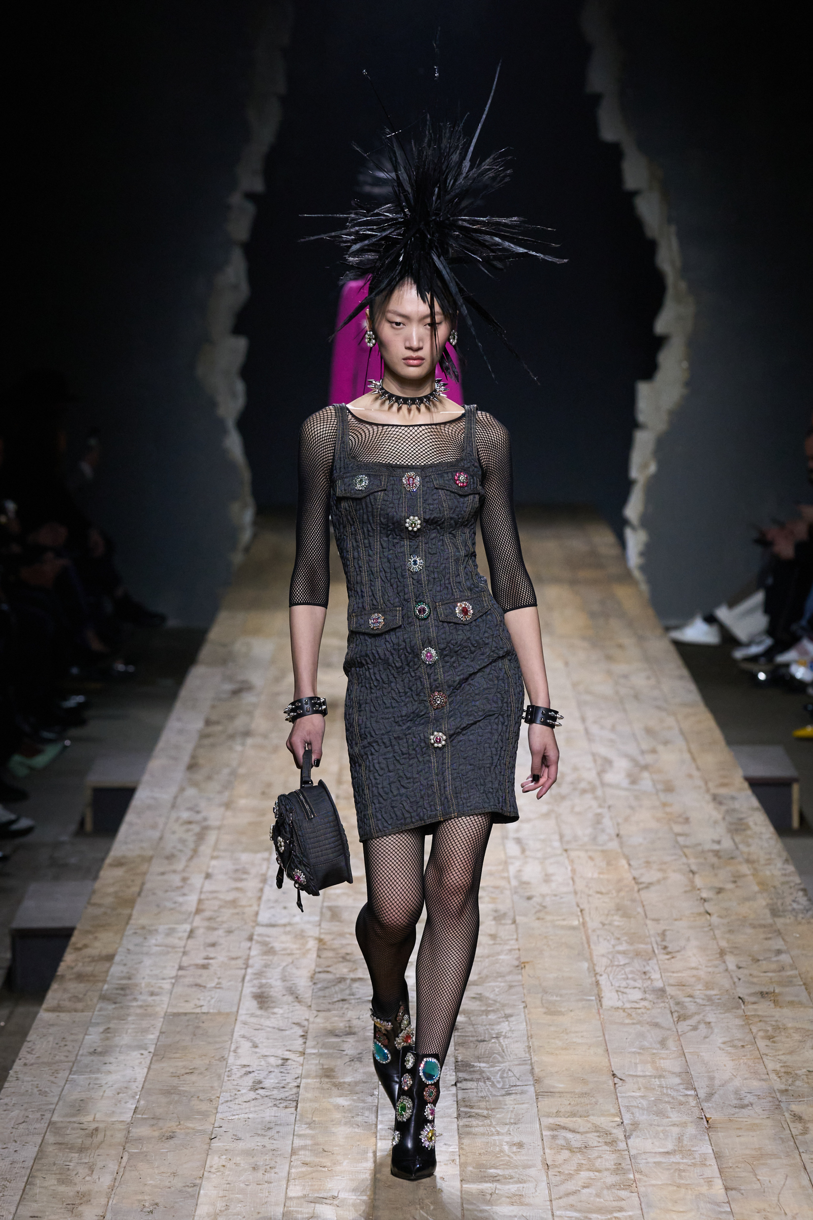 But Scott’s usual gung-ho commitment to a theme didn’t sustain itself. Midway through, the collection switched gears, and the drips were replaced by an aristo-punk vibe featuring large crystal embellishments and even larger metal spikes as motifs. Considering the monster mohawk hairpieces the models wore, it might’ve been a nod in Vivienne Westwood’s direction—we’ve seen other tributes to the late Dame Viv lately—but then again, maybe not. It’s a testament to the meaningful fun that’s usually had at Scott’s Moschino shows that this one didn’t entirely meet the moment.