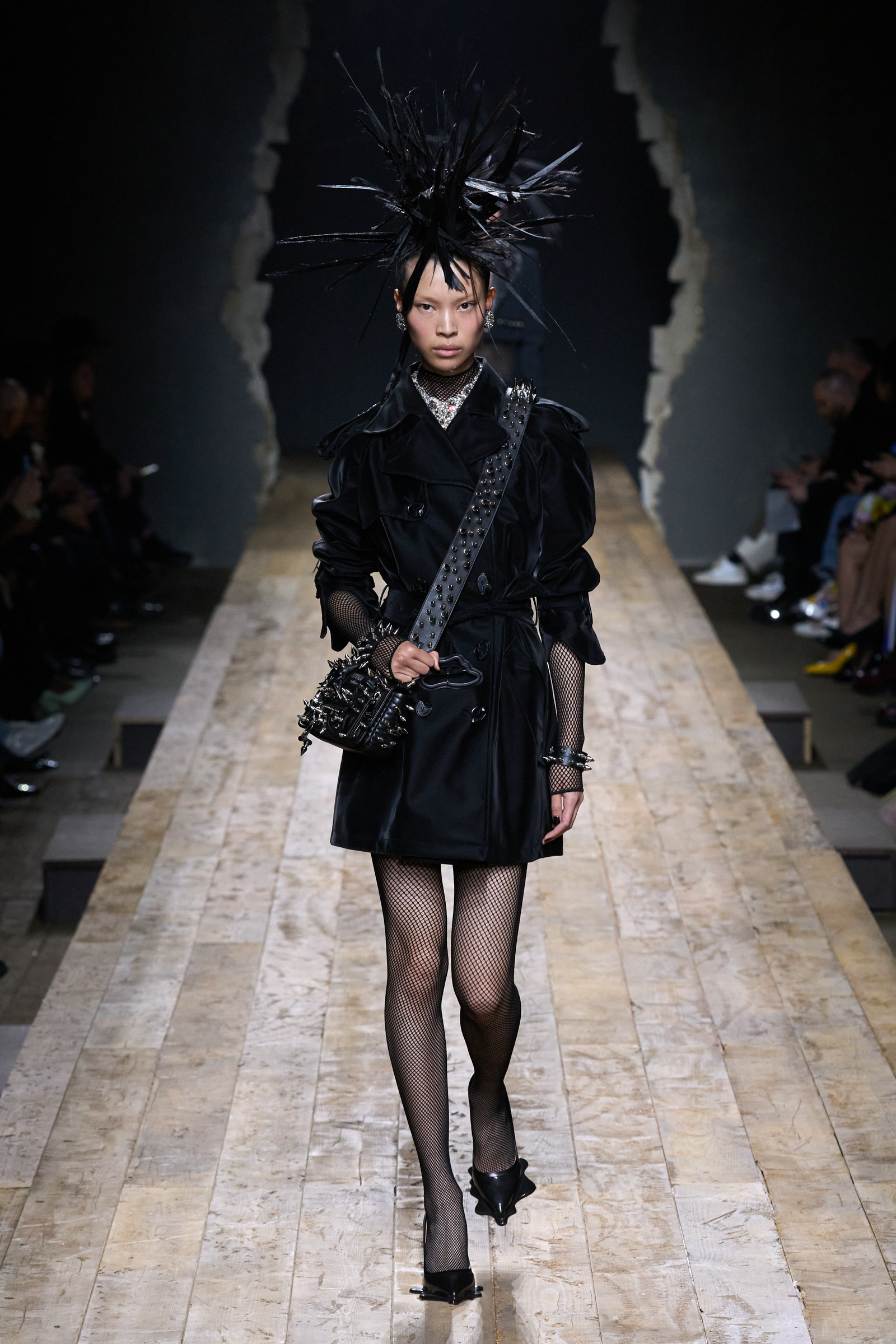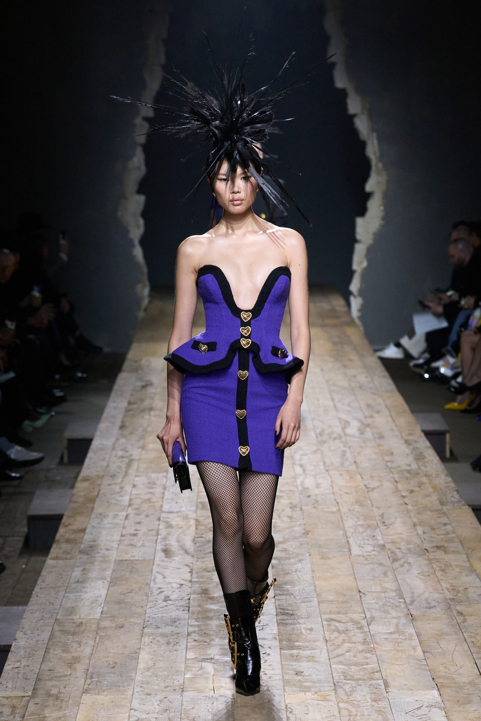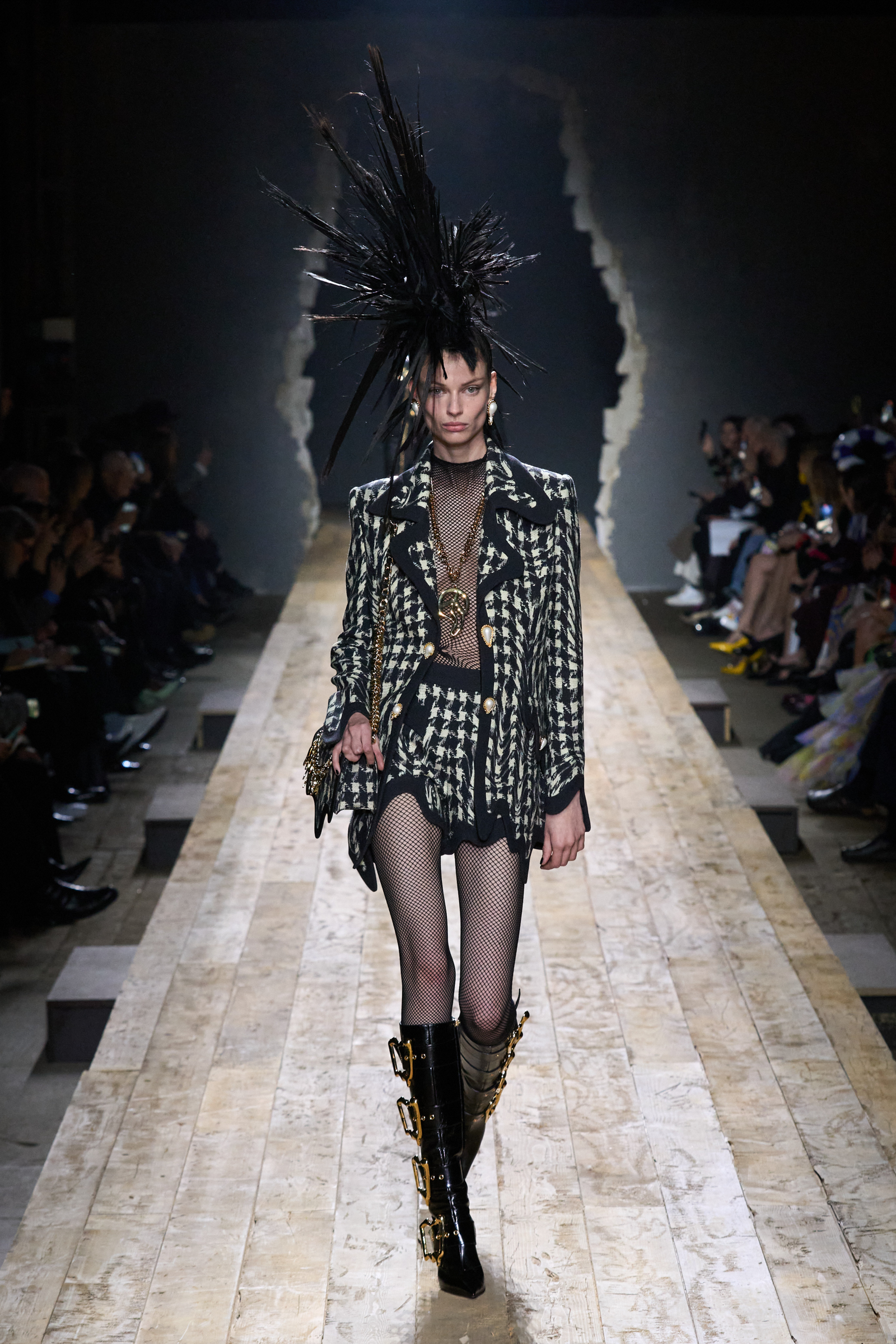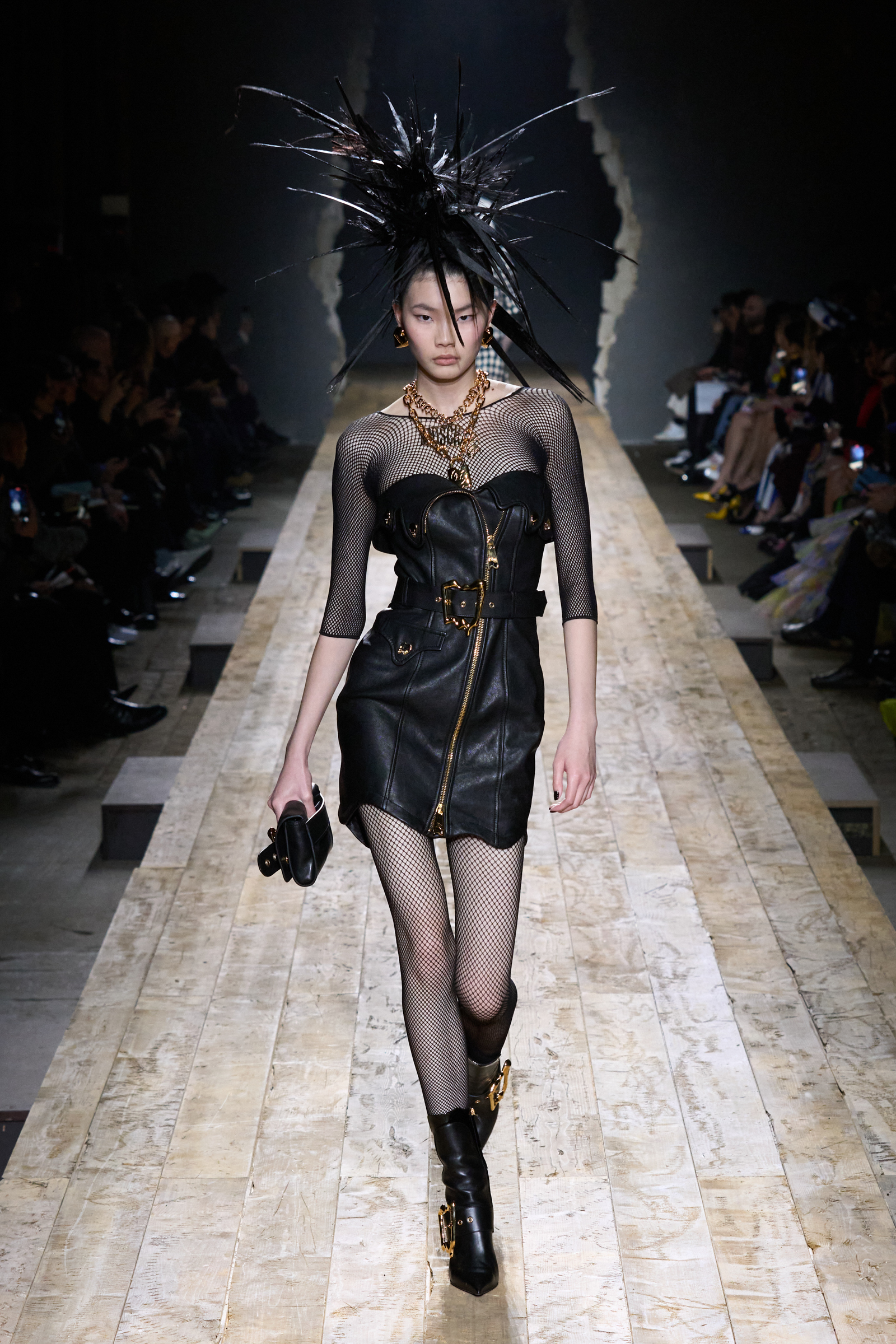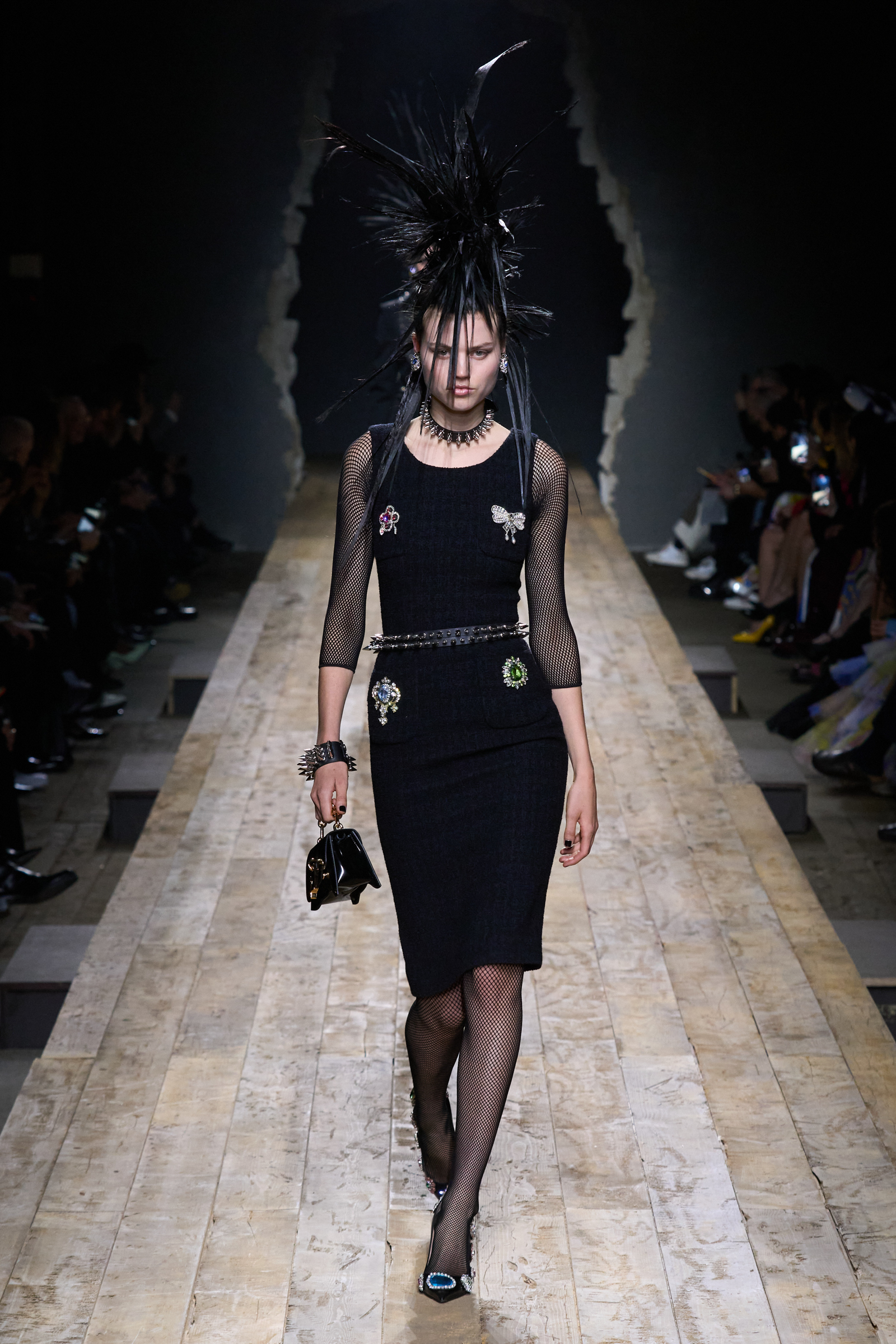 But Scott’s usual gung-ho commitment to a theme didn’t sustain itself. Midway through, the collection switched gears, and the drips were replaced by an aristo-punk vibe featuring large crystal embellishments and even larger metal spikes as motifs. Considering the monster mohawk hairpieces the models wore, it might’ve been a nod in Vivienne Westwood’s direction—we’ve seen other tributes to the late Dame Viv lately—but then again, maybe not. It’s a testament to the meaningful fun that’s usually had at Scott’s Moschino shows that this one didn’t entirely meet the moment.