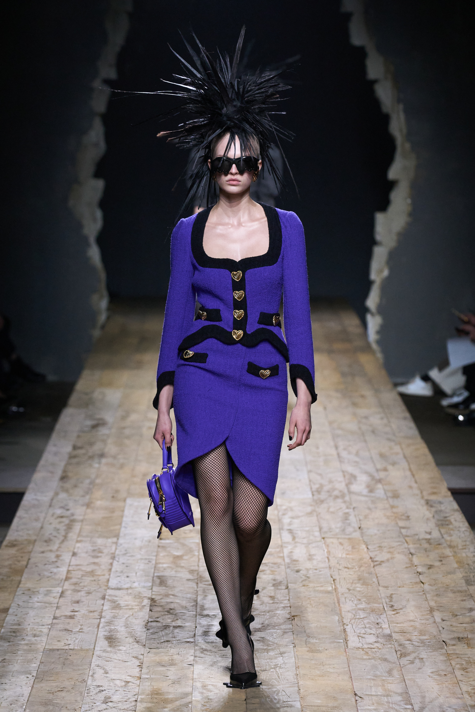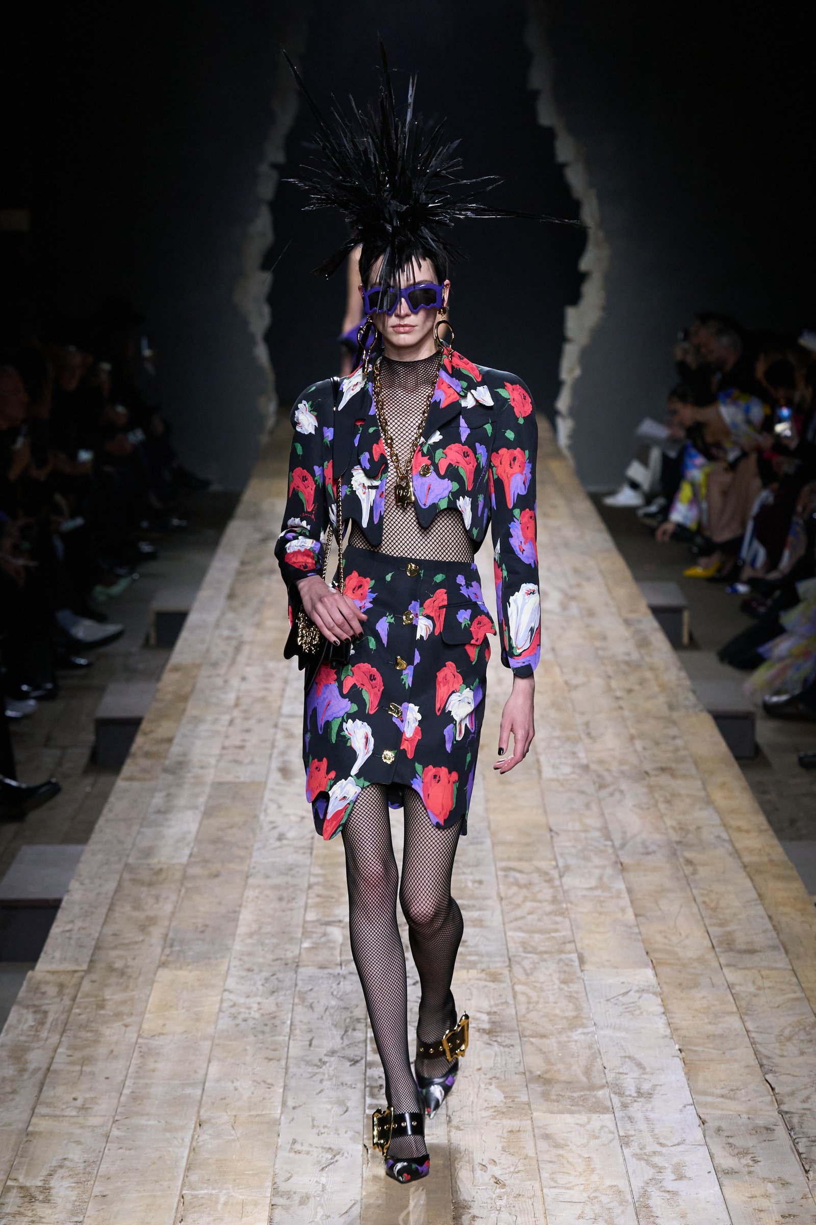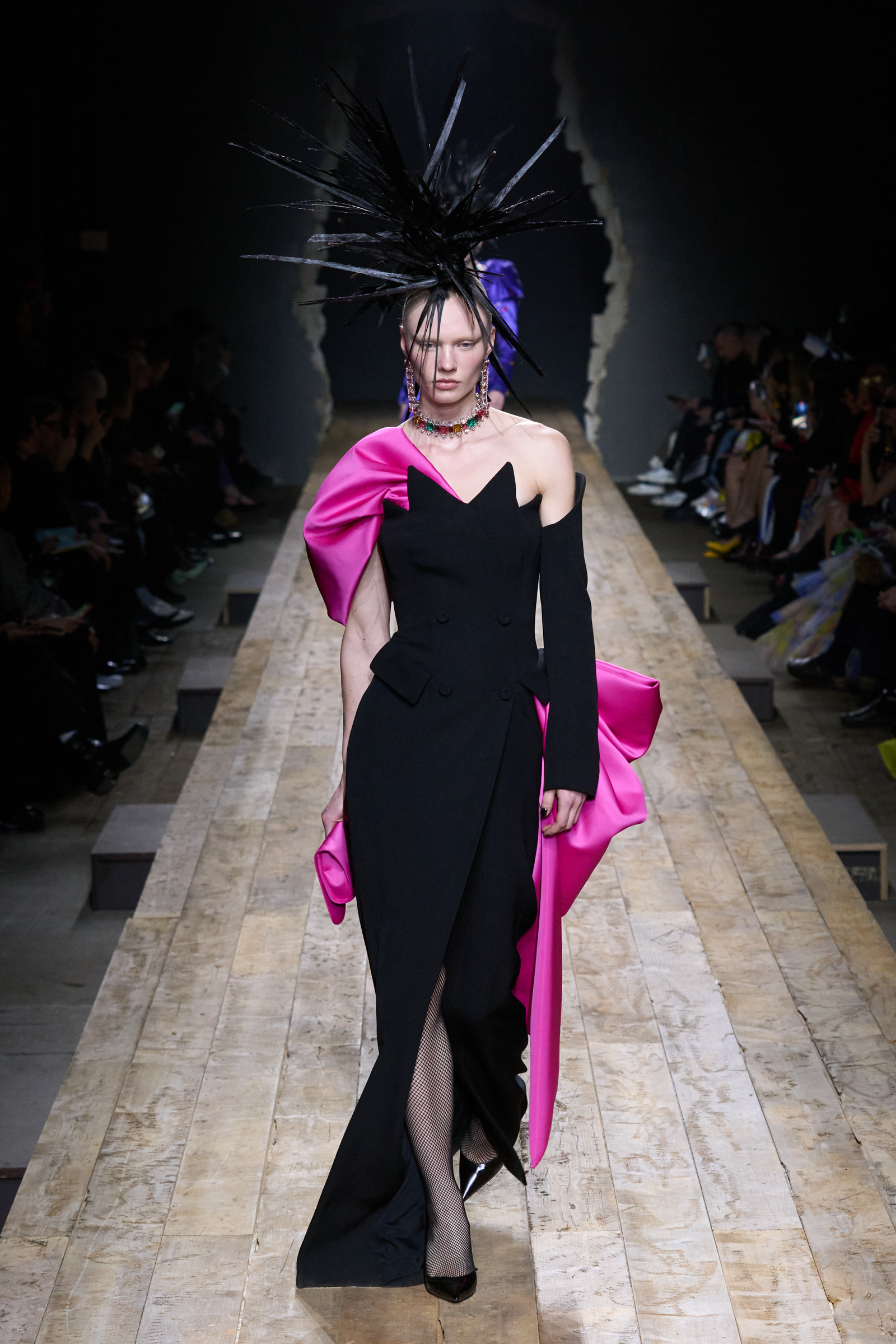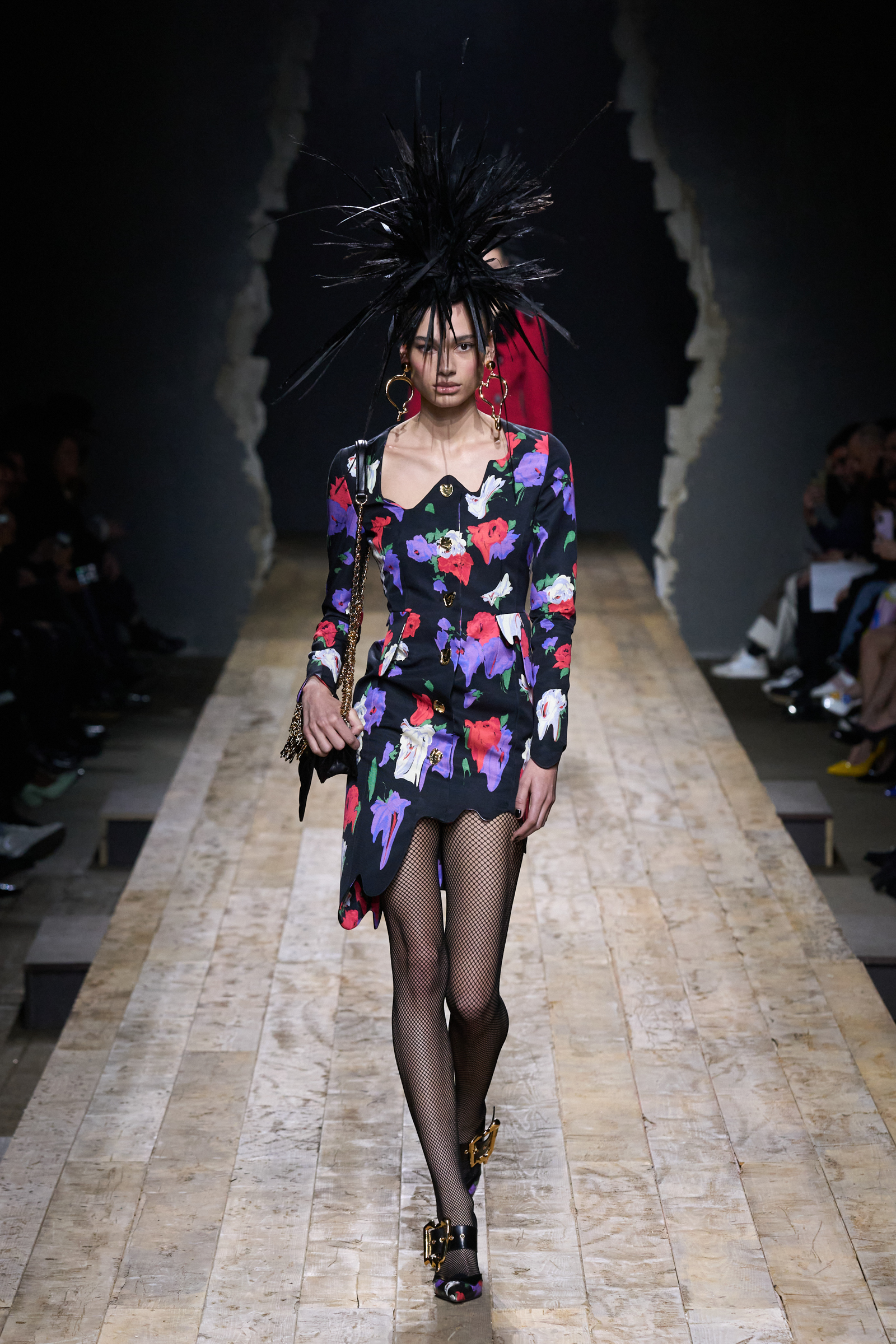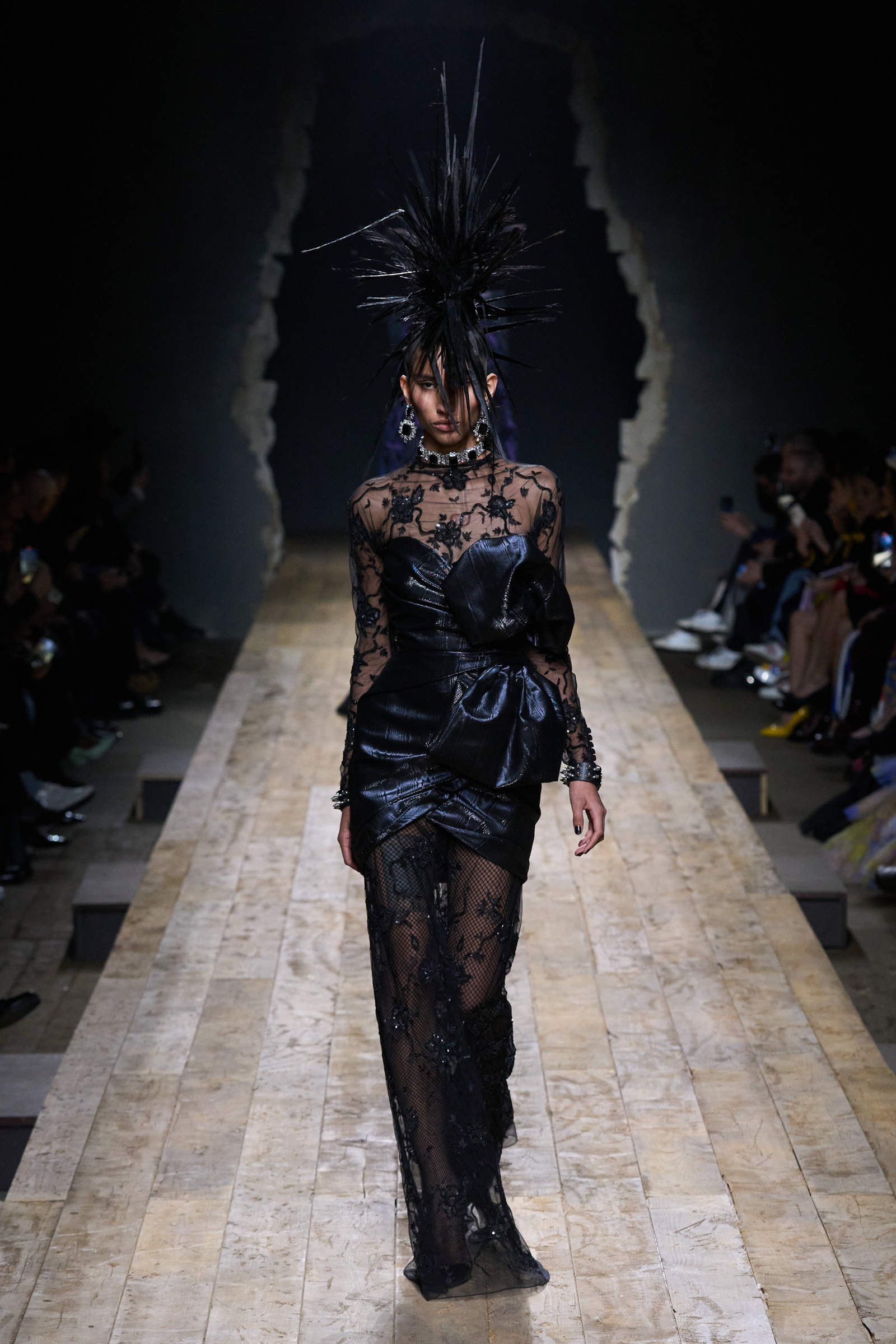 But Scott’s usual gung-ho commitment to a theme didn’t sustain itself. Midway through, the collection switched gears, and the drips were replaced by an aristo-punk vibe featuring large crystal embellishments and even larger metal spikes as motifs. Considering the monster mohawk hairpieces the models wore, it might’ve been a nod in Vivienne Westwood’s direction—we’ve seen other tributes to the late Dame Viv lately—but then again, maybe not. It’s a testament to the meaningful fun that’s usually had at Scott’s Moschino shows that this one didn’t entirely meet the moment.