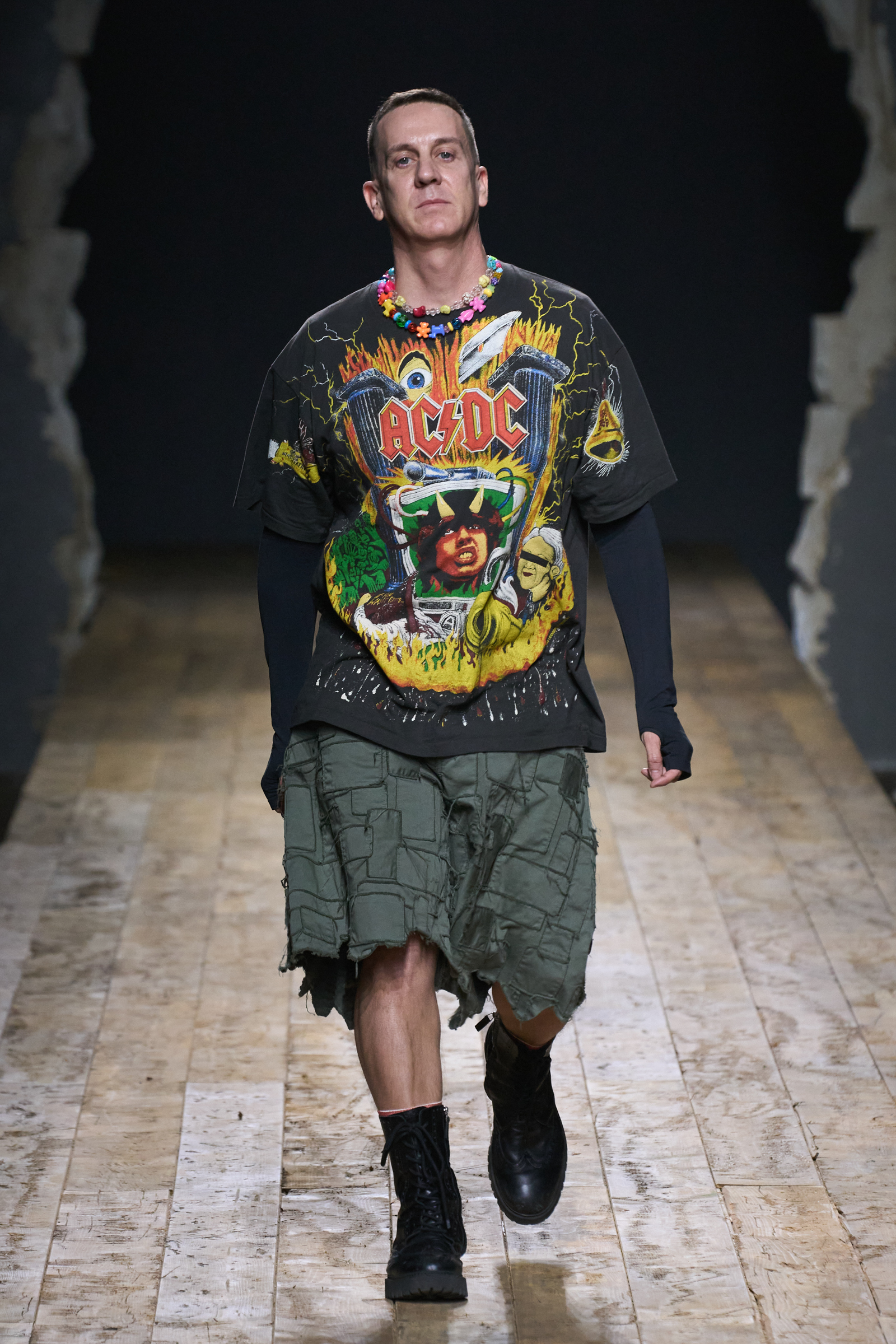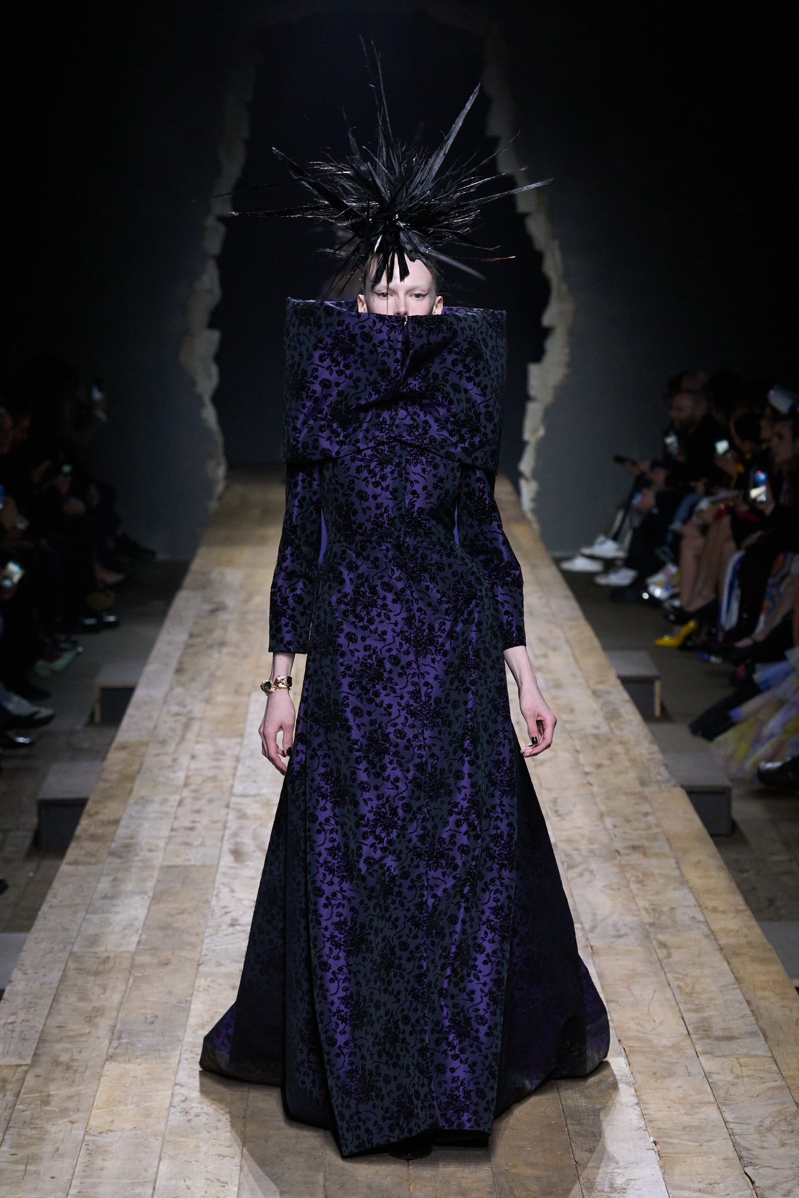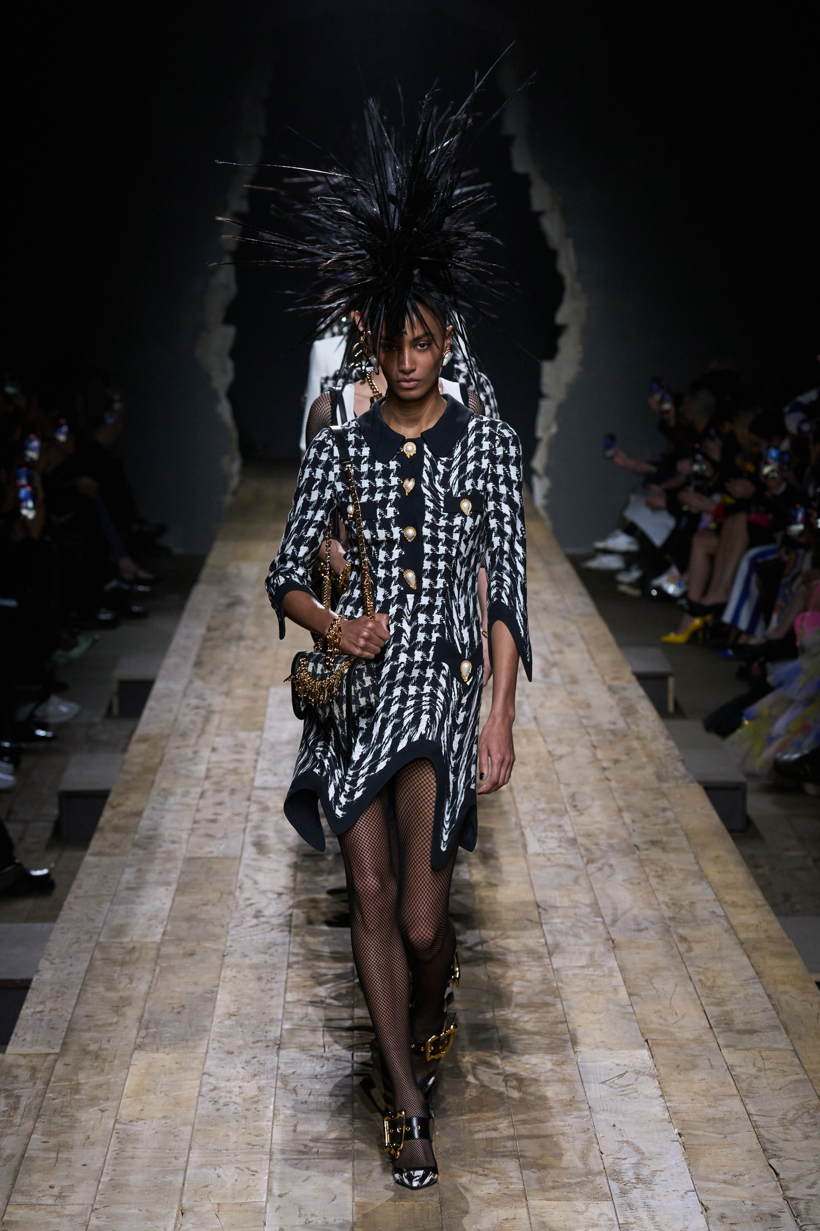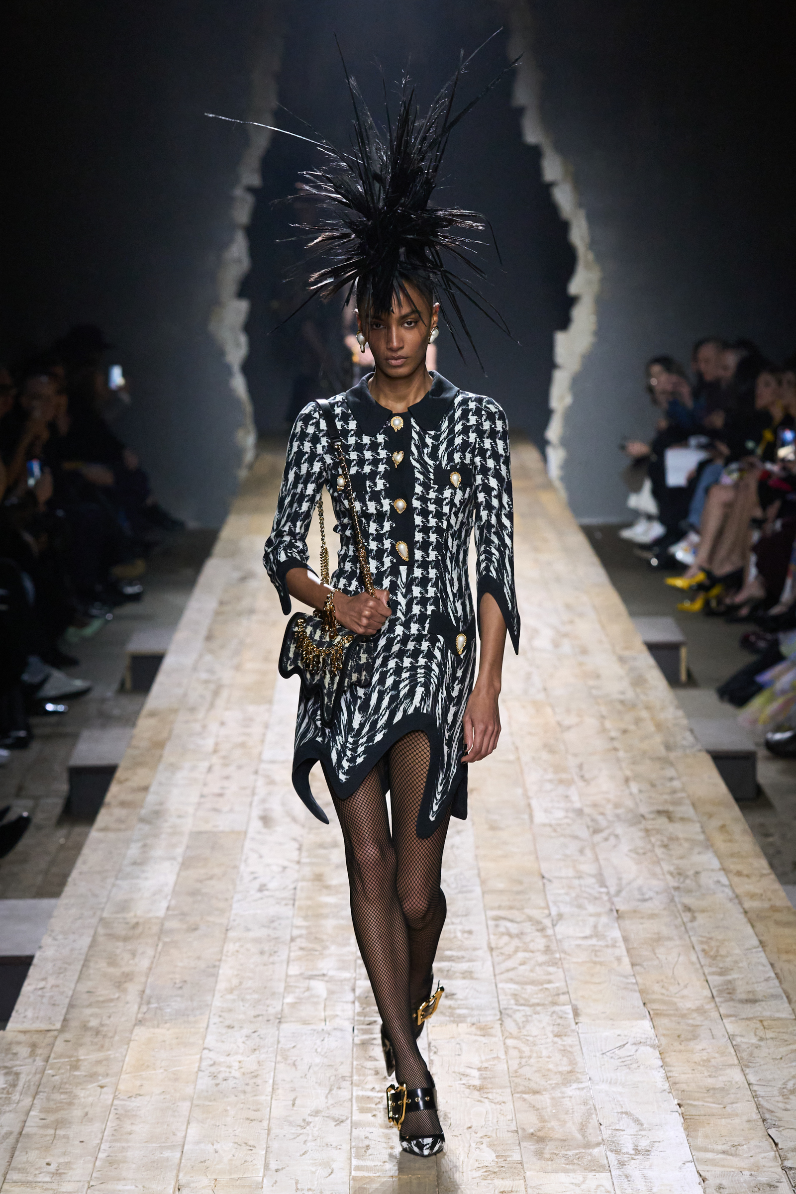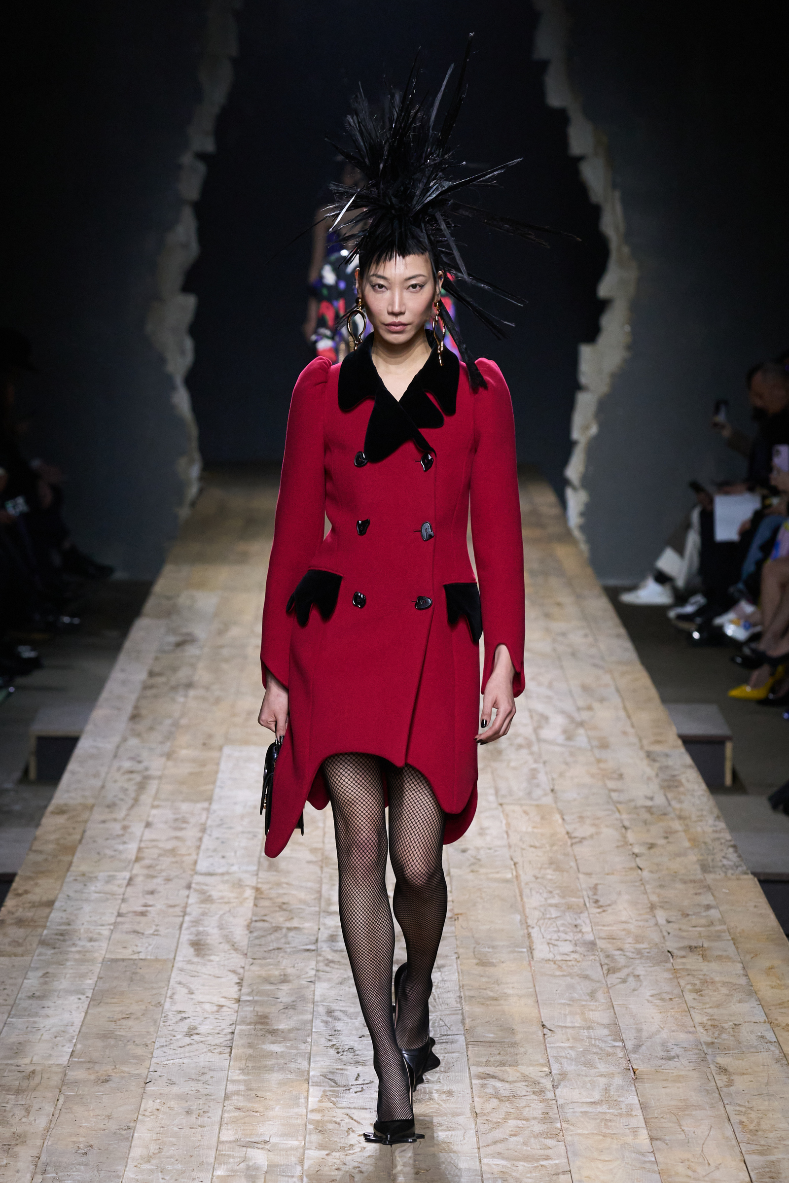 But Scott’s usual gung-ho commitment to a theme didn’t sustain itself. Midway through, the collection switched gears, and the drips were replaced by an aristo-punk vibe featuring large crystal embellishments and even larger metal spikes as motifs. Considering the monster mohawk hairpieces the models wore, it might’ve been a nod in Vivienne Westwood’s direction—we’ve seen other tributes to the late Dame Viv lately—but then again, maybe not. It’s a testament to the meaningful fun that’s usually had at Scott’s Moschino shows that this one didn’t entirely meet the moment.