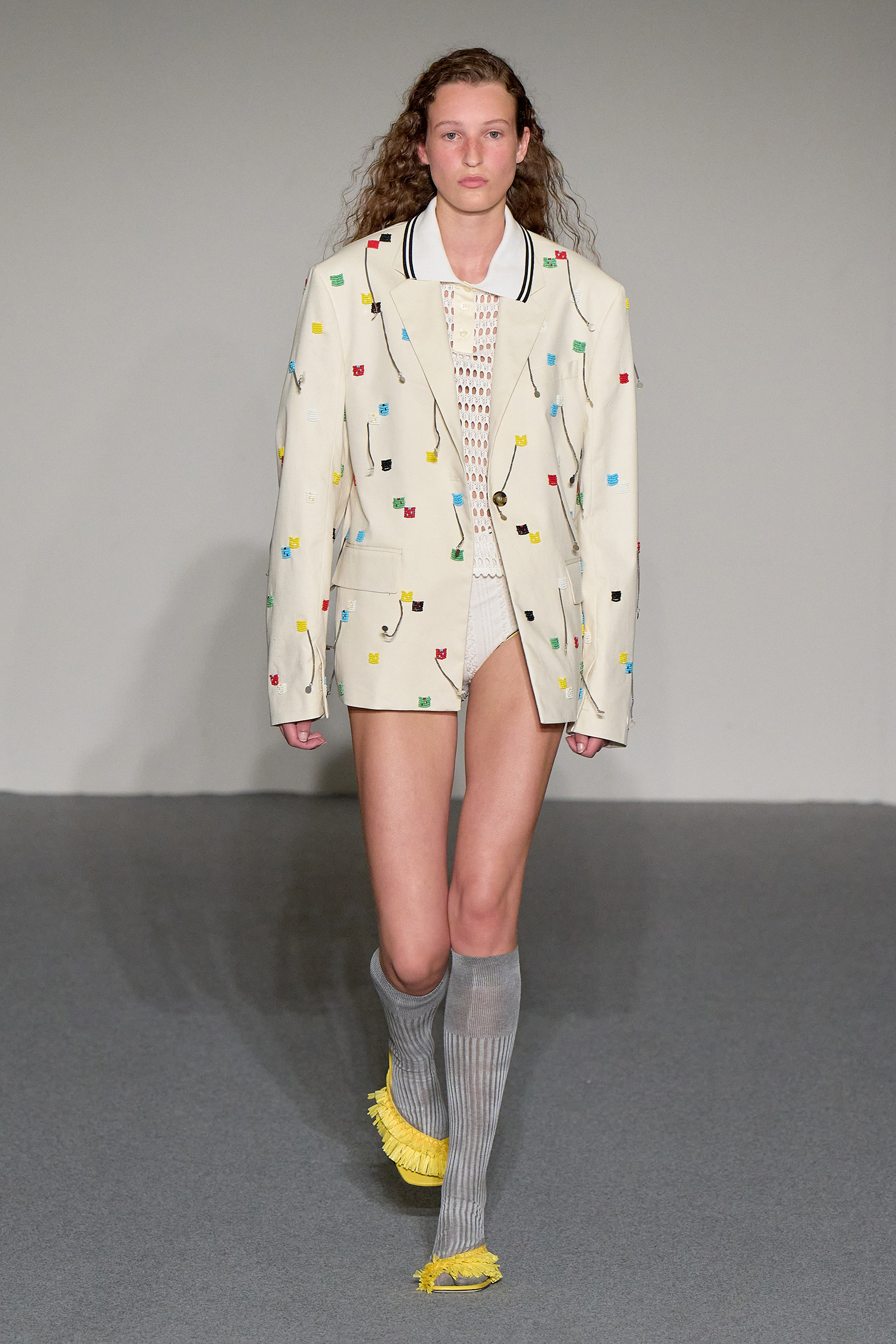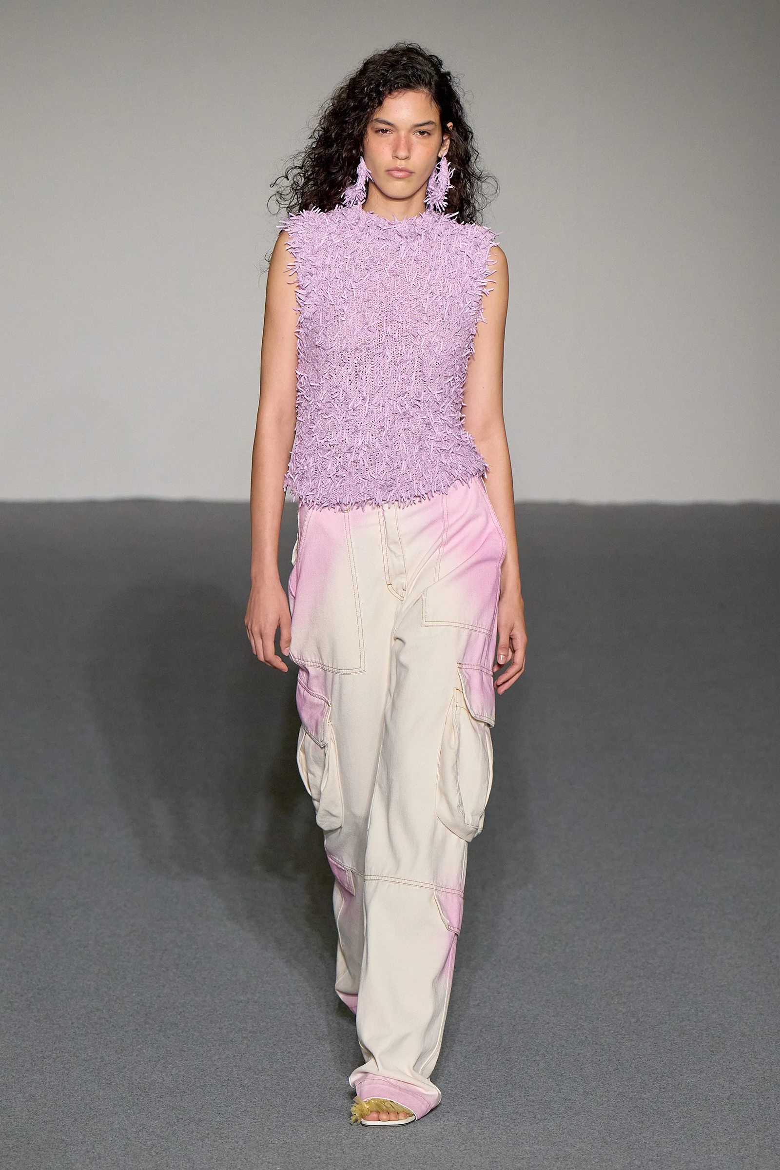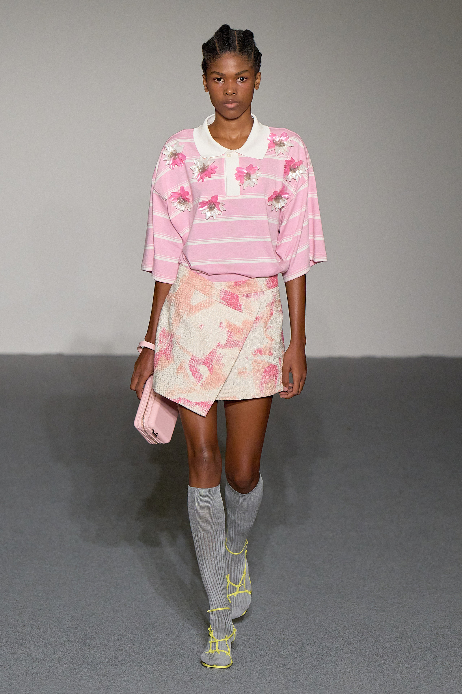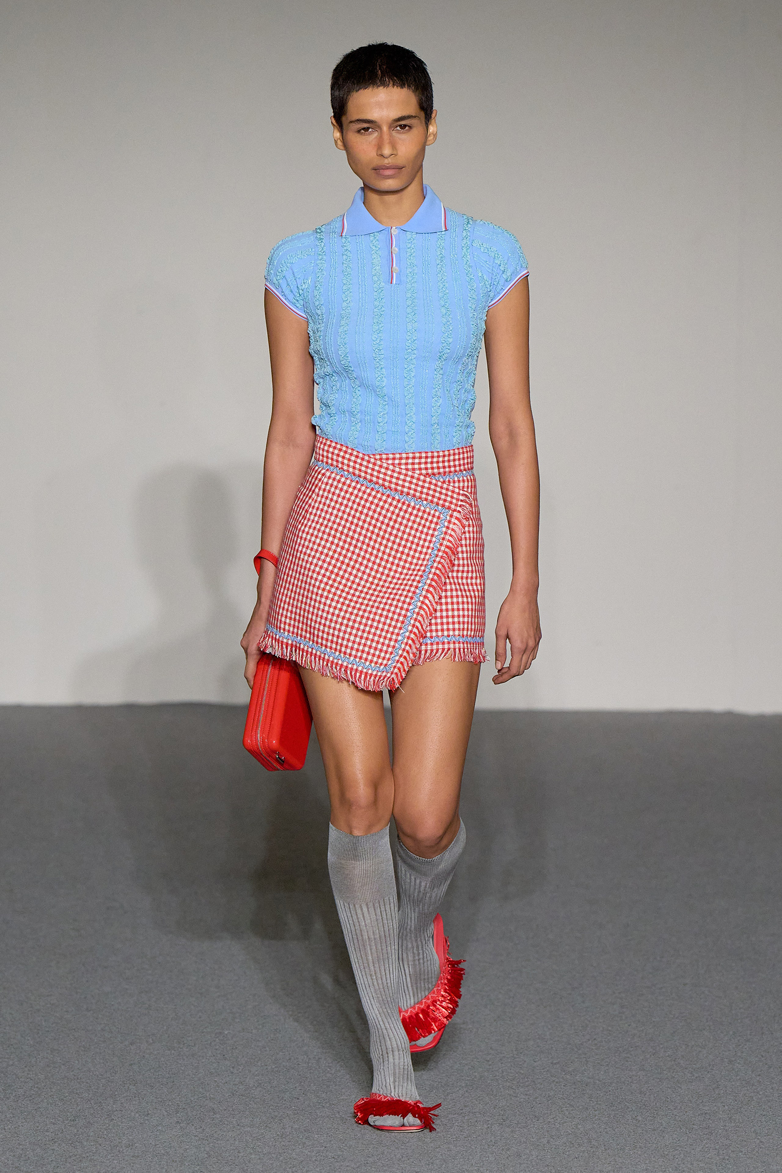 “It’s a playful collection,” said Giorgetti. He certainly had a blast twisting and knotting tops and minidresses with trailing ribbons, making puffy crinolines that sprouted under technical polo shirts, embroidering crocheted rambling roses onto supersized cargos, and printing crisp oxford shirts with pixelated brushstrokes. What would fashion be without healthy doses of madness and the thrill of undiluted, nonsensical fun? We’d all die of boredom yawning in our front-row seats. With Chicks on Speed (of “Euro Trash Girl” fame) on the soundtrack, Giorgetti made us smile, long for disco balls, and tap our feet to the beat. “MSGM is a happy brand that loves to connect, be contemporary, and make mistakes,” he said. “Life generally meanders, and it’s almost never straight.”