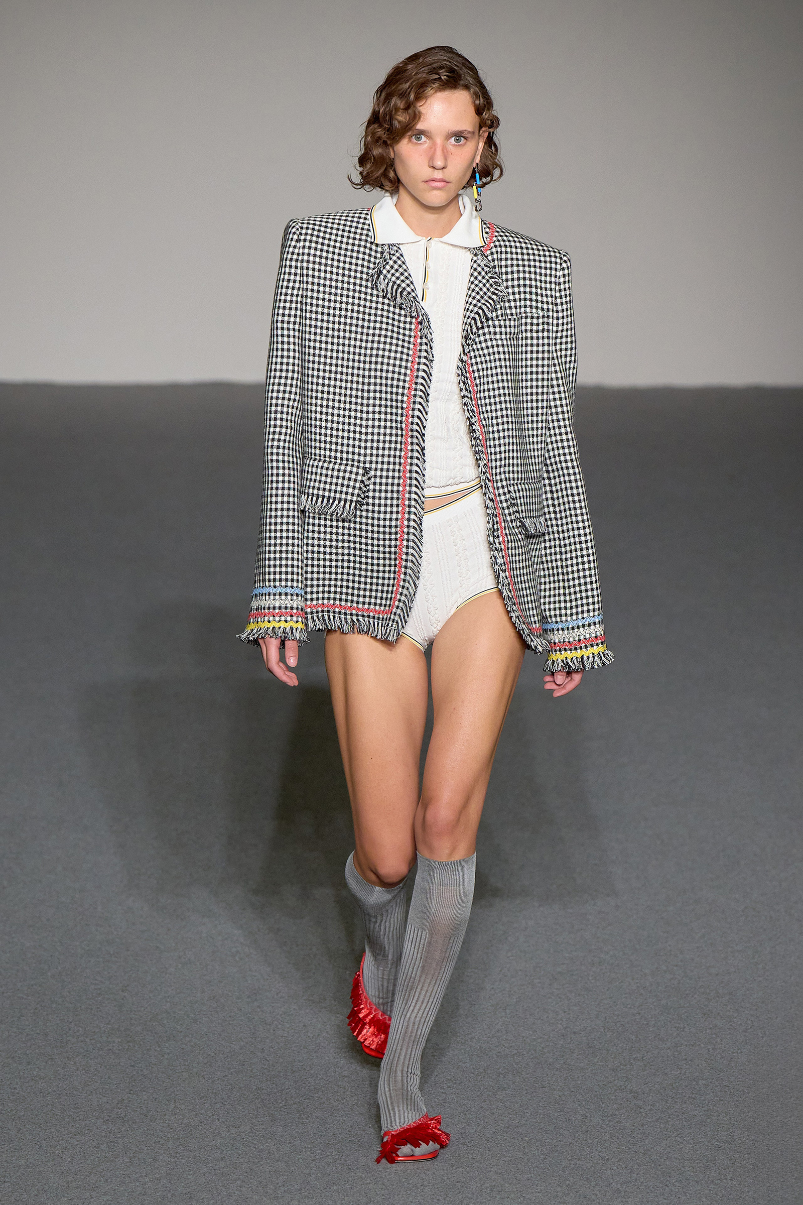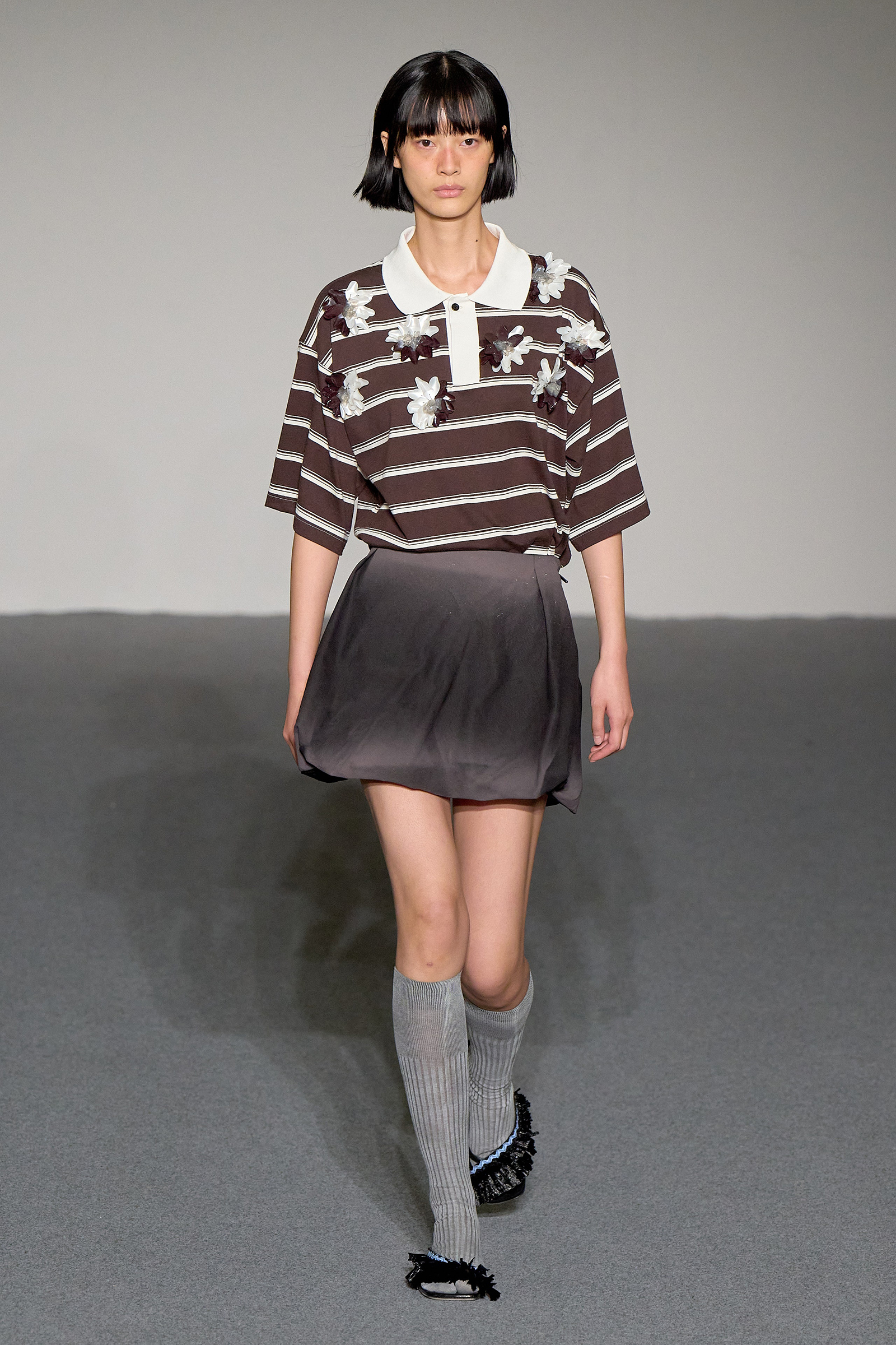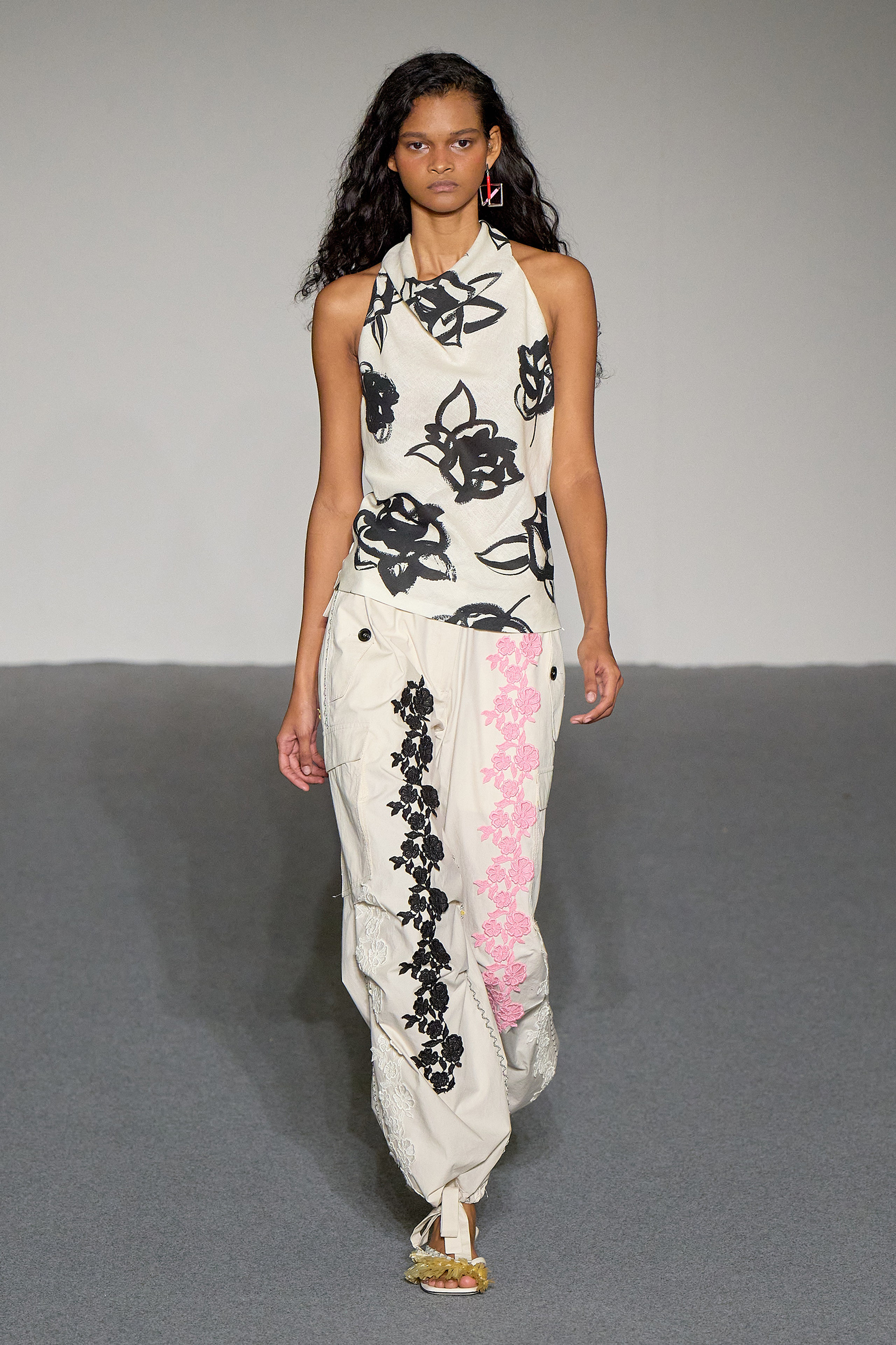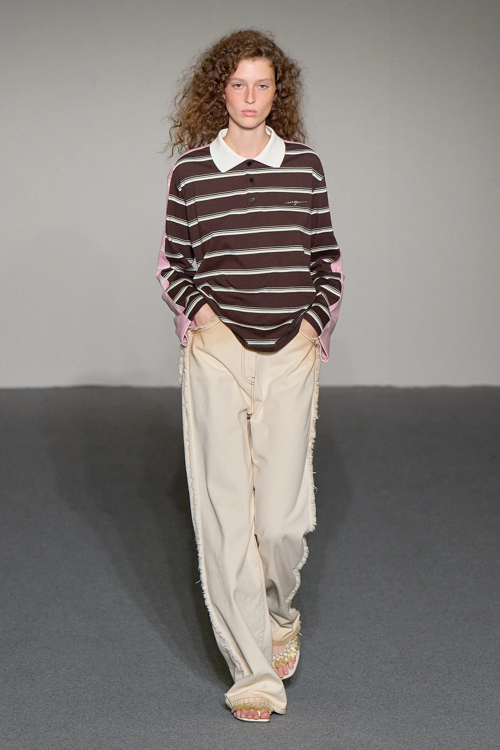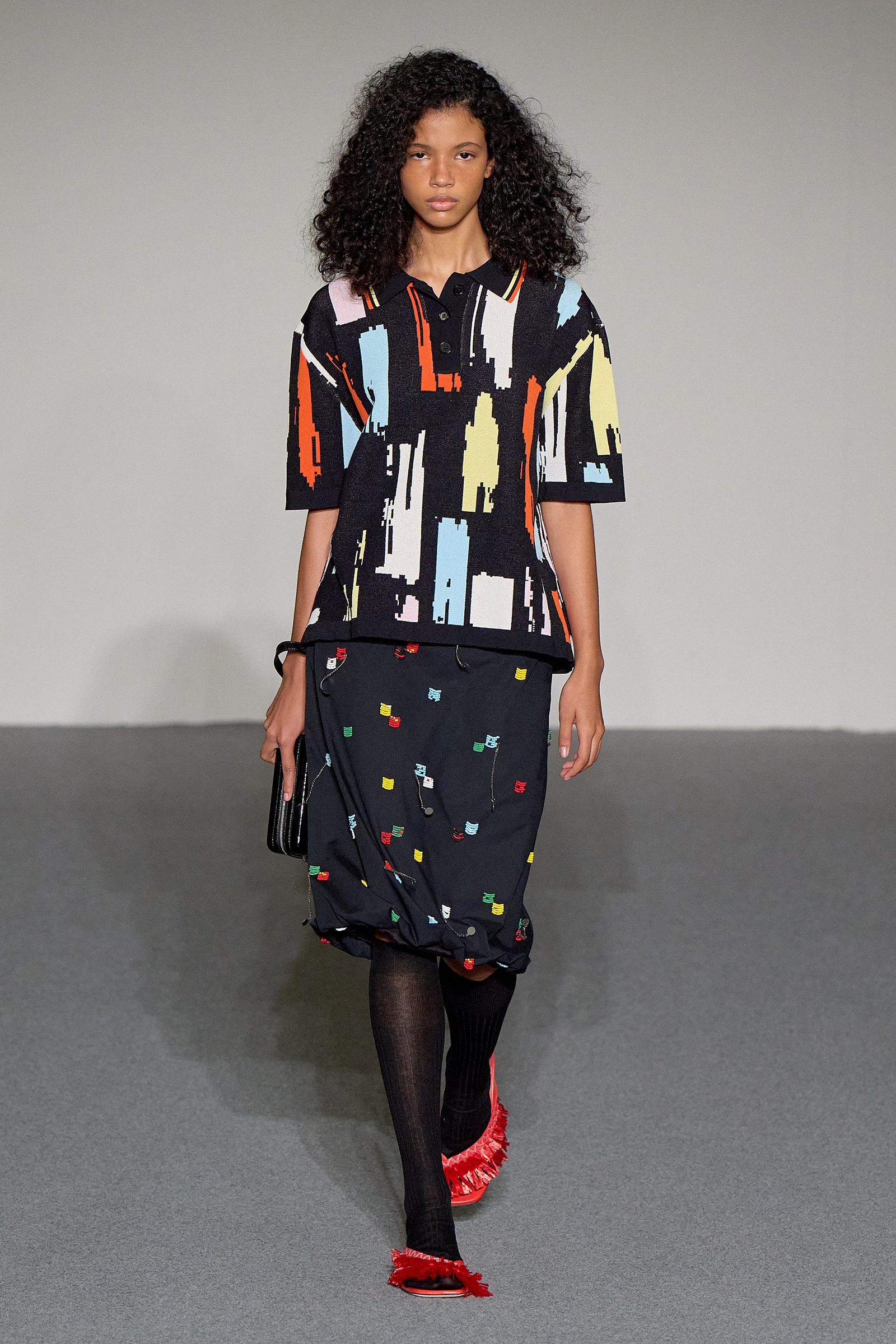 “It’s a playful collection,” said Giorgetti. He certainly had a blast twisting and knotting tops and minidresses with trailing ribbons, making puffy crinolines that sprouted under technical polo shirts, embroidering crocheted rambling roses onto supersized cargos, and printing crisp oxford shirts with pixelated brushstrokes. What would fashion be without healthy doses of madness and the thrill of undiluted, nonsensical fun? We’d all die of boredom yawning in our front-row seats. With Chicks on Speed (of “Euro Trash Girl” fame) on the soundtrack, Giorgetti made us smile, long for disco balls, and tap our feet to the beat. “MSGM is a happy brand that loves to connect, be contemporary, and make mistakes,” he said. “Life generally meanders, and it’s almost never straight.”