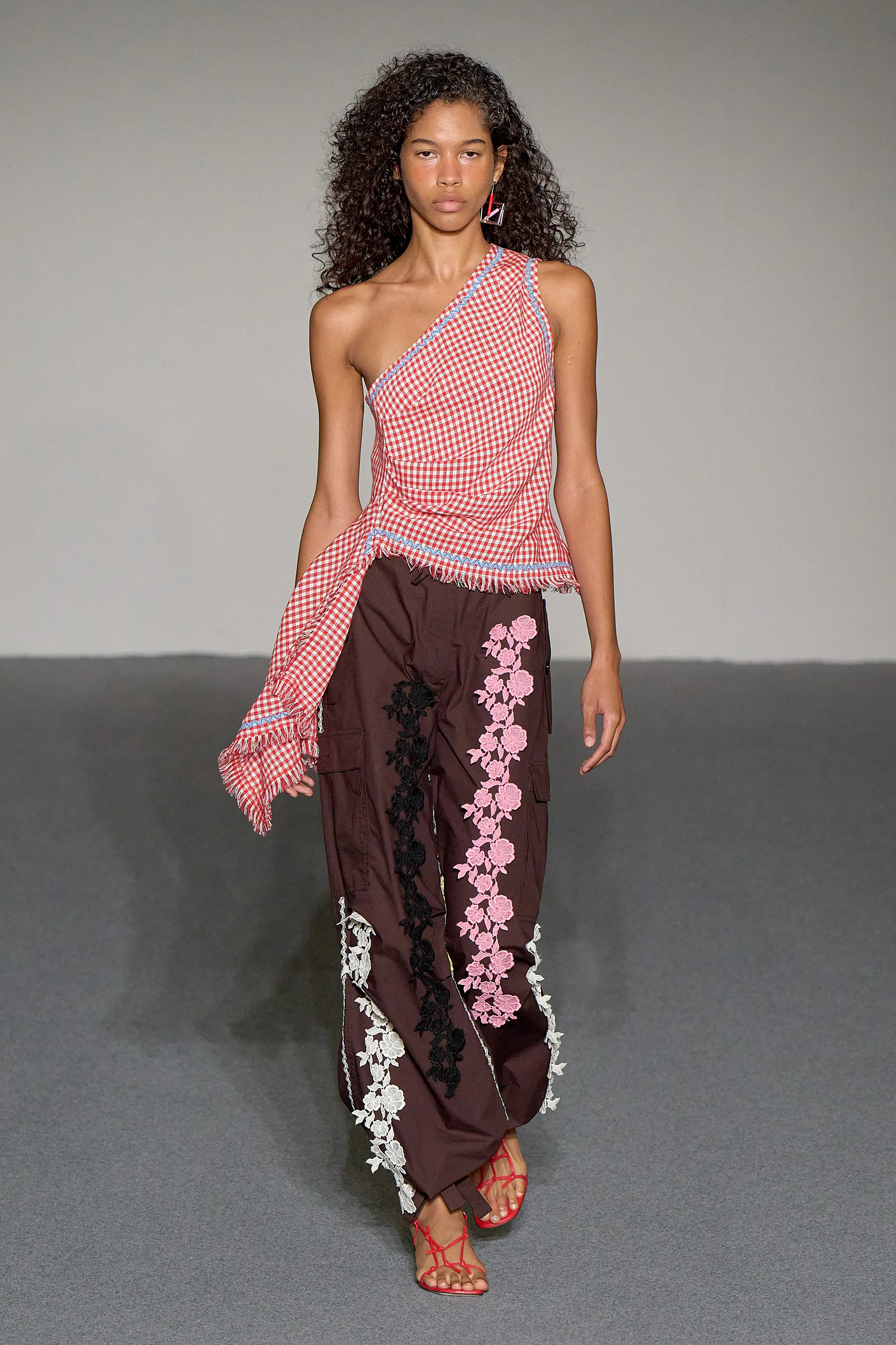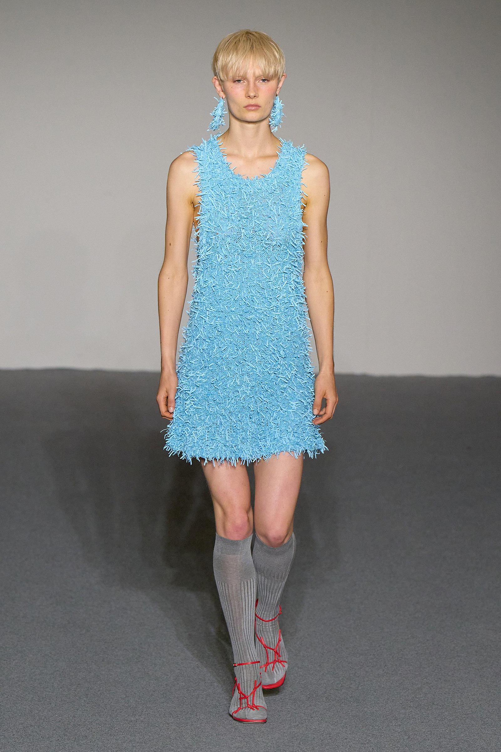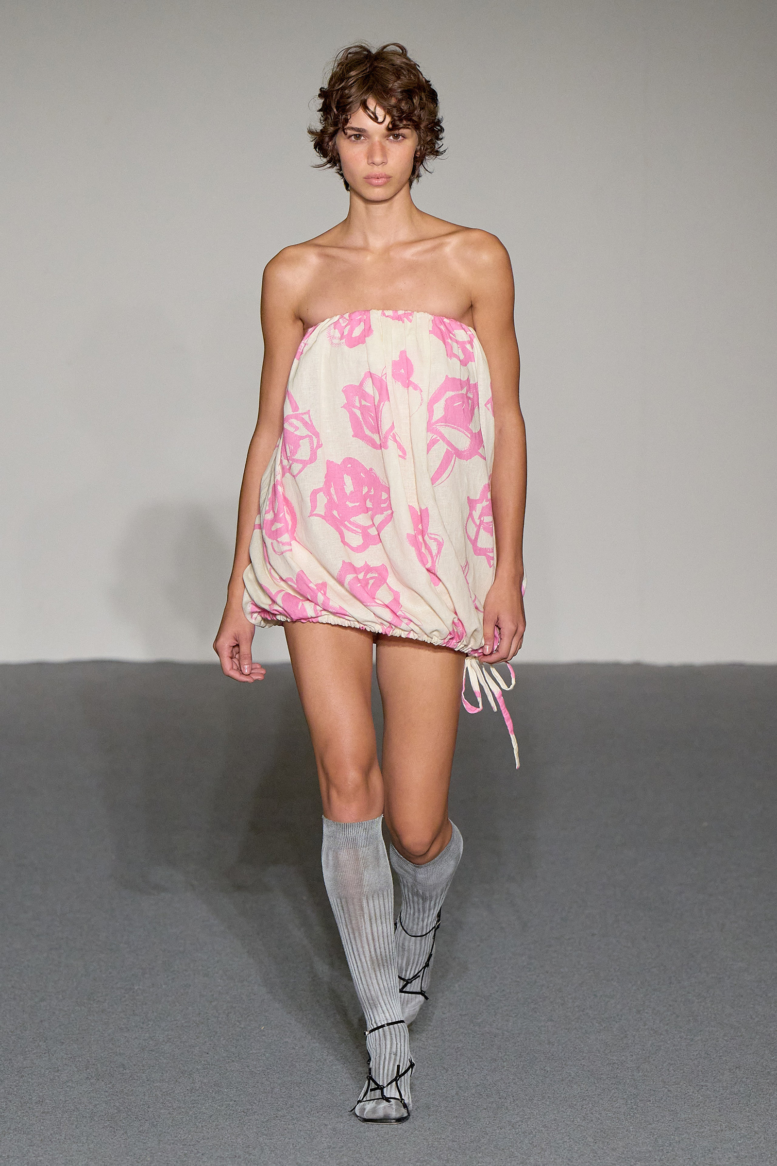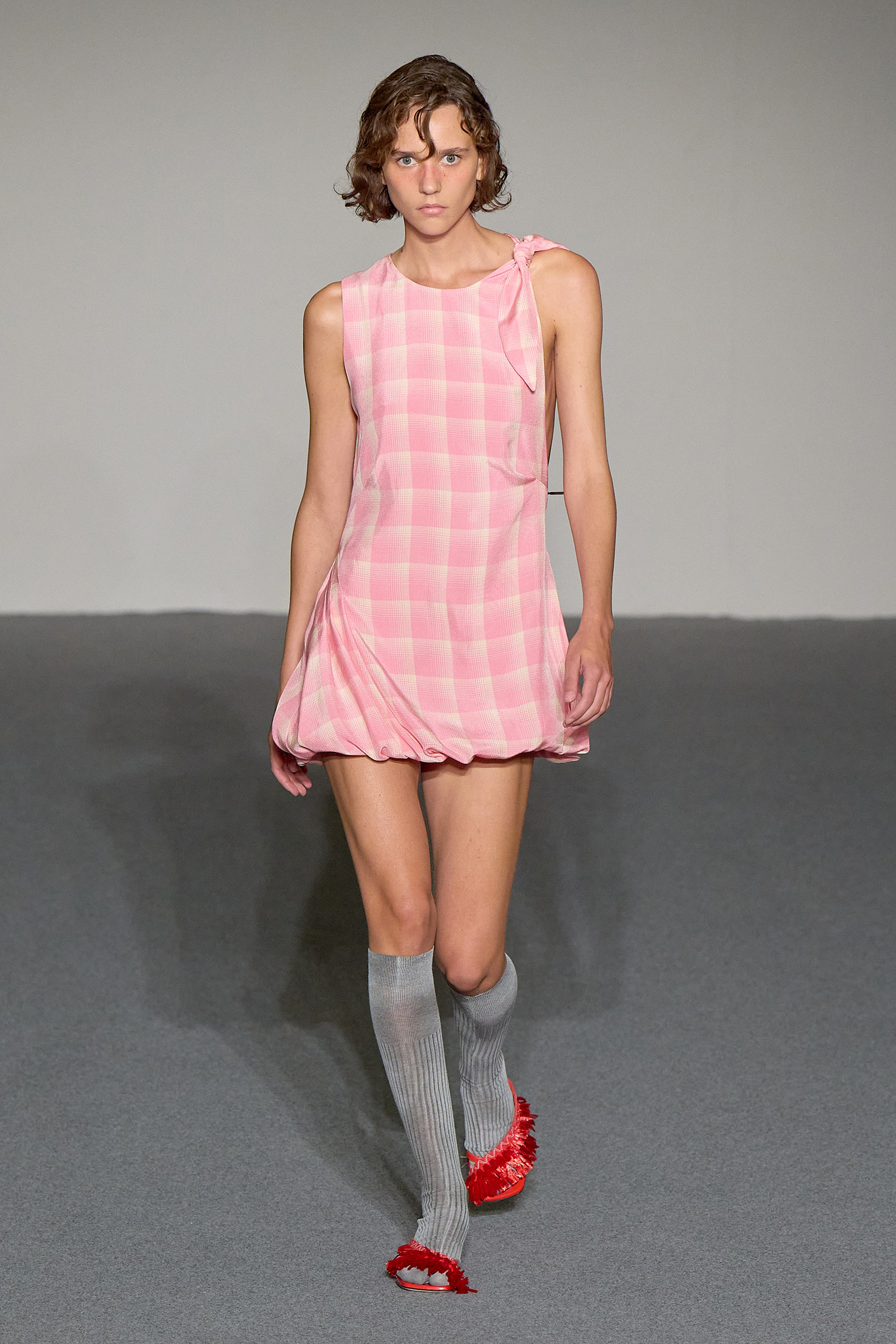 “It’s a playful collection,” said Giorgetti. He certainly had a blast twisting and knotting tops and minidresses with trailing ribbons, making puffy crinolines that sprouted under technical polo shirts, embroidering crocheted rambling roses onto supersized cargos, and printing crisp oxford shirts with pixelated brushstrokes. What would fashion be without healthy doses of madness and the thrill of undiluted, nonsensical fun? We’d all die of boredom yawning in our front-row seats. With Chicks on Speed (of “Euro Trash Girl” fame) on the soundtrack, Giorgetti made us smile, long for disco balls, and tap our feet to the beat. “MSGM is a happy brand that loves to connect, be contemporary, and make mistakes,” he said. “Life generally meanders, and it’s almost never straight.”