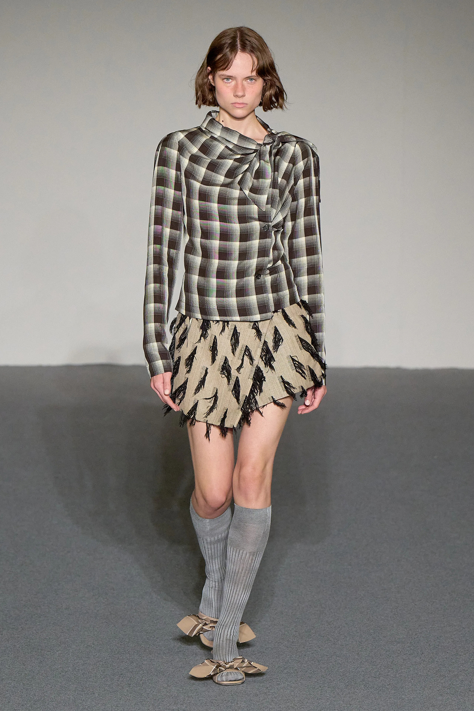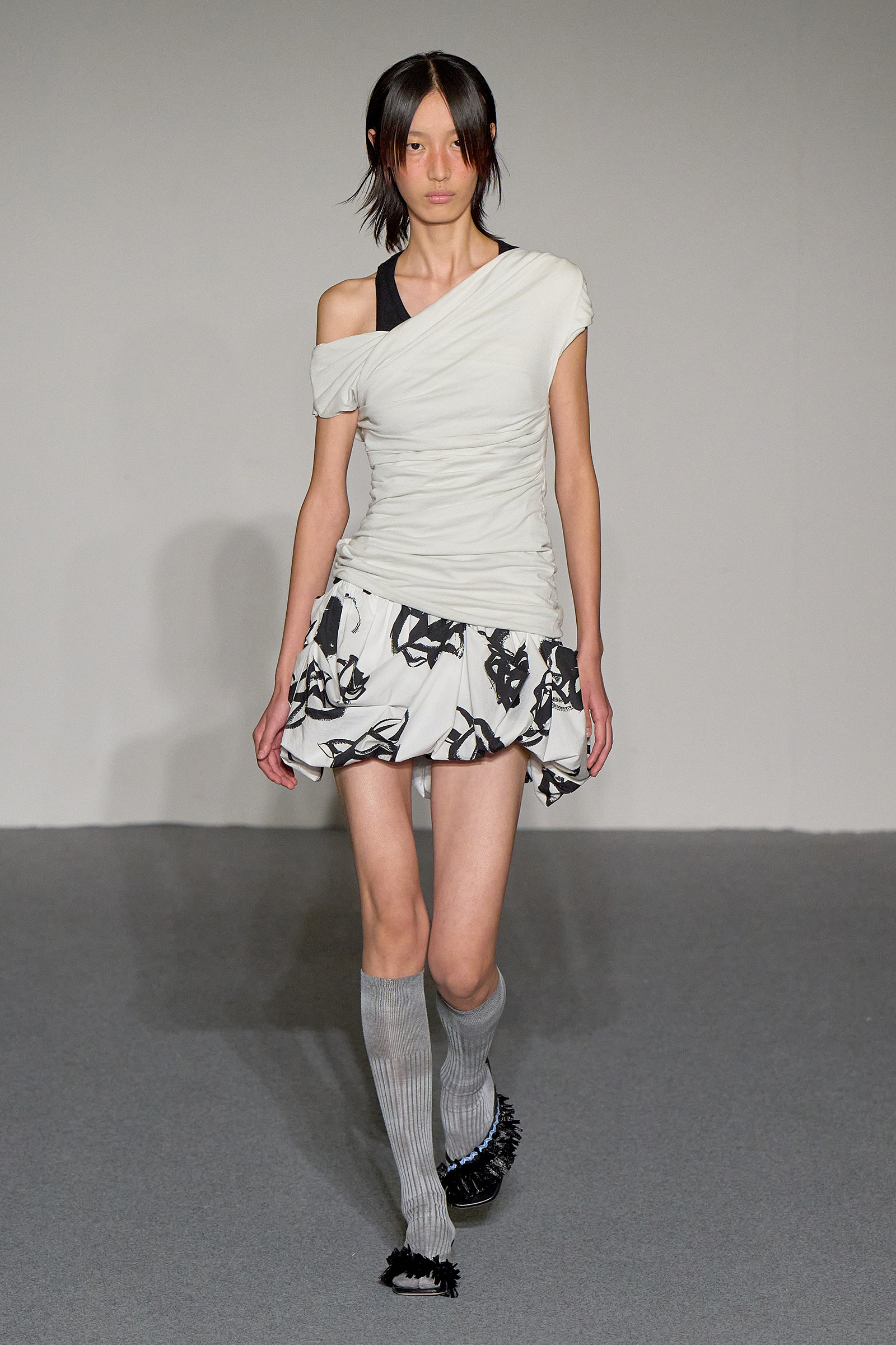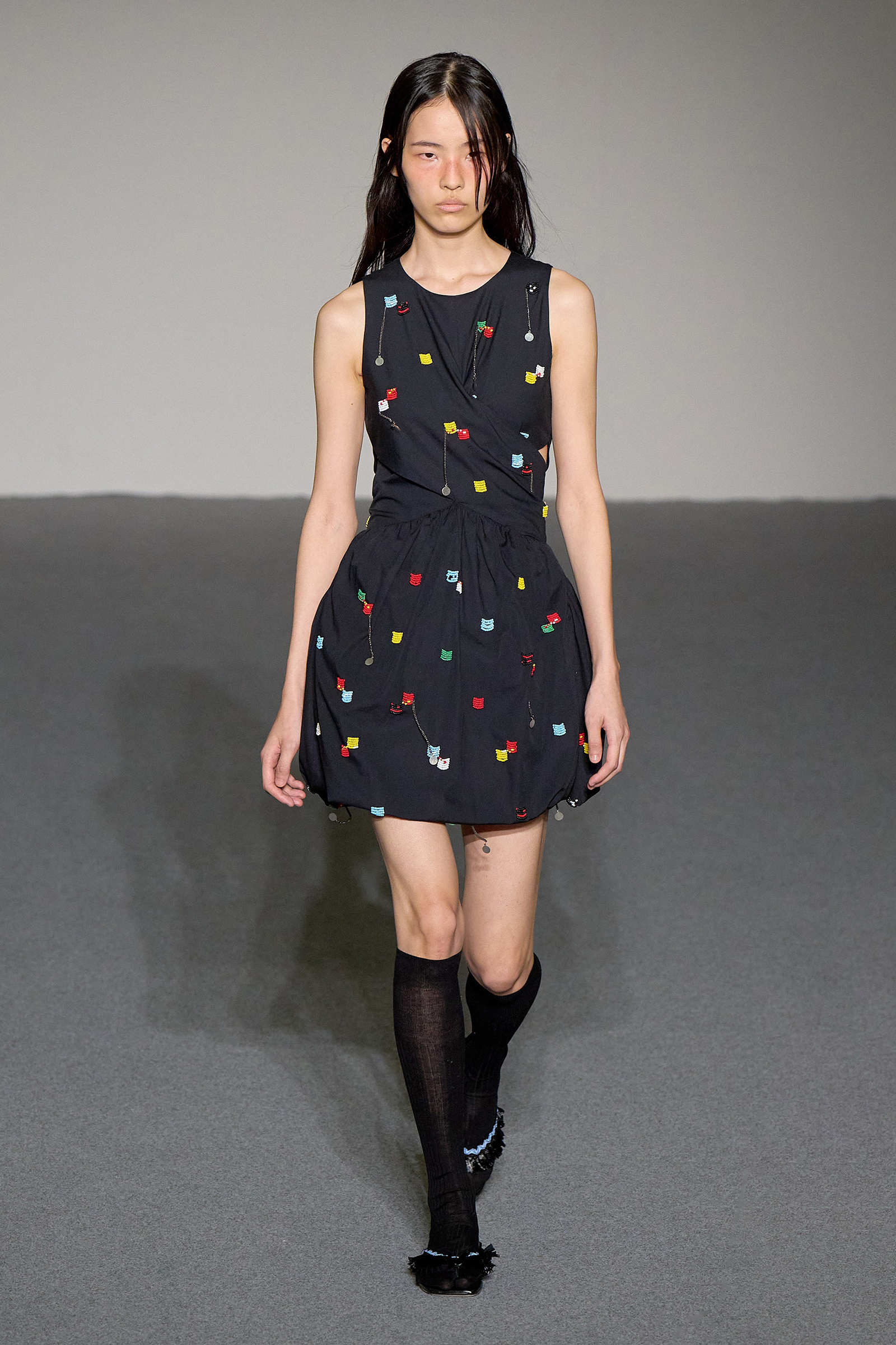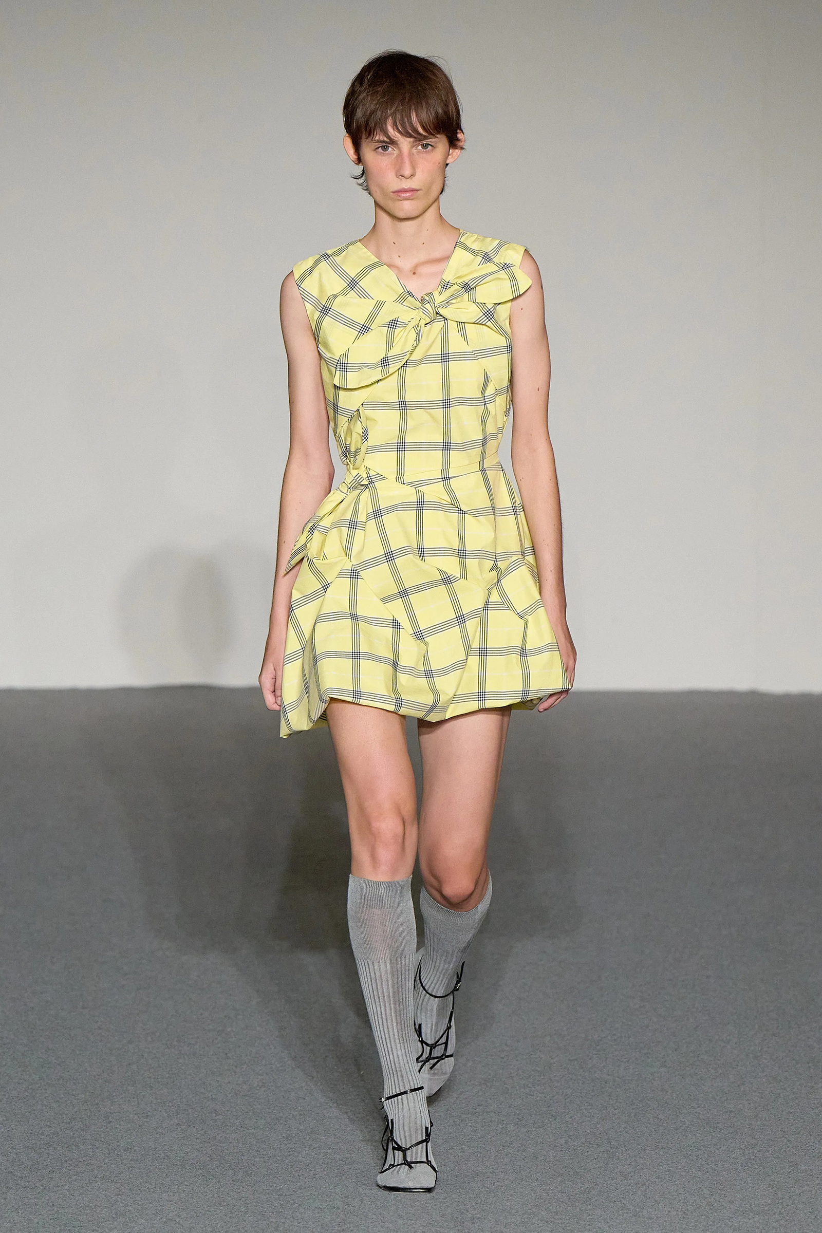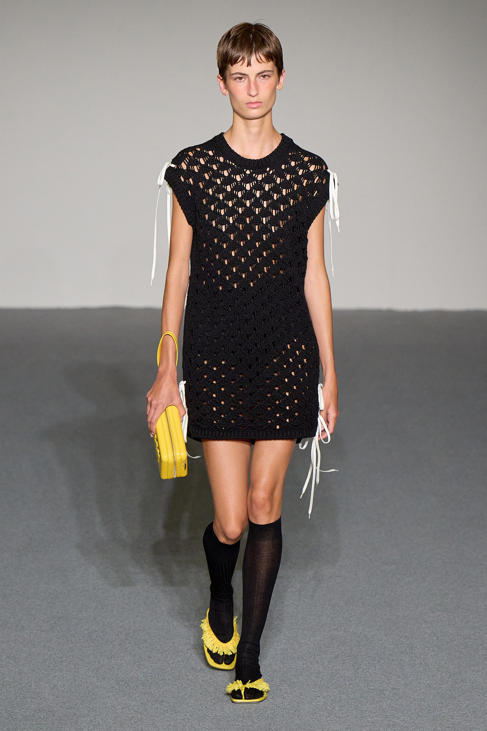 “It’s a playful collection,” said Giorgetti. He certainly had a blast twisting and knotting tops and minidresses with trailing ribbons, making puffy crinolines that sprouted under technical polo shirts, embroidering crocheted rambling roses onto supersized cargos, and printing crisp oxford shirts with pixelated brushstrokes. What would fashion be without healthy doses of madness and the thrill of undiluted, nonsensical fun? We’d all die of boredom yawning in our front-row seats. With Chicks on Speed (of “Euro Trash Girl” fame) on the soundtrack, Giorgetti made us smile, long for disco balls, and tap our feet to the beat. “MSGM is a happy brand that loves to connect, be contemporary, and make mistakes,” he said. “Life generally meanders, and it’s almost never straight.”
