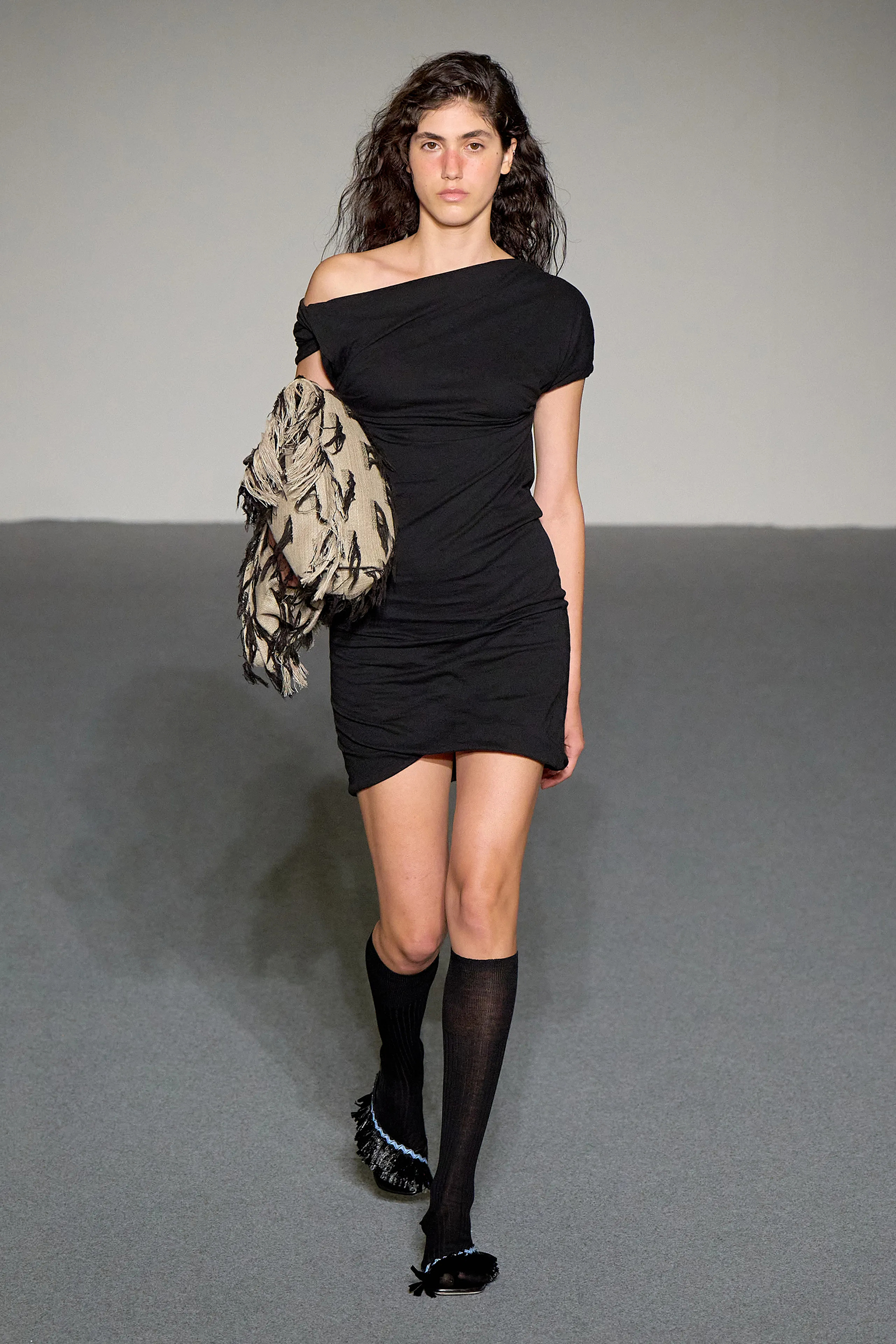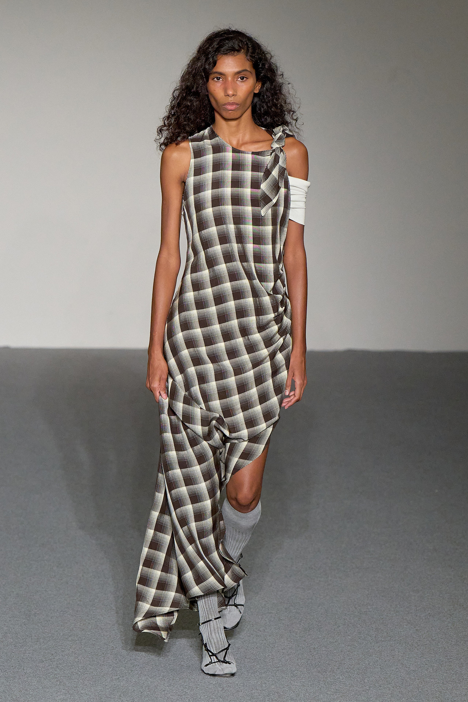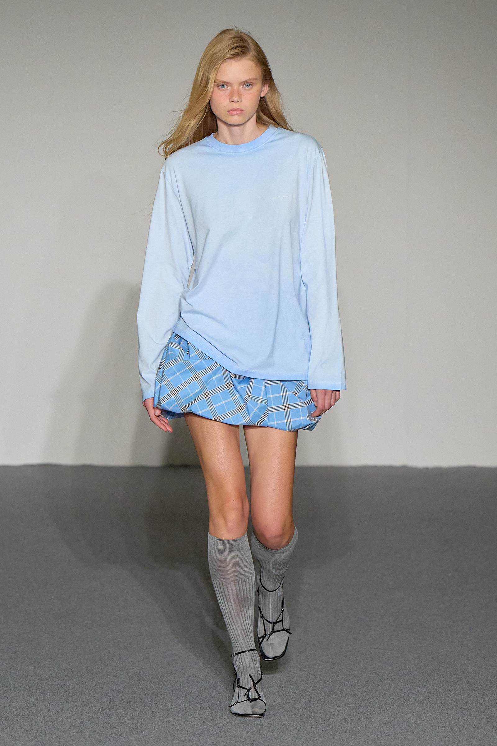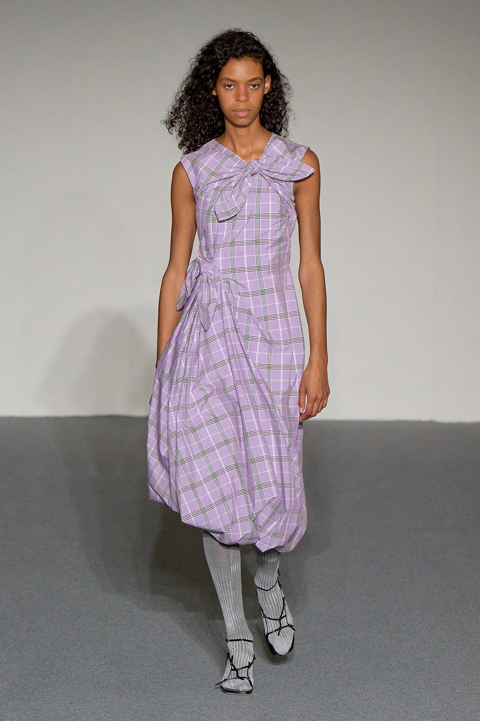 “It’s a playful collection,” said Giorgetti. He certainly had a blast twisting and knotting tops and minidresses with trailing ribbons, making puffy crinolines that sprouted under technical polo shirts, embroidering crocheted rambling roses onto supersized cargos, and printing crisp oxford shirts with pixelated brushstrokes. What would fashion be without healthy doses of madness and the thrill of undiluted, nonsensical fun? We’d all die of boredom yawning in our front-row seats. With Chicks on Speed (of “Euro Trash Girl” fame) on the soundtrack, Giorgetti made us smile, long for disco balls, and tap our feet to the beat. “MSGM is a happy brand that loves to connect, be contemporary, and make mistakes,” he said. “Life generally meanders, and it’s almost never straight.”